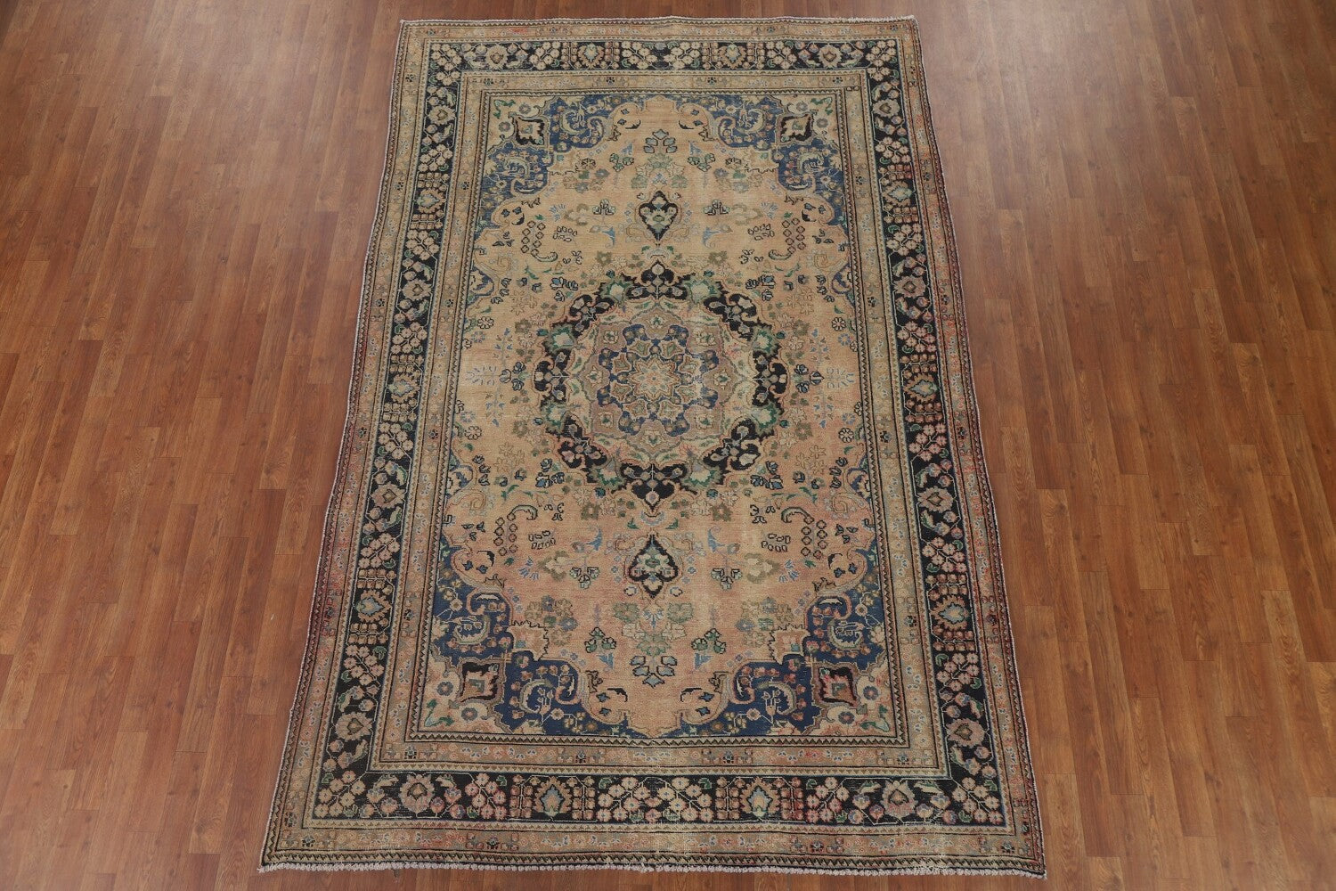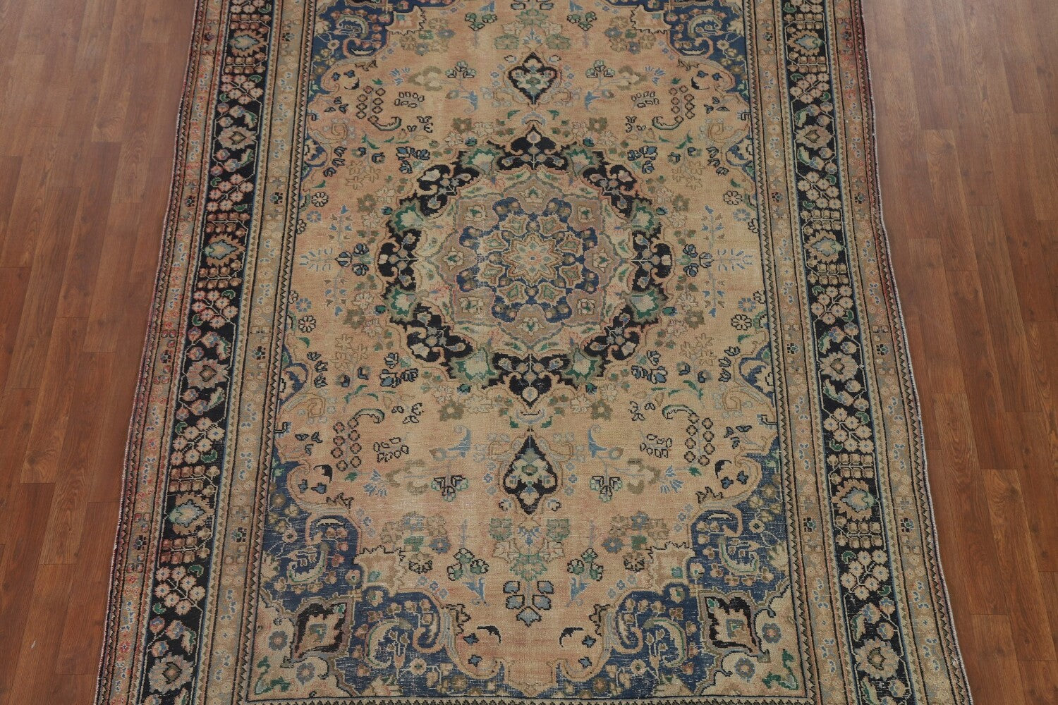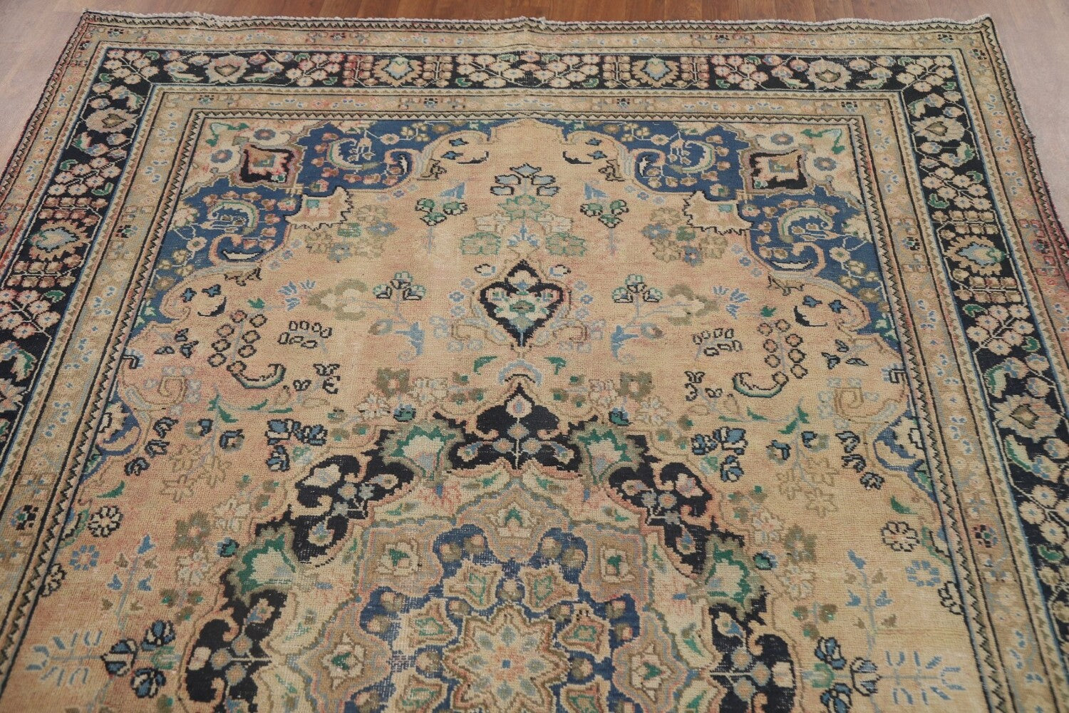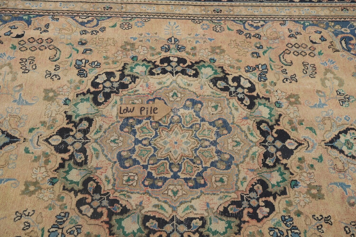 A Beautiful Genuine Persia ( Persia ) Mashad rug is Hand Knotted by skillful weavers in Persia ( Persia ) with 100% Wool Material. This rug is in Very Good (Low Pile-Small Repair) condition. dimensions are 9' 5'' X 6' 2'' in foot and 287 X 188 in centimeter. the primary color is Peach.