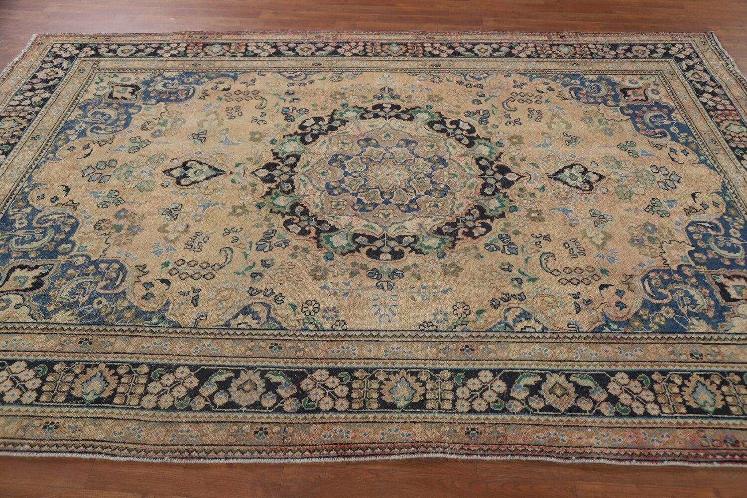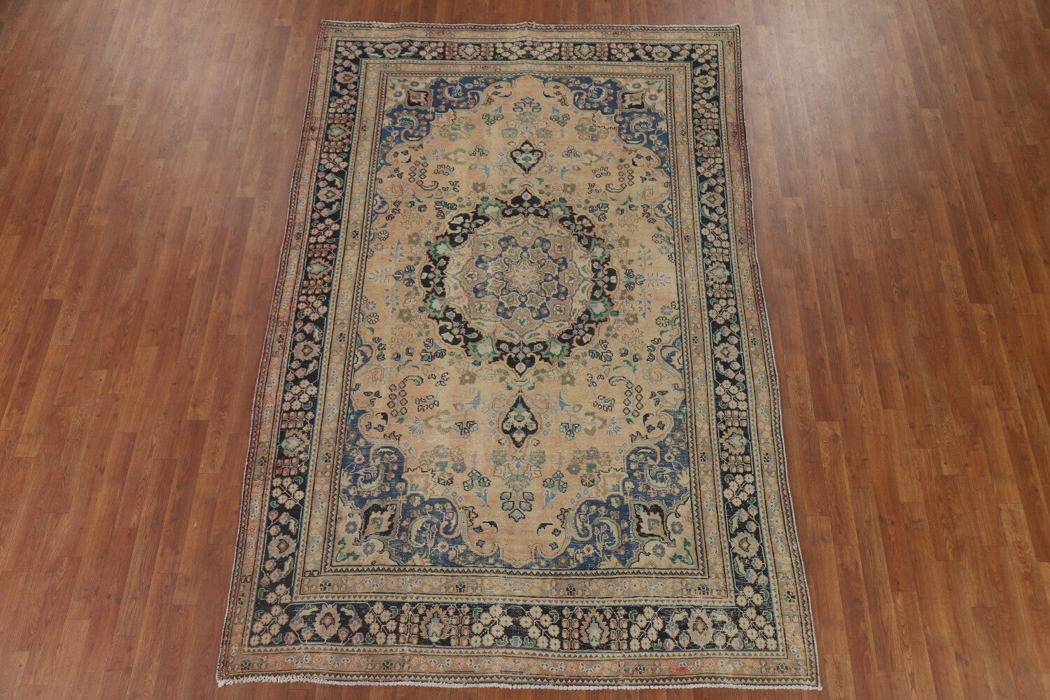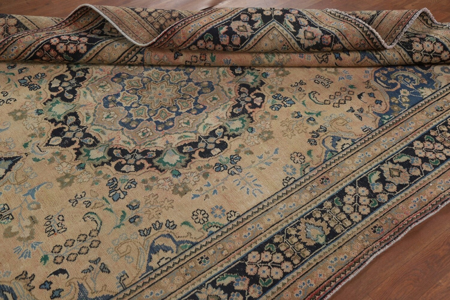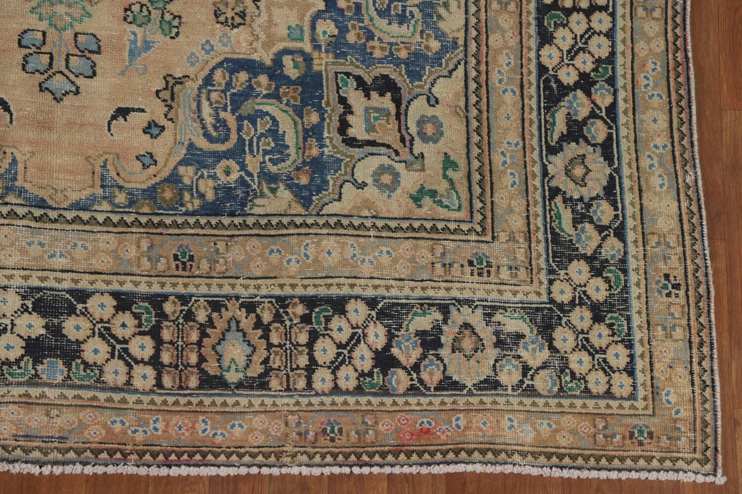 A Beautiful Genuine Persia ( Persia ) Mashad rug is Hand Knotted by skillful weavers in Persia ( Persia ) with 100% Wool Material. This rug is in Very Good (Low Pile-Small Repair) condition. dimensions are 9' 5'' X 6' 2'' in foot and 287 X 188 in centimeter. the primary color is Peach.