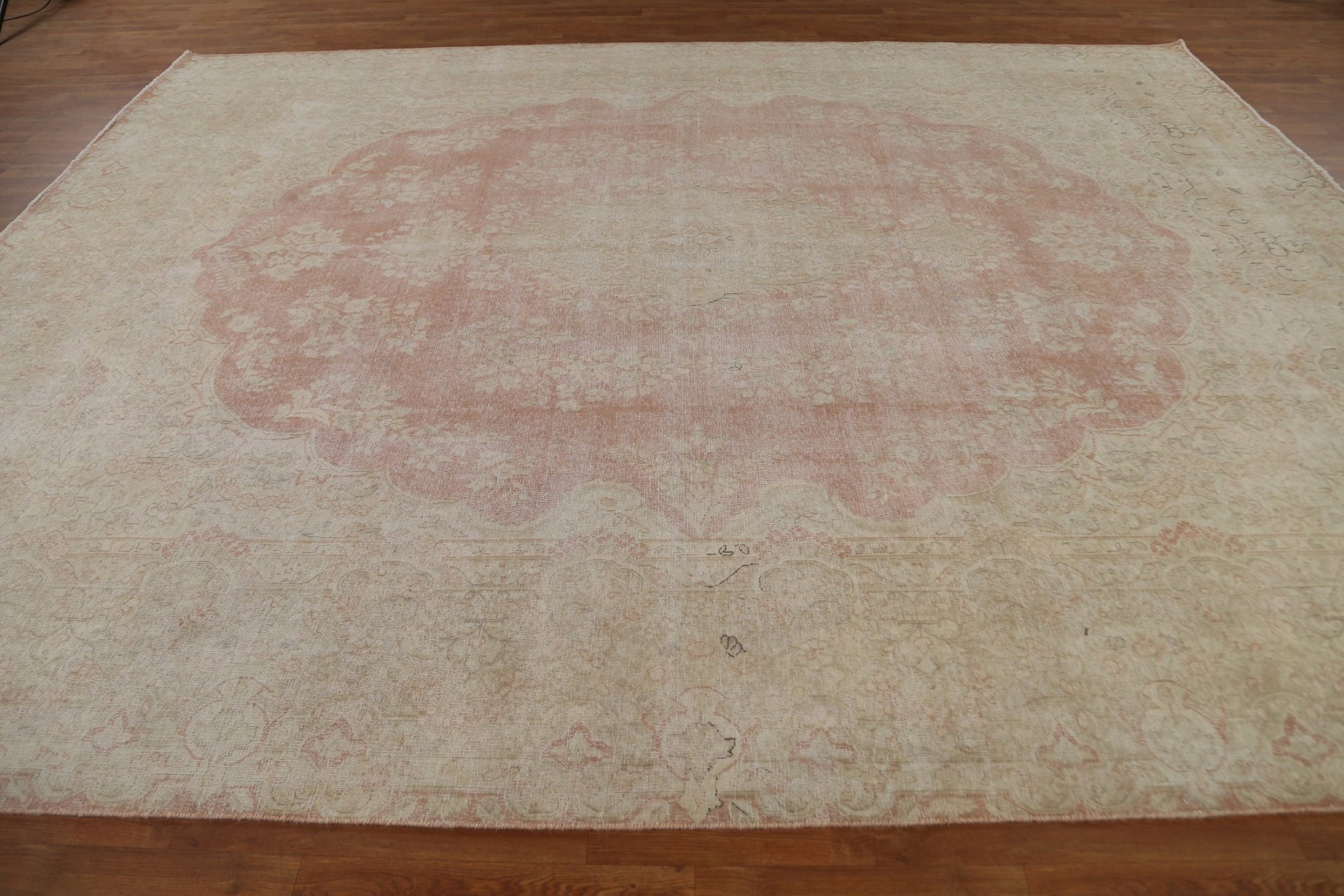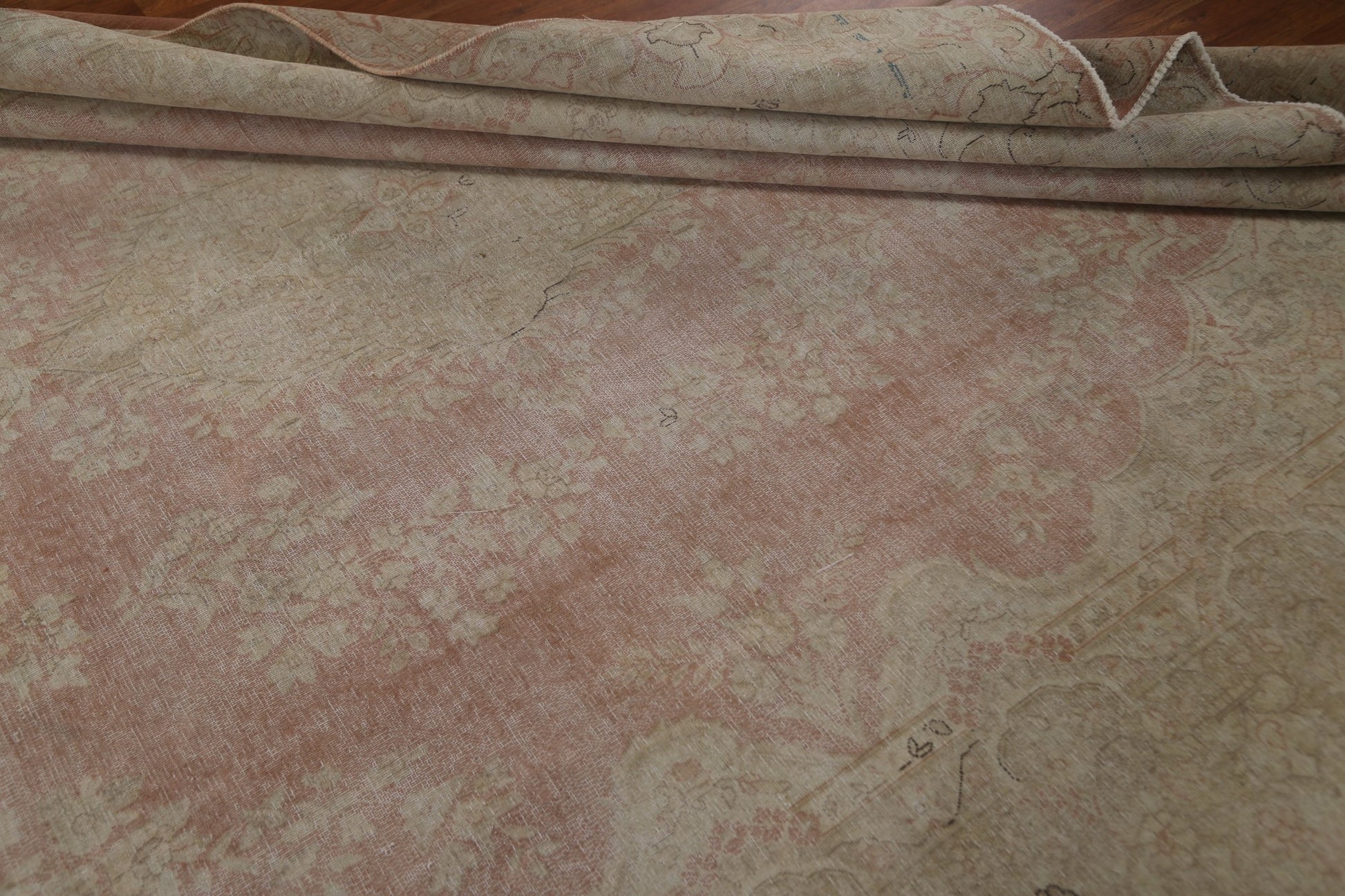 A Beautiful Genuine Persia ( Persia ) Kerman rug is Hand Knotted by skillful weavers in Persia ( Persia ) with 100% Wool Material. This rug is in Very Good (Evenly Low Pile) condition. dimensions are 12' 9'' X 9' 10'' in foot and 389 X 300 in centimeter. the primary color is Pink.