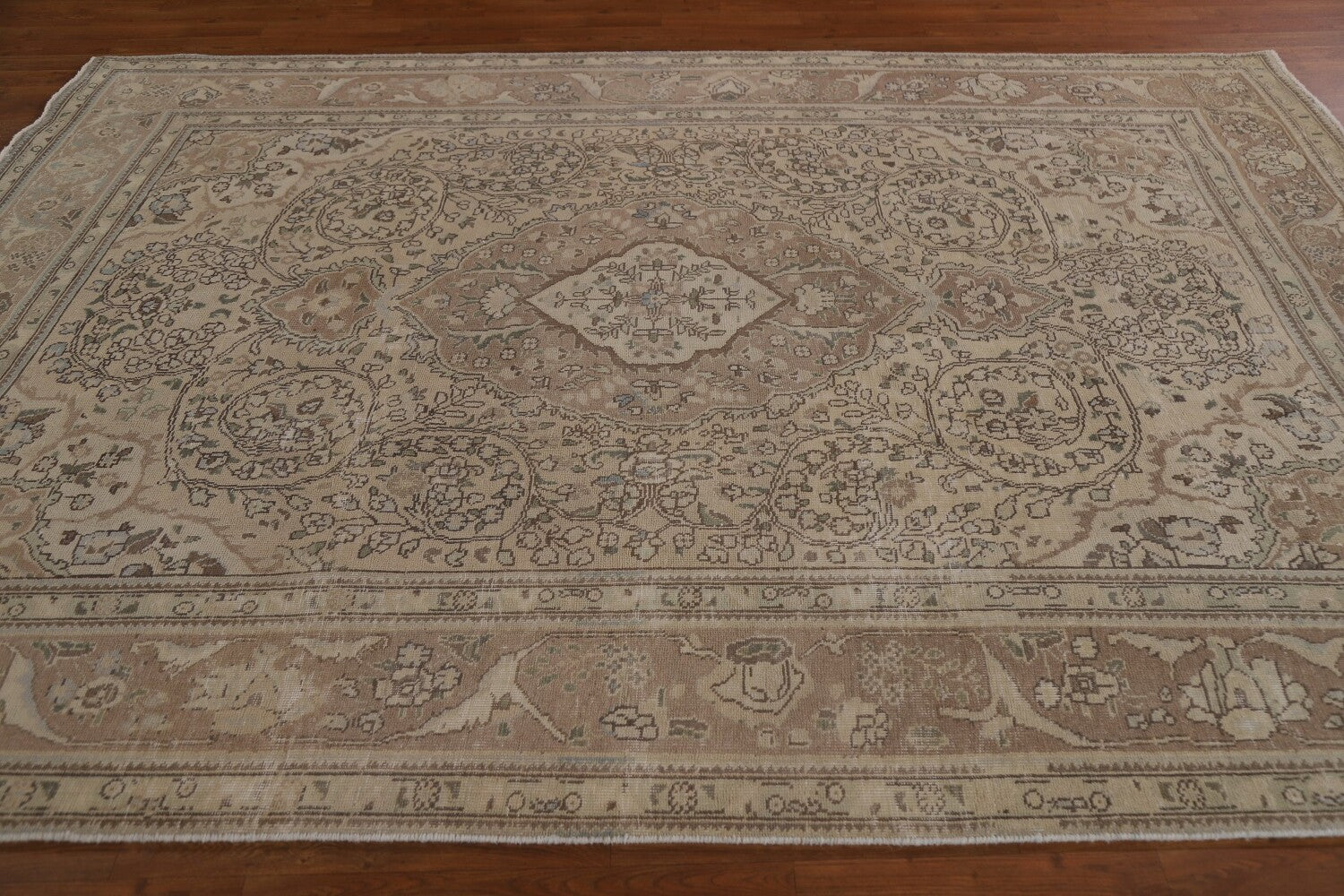A Beautiful Genuine Persia ( Persia ) Tabriz rug is Hand Knotted by skillful weavers in Persia ( Persia ) with 100% Wool Material. This rug is in Very Good (Evenly Low Pile) condition. dimensions are 9' 2'' X 6' 8'' in foot and 279 X 203 in centimeter. the primary color is Beige & Ivories.