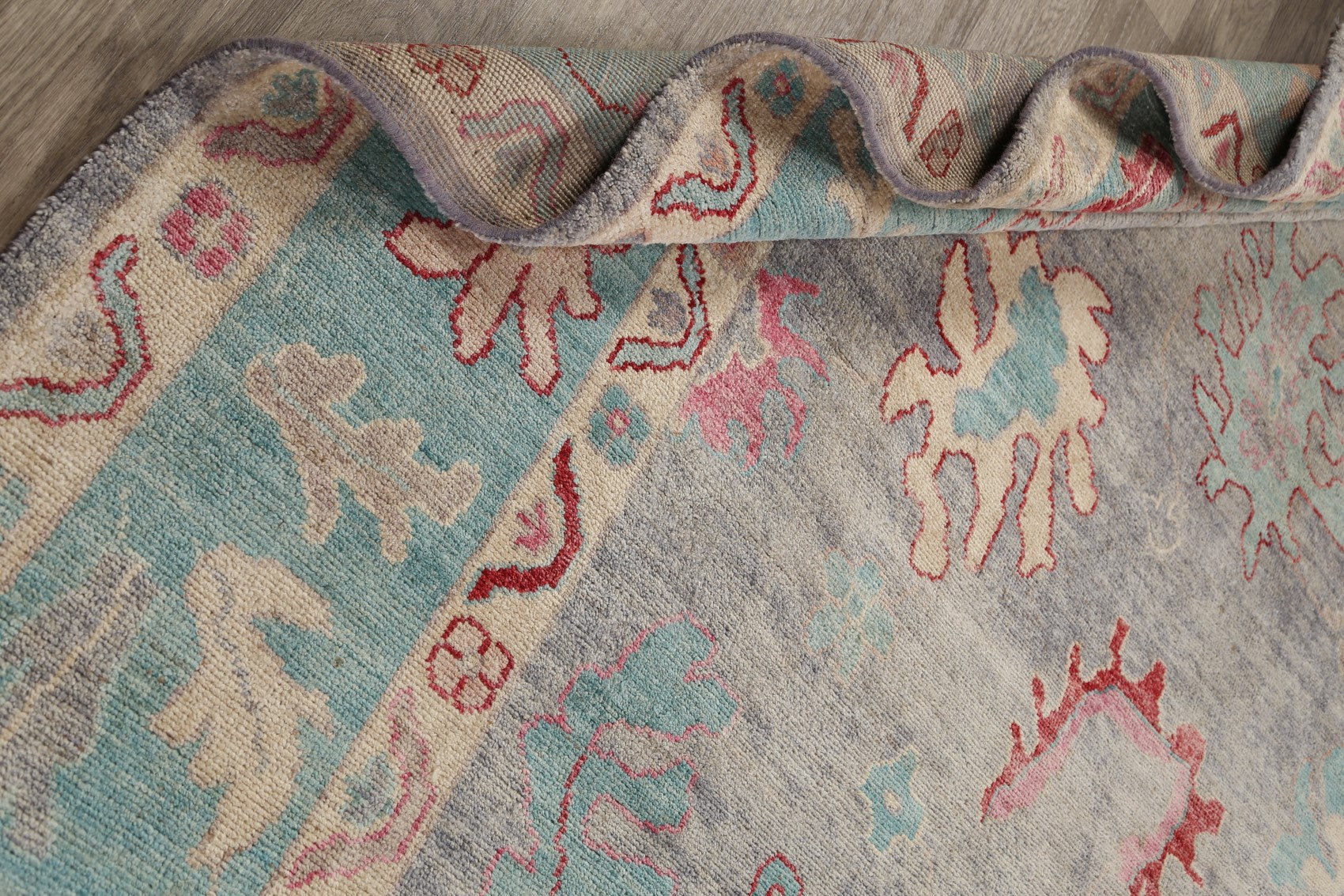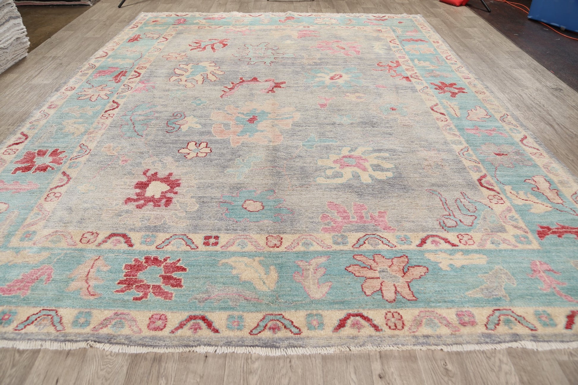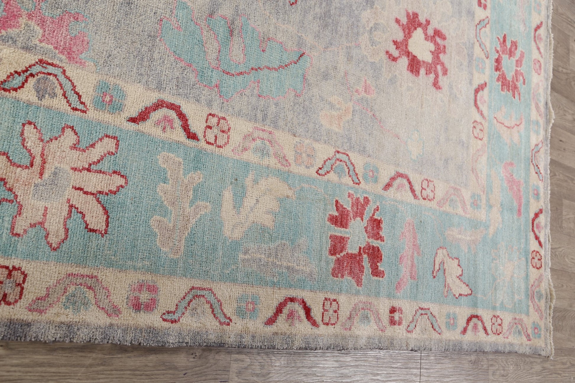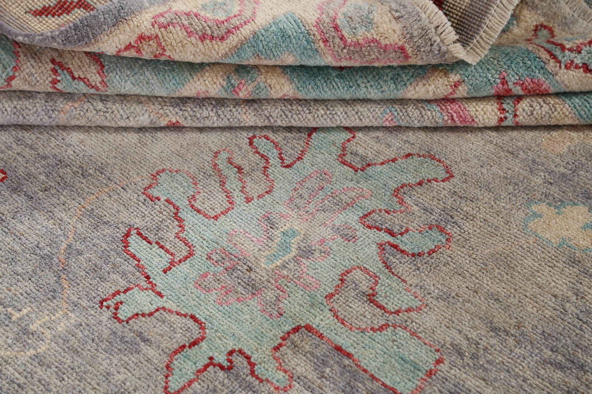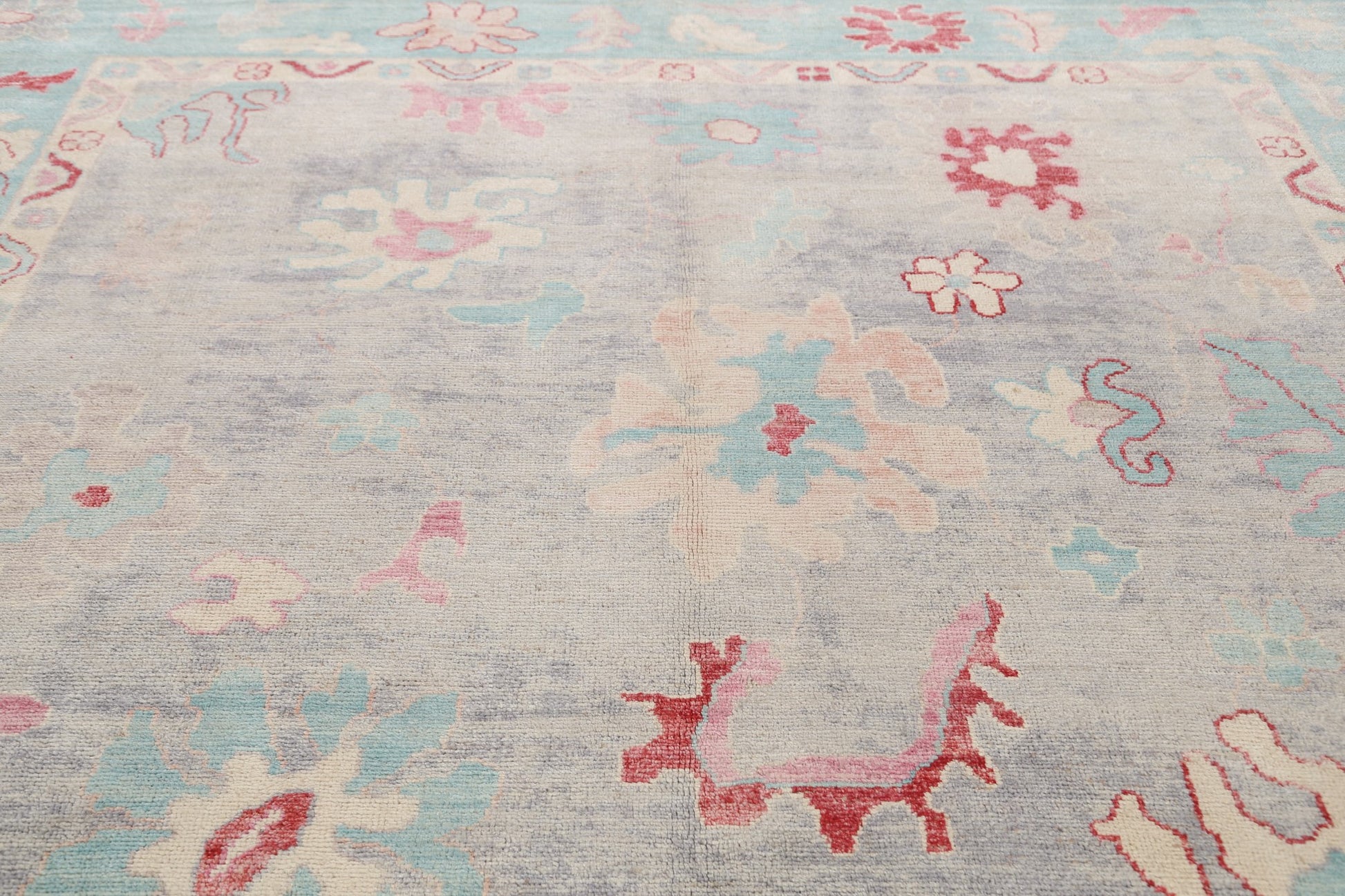 A Beautiful Genuine Turkey Oushak rug is Hand Knotted by skillful weavers in Turkey with 100% Wool Material. This rug is in New, First Quality condition. dimensions are 11' 9'' X 9' 4'' in foot and 358 X 284 in centimeter. the primary color is Greys & Charcoal.