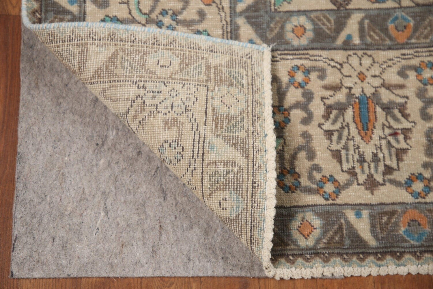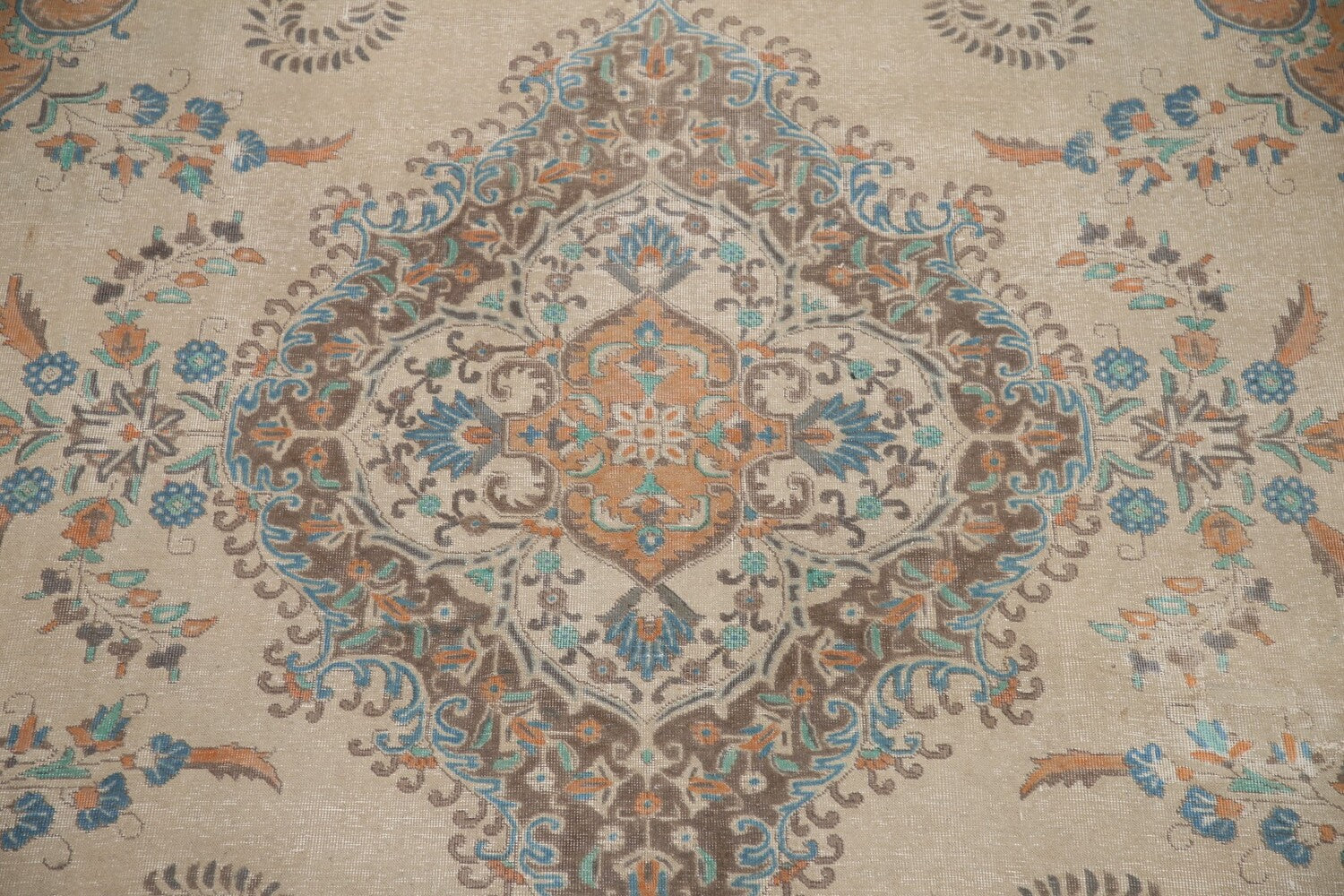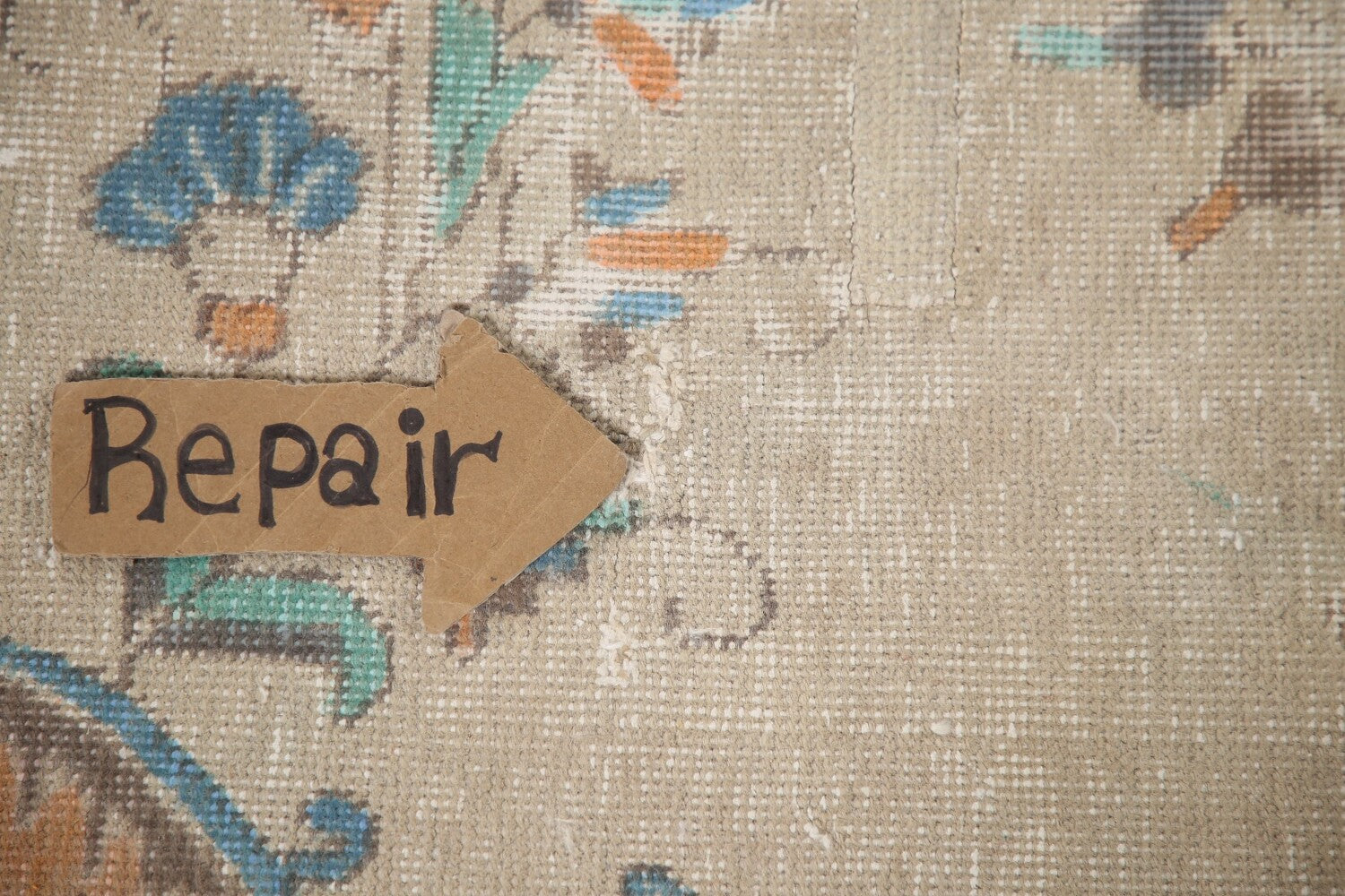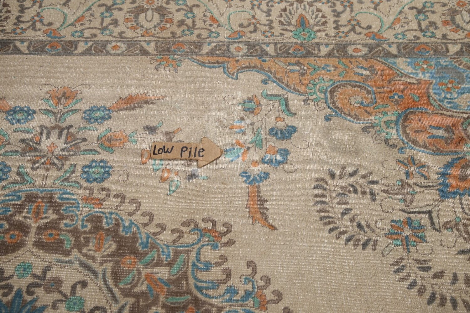 A Beautiful Genuine Persia ( Persia ) Tabriz rug is Hand Knotted by skillful weavers in Persia ( Persia ) with 100% Wool Material. This rug is in Very Good (Low Pile-Repairs) condition. dimensions are 12' 11'' X 9' 6'' in foot and 394 X 290 in centimeter. the primary color is Beige & Ivories.