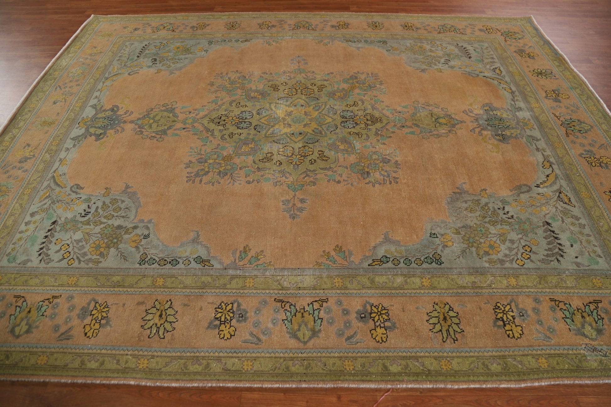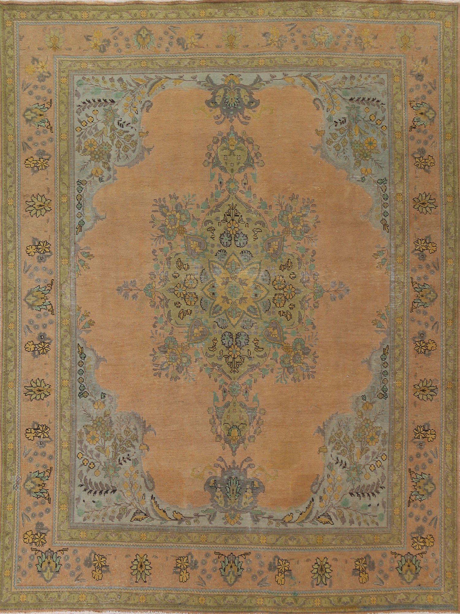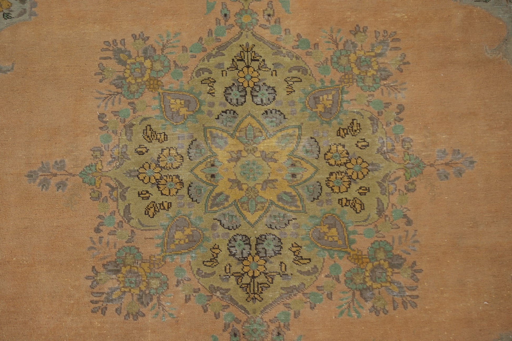 A Beautiful Genuine Persia ( Persia ) Tabriz rug is Hand Knotted by skillful weavers in Persia ( Persia ) with 100% Wool Material. This rug is in Very Good (Evenly Low Pile) condition. dimensions are 10' 6'' X 8' 5'' in foot and 320 X 257 in centimeter. the primary color is Coral.