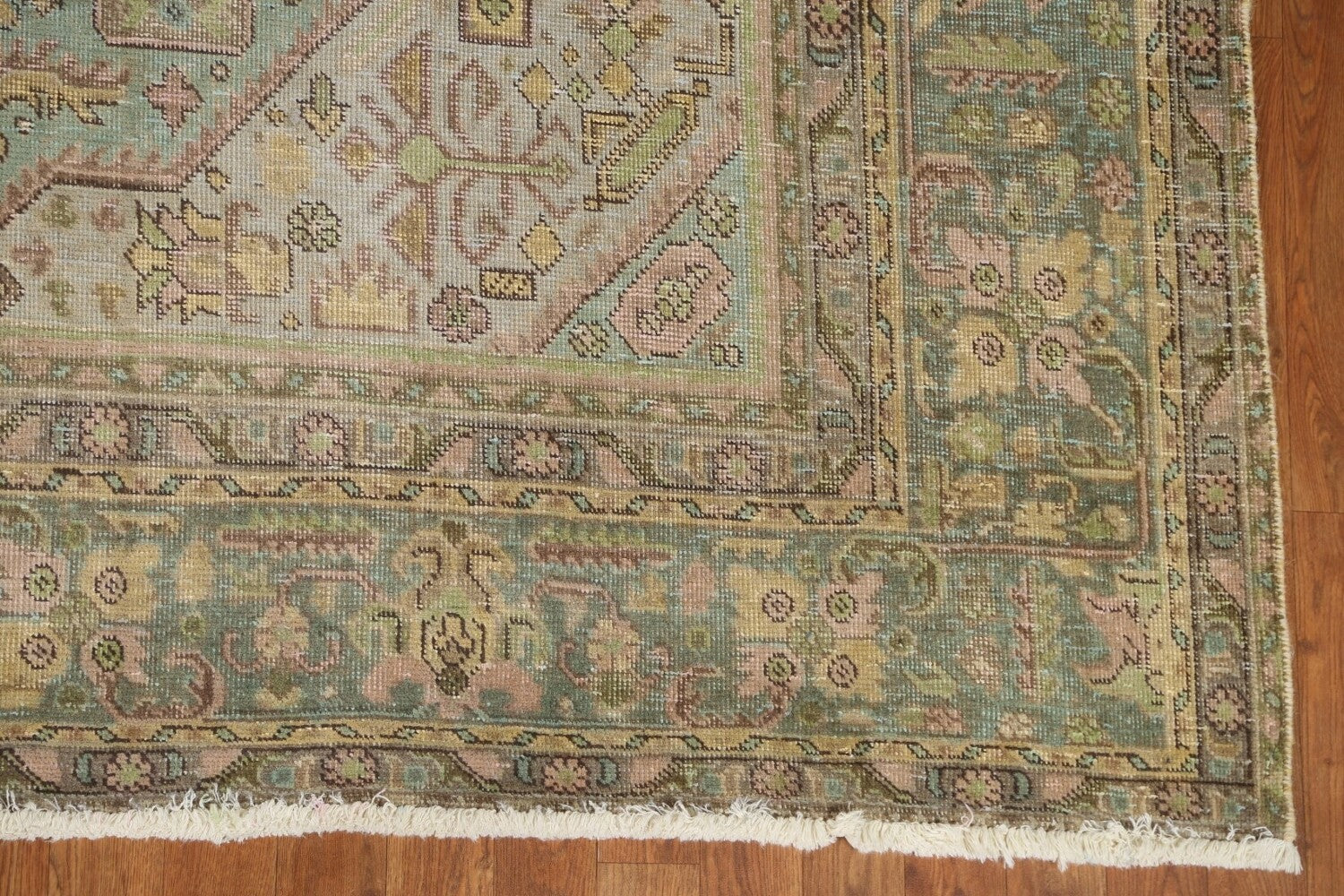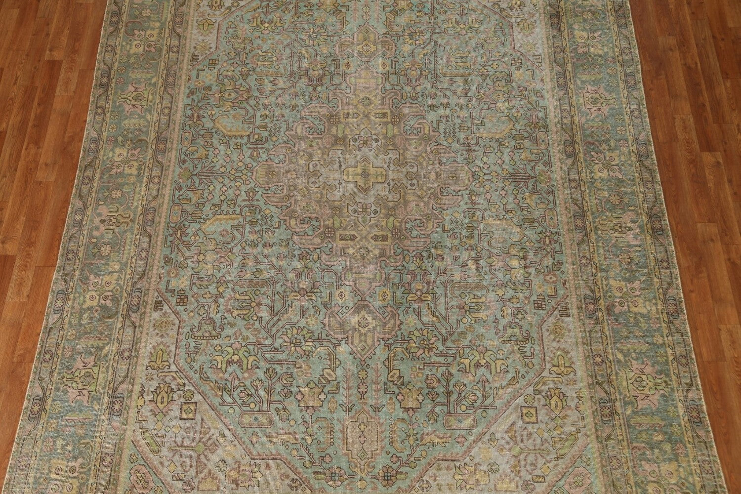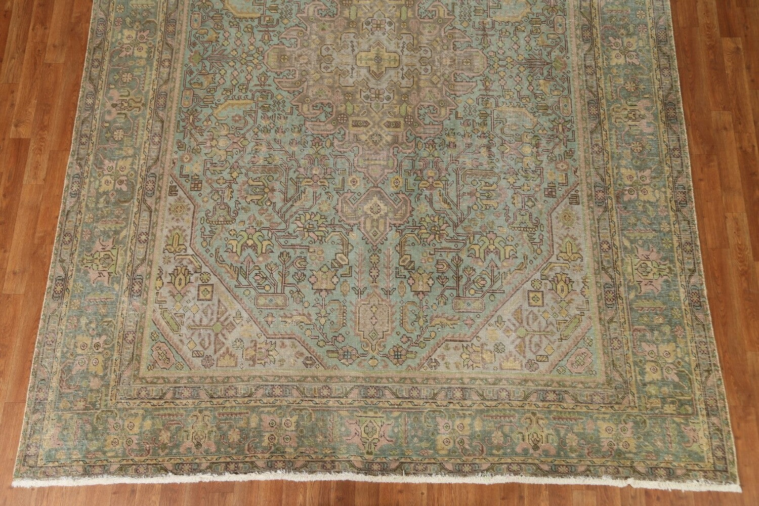 A Beautiful Genuine Persia ( Persia ) Tabriz rug is Hand Knotted by skillful weavers in Persia ( Persia ) with 100% Wool Material. This rug is in Very Good (Evenly Low Pile) condition. dimensions are 11' 2'' X 8' 2'' in foot and 340 X 249 in centimeter. the primary color is Green.