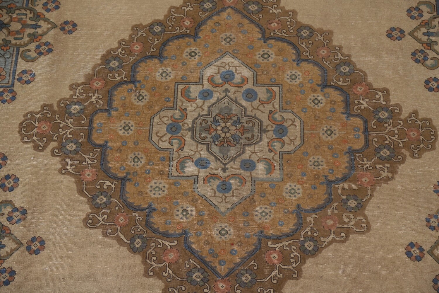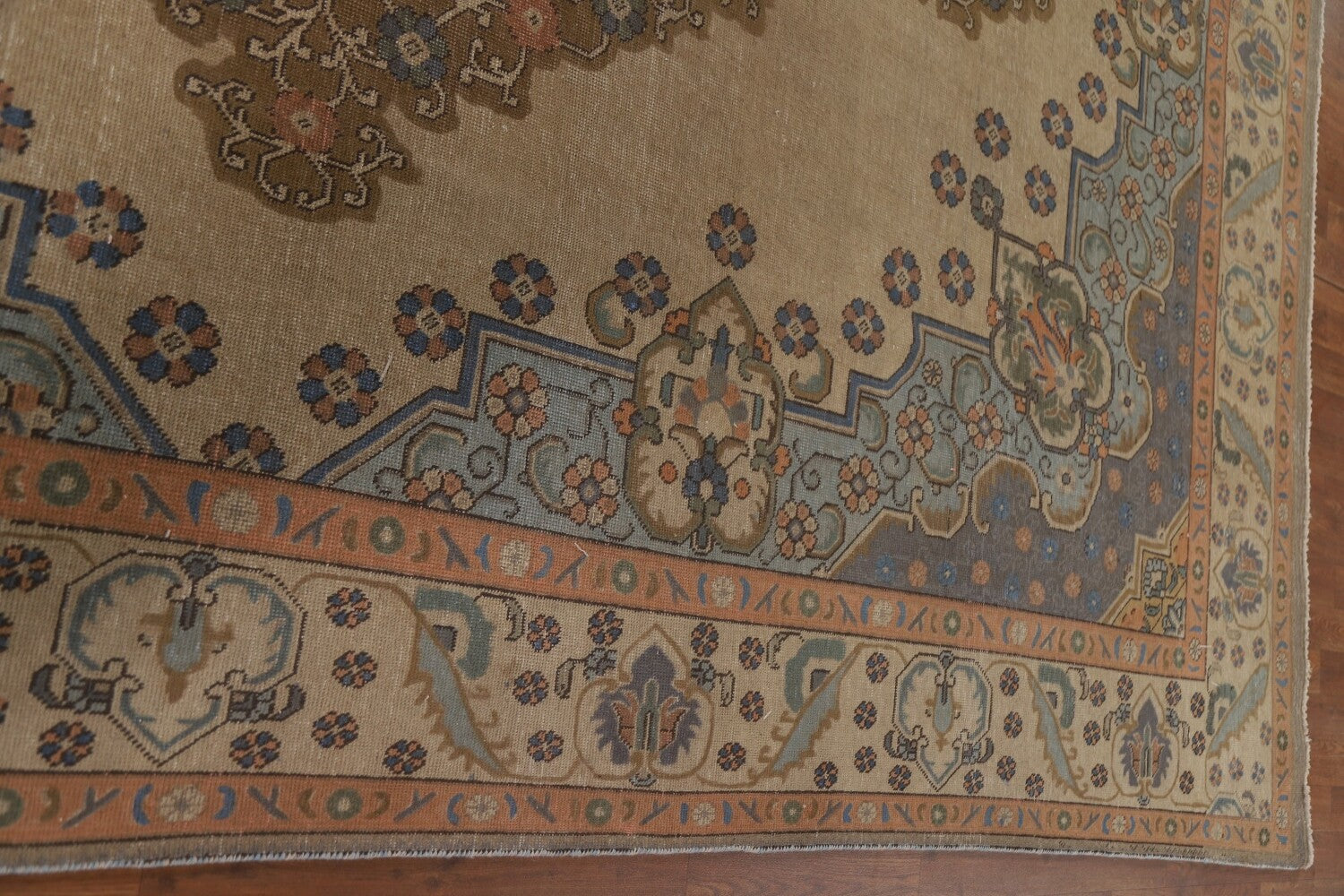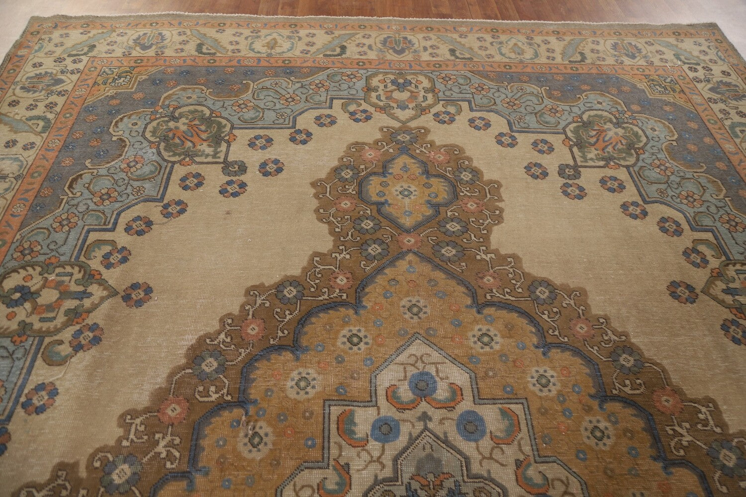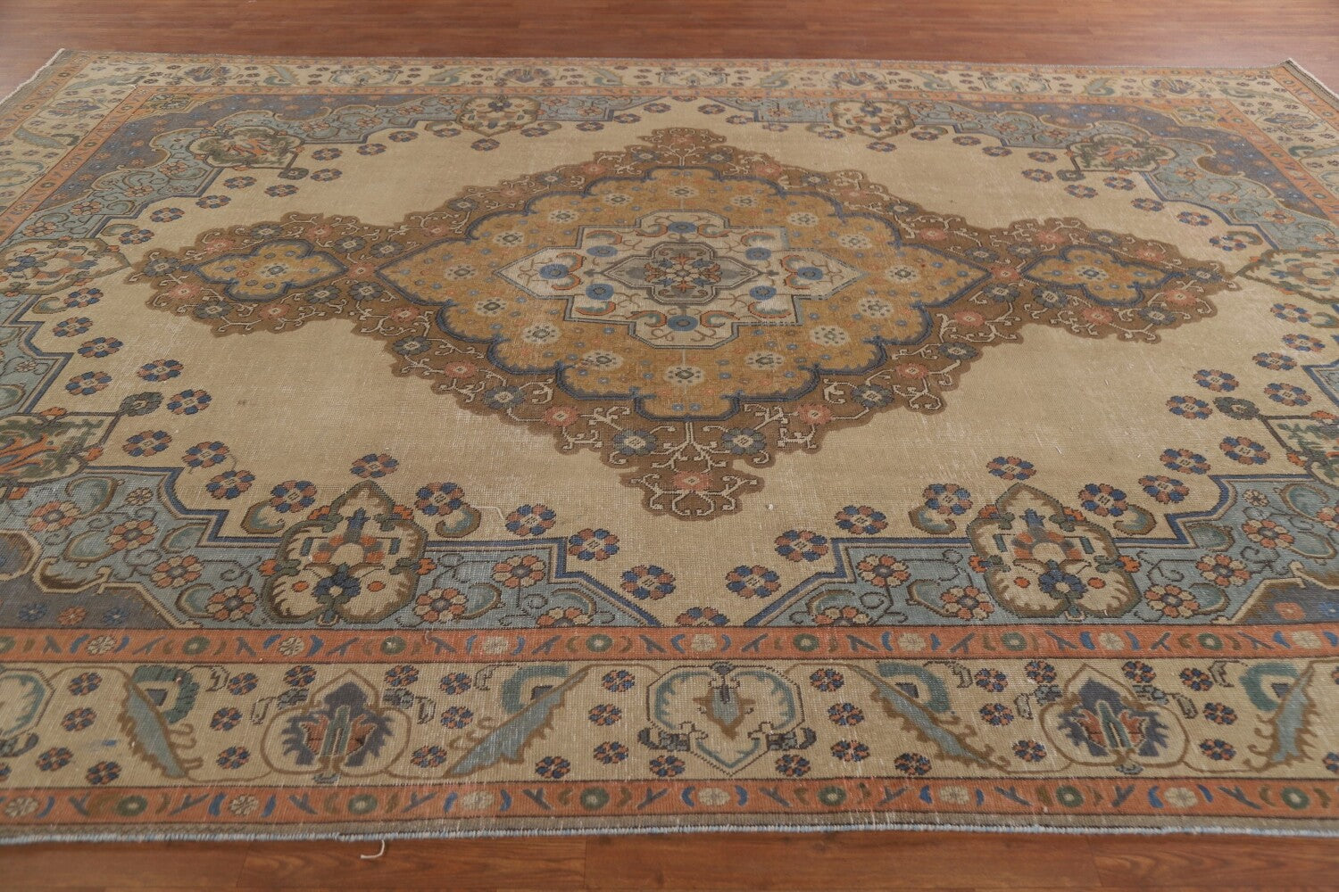 A Beautiful Genuine Persia ( Persia ) Tabriz rug is Hand Knotted by skillful weavers in Persia ( Persia ) with 100% Wool Material. This rug is in Very Good ( Evenly Low Pile-Repair) condition. dimensions are 12' 11'' X 9' 3'' in foot and 394 X 282 in centimeter. the primary color is Beige & Ivories.