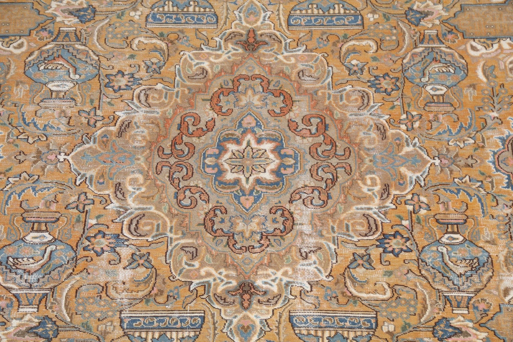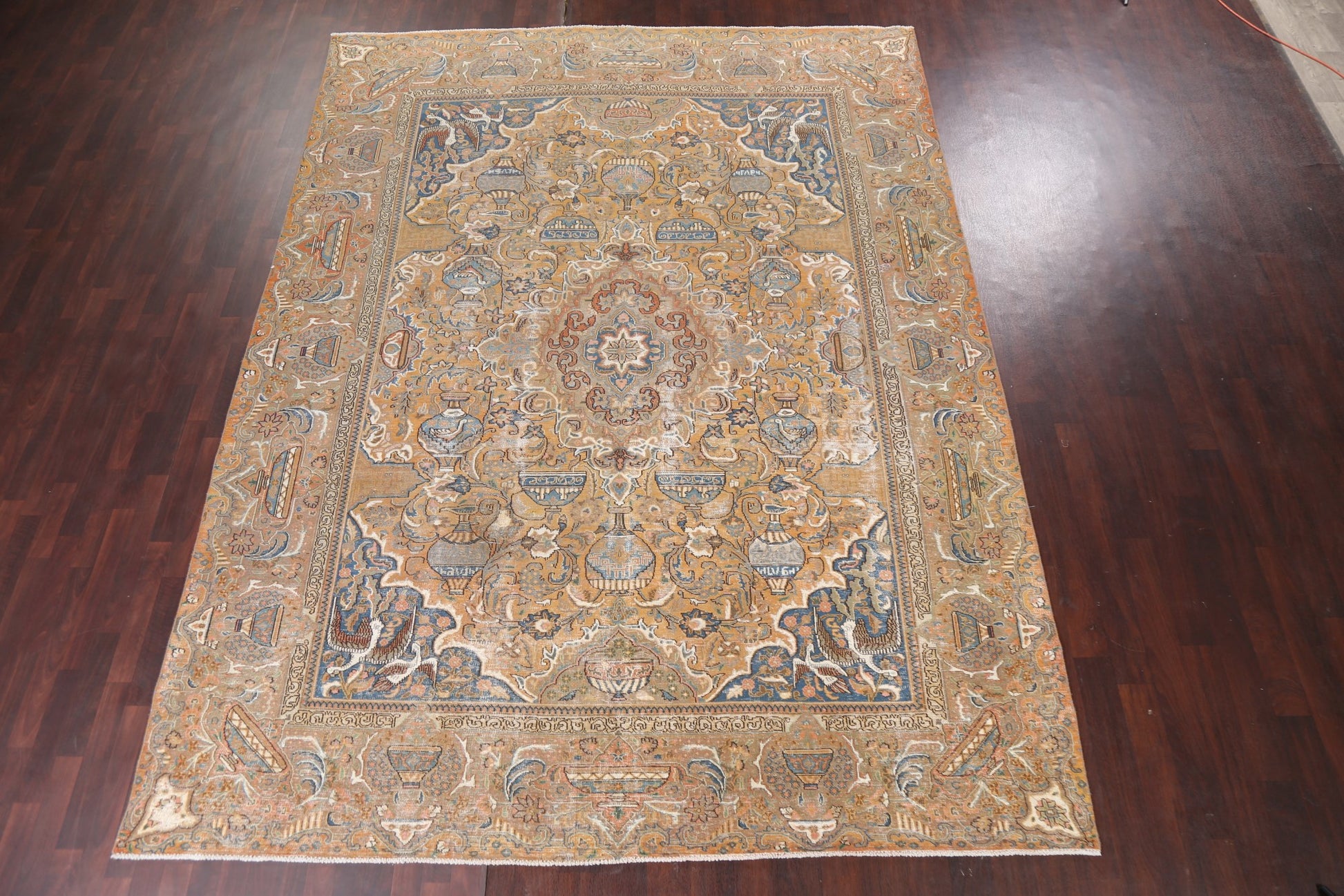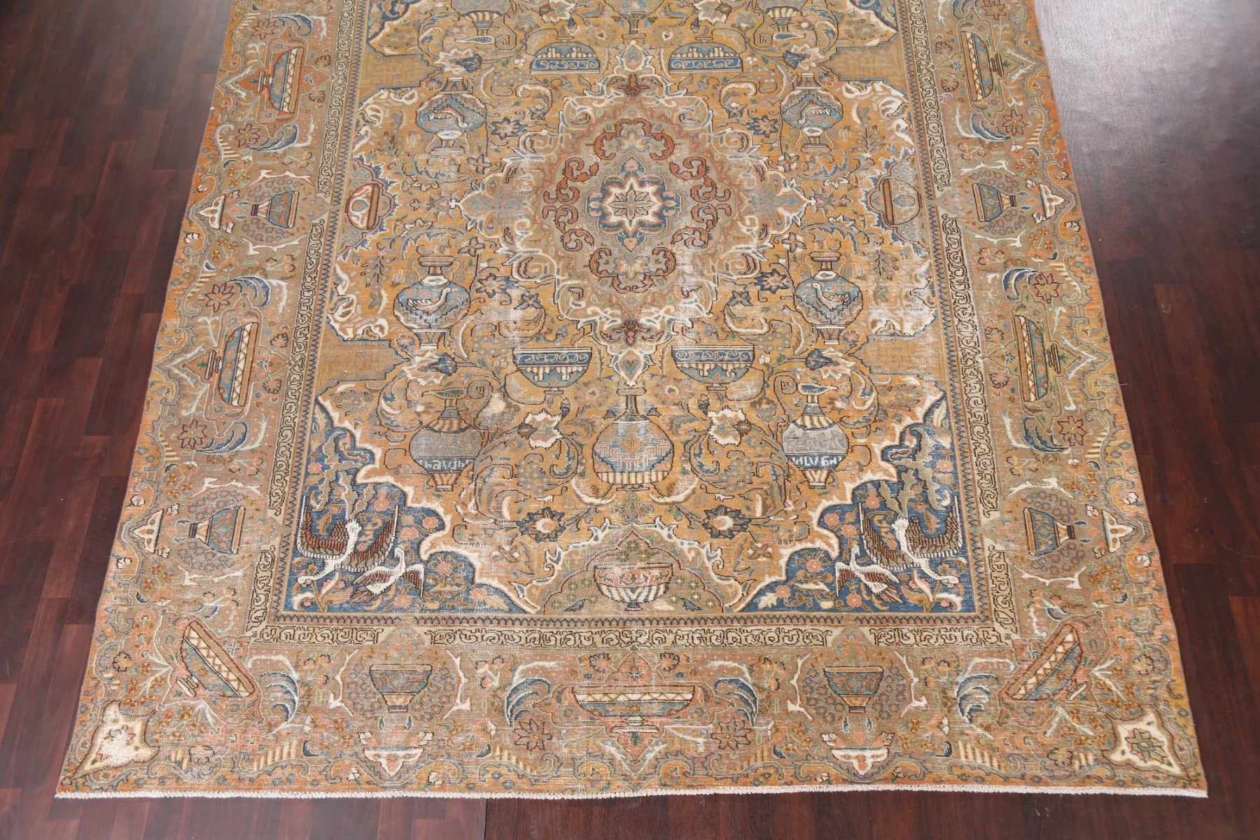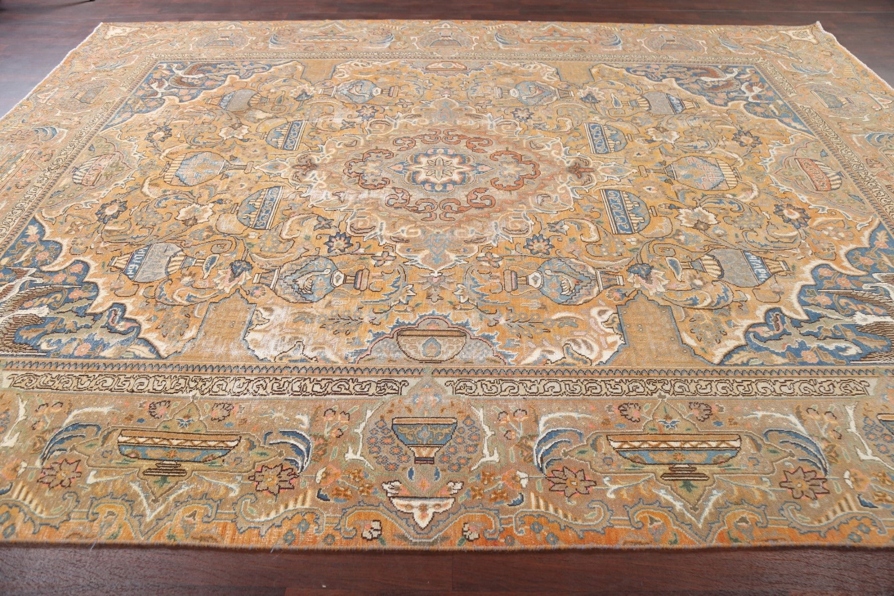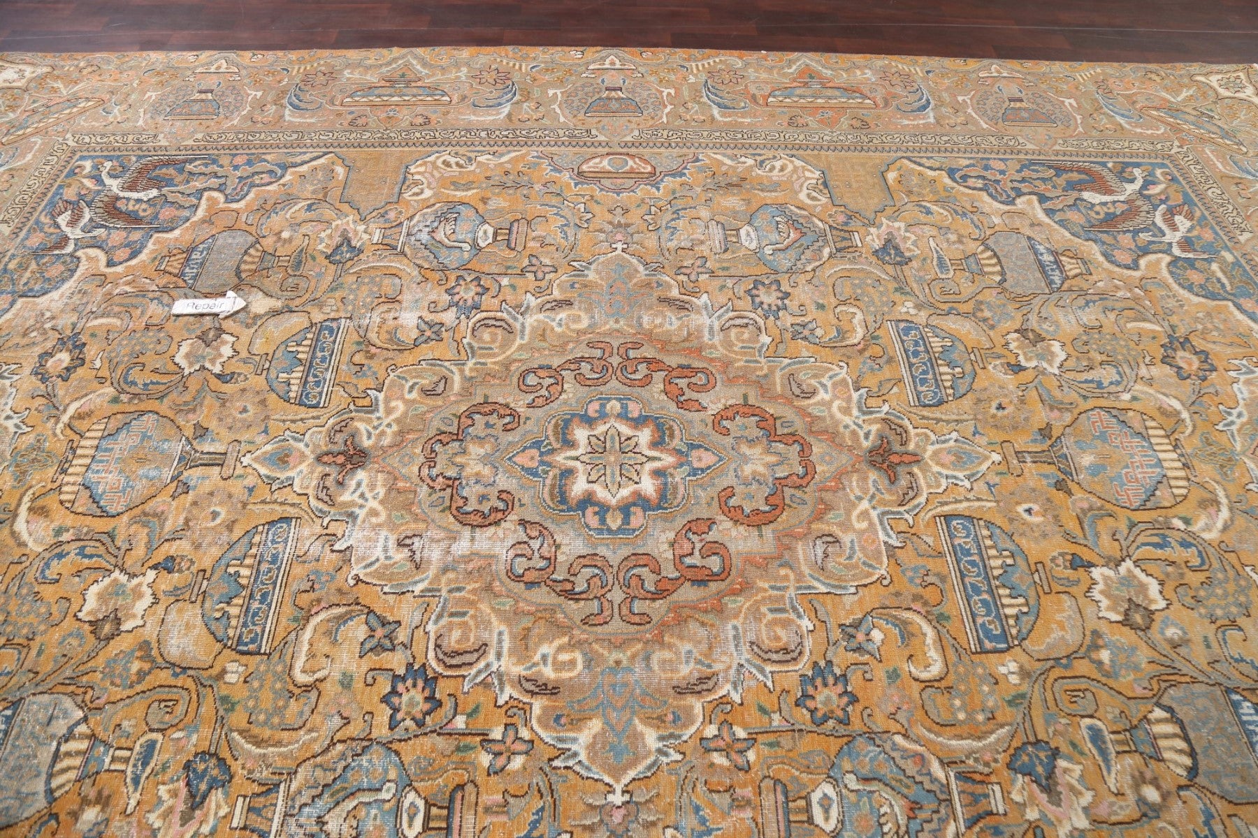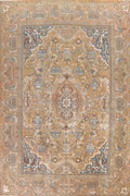 A Beautiful Genuine Persia ( Persia ) Kashmar rug is Hand Knotted by skillful weavers in Persia ( Persia ) with 100% Wool Material. This rug is in Very Good (Evenly Low Pile-small Repair) condition. dimensions are 12' 9'' X 9' 6'' in foot and 389 X 290 in centimeter. the primary color is Yellow & Gold.