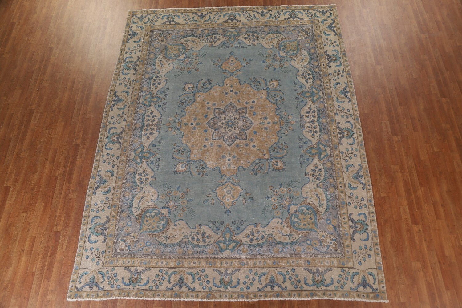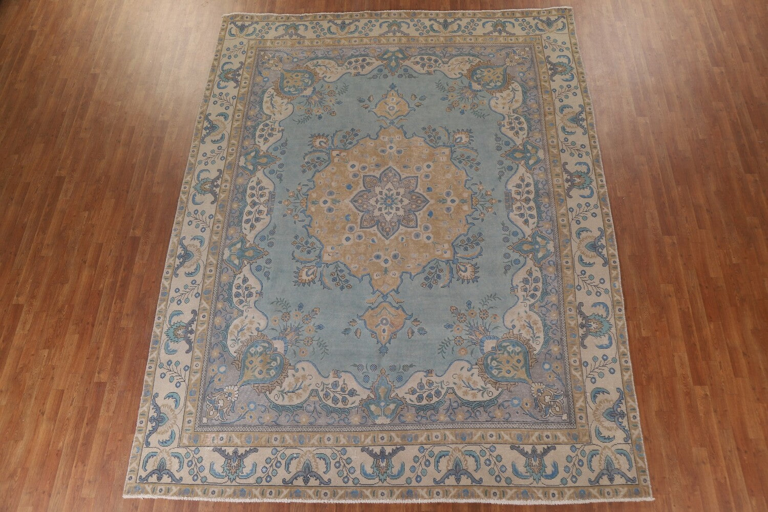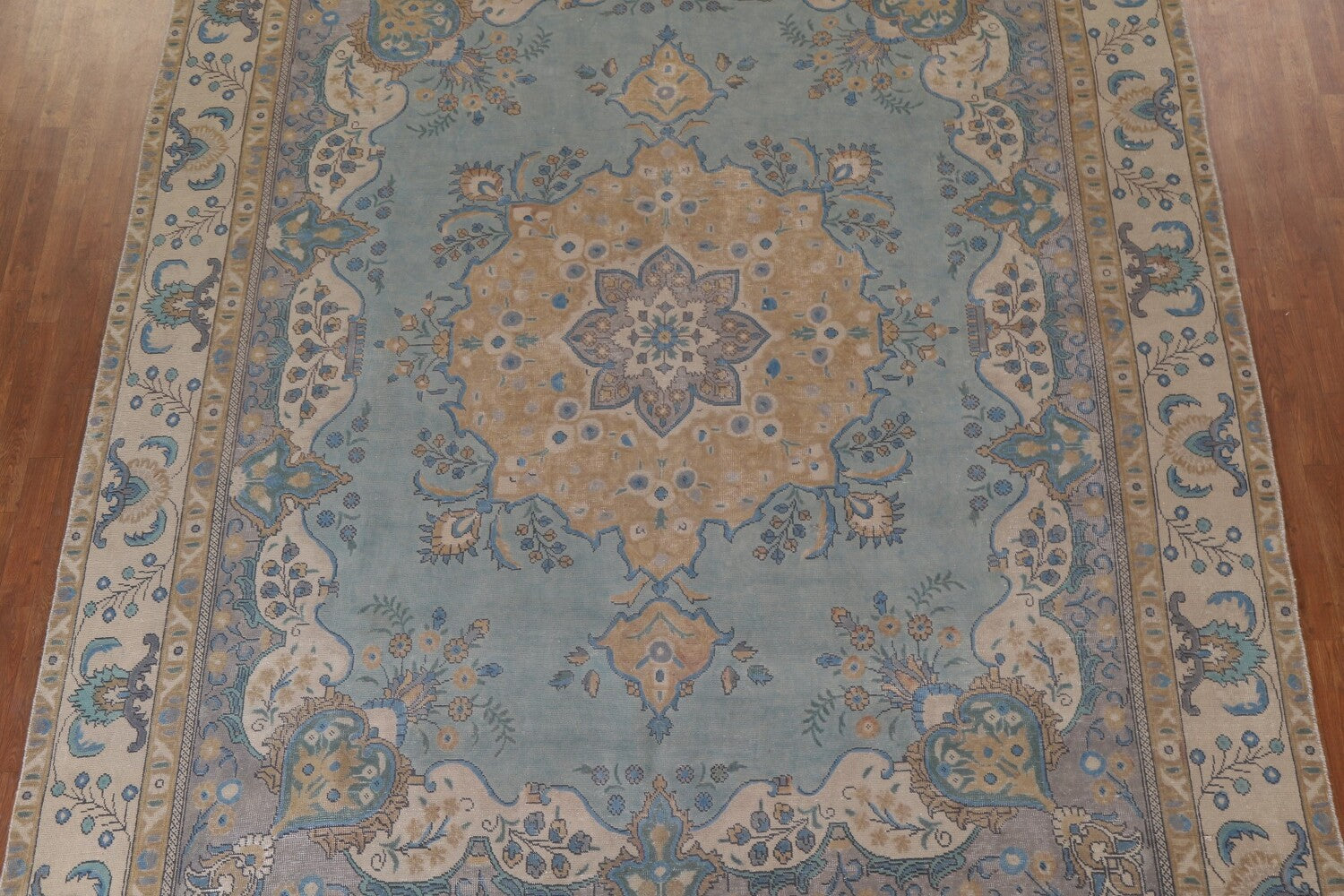 A Beautiful Genuine Persia ( Persia ) Tabriz rug is Hand Knotted by skillful weavers in Persia ( Persia ) with 100% Wool Material. This rug is in Very Good (Evenly Low Pile) condition. dimensions are 12' 4'' X 9' 8'' in foot and 376 X 295 in centimeter. the primary color is Navy Blue & Blues.