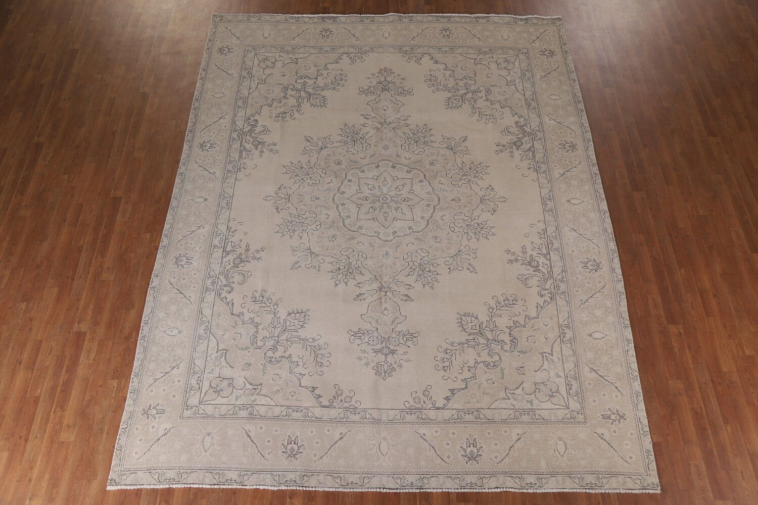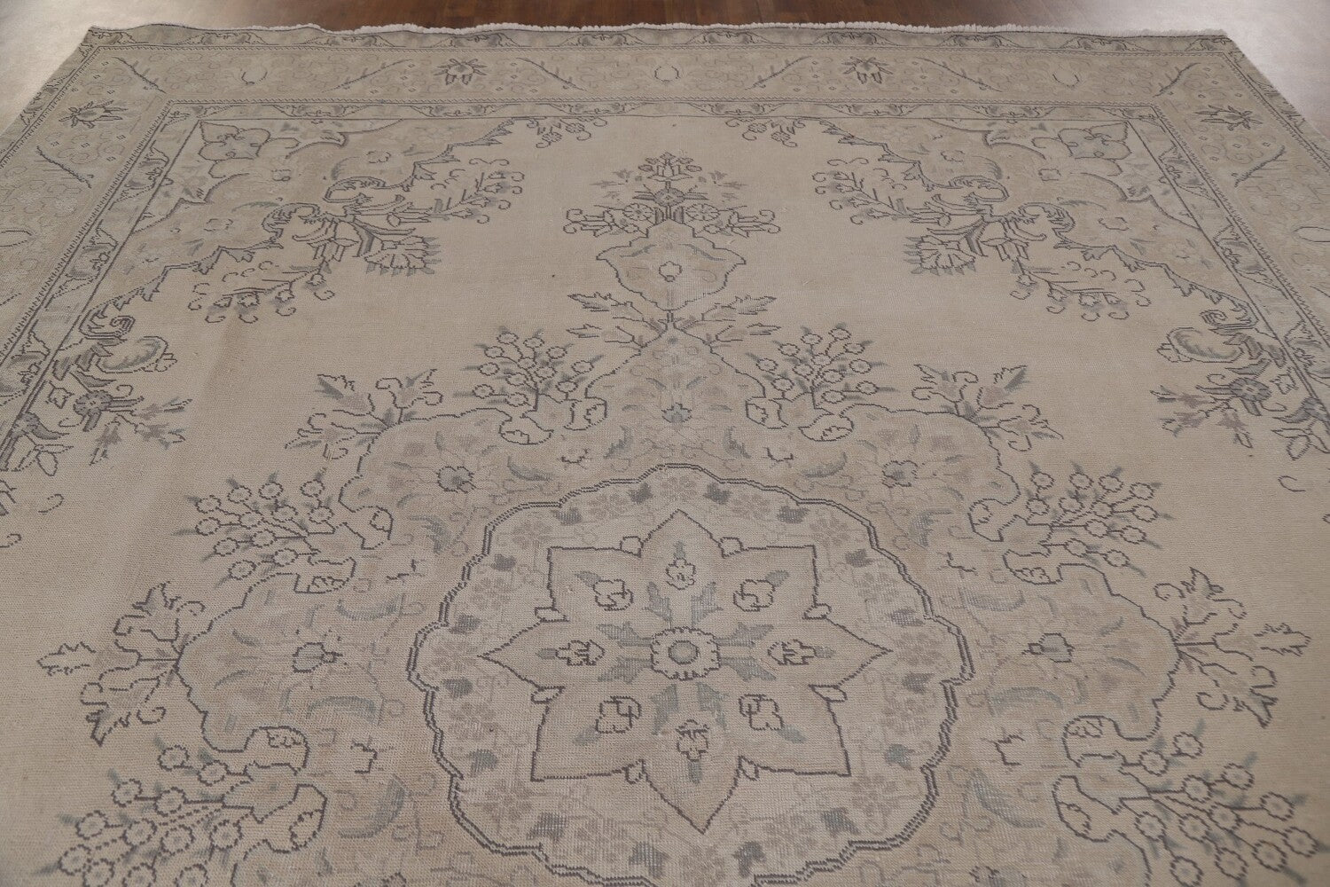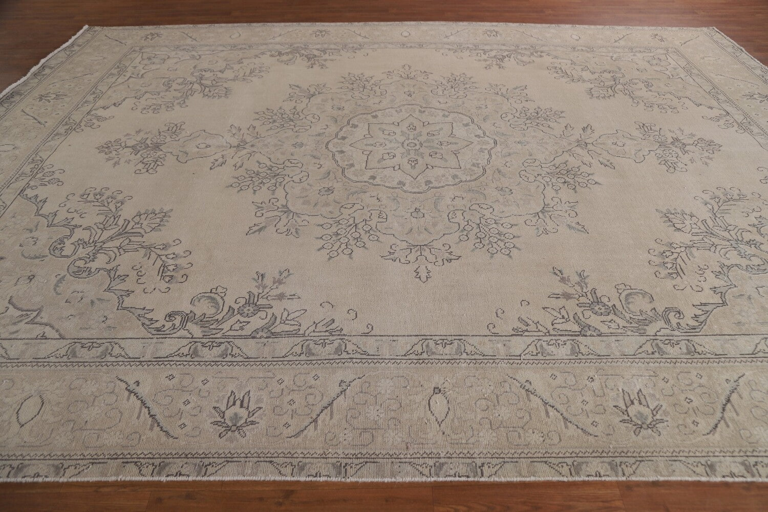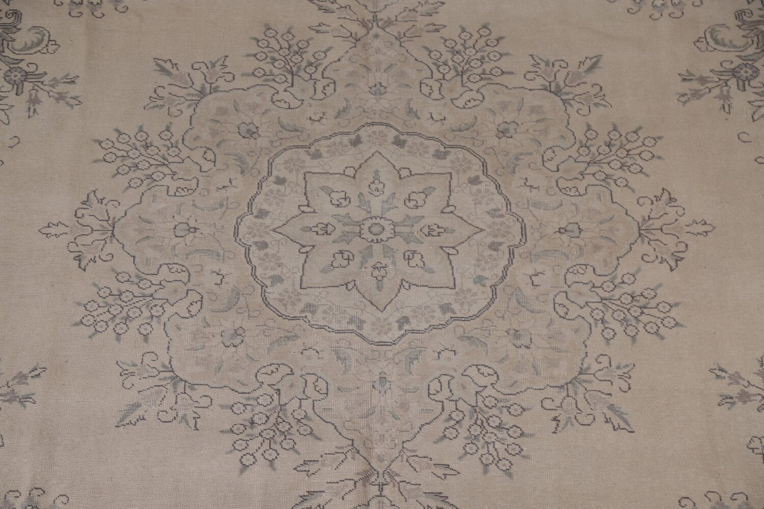 A Beautiful Genuine Persia ( Persia ) Tabriz rug is Hand Knotted by skillful weavers in Persia ( Persia ) with 100% Wool Material. This rug is in Very Good (Evenly Low Pile) condition. dimensions are 12' 5'' X 9' 7'' in foot and 378 X 292 in centimeter. the primary color is Beige & Ivories.