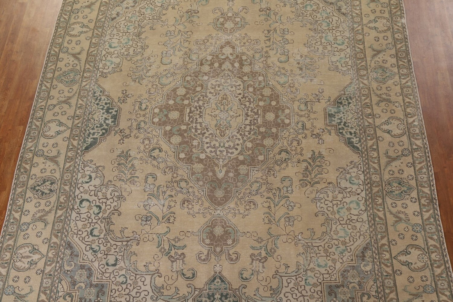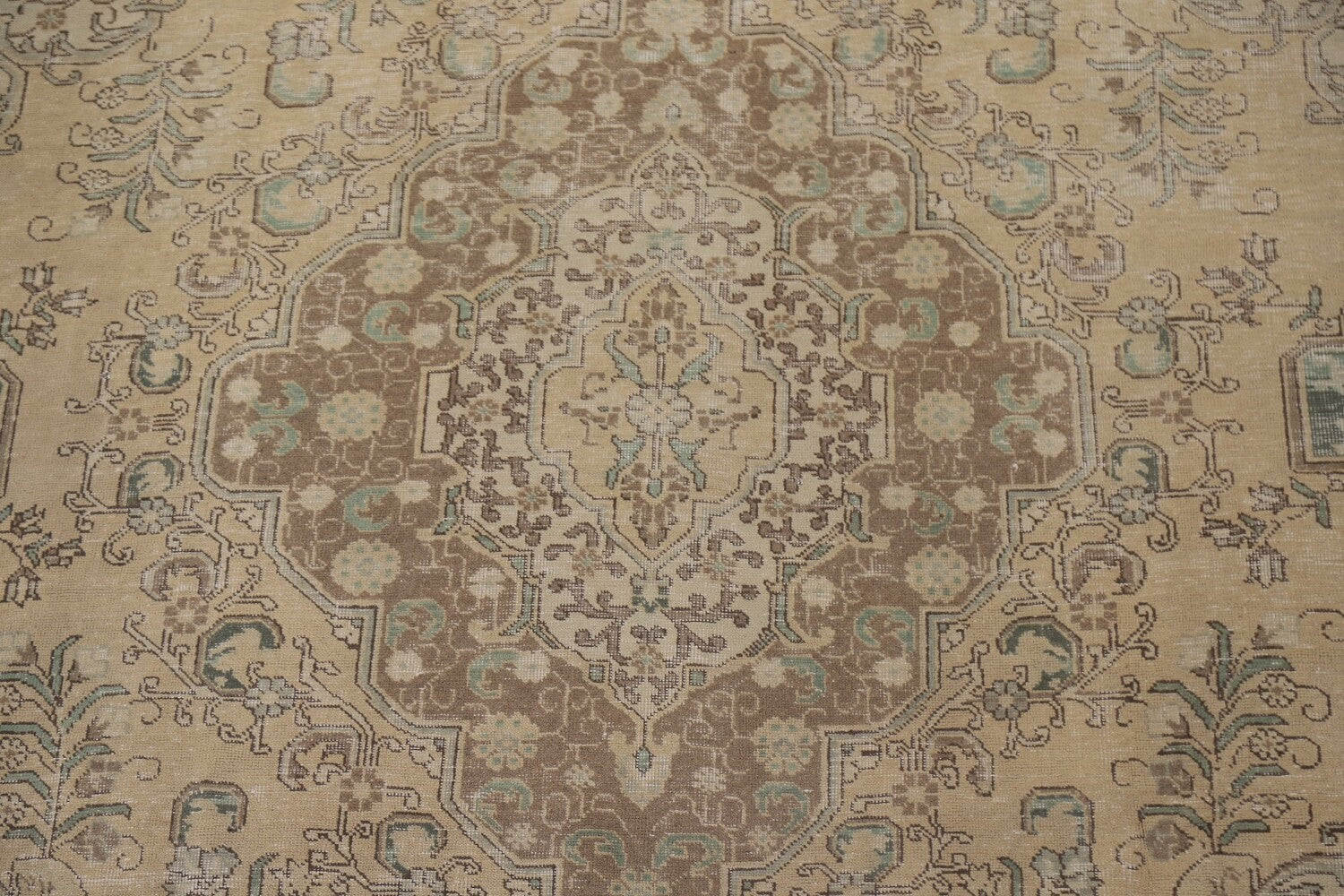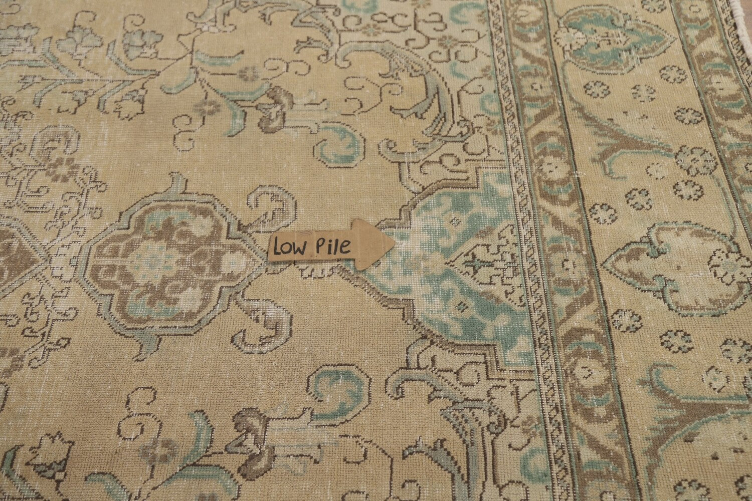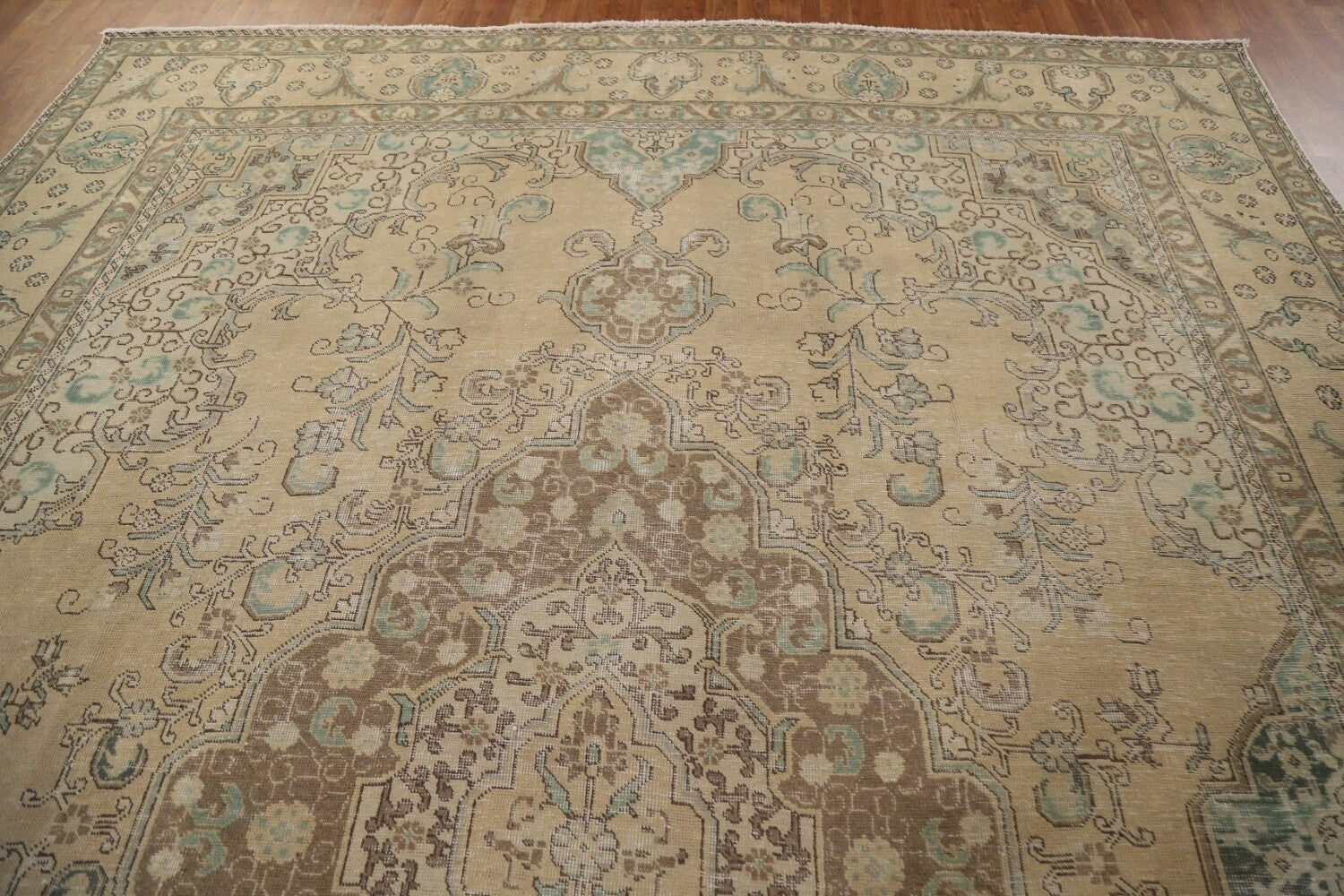 A Beautiful Genuine Persia ( Persia ) Tabriz rug is Hand Knotted by skillful weavers in Persia ( Persia ) with 100% Wool Material. This rug is in Very Good (Low Pile) condition. dimensions are 12' 7'' X 9' 8'' in foot and 384 X 295 in centimeter. the primary color is Peach.