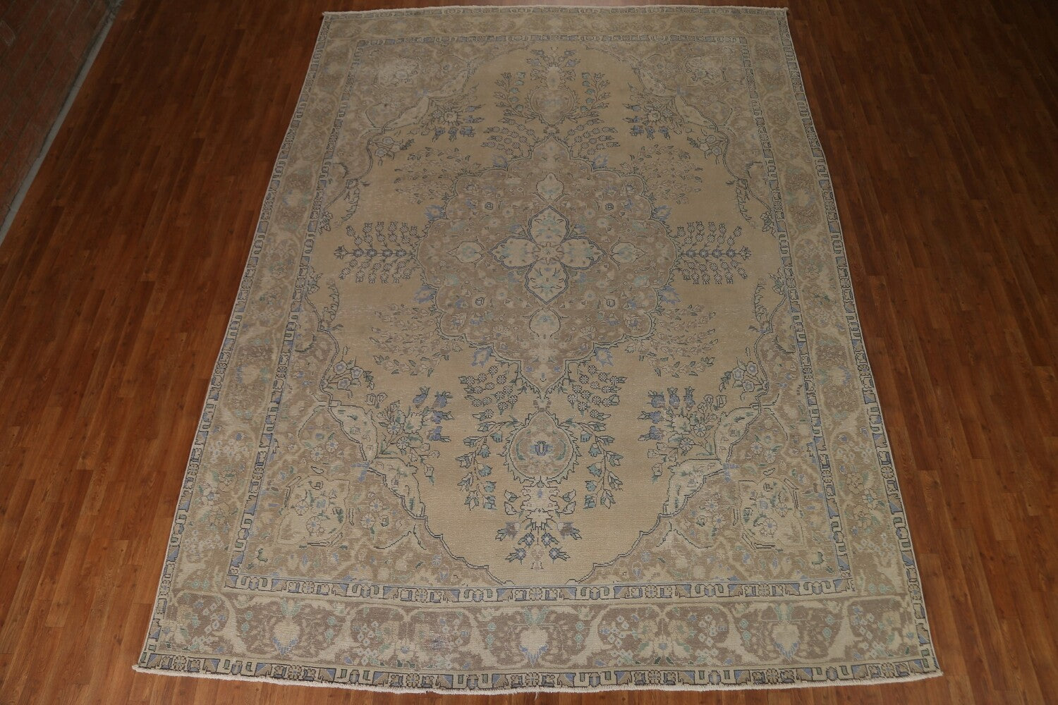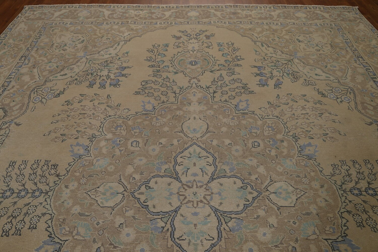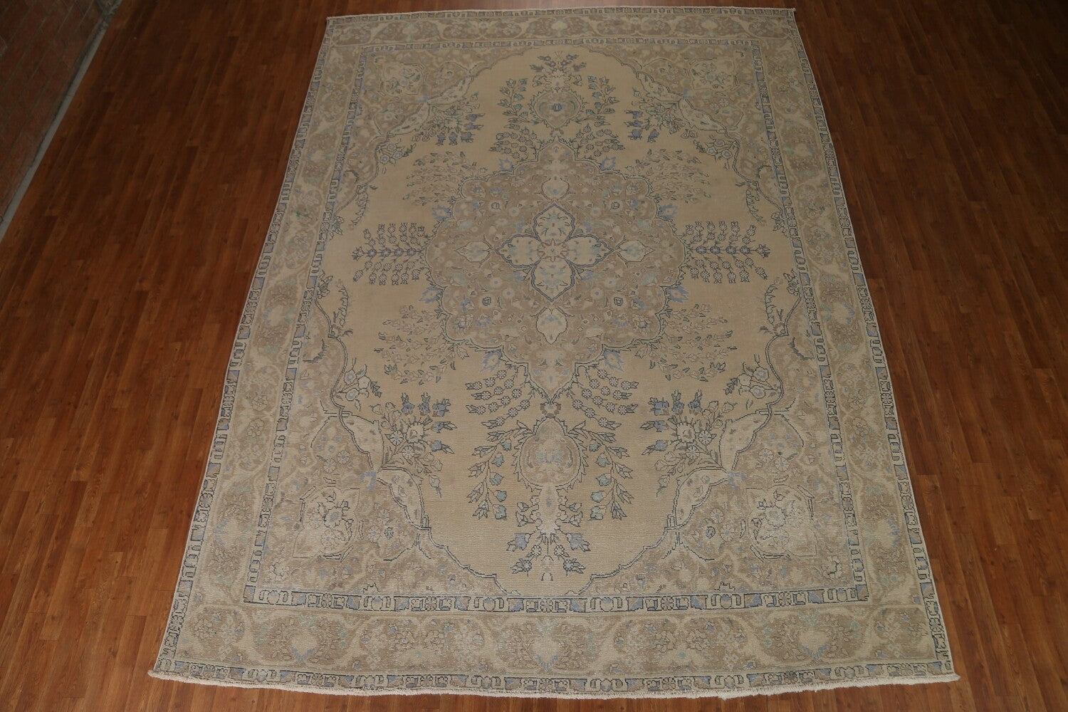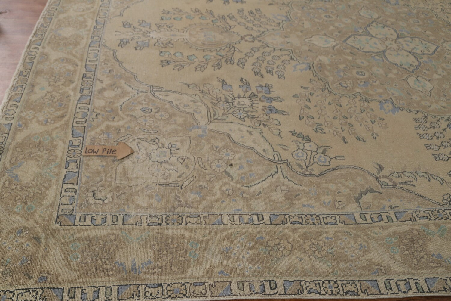 A Beautiful Genuine Persia ( Persia ) Tabriz rug is Hand Knotted by skillful weavers in Persia ( Persia ) with 100% Wool Material. This rug is in Very Good (Low Pile) condition. dimensions are 13' 0'' X 9' 9'' in foot and 396 X 297 in centimeter. the primary color is Beige & Ivories.