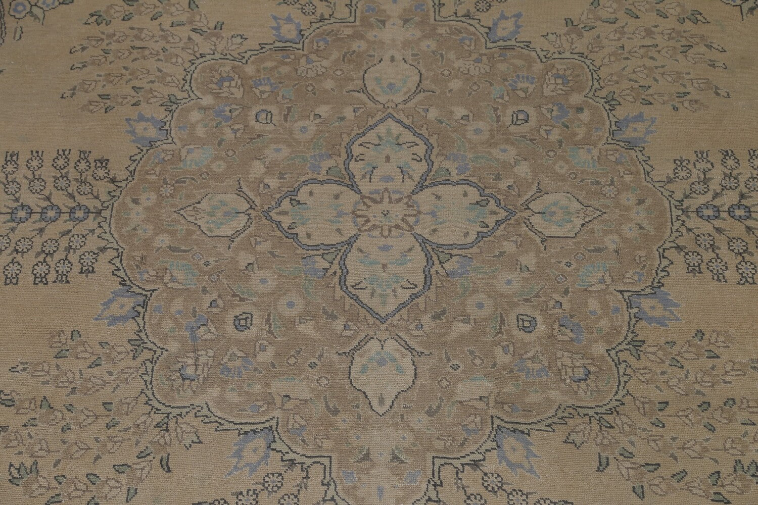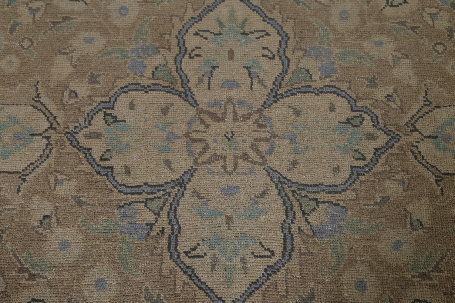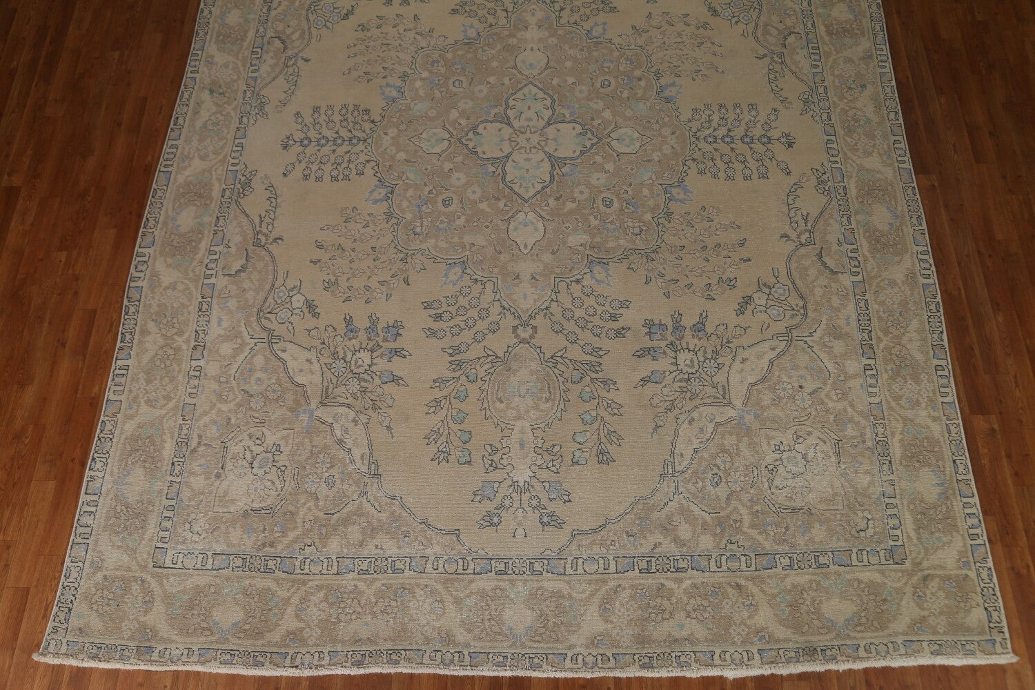 A Beautiful Genuine Persia ( Persia ) Tabriz rug is Hand Knotted by skillful weavers in Persia ( Persia ) with 100% Wool Material. This rug is in Very Good (Low Pile) condition. dimensions are 13' 0'' X 9' 9'' in foot and 396 X 297 in centimeter. the primary color is Beige & Ivories.