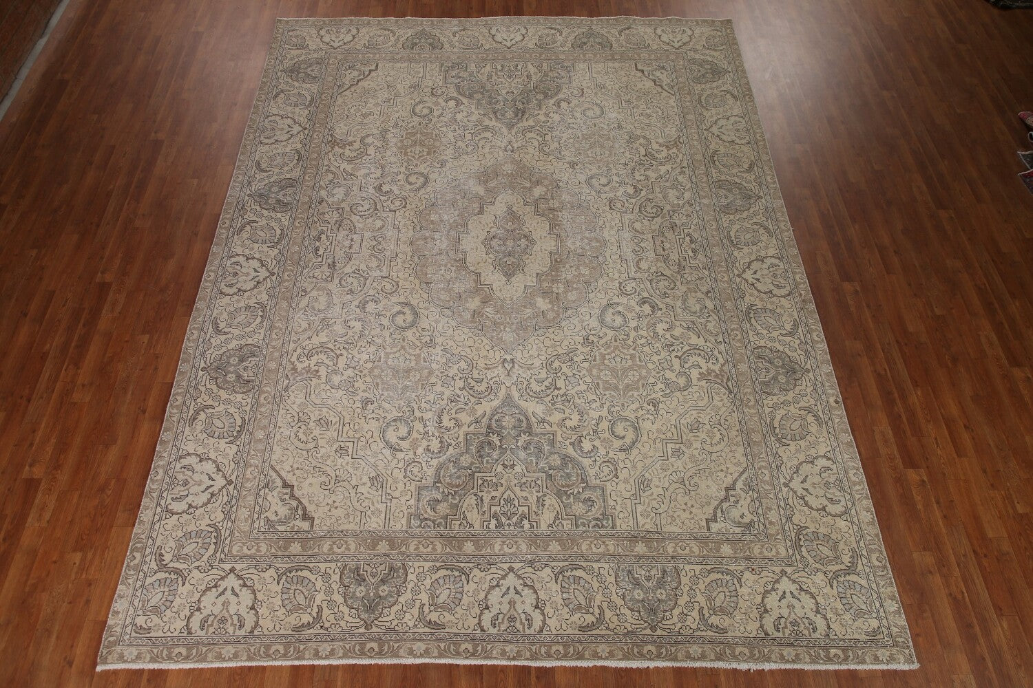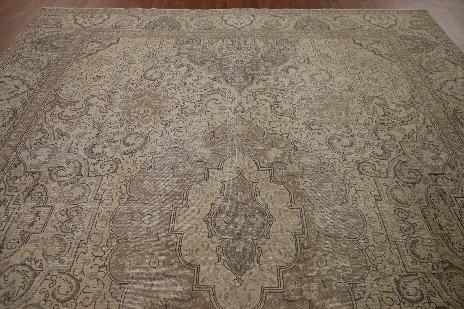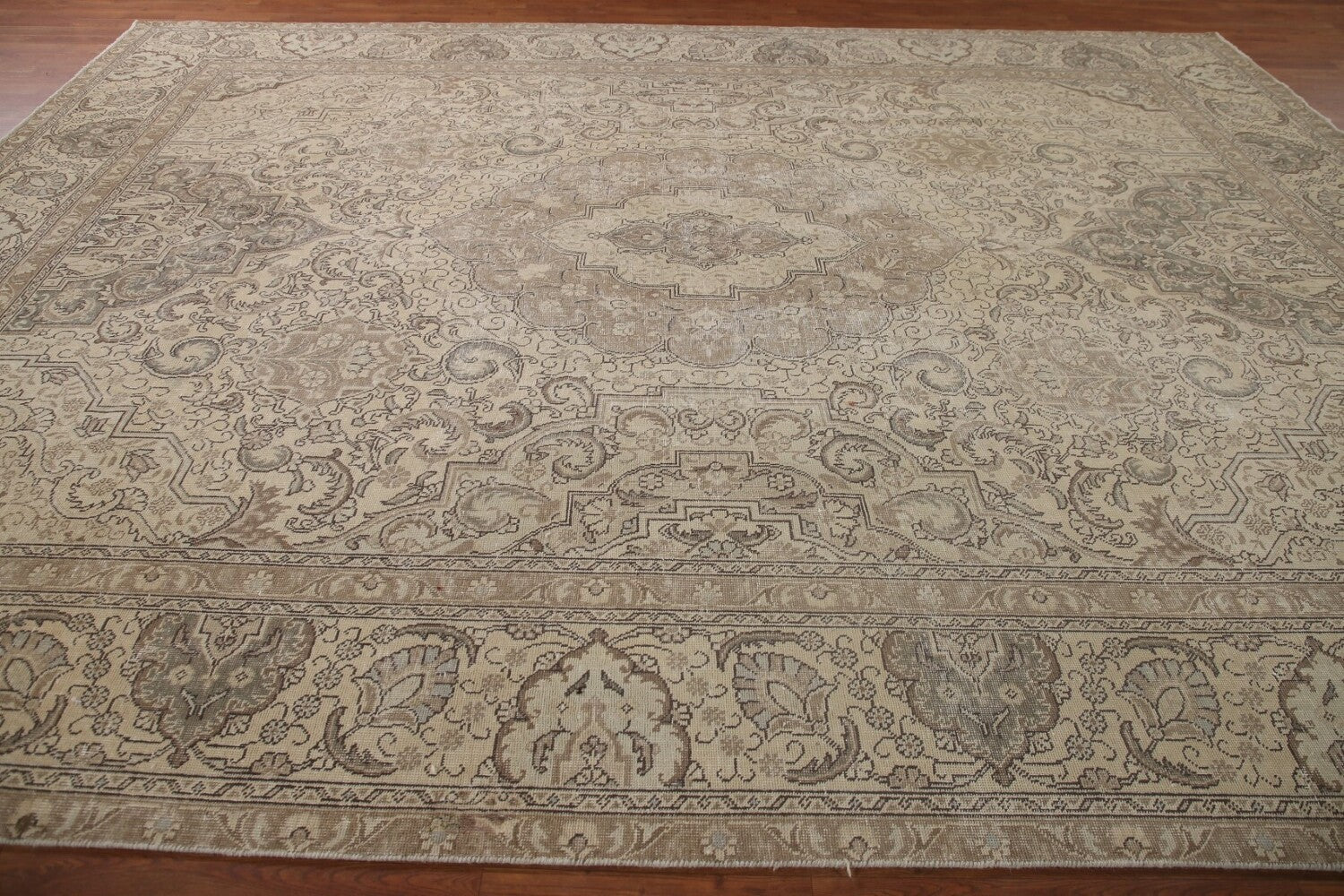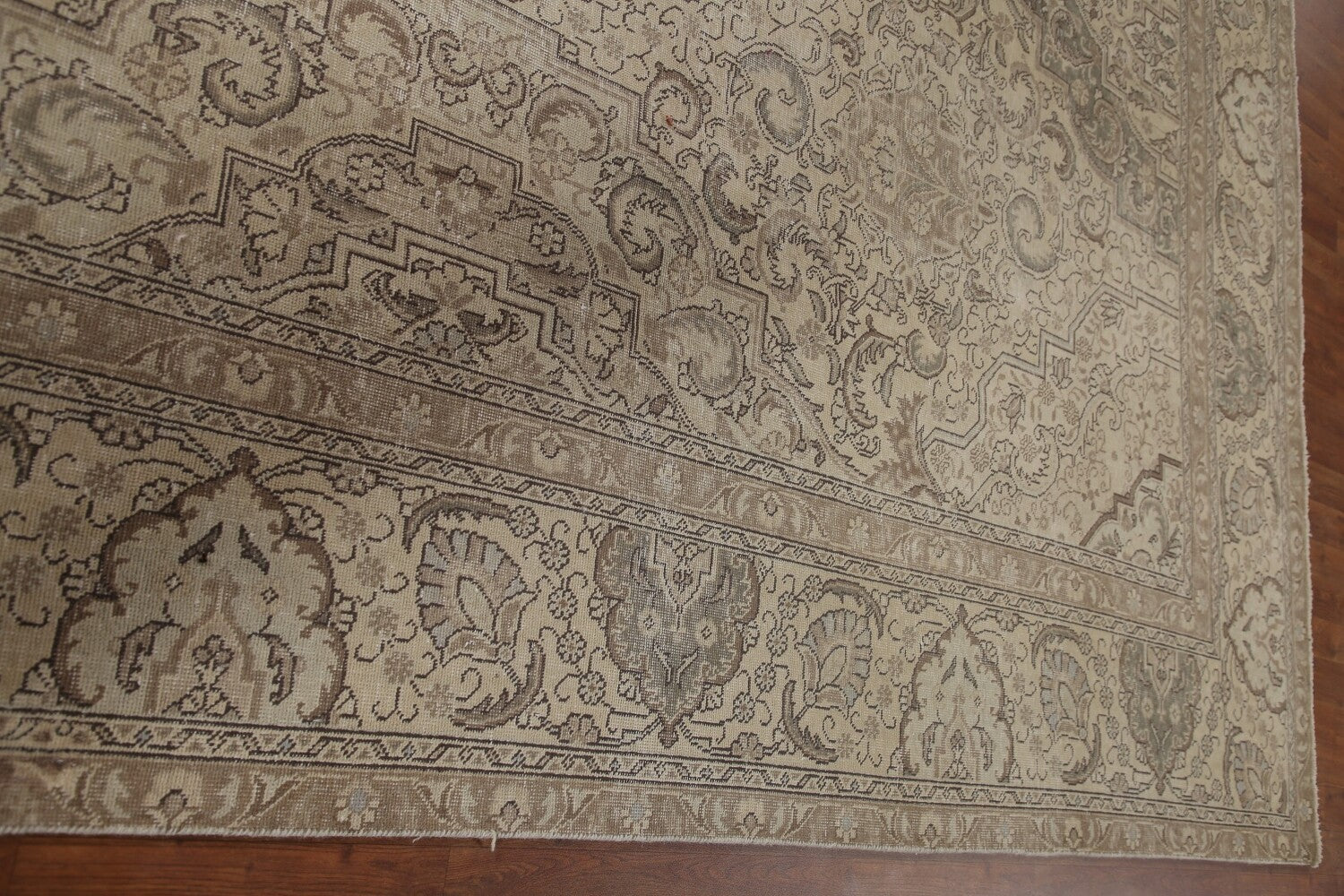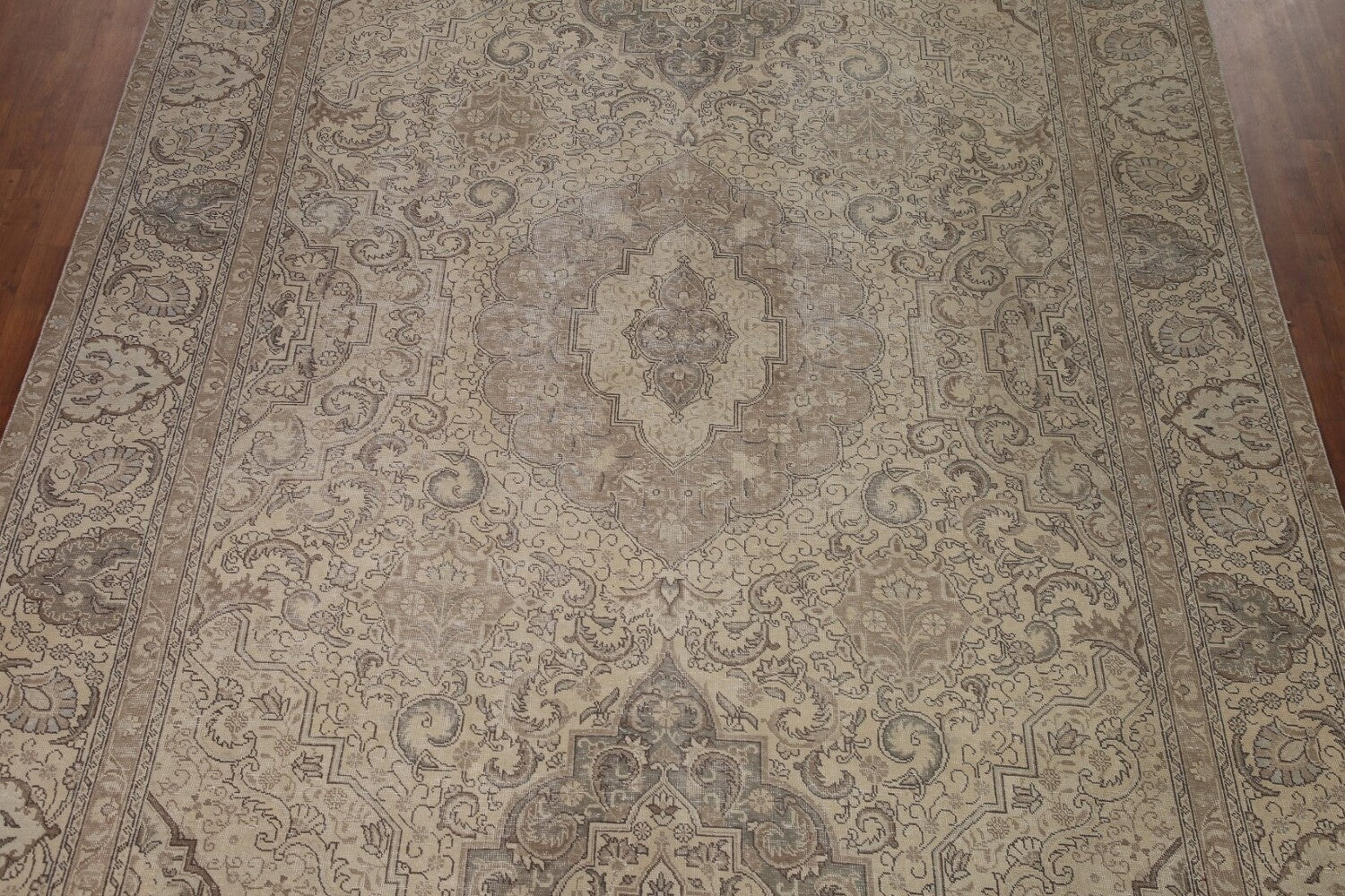 A Beautiful Genuine Persia ( Persia ) Tabriz rug is Hand Knotted by skillful weavers in Persia ( Persia ) with 100% Wool Material. This rug is in Very Good (Evenly Low Pile) condition. dimensions are 12' 9'' X 9' 7'' in foot and 389 X 292 in centimeter. the primary color is Beige & Ivories.