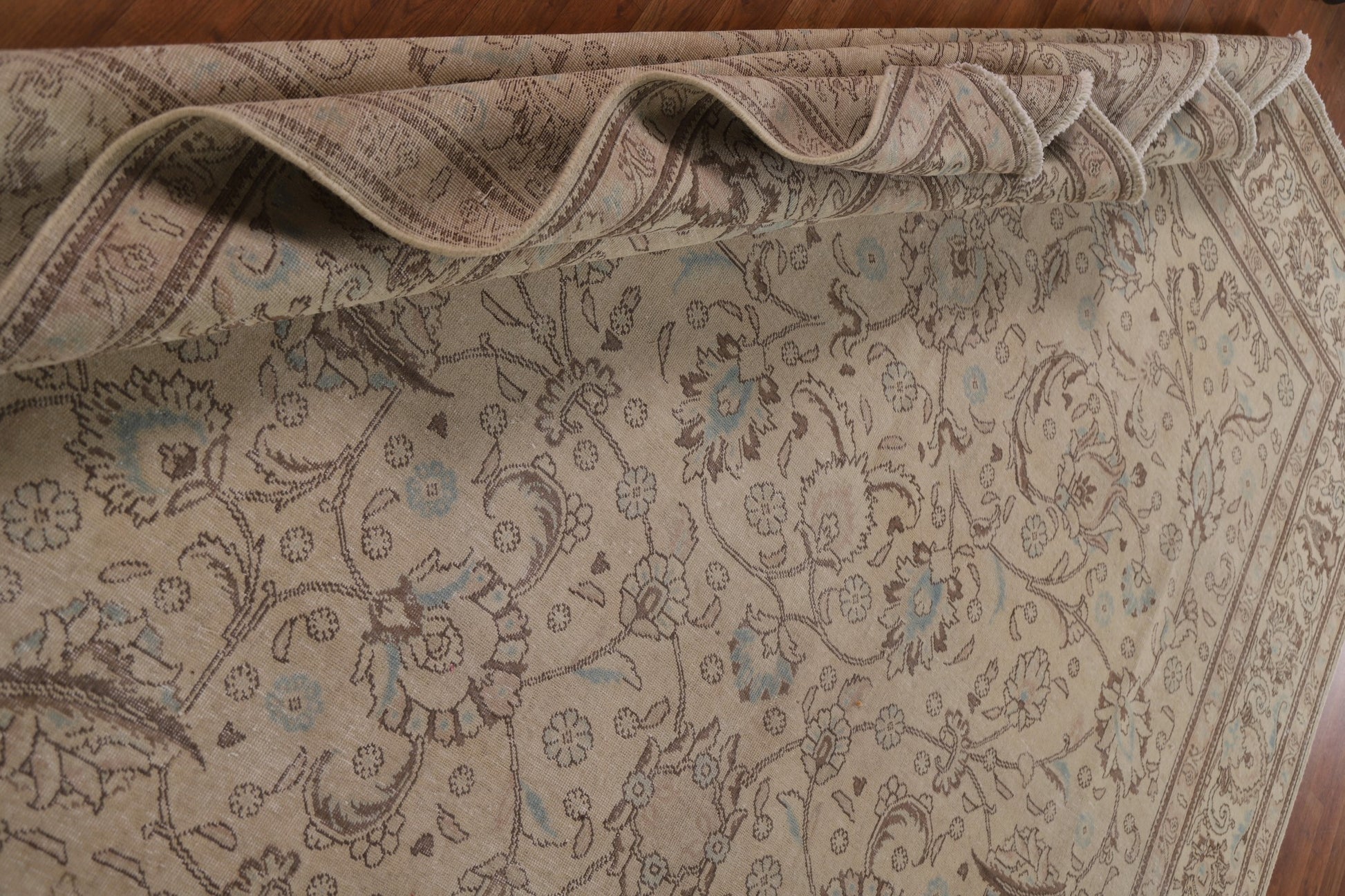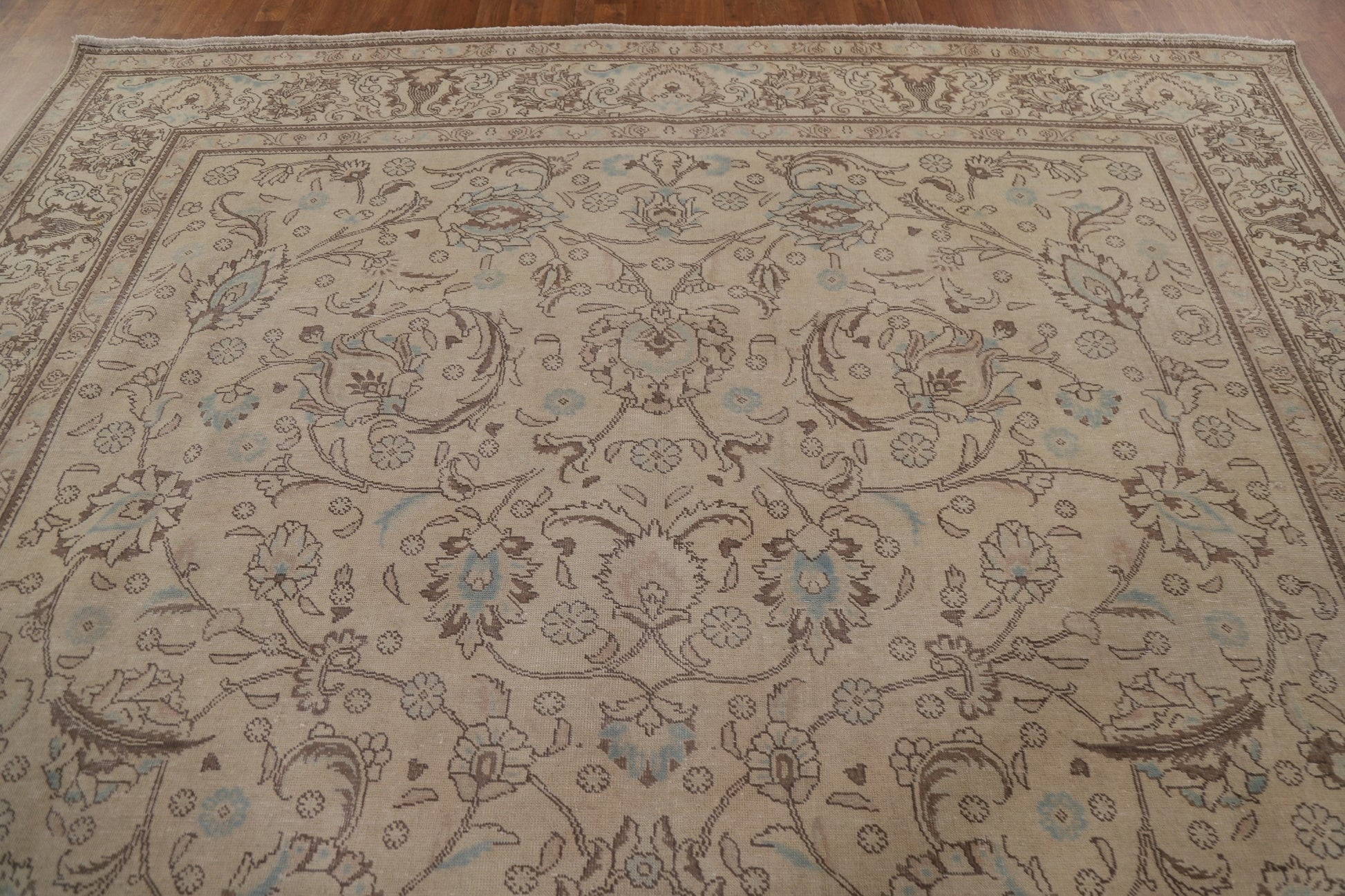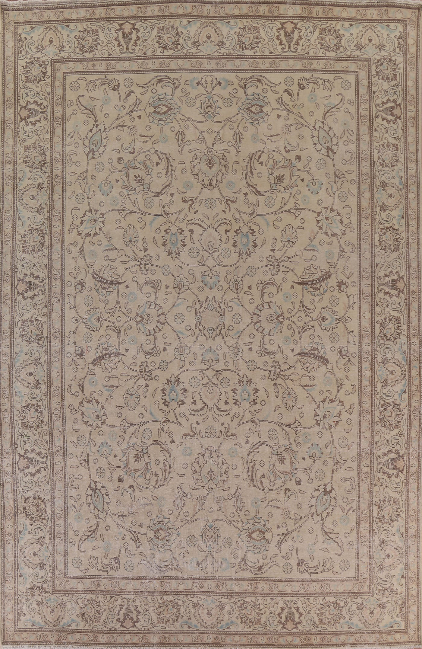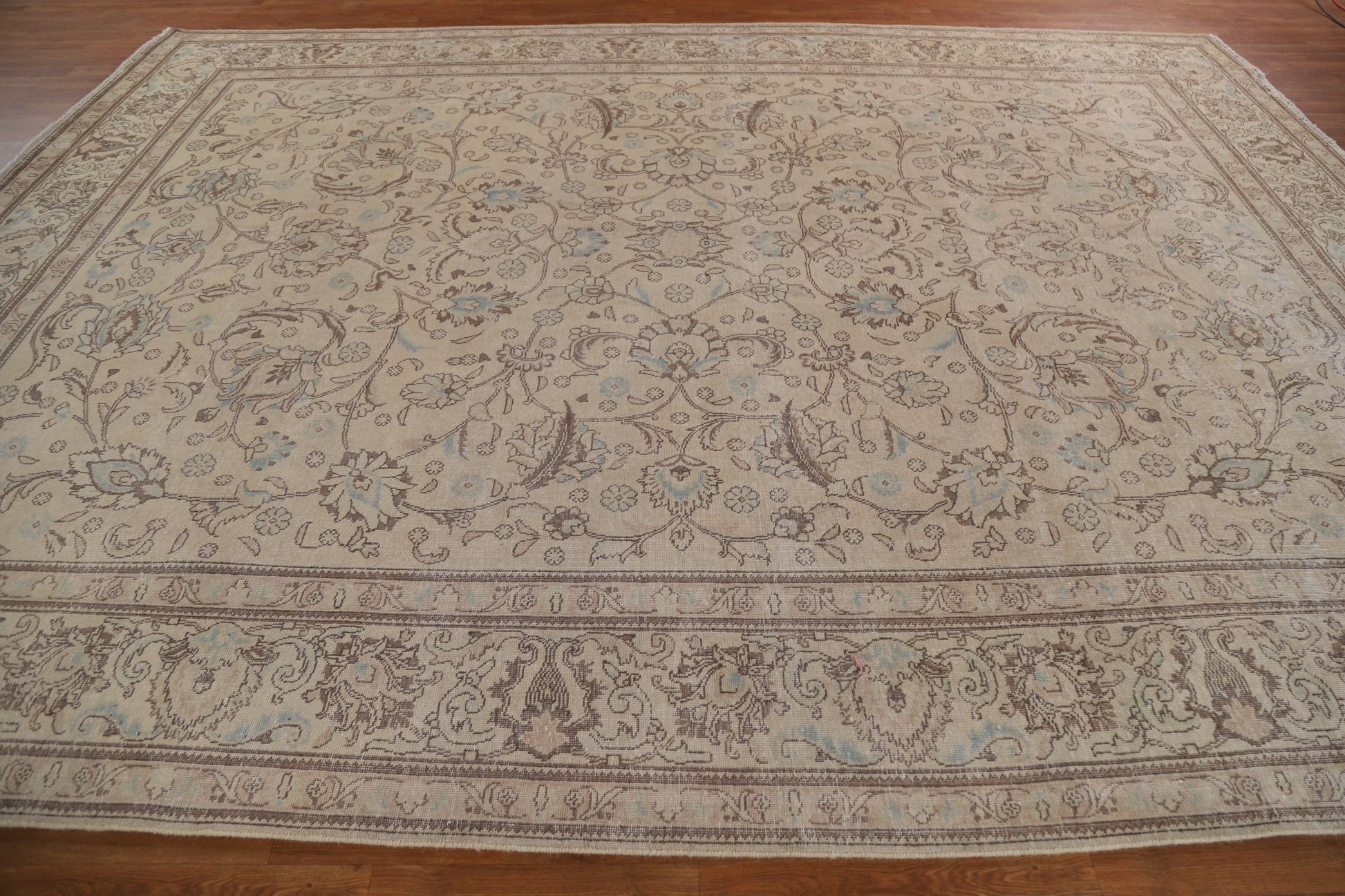 A Beautiful Genuine Persia ( Persia ) Tabriz rug is Hand Knotted by skillful weavers in Persia ( Persia ) with 100% Wool Material. This rug is in Very Good (Evenly Low Pile) condition. dimensions are 13' 4'' X 9' 11'' in foot and 406 X 302 in centimeter. the primary color is Beige & Ivories.