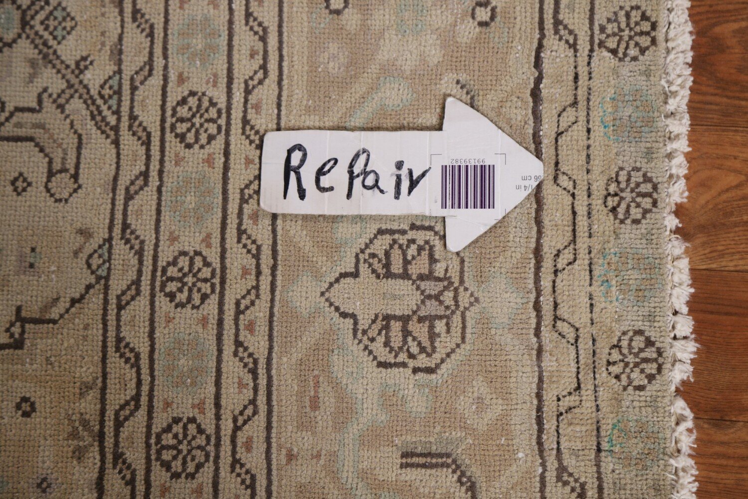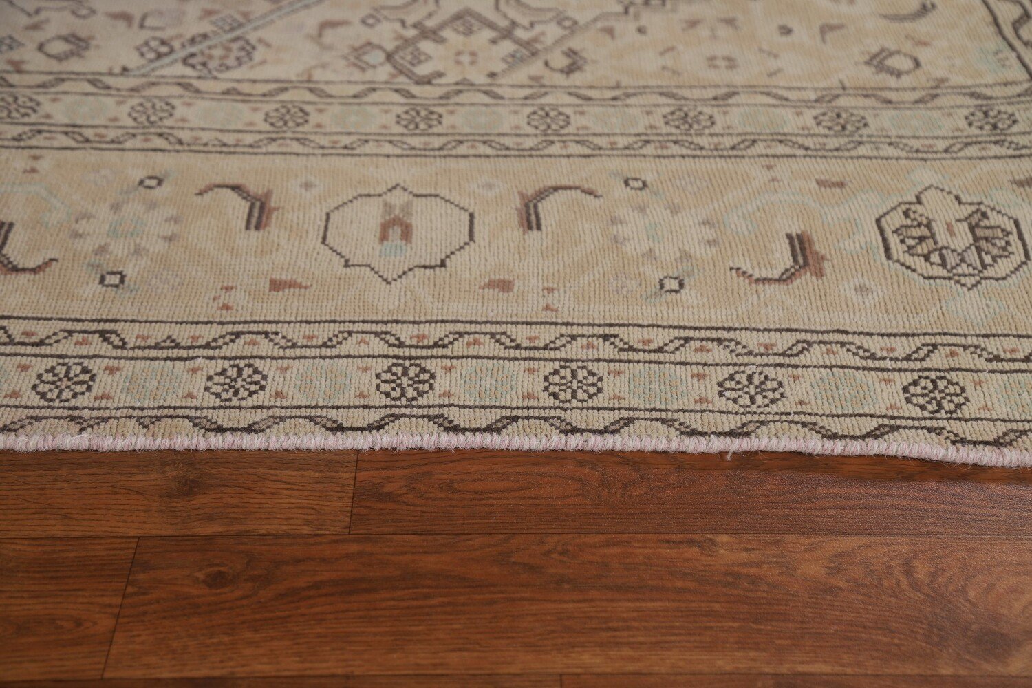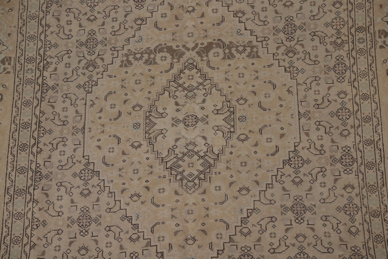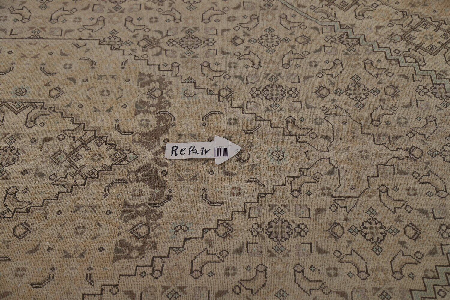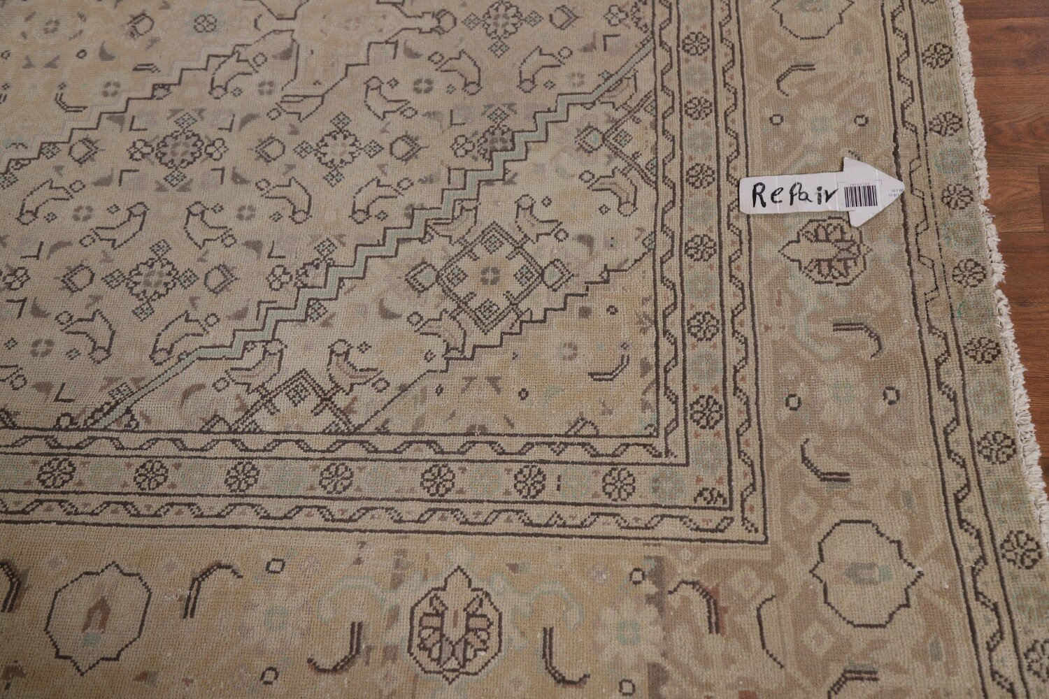 A Beautiful Genuine Persia ( Persia ) Tabriz rug is Hand Knotted by skillful weavers in Persia ( Persia ) with 100% Wool Material. This rug is in Very Good (Evenly Low Pile-Repairs) condition. dimensions are 9' 6'' X 6' 2'' in foot and 290 X 188 in centimeter. the primary color is Beige & Ivories.