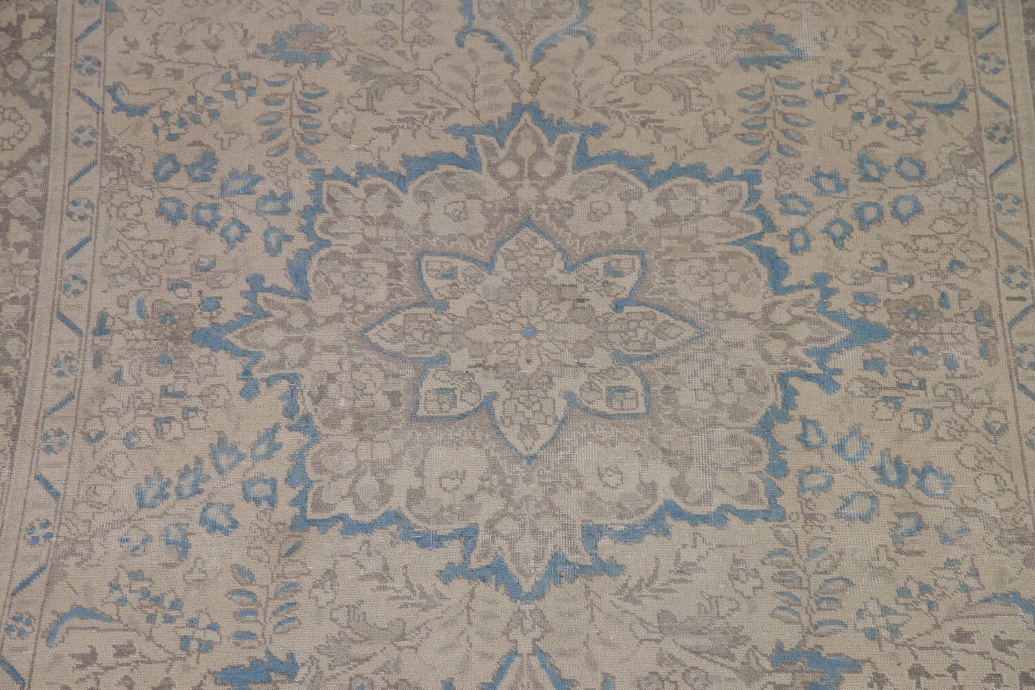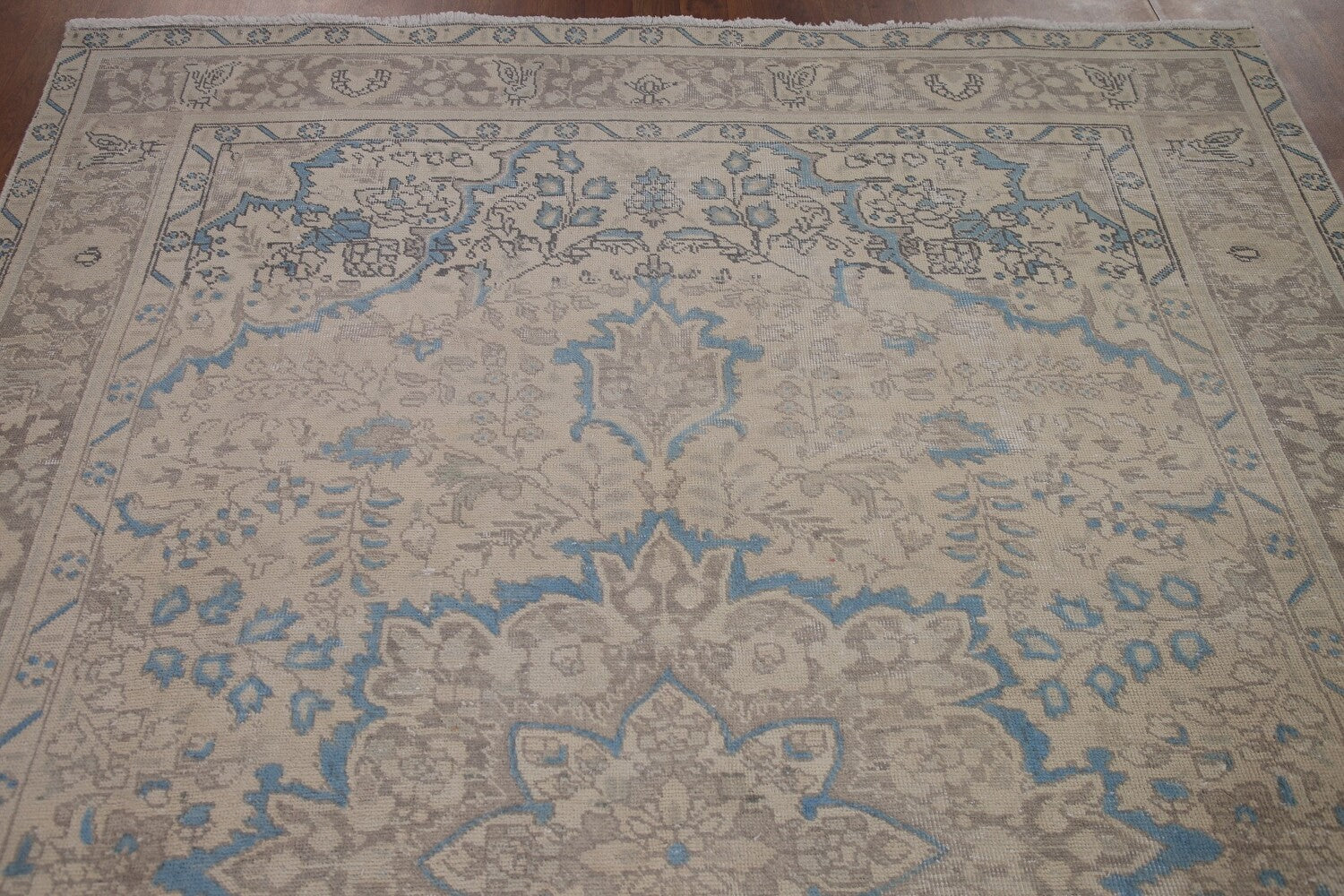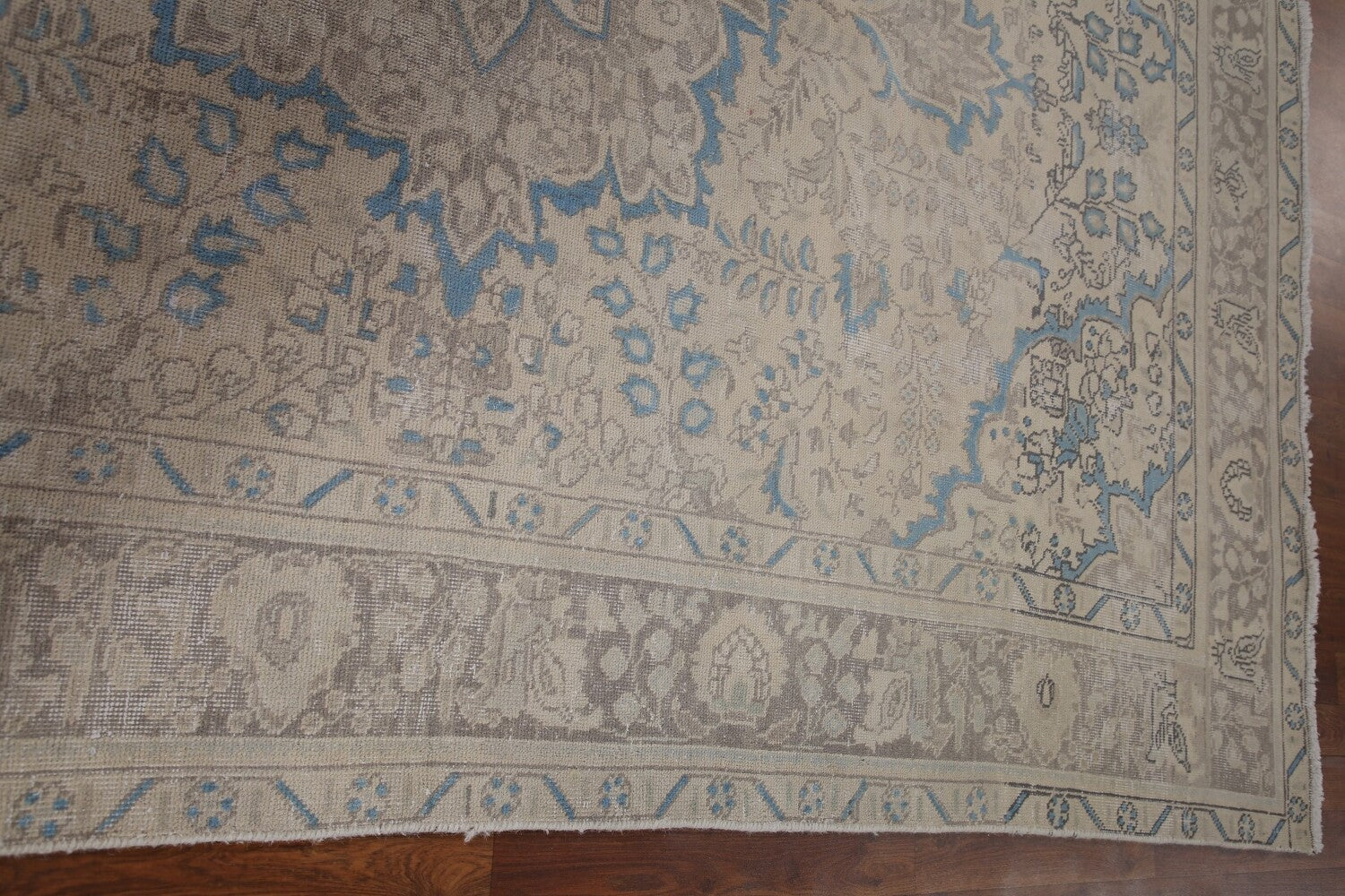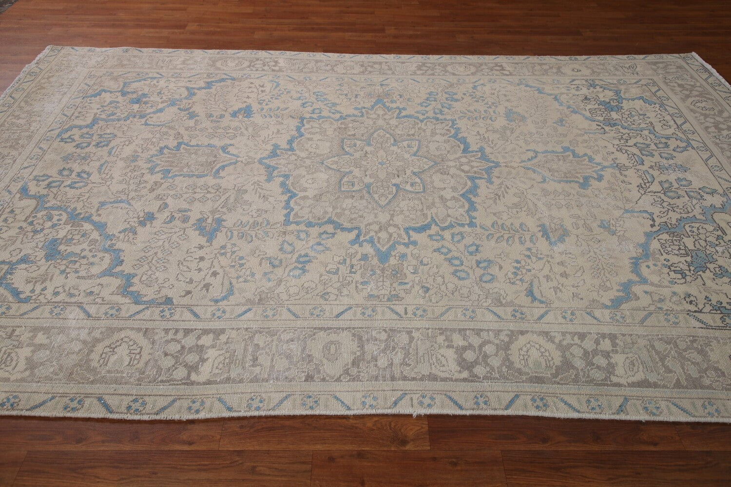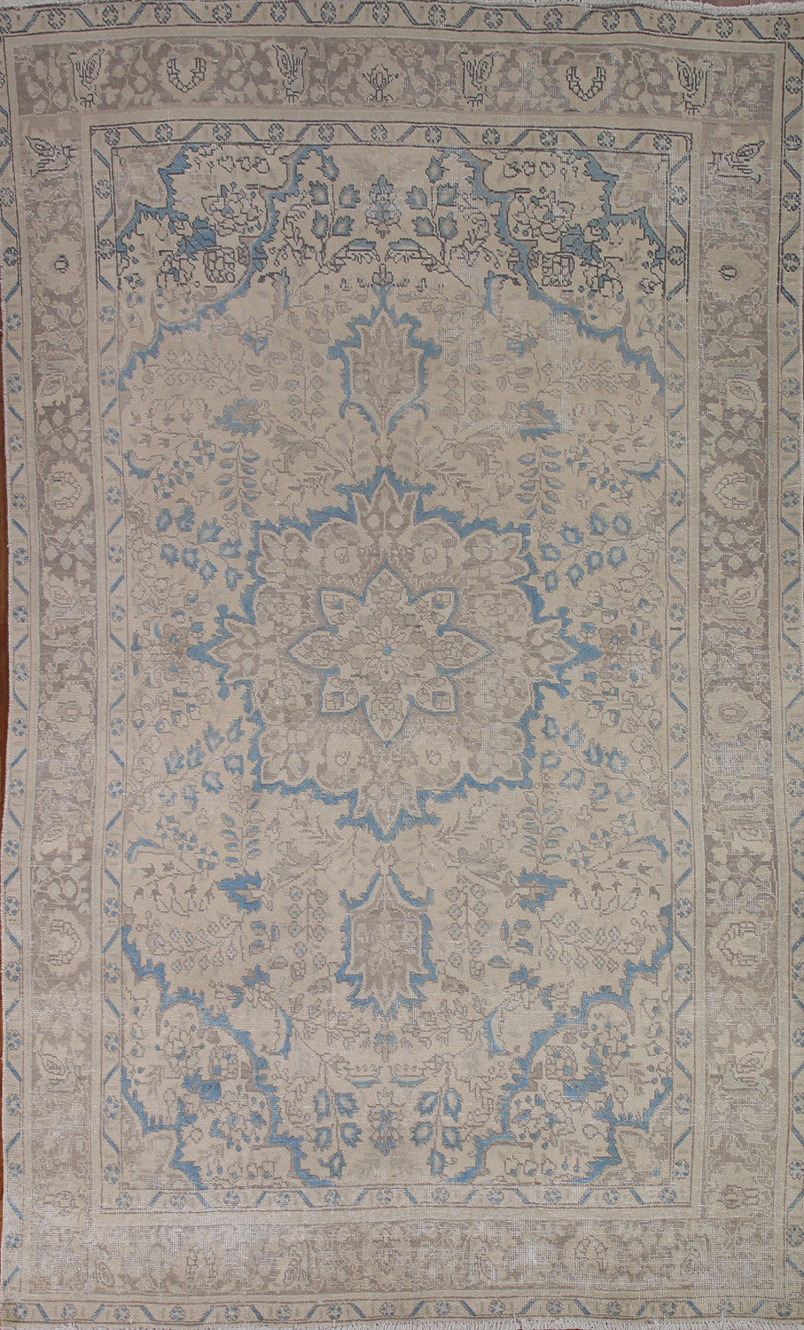 A Beautiful Genuine Persia ( Persia ) Tabriz rug is Hand Knotted by skillful weavers in Persia ( Persia ) with 100% Wool Material. This rug is in Very Good (Low Pile) condition. dimensions are 9' 10'' X 6' 3'' in foot and 300 X 191 in centimeter. the primary color is Beige & Ivories.