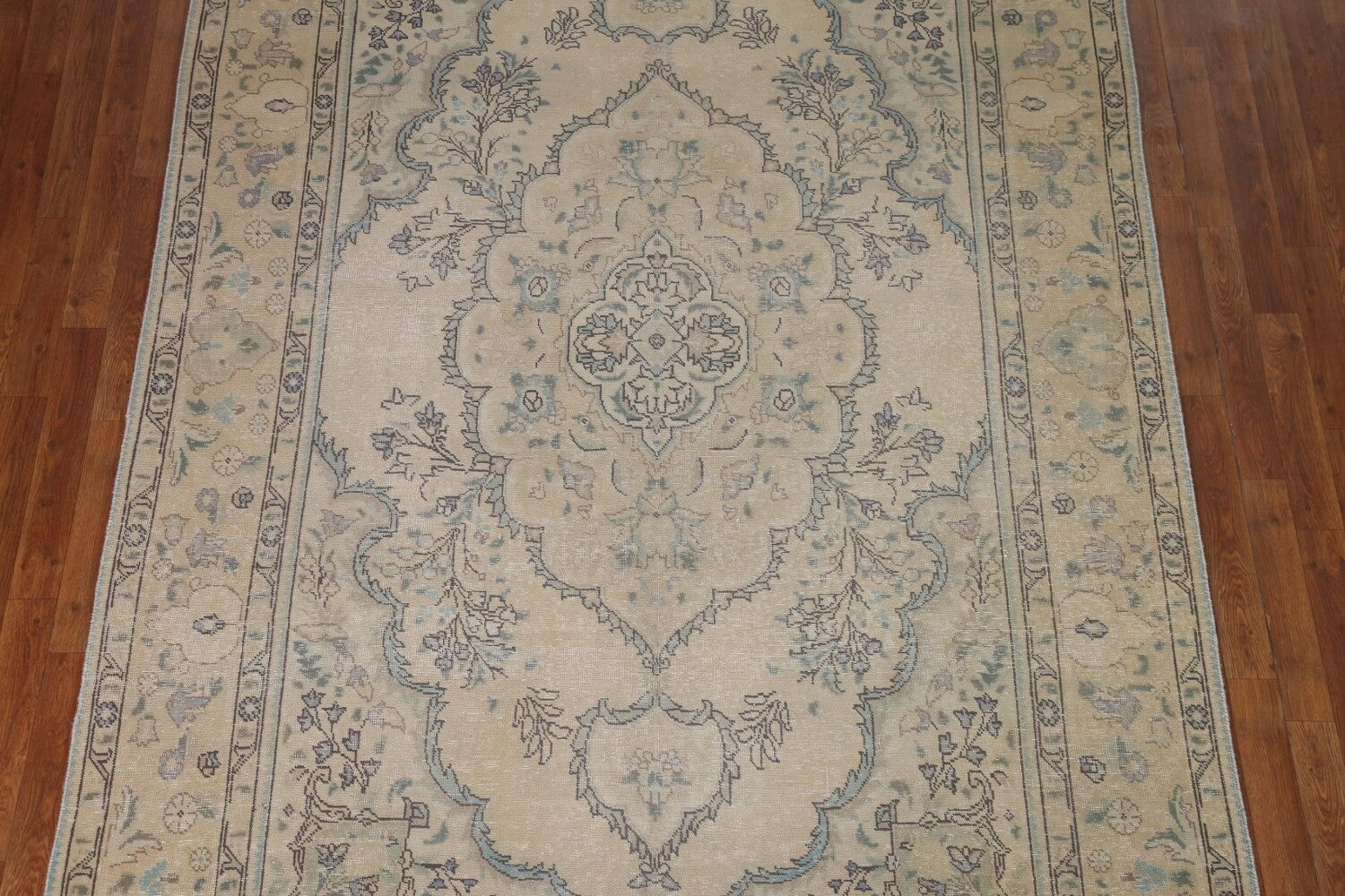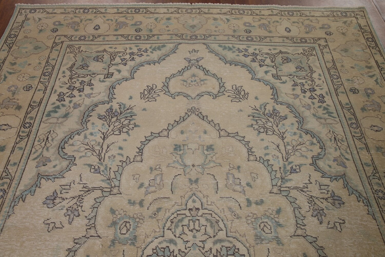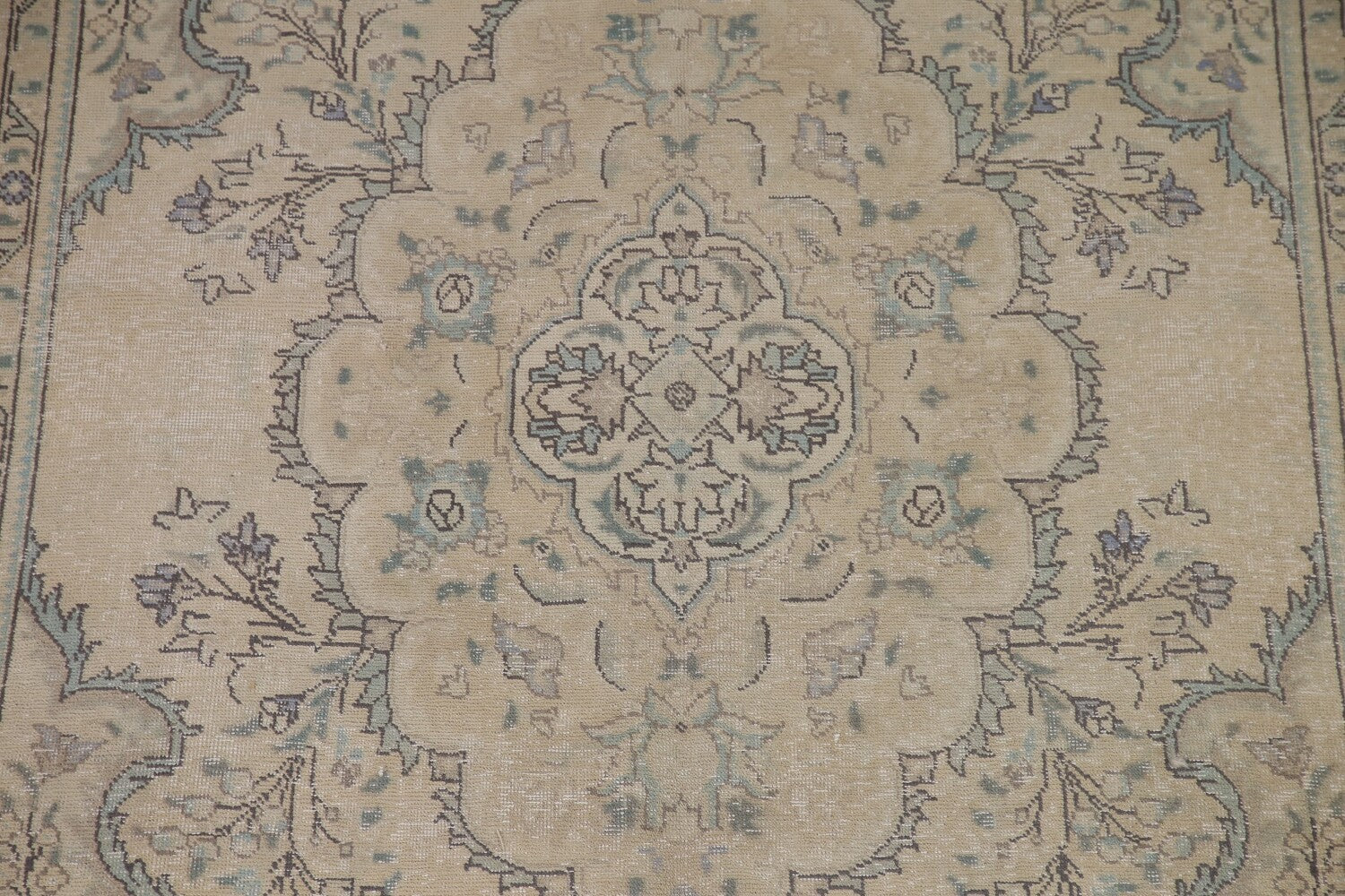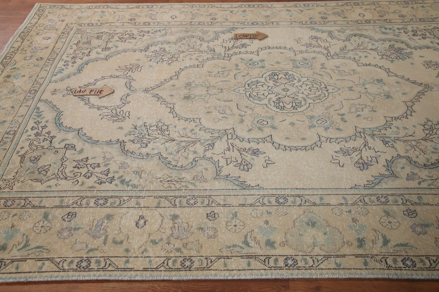 A Beautiful Genuine Persia ( Persia ) Tabriz rug is Hand Knotted by skillful weavers in Persia ( Persia ) with 100% Wool Material. This rug is in Very Good (Low Pile) condition. dimensions are 9' 6'' X 6' 4'' in foot and 290 X 193 in centimeter. the primary color is Beige & Ivories.
