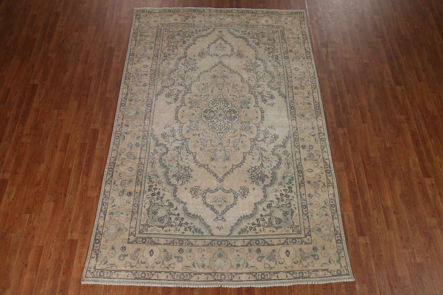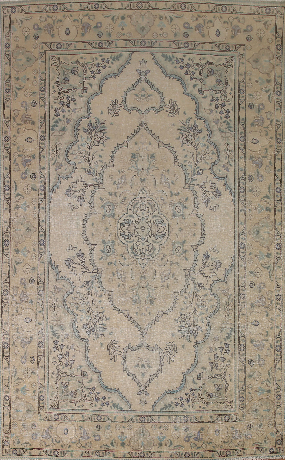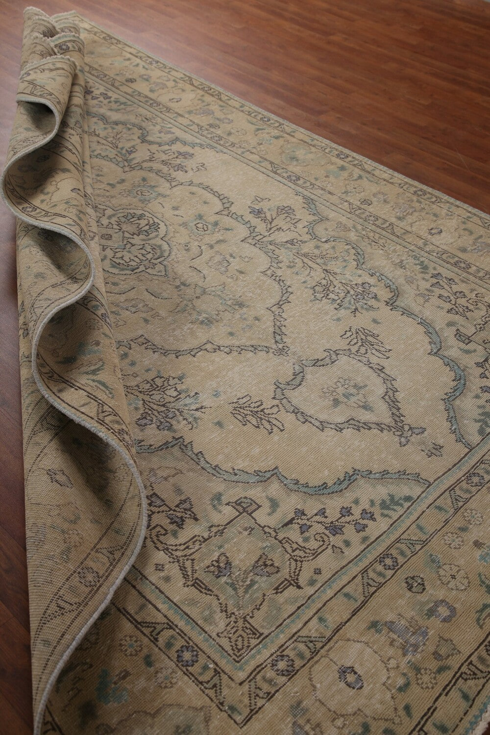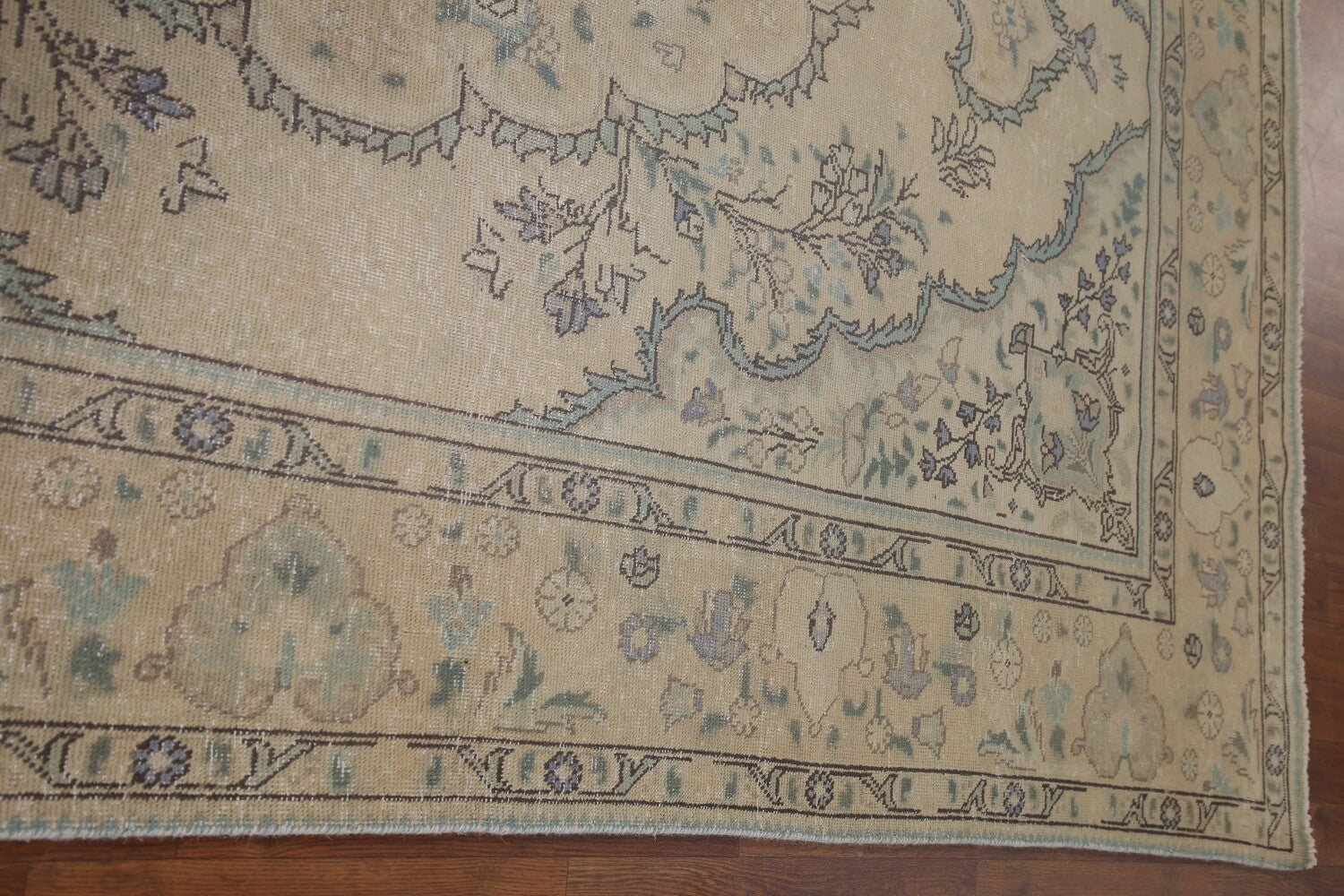 A Beautiful Genuine Persia ( Persia ) Tabriz rug is Hand Knotted by skillful weavers in Persia ( Persia ) with 100% Wool Material. This rug is in Very Good (Low Pile) condition. dimensions are 9' 6'' X 6' 4'' in foot and 290 X 193 in centimeter. the primary color is Beige & Ivories.