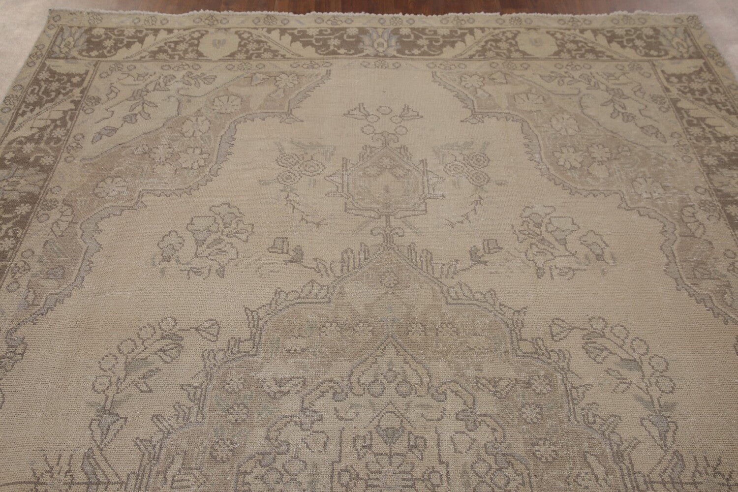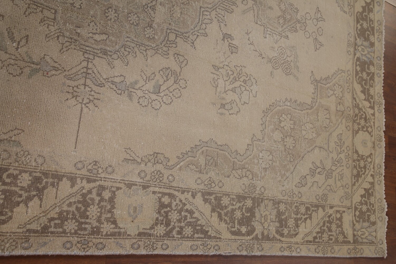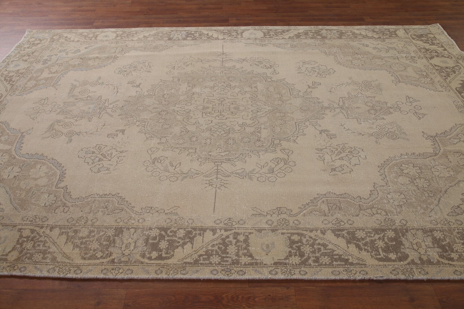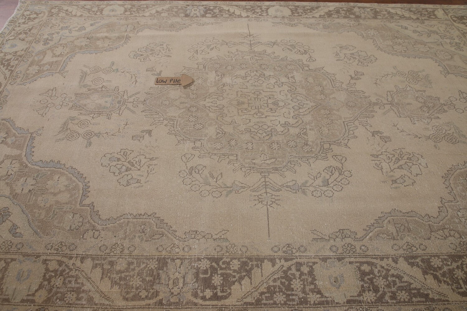 A Beautiful Genuine Persia ( Persia ) Tabriz rug is Hand Knotted by skillful weavers in Persia ( Persia ) with 100% Wool Material. This rug is in Very Good (Low Pile) condition. dimensions are 9' 6'' X 6' 4'' in foot and 290 X 193 in centimeter. the primary color is Beige & Ivories.