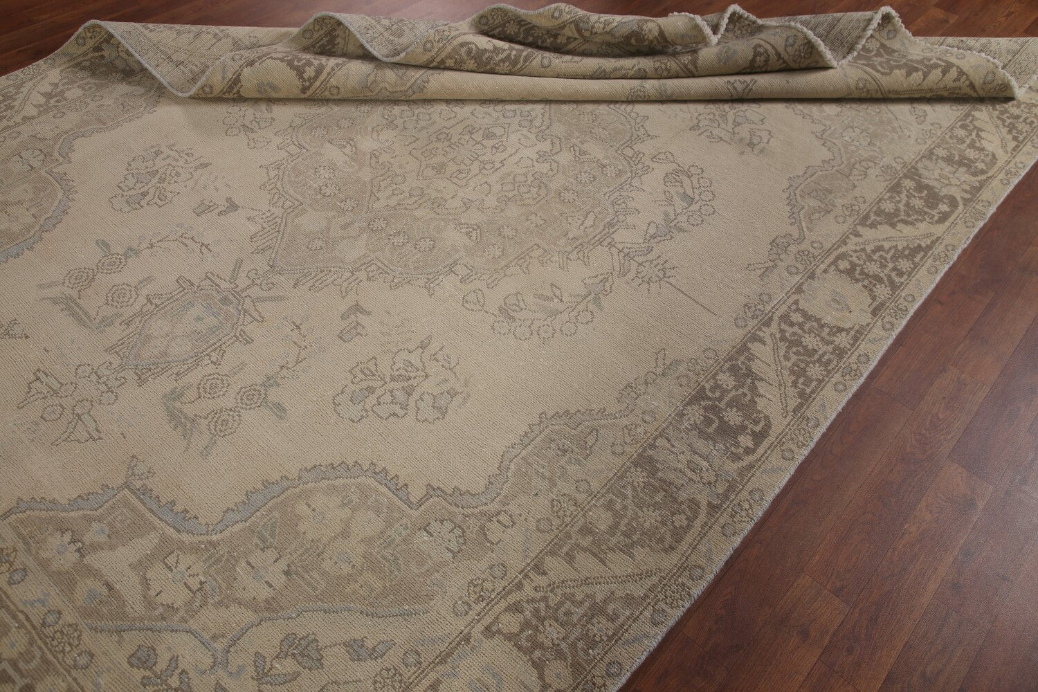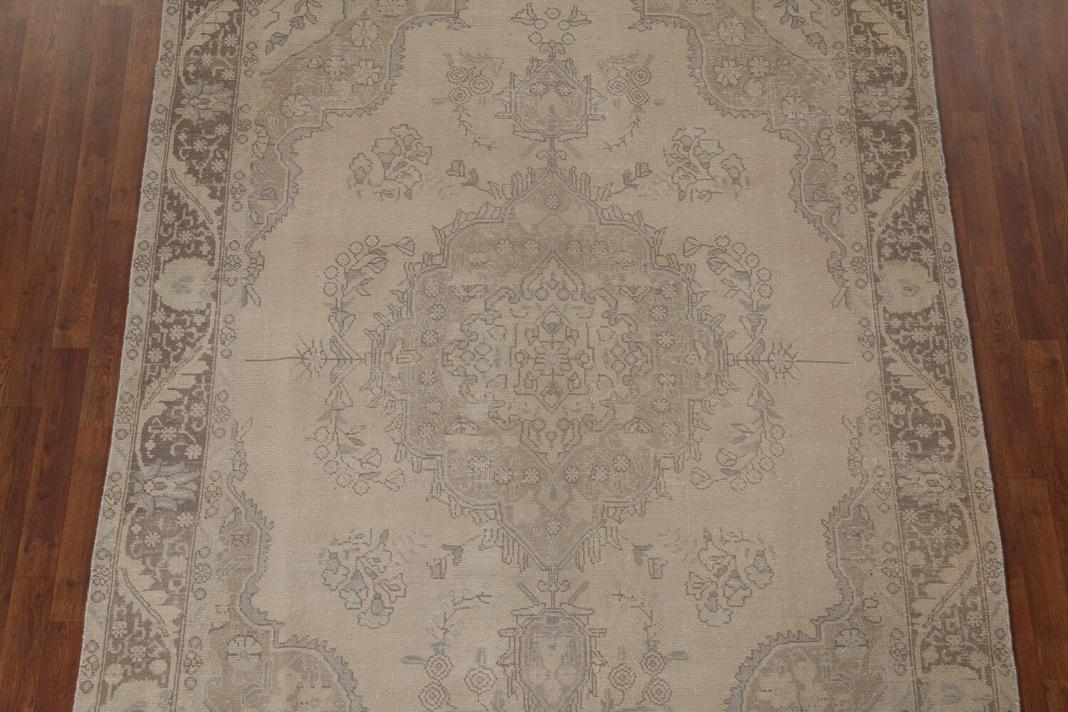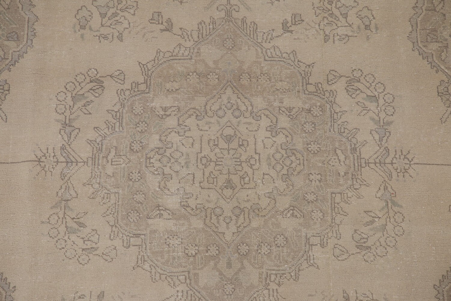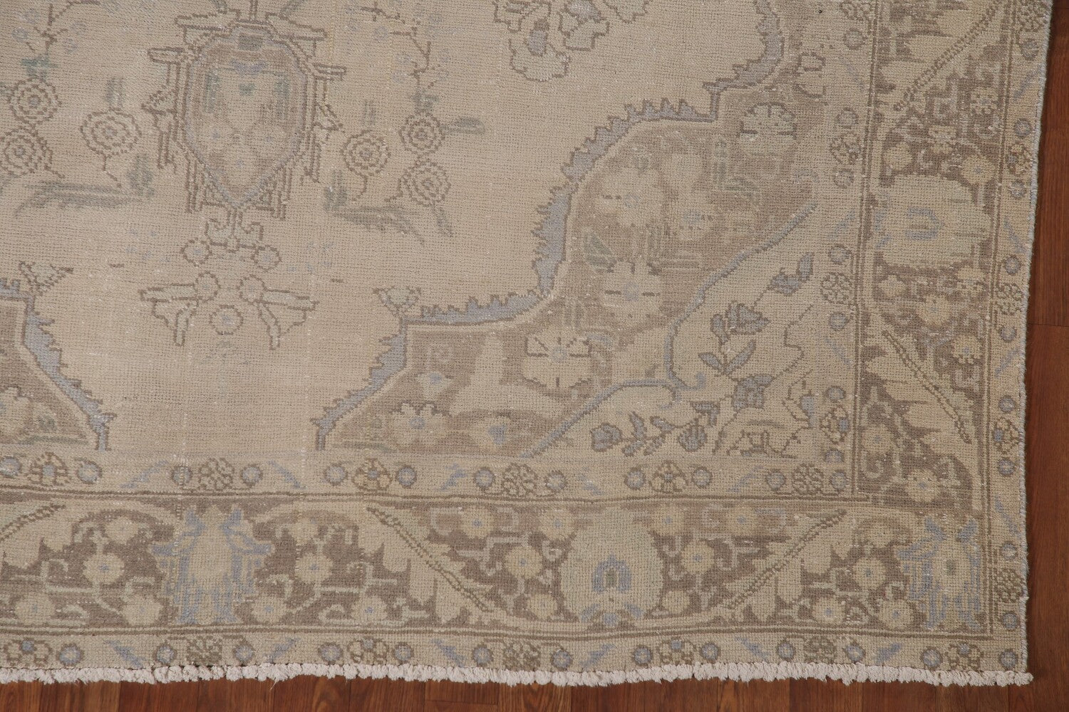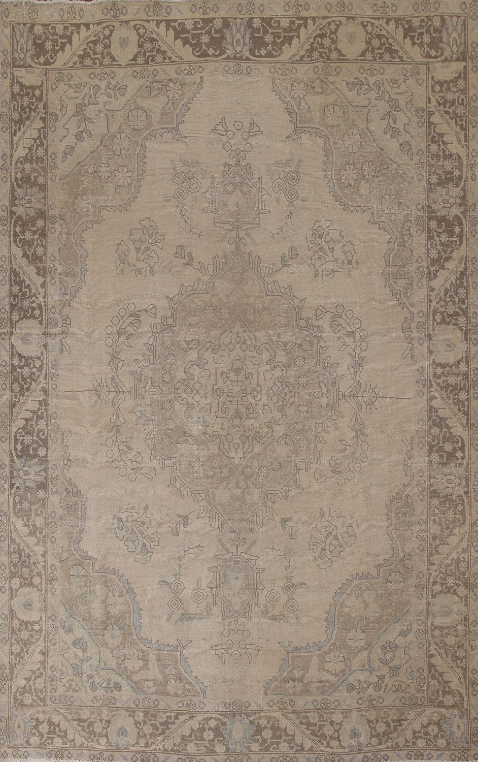 A Beautiful Genuine Persia ( Persia ) Tabriz rug is Hand Knotted by skillful weavers in Persia ( Persia ) with 100% Wool Material. This rug is in Very Good (Low Pile) condition. dimensions are 9' 6'' X 6' 4'' in foot and 290 X 193 in centimeter. the primary color is Beige & Ivories.
