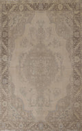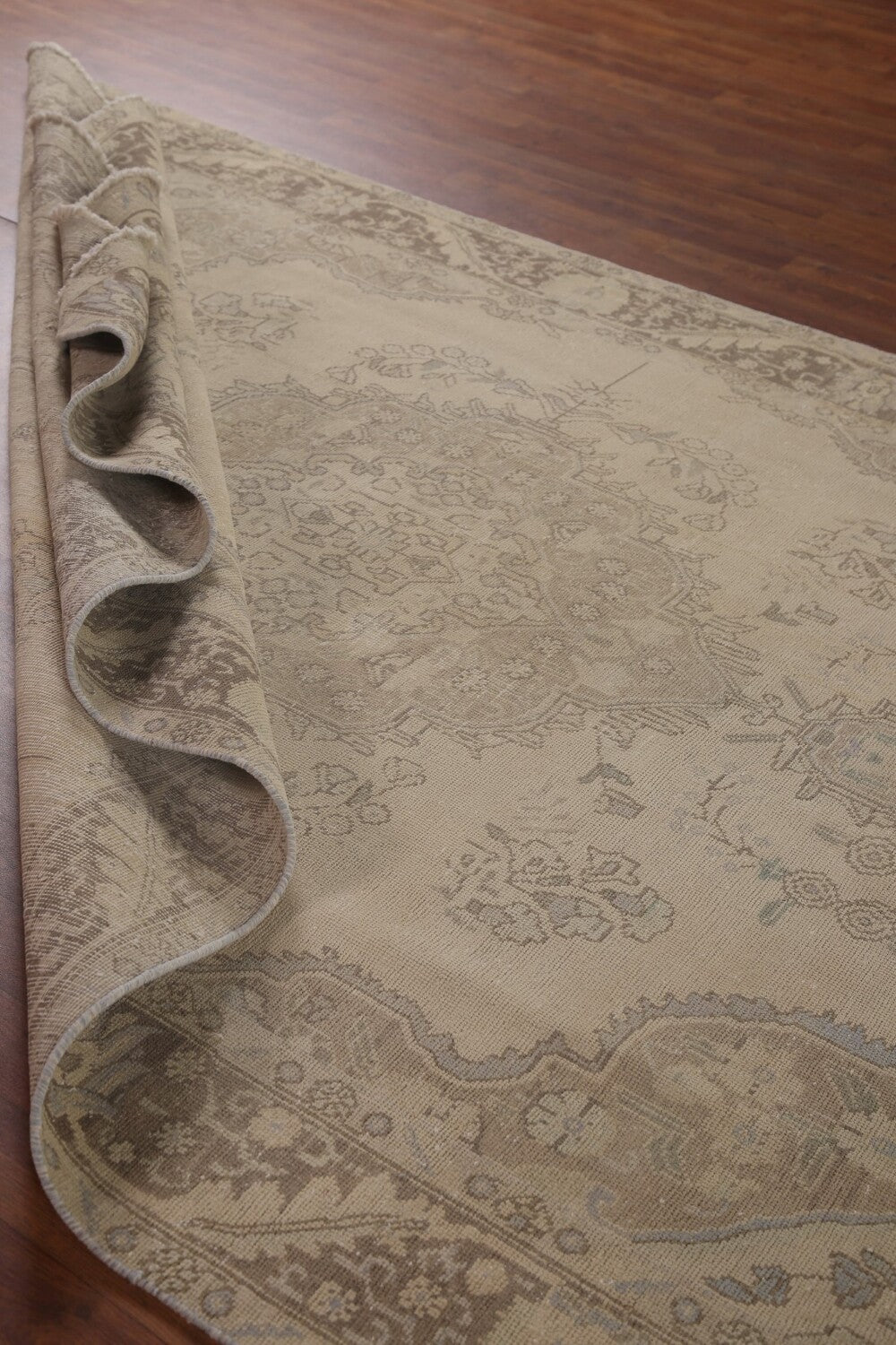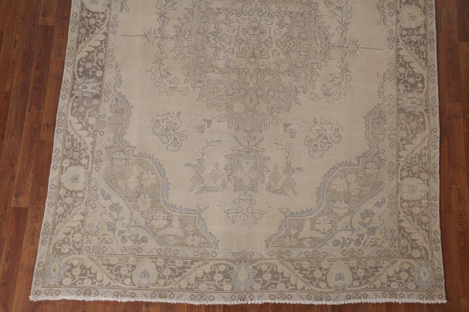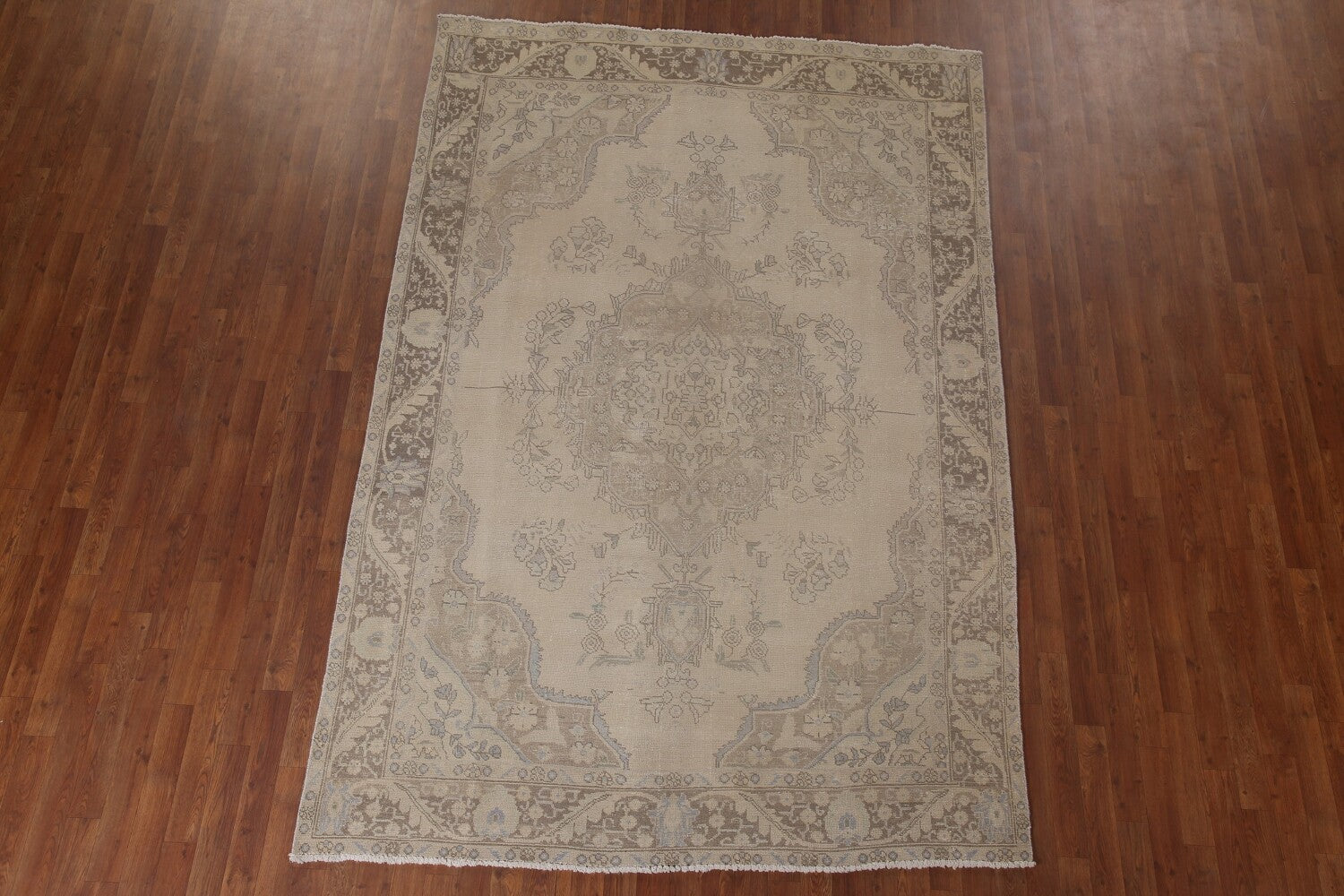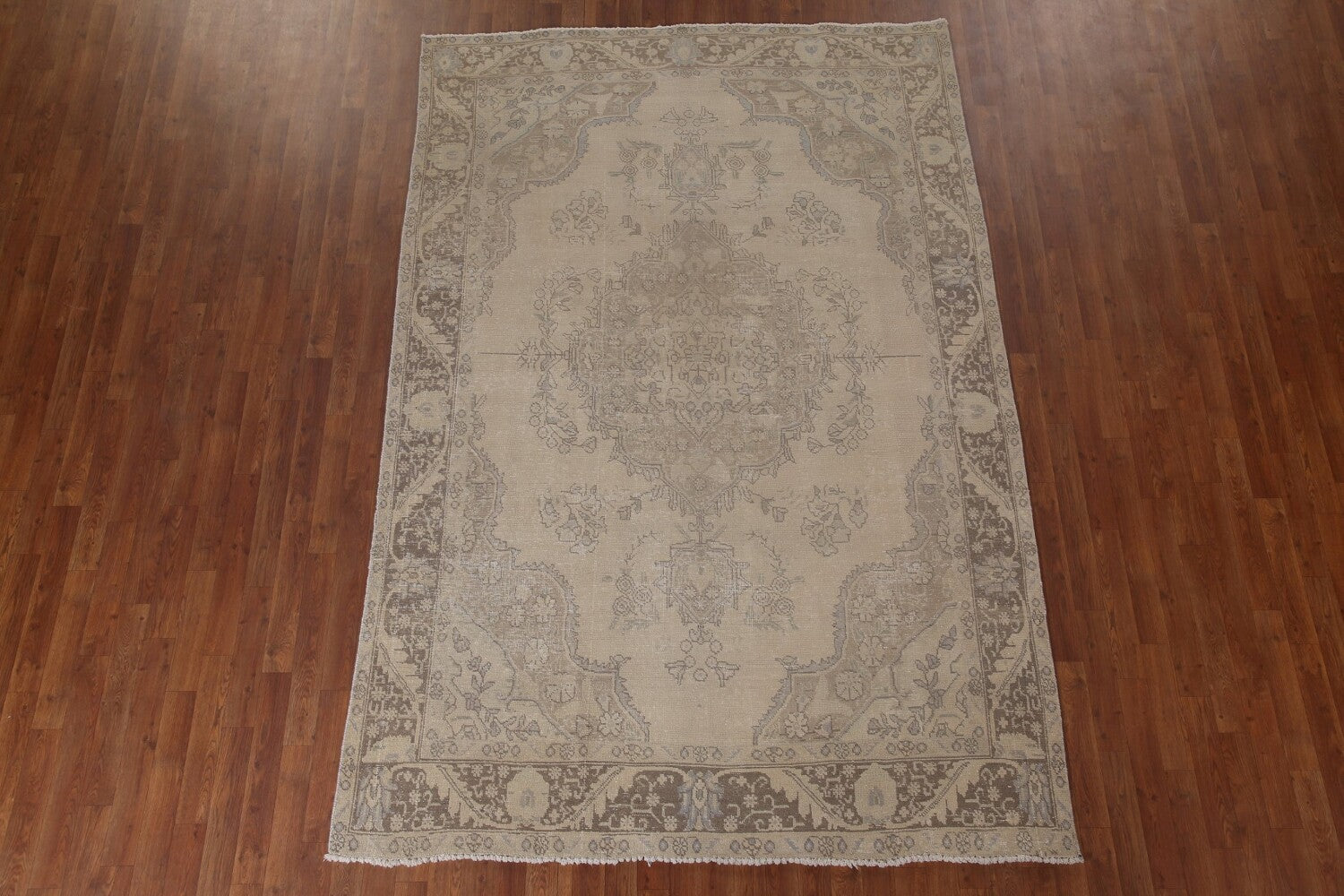 A Beautiful Genuine Persia ( Persia ) Tabriz rug is Hand Knotted by skillful weavers in Persia ( Persia ) with 100% Wool Material. This rug is in Very Good (Low Pile) condition. dimensions are 9' 6'' X 6' 4'' in foot and 290 X 193 in centimeter. the primary color is Beige & Ivories.