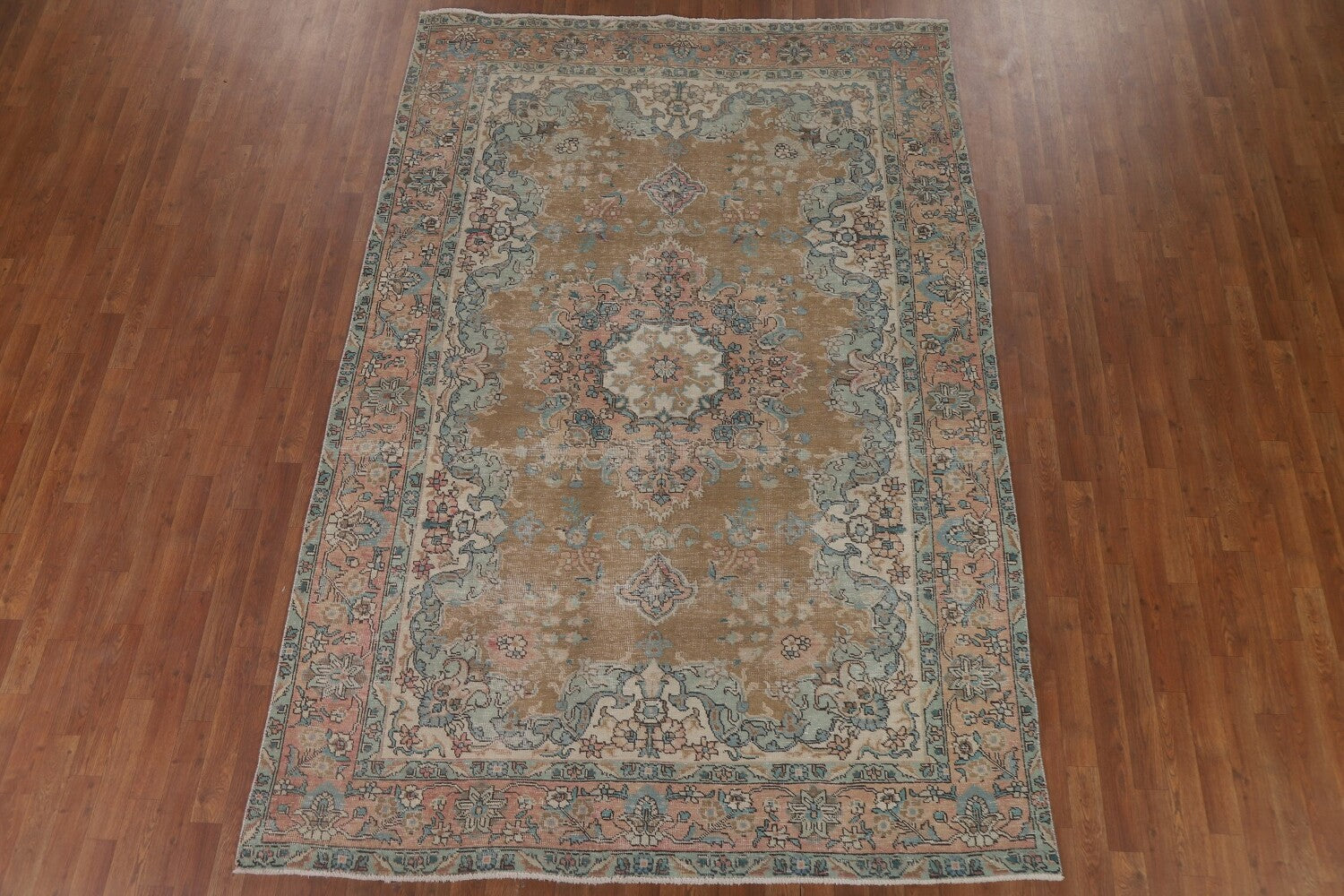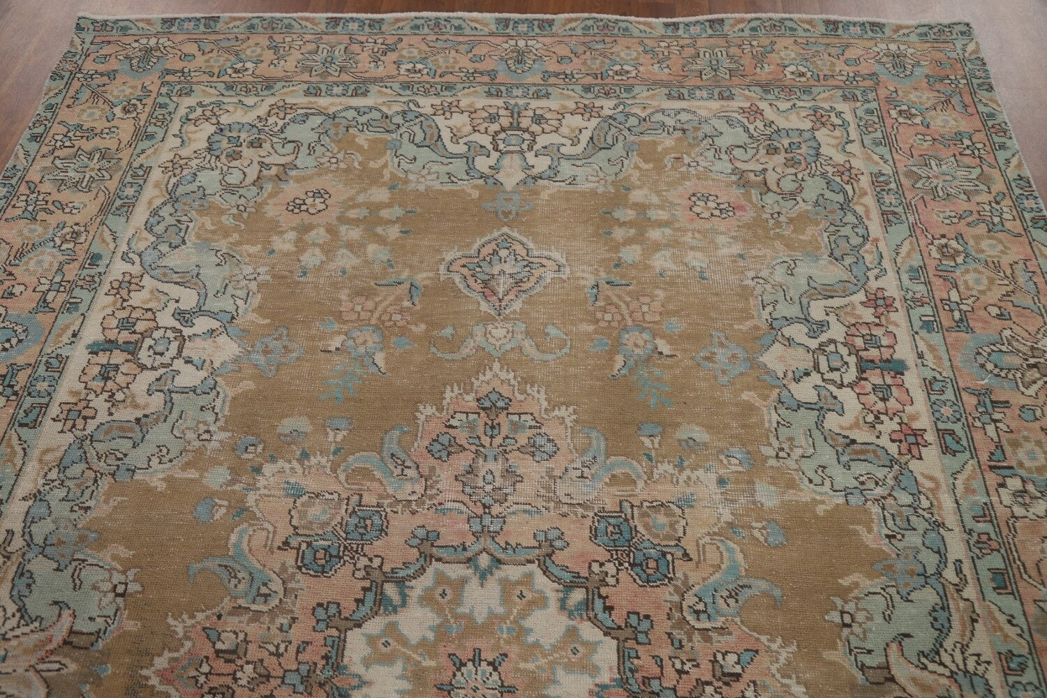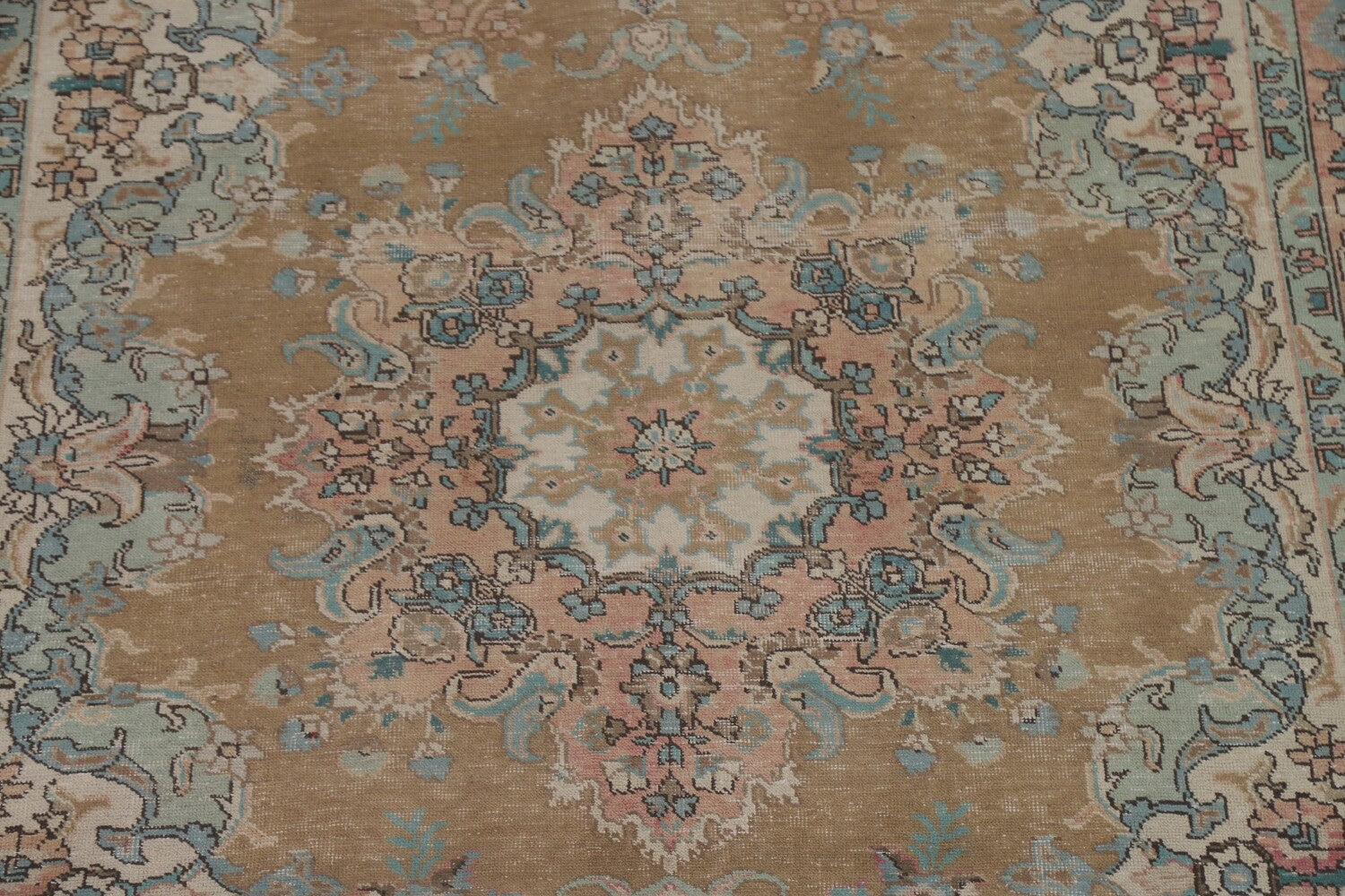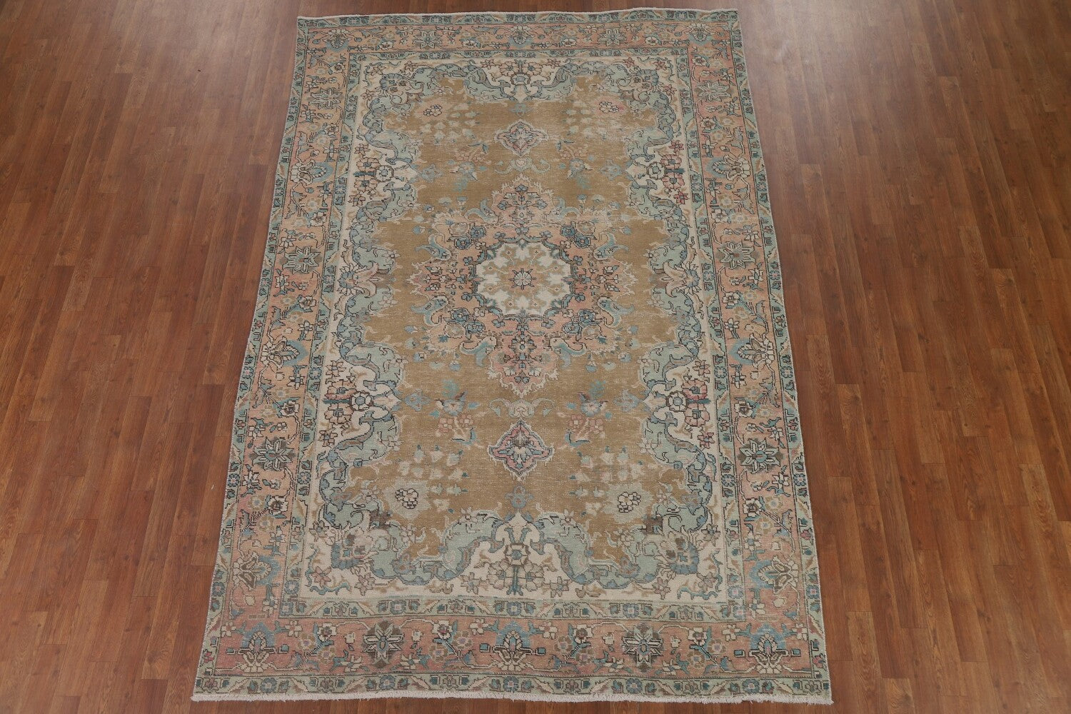 A Beautiful Genuine Persia ( Persia ) Tabriz rug is Hand Knotted by skillful weavers in Persia ( Persia ) with 100% Wool Material. This rug is in Very Good (Evenly Low Pile) condition. dimensions are 9' 6'' X 6' 5'' in foot and 290 X 196 in centimeter. the primary color is Yellow & Gold.