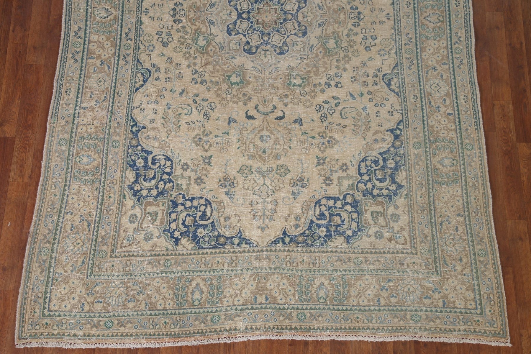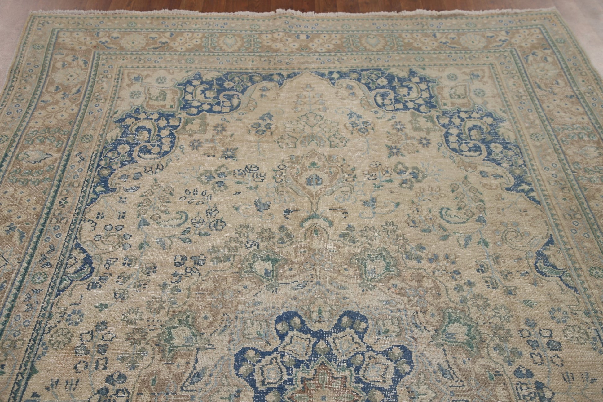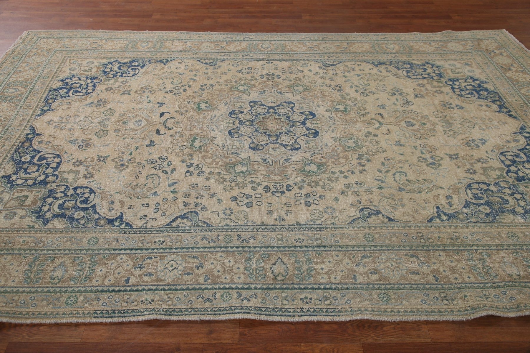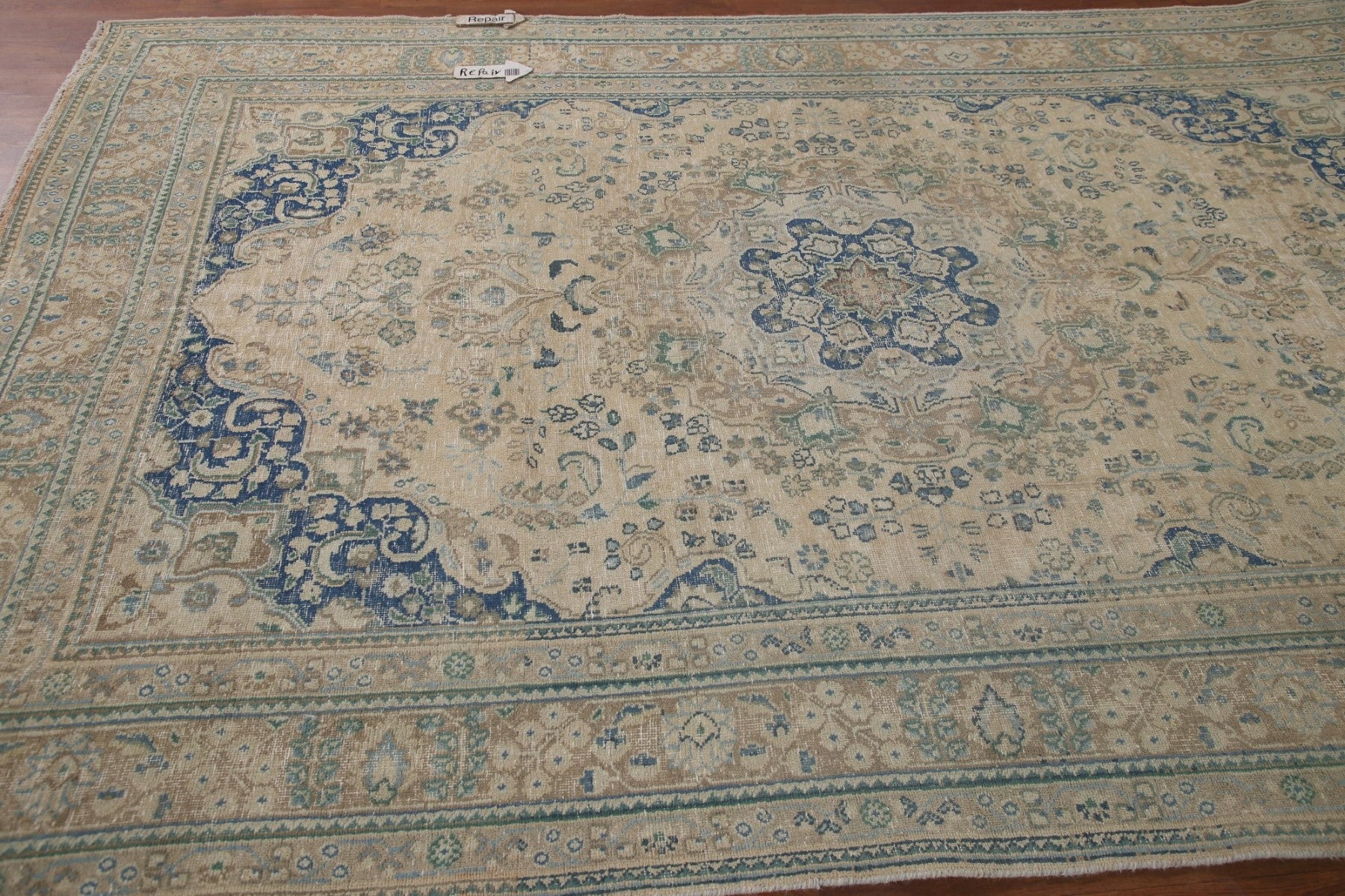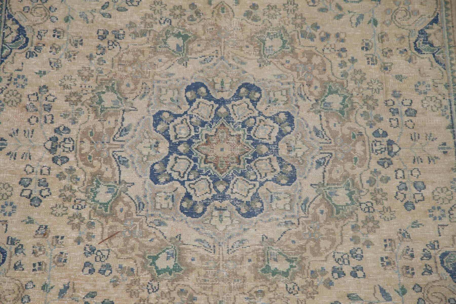 A Beautiful Genuine Persia ( Persia ) Tabriz rug is Hand Knotted by skillful weavers in Persia ( Persia ) with 100% Wool Material. This rug is in Very Good (Evenly Low Pile) condition. dimensions are 9' 9'' X 6' 3'' in foot and 297 X 191 in centimeter. the primary color is Beige & Ivories.