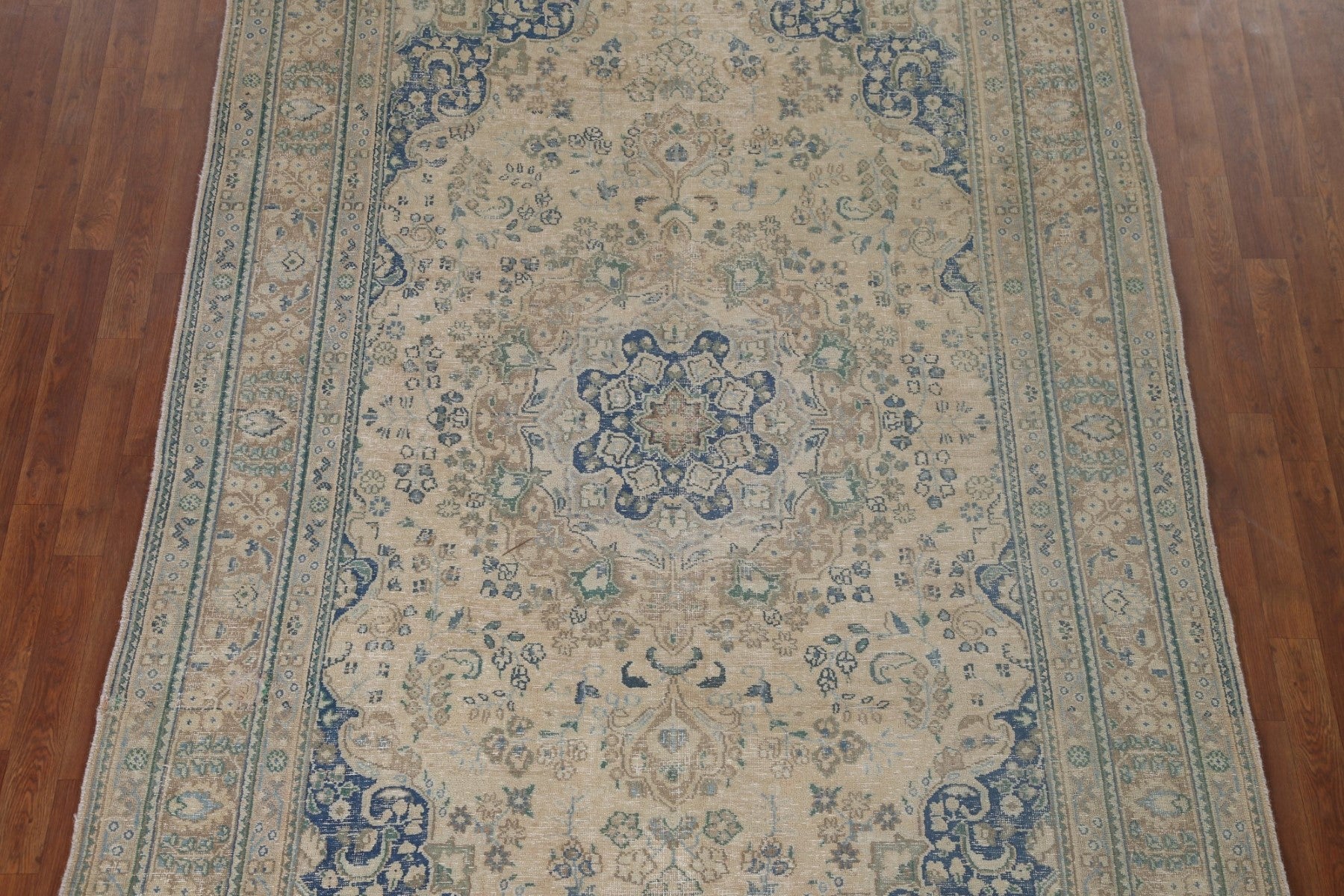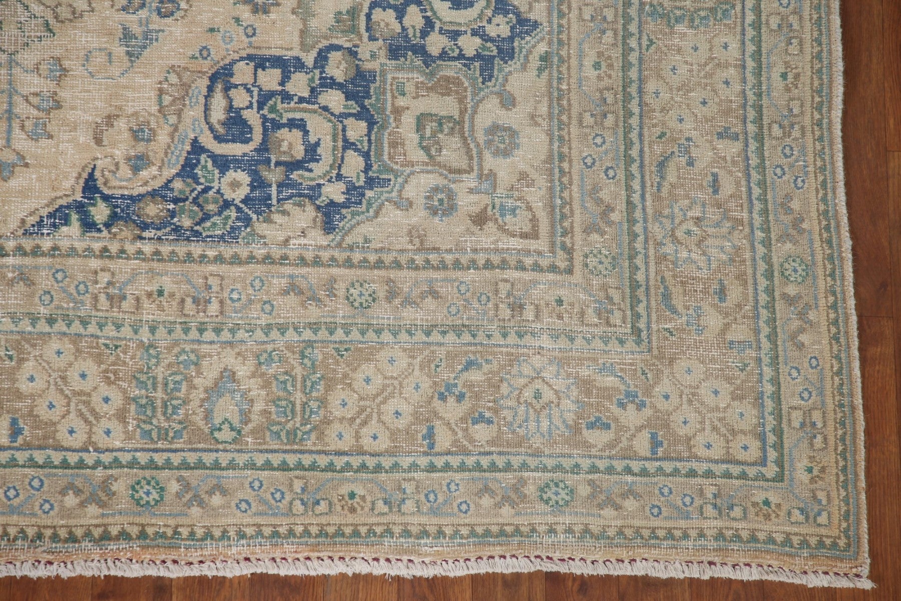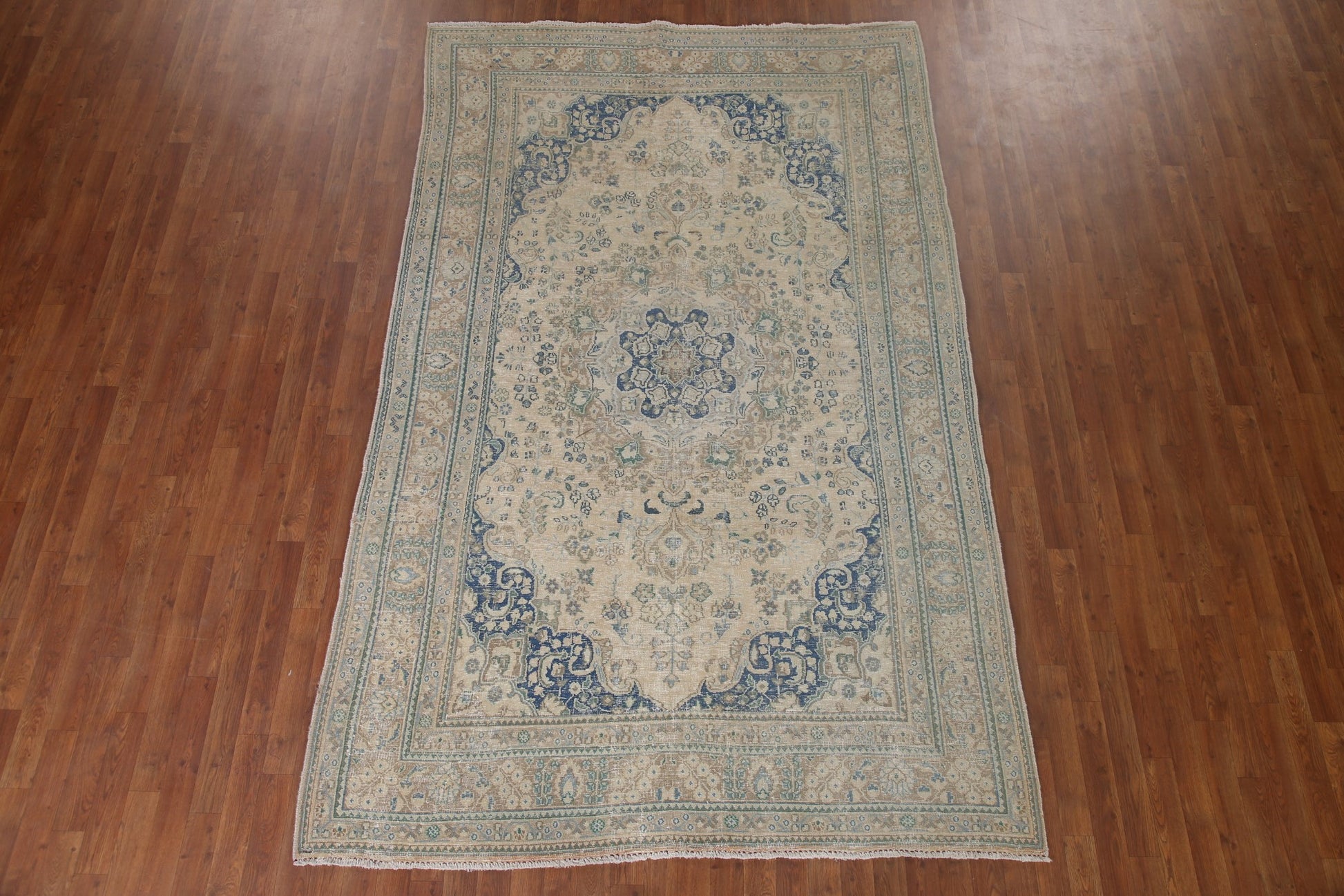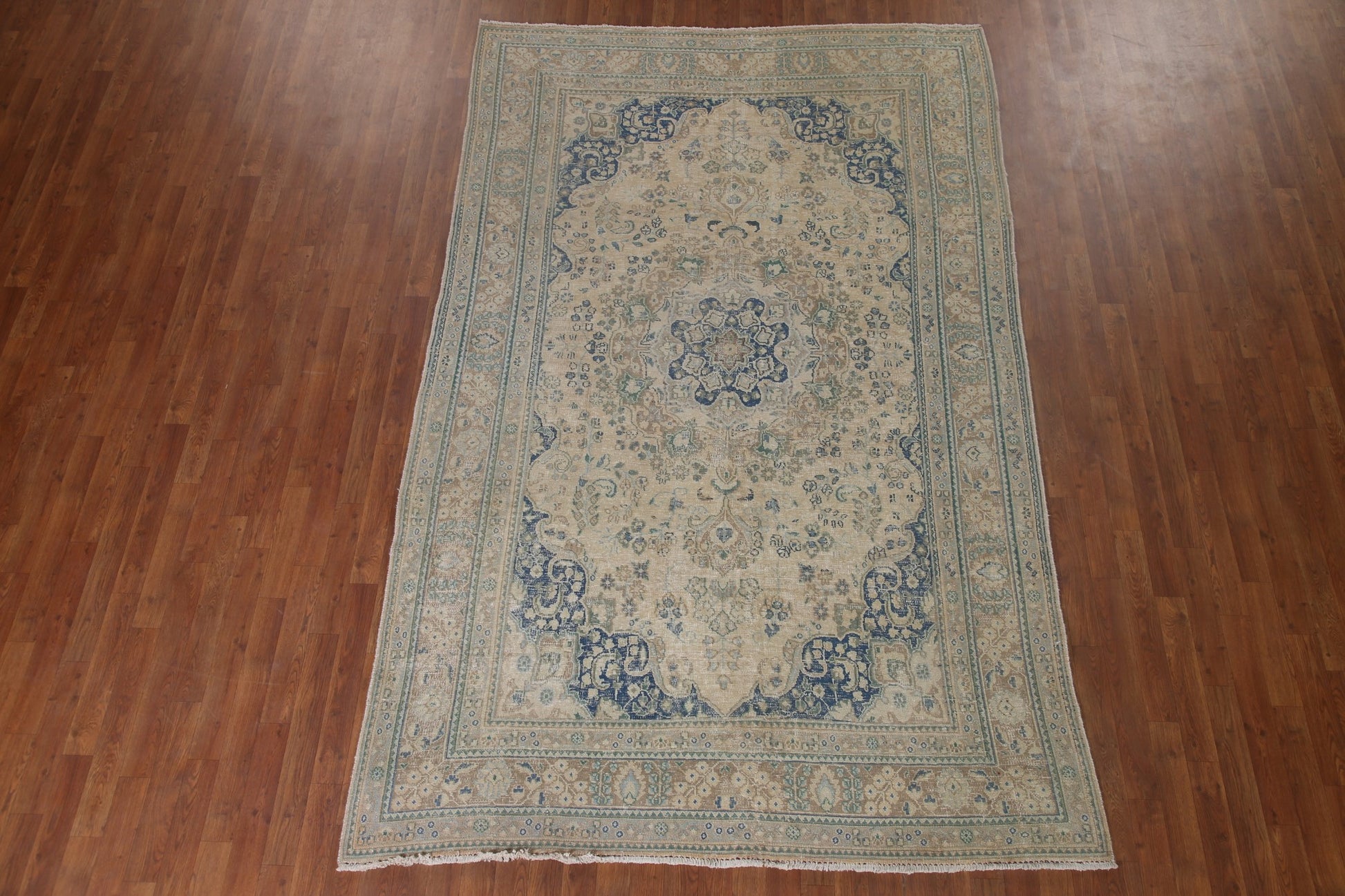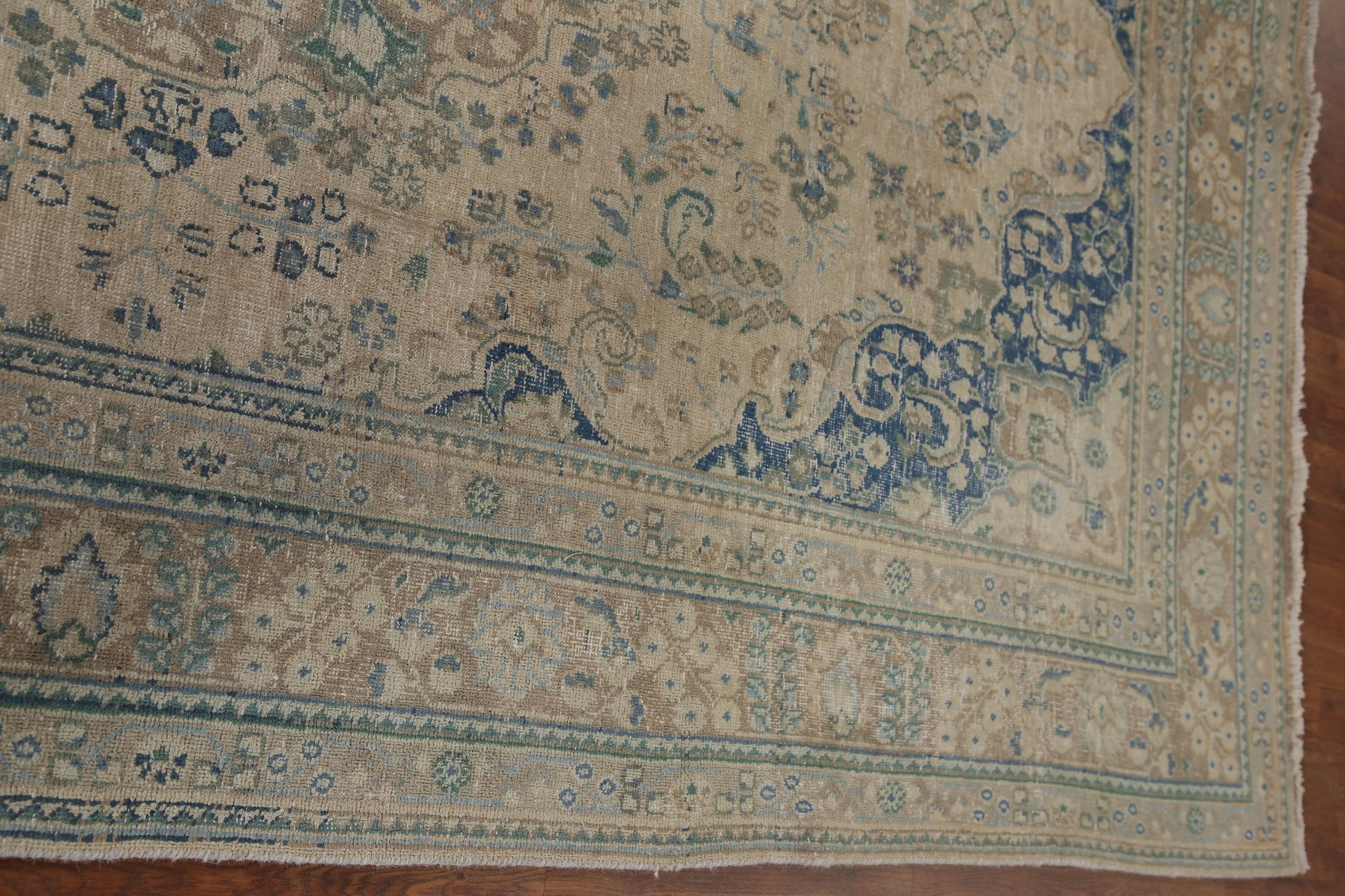 A Beautiful Genuine Persia ( Persia ) Tabriz rug is Hand Knotted by skillful weavers in Persia ( Persia ) with 100% Wool Material. This rug is in Very Good (Evenly Low Pile) condition. dimensions are 9' 9'' X 6' 3'' in foot and 297 X 191 in centimeter. the primary color is Beige & Ivories.