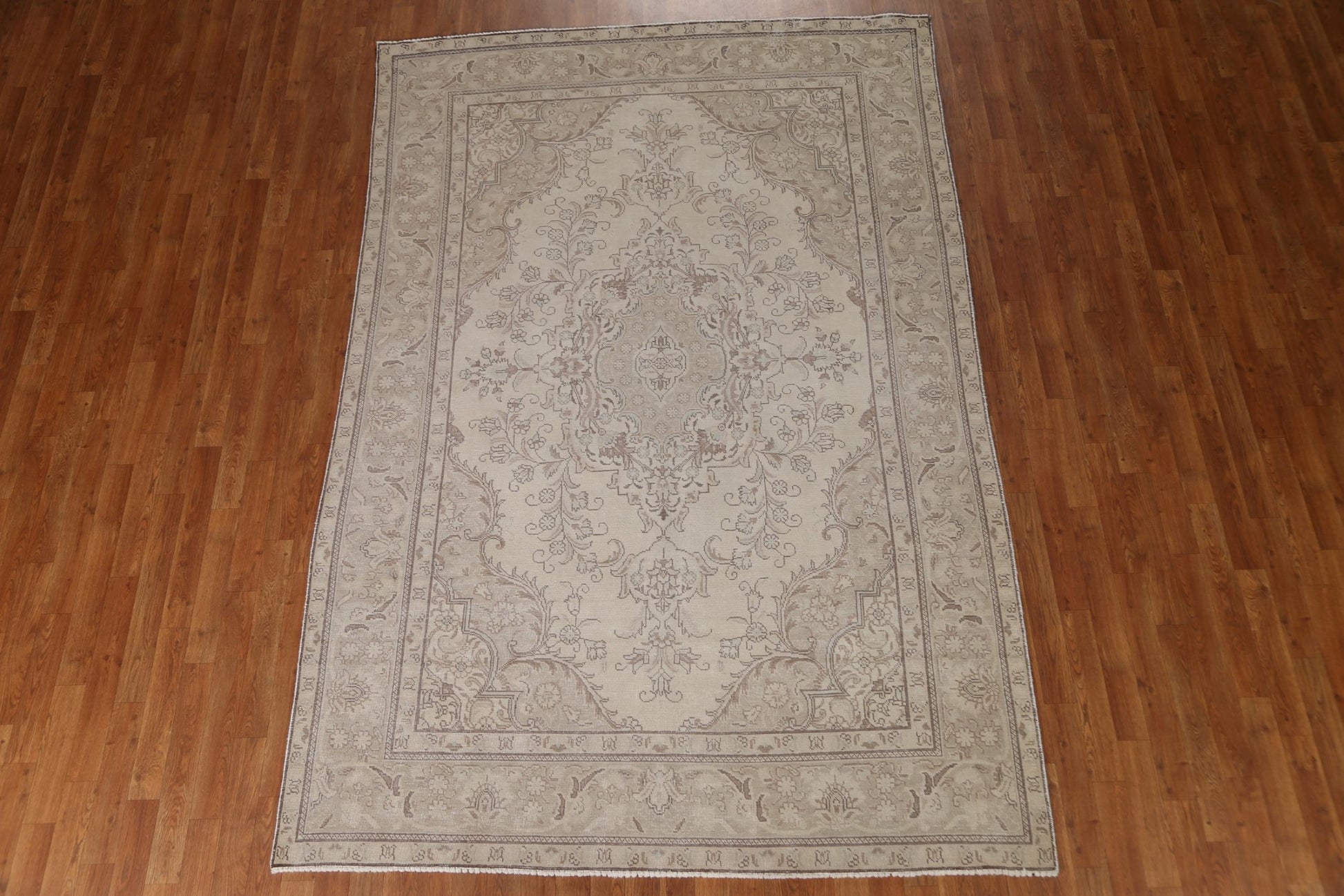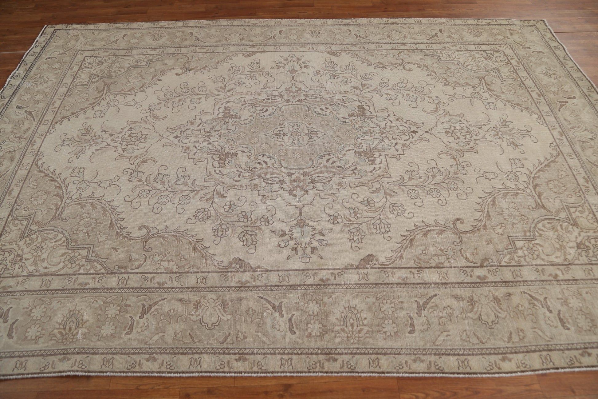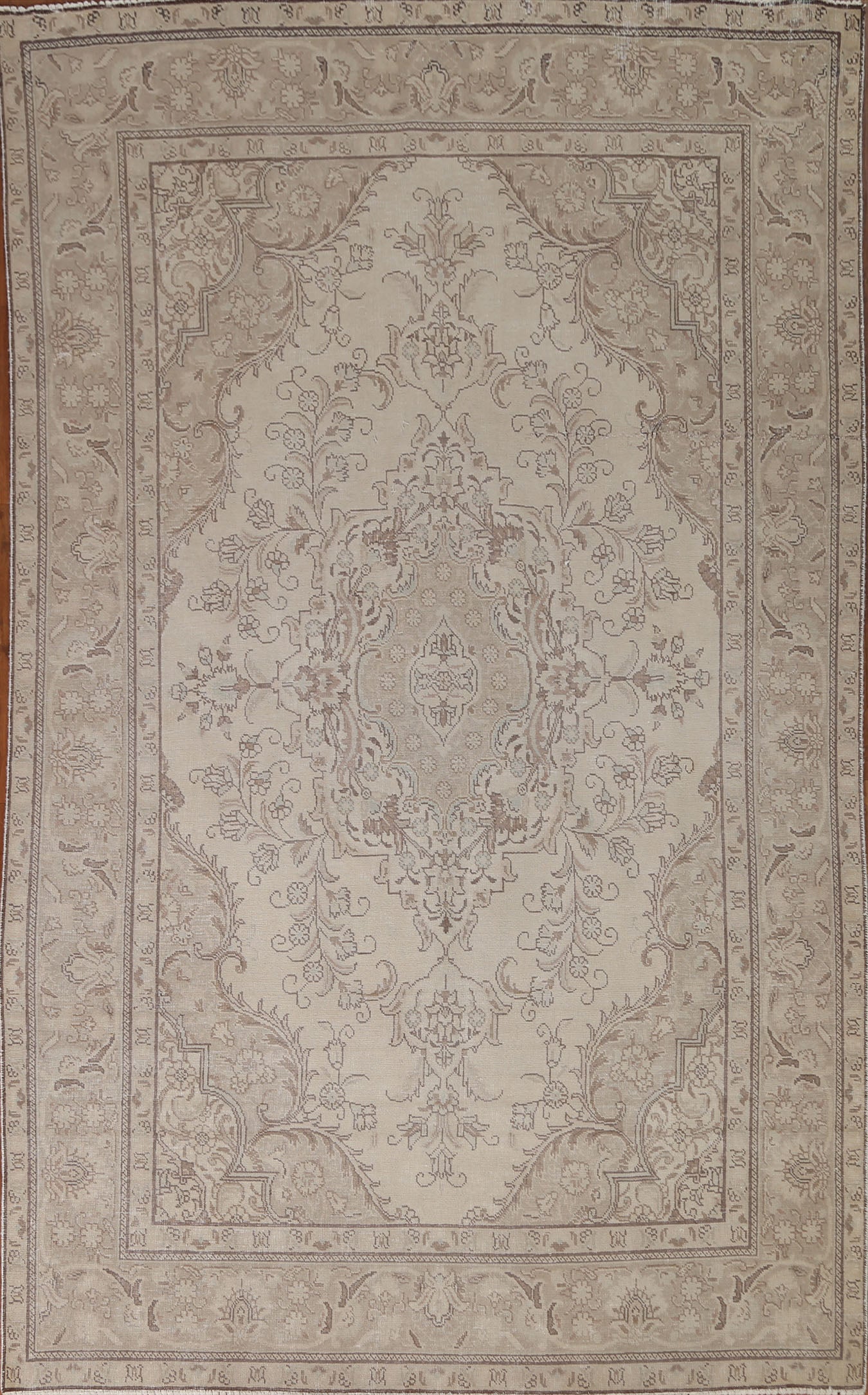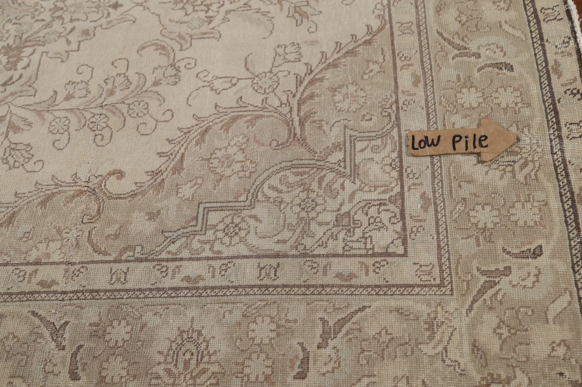 A Beautiful Genuine Persia ( Persia ) Tabriz rug is Hand Knotted by skillful weavers in Persia ( Persia ) with 100% Wool Material. This rug is in Very Good (Low Pile-Repair) condition. dimensions are 9' 4'' X 6' 3'' in foot and 284 X 191 in centimeter. the primary color is Beige & Ivories.