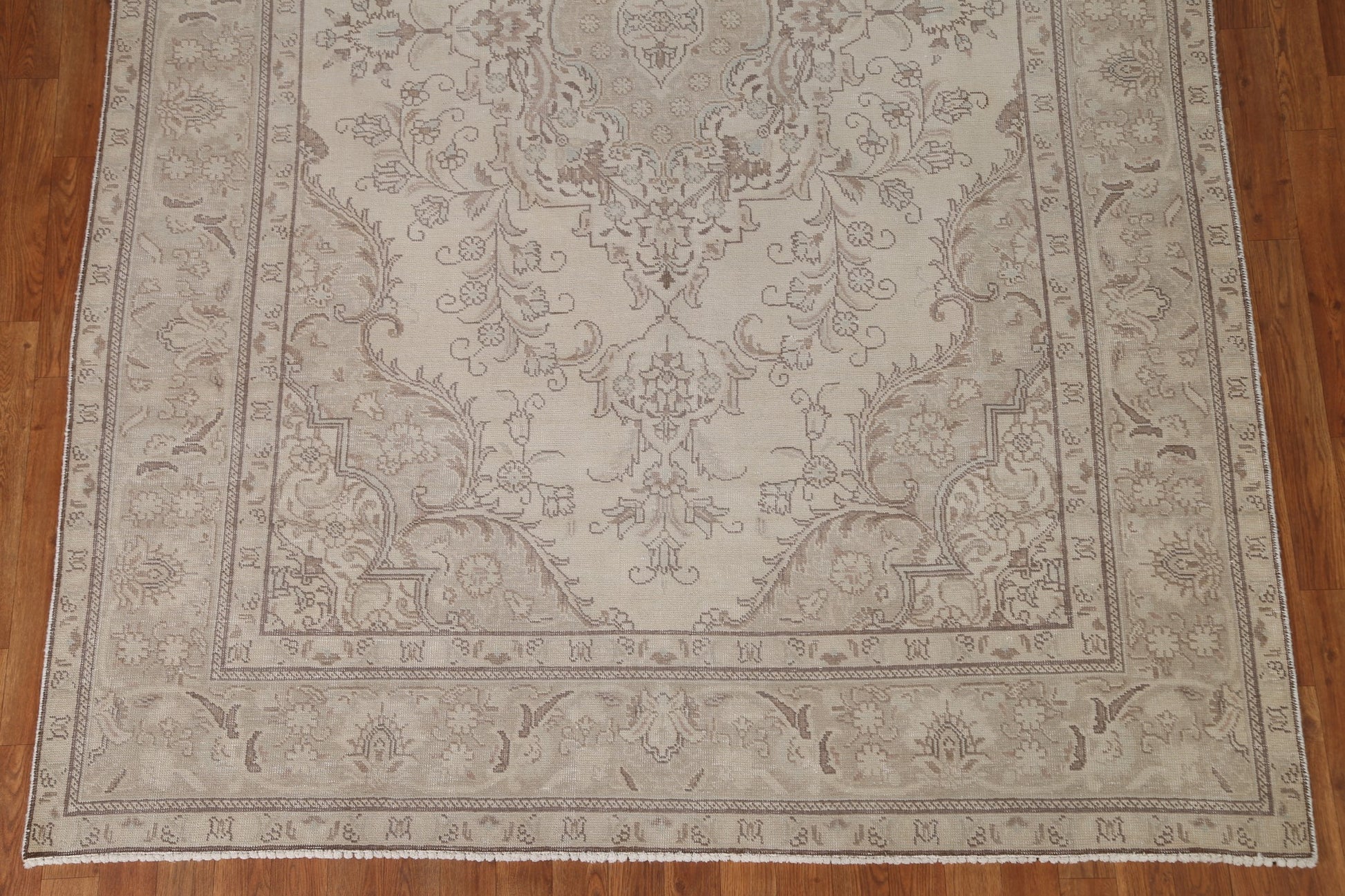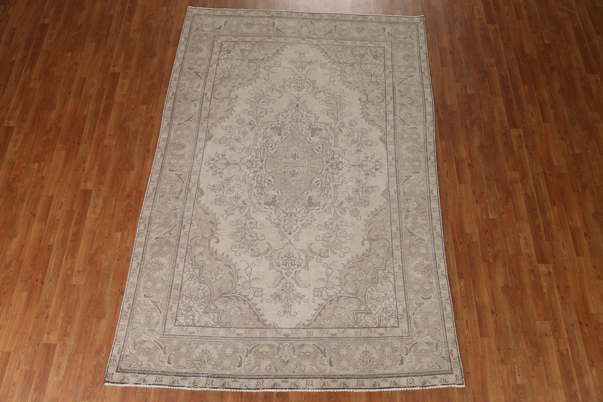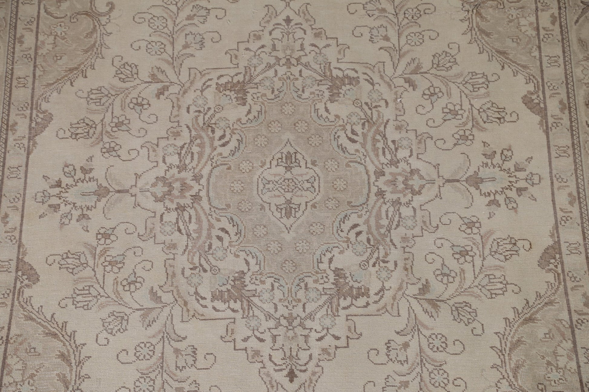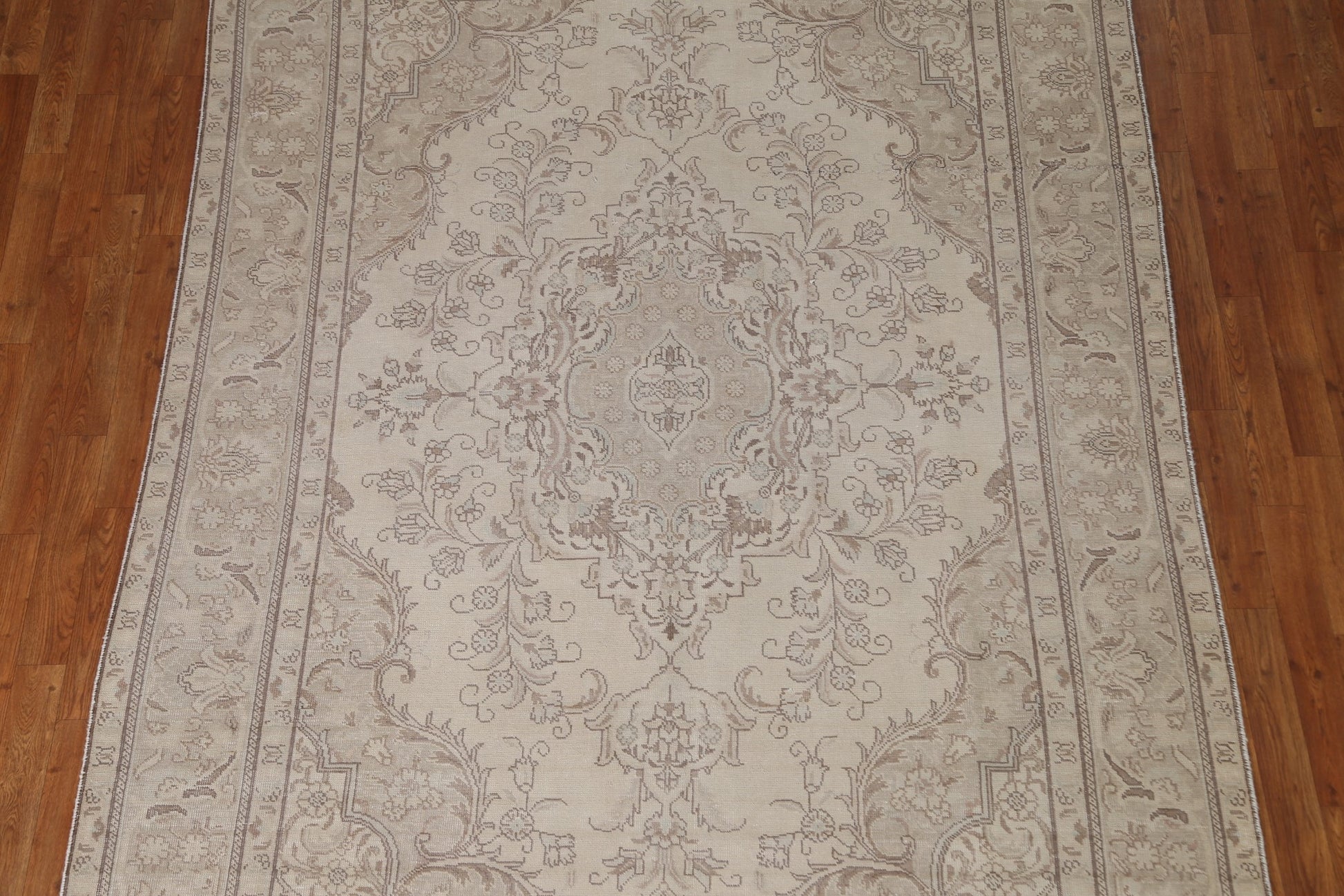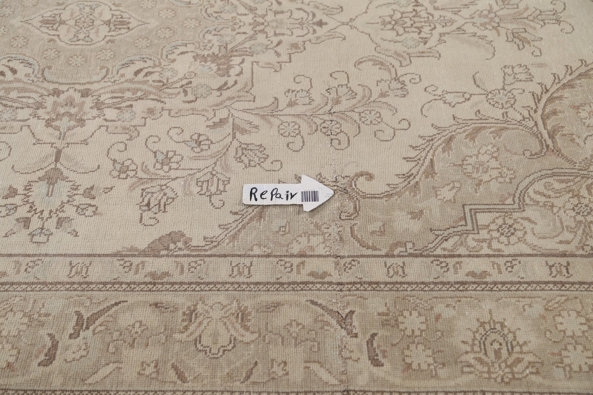 A Beautiful Genuine Persia ( Persia ) Tabriz rug is Hand Knotted by skillful weavers in Persia ( Persia ) with 100% Wool Material. This rug is in Very Good (Low Pile-Repair) condition. dimensions are 9' 4'' X 6' 3'' in foot and 284 X 191 in centimeter. the primary color is Beige & Ivories.
