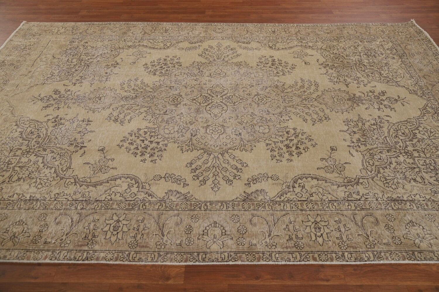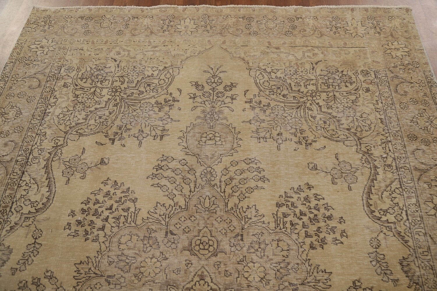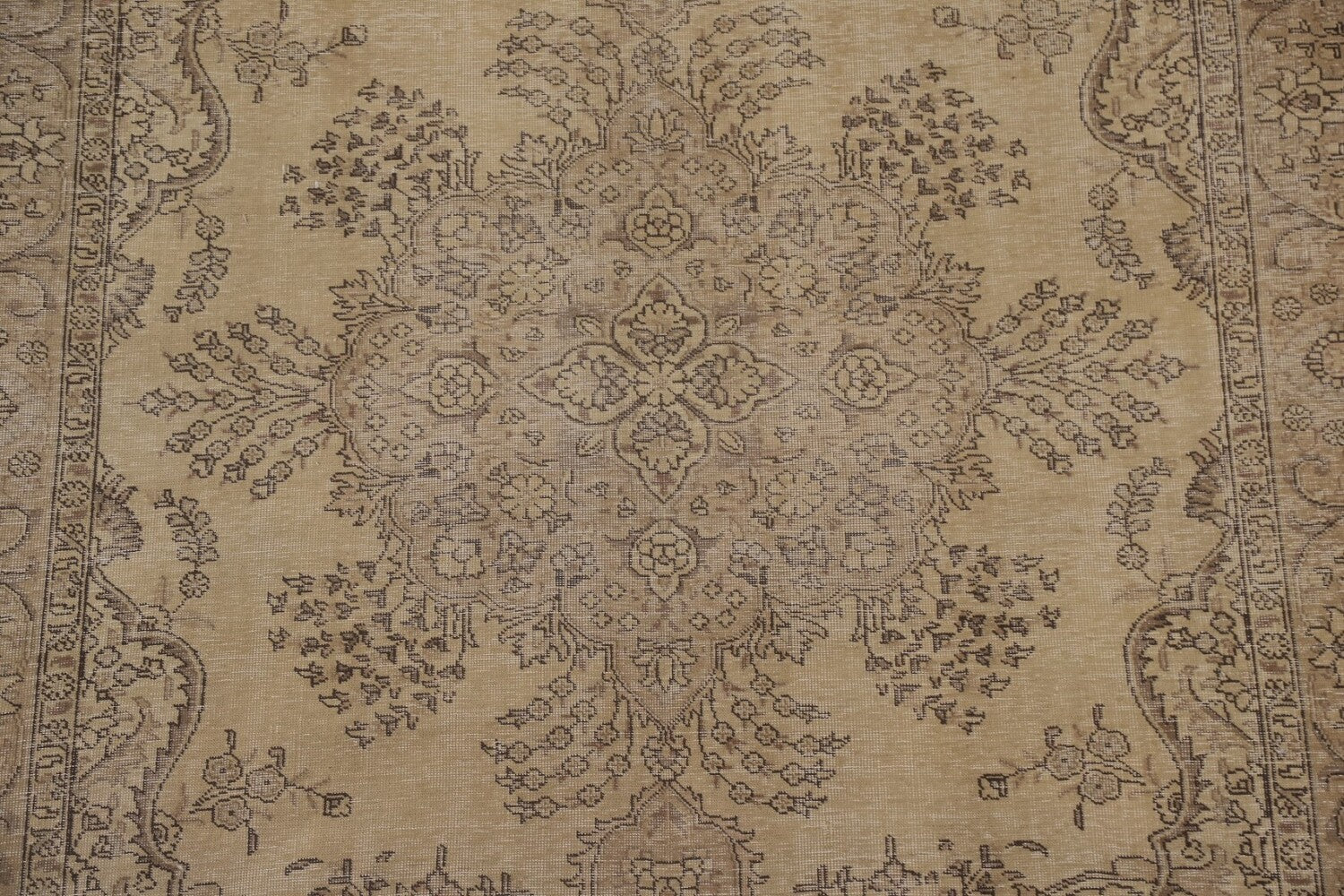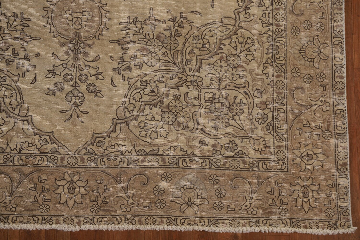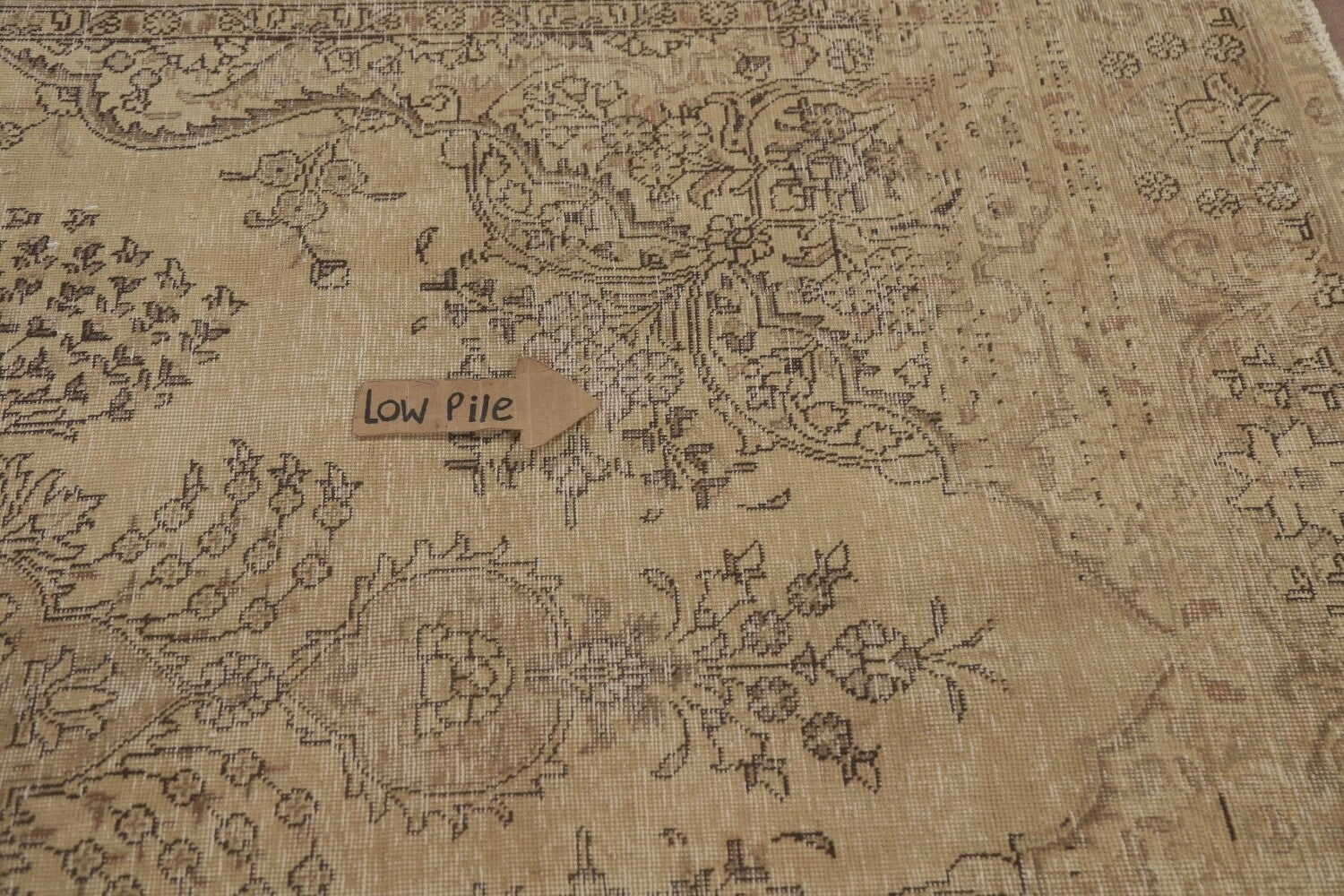 A Beautiful Genuine Persia ( Persia ) Tabriz rug is Hand Knotted by skillful weavers in Persia ( Persia ) with 100% Wool Material. This rug is in Very Good (Low Pile) condition. dimensions are 9' 4'' X 6' 5'' in foot and 284 X 196 in centimeter. the primary color is Yellow & Gold.