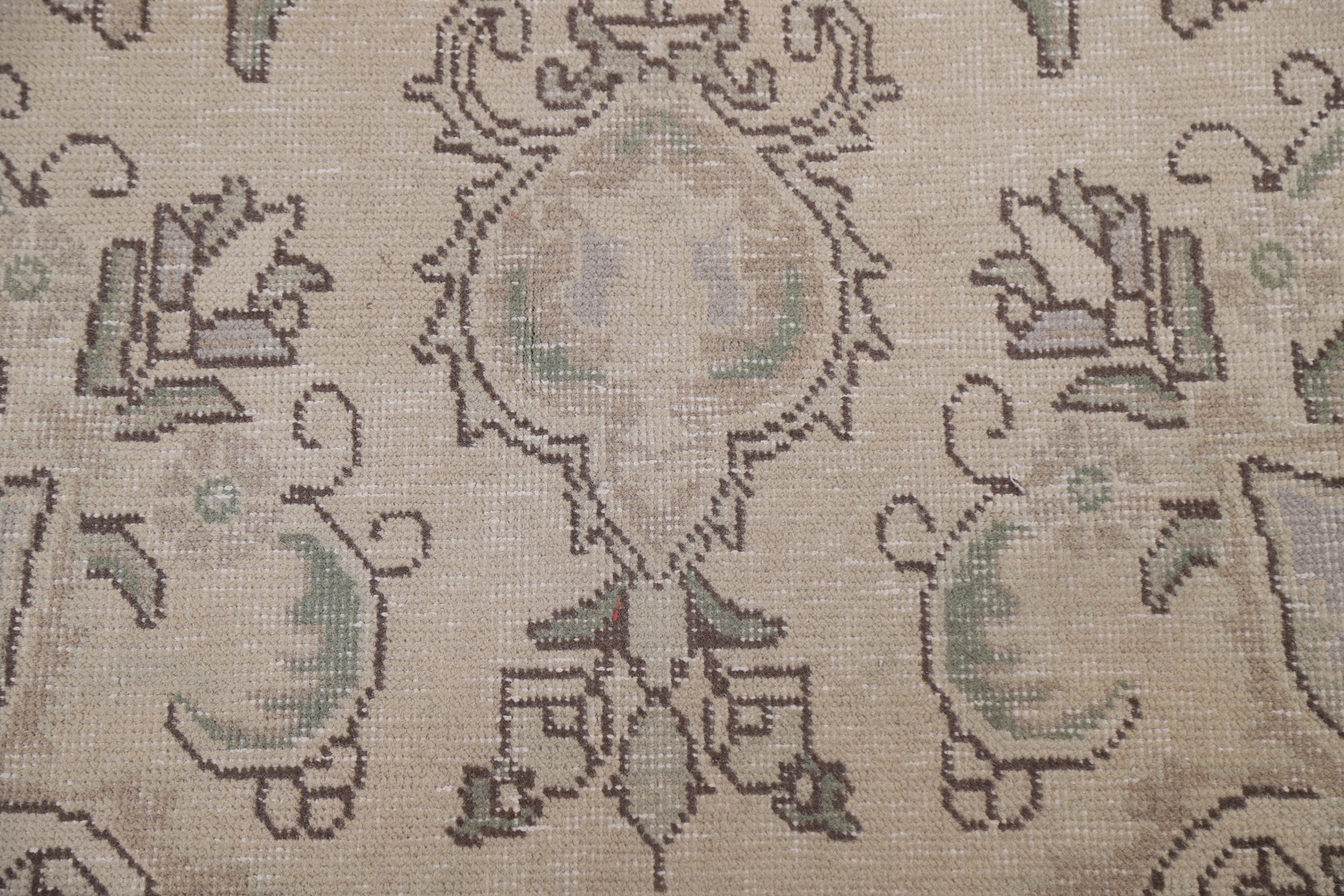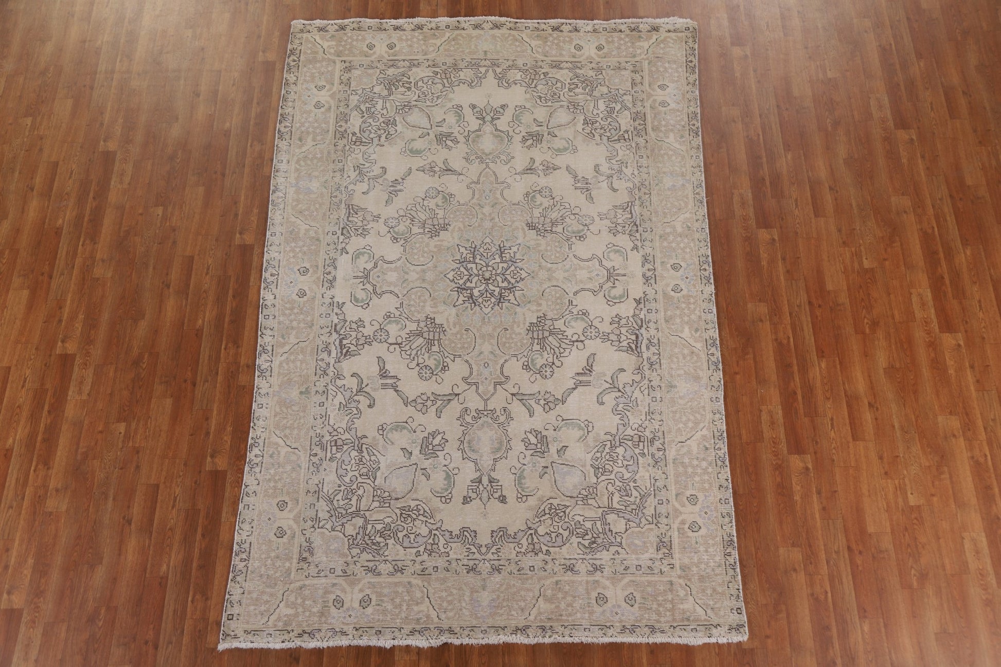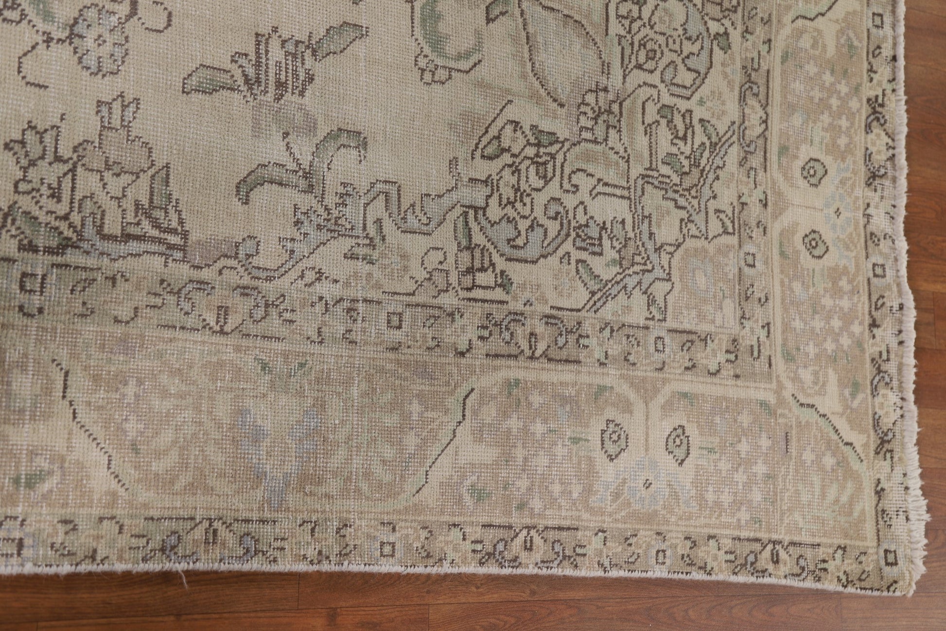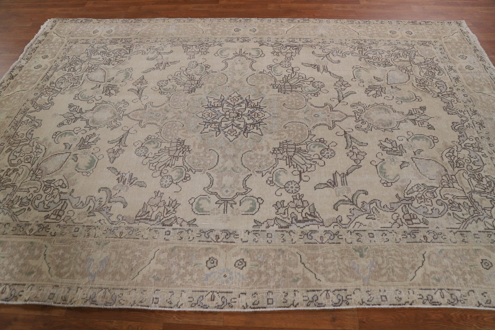 A Beautiful Genuine Persia ( Persia ) Tabriz rug is Hand Knotted by skillful weavers in Persia ( Persia ) with 100% Wool Material. This rug is in Very Good (Evenly Low Pile) condition. dimensions are 9' 4'' X 6' 3'' in foot and 284 X 191 in centimeter. the primary color is Beige & Ivories.
