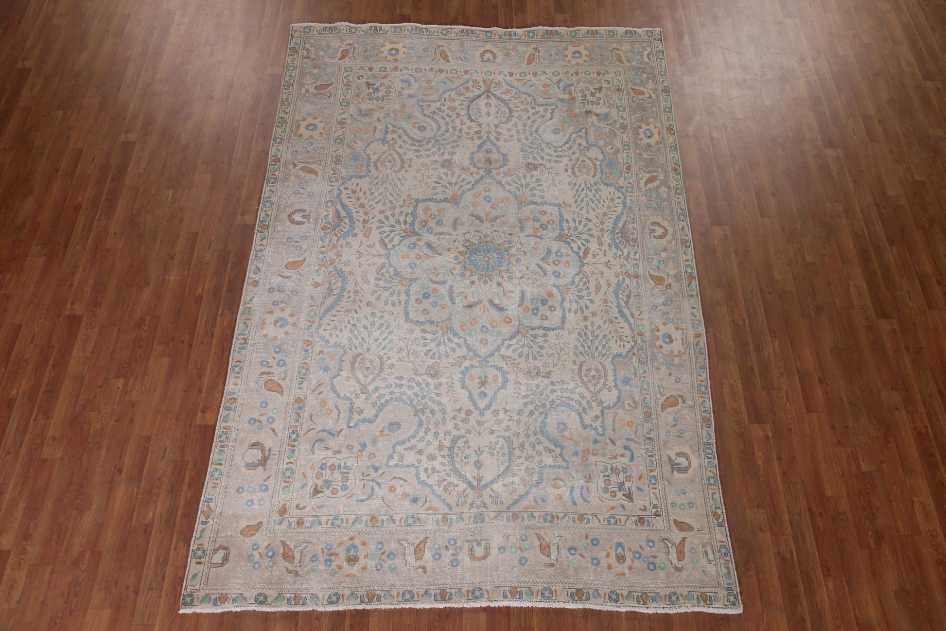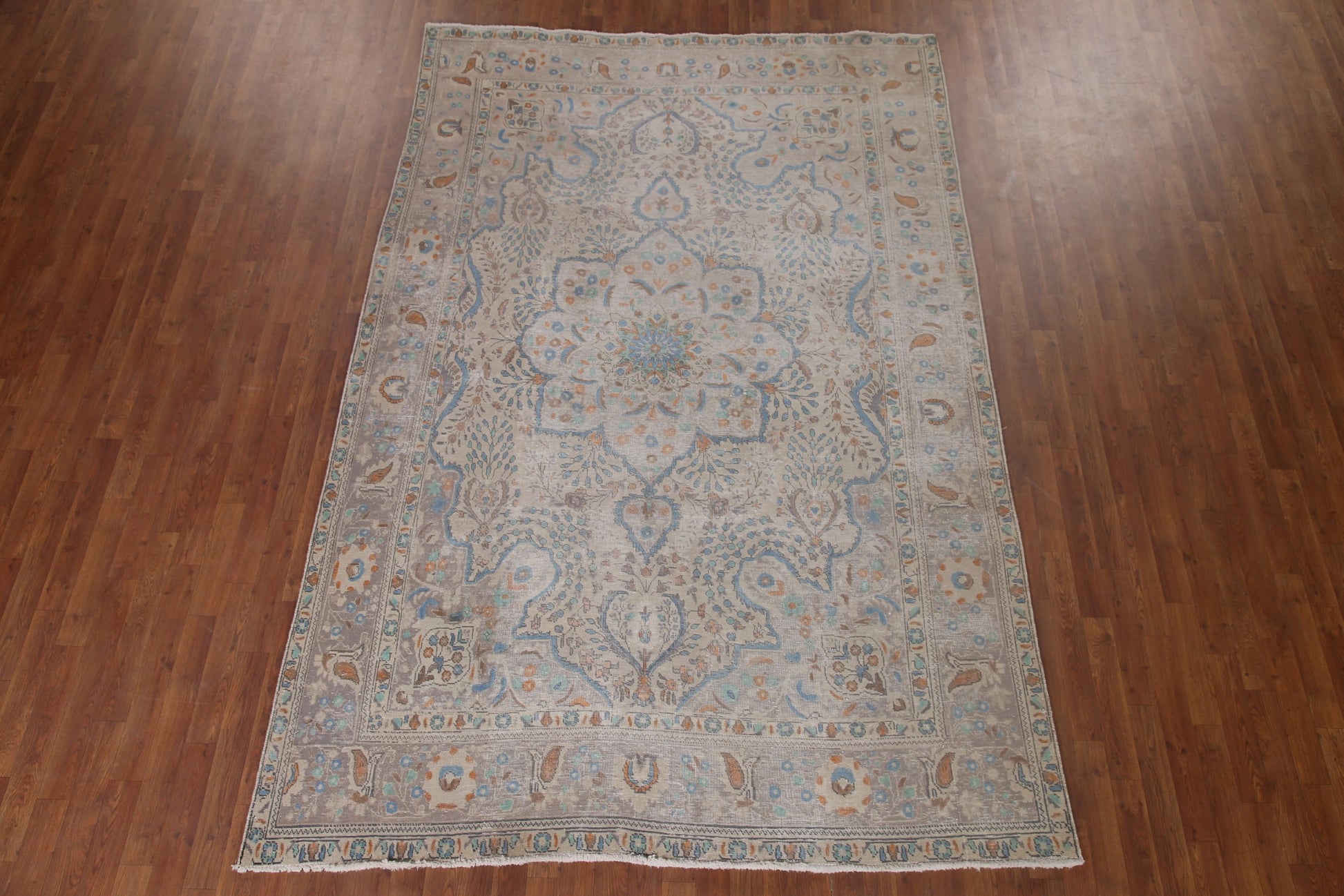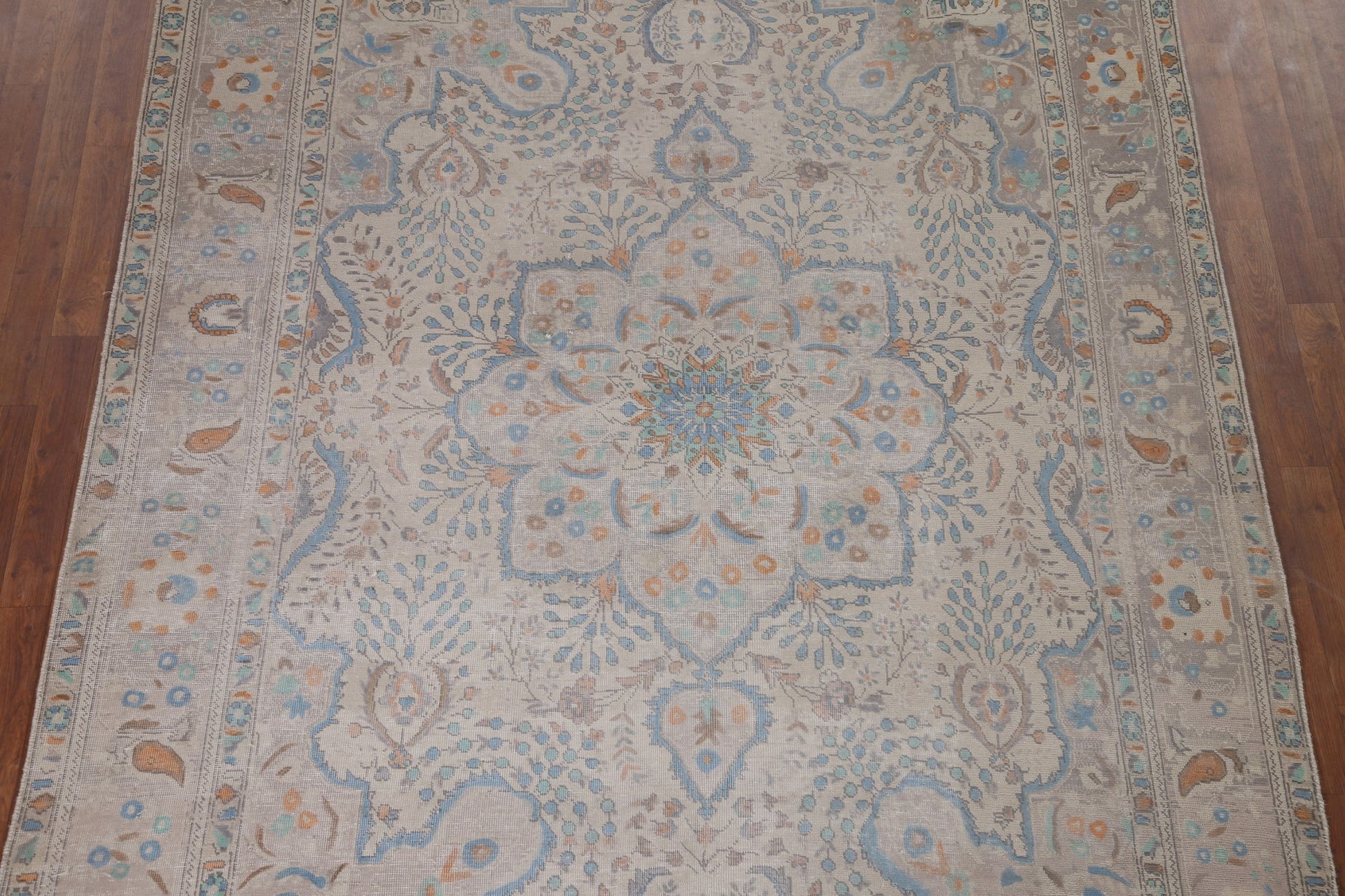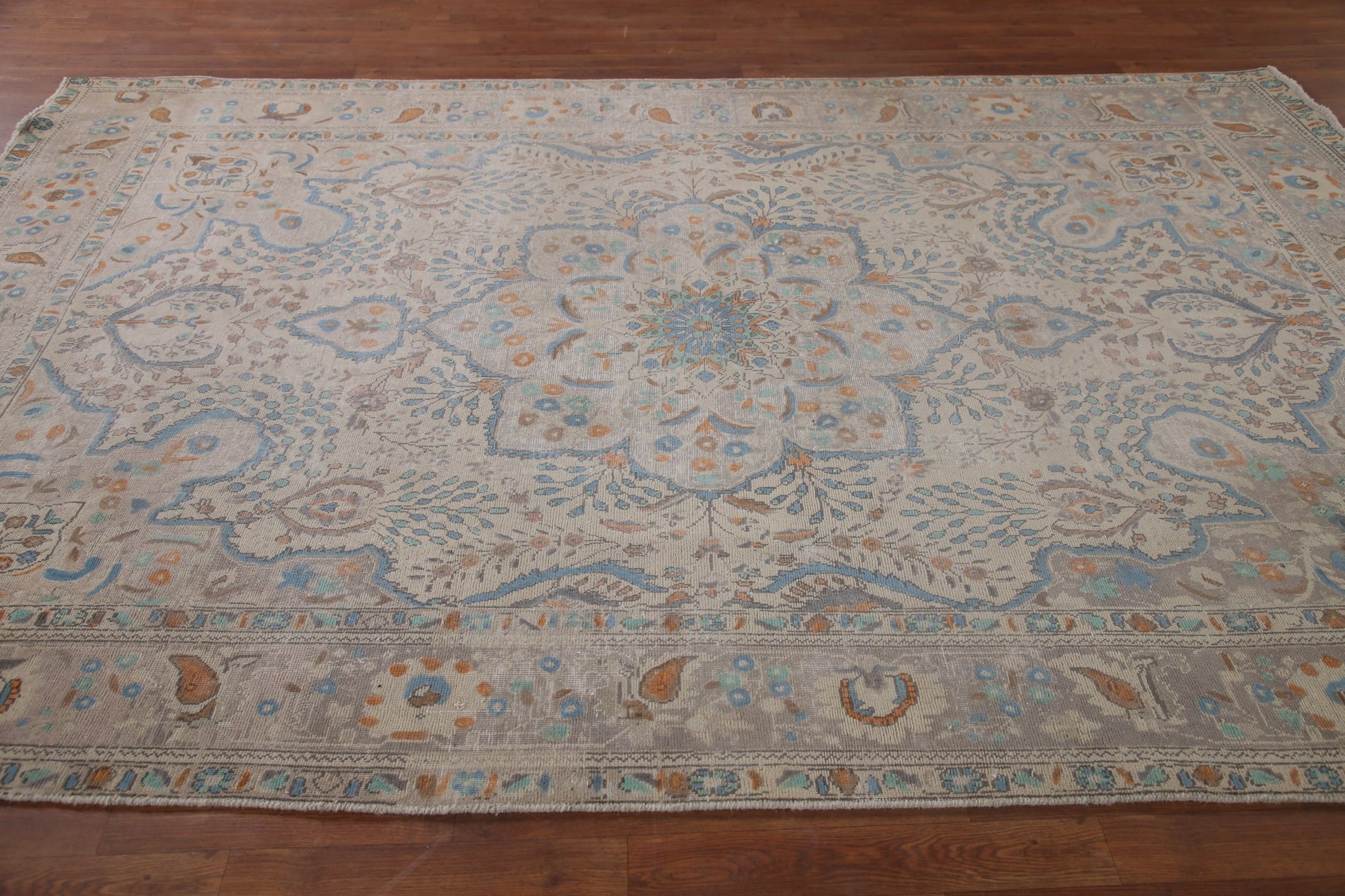 A Beautiful Genuine Persia ( Persia ) Tabriz rug is Hand Knotted by skillful weavers in Persia ( Persia ) with 100% Wool Material. This rug is in Very Good (Evenly Low Pile) condition. dimensions are 10' 0'' X 6' 8'' in foot and 305 X 203 in centimeter. the primary color is Beige & Ivories.