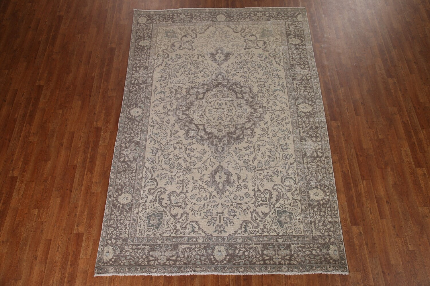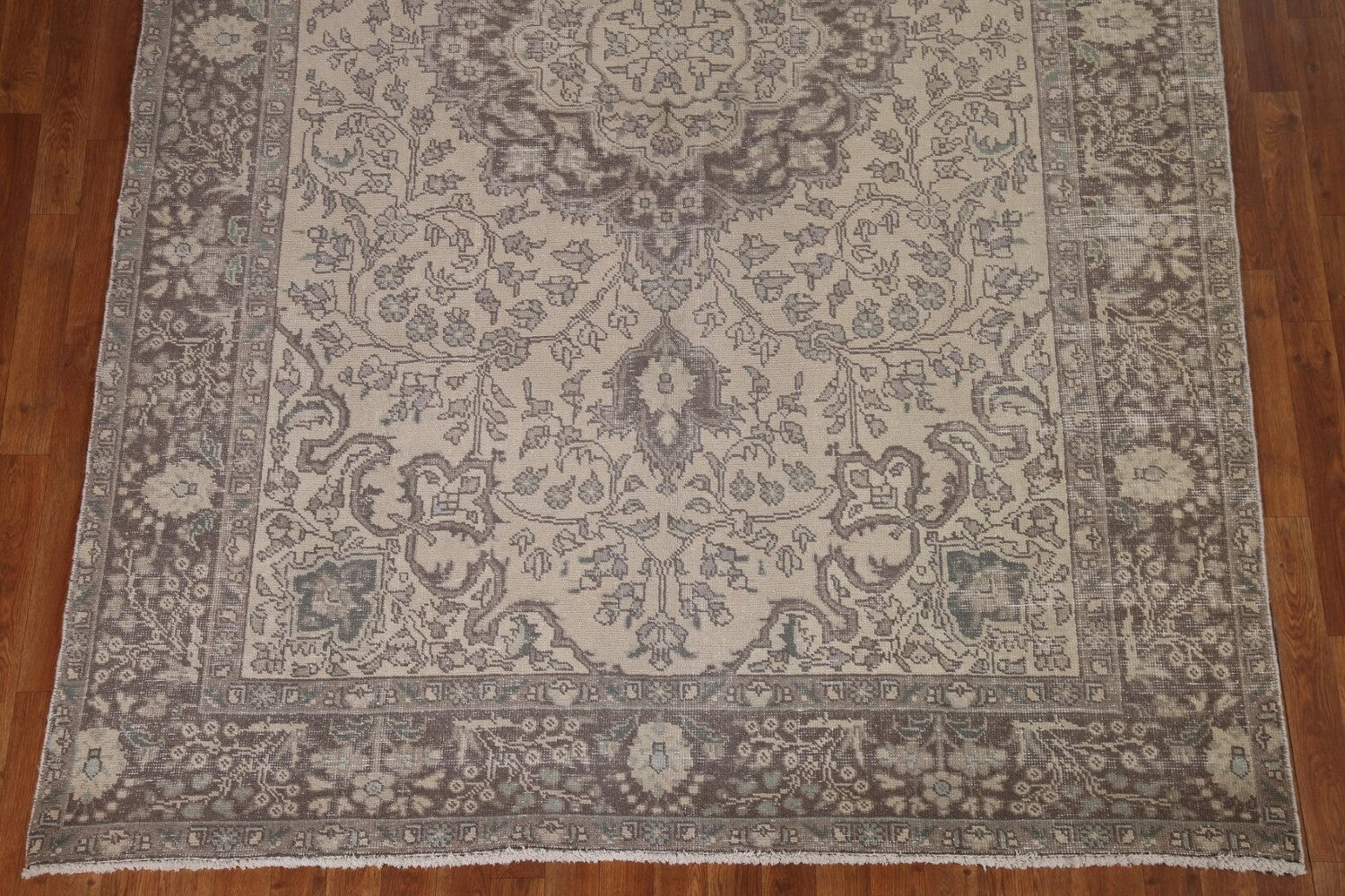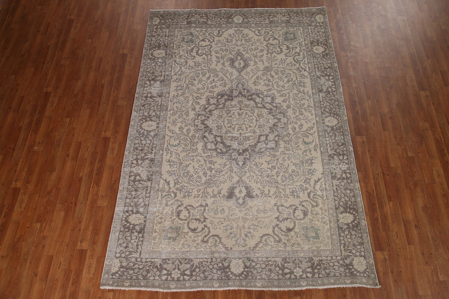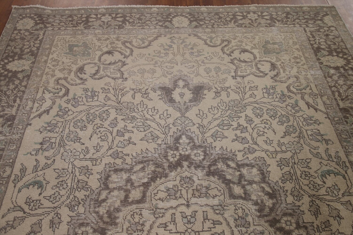 A Beautiful Genuine Persia ( Persia ) Tabriz rug is Hand Knotted by skillful weavers in Persia ( Persia ) with 100% Wool Material. This rug is in Very Good (Low Pile) condition. dimensions are 9' 6'' X 6' 6'' in foot and 290 X 198 in centimeter. the primary color is Beige & Ivories.