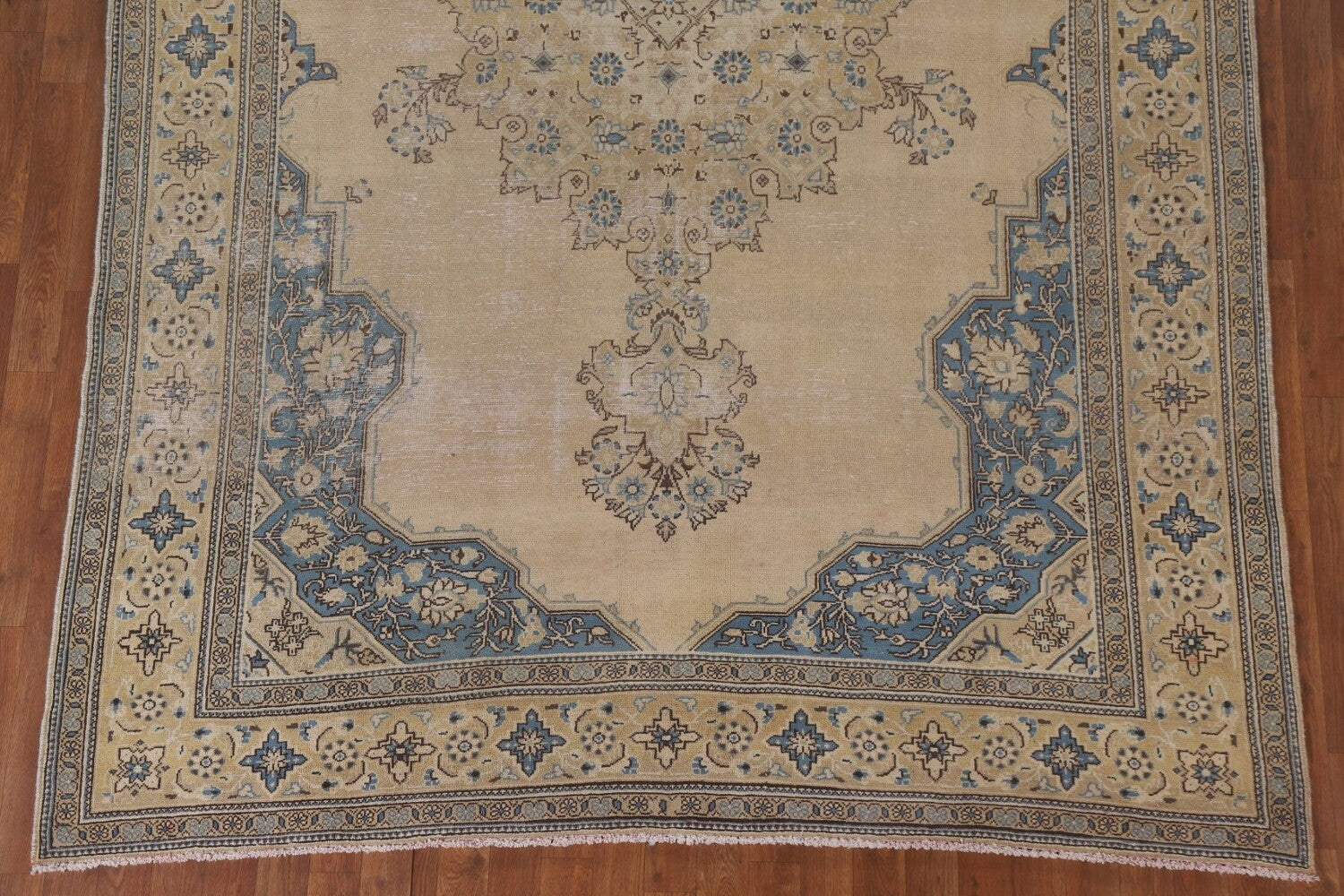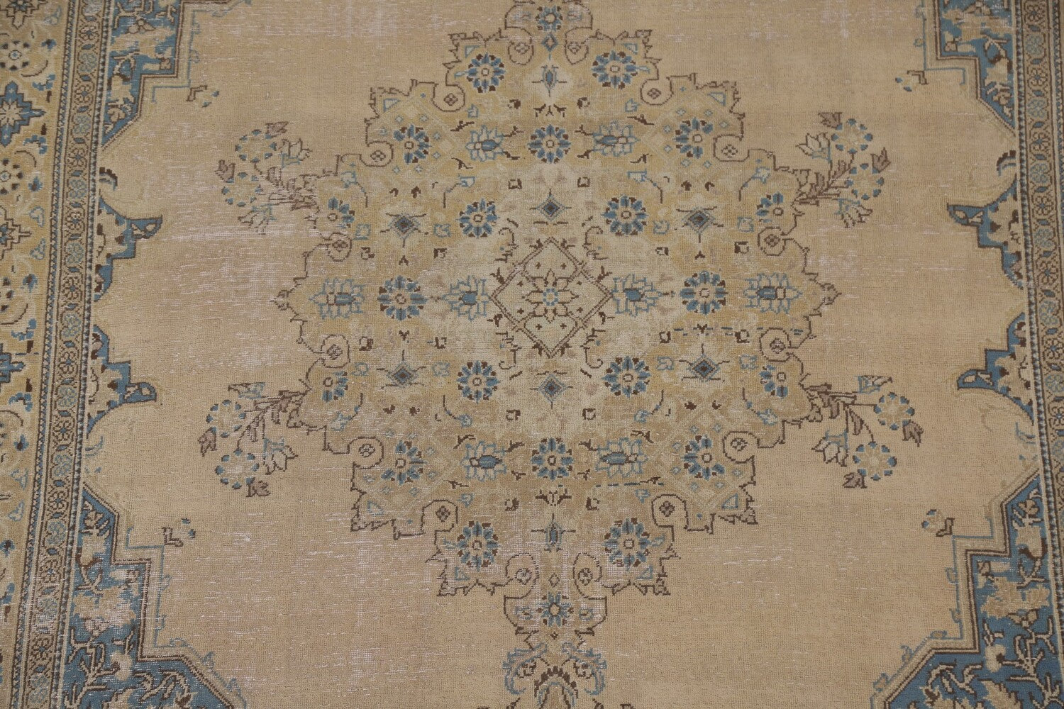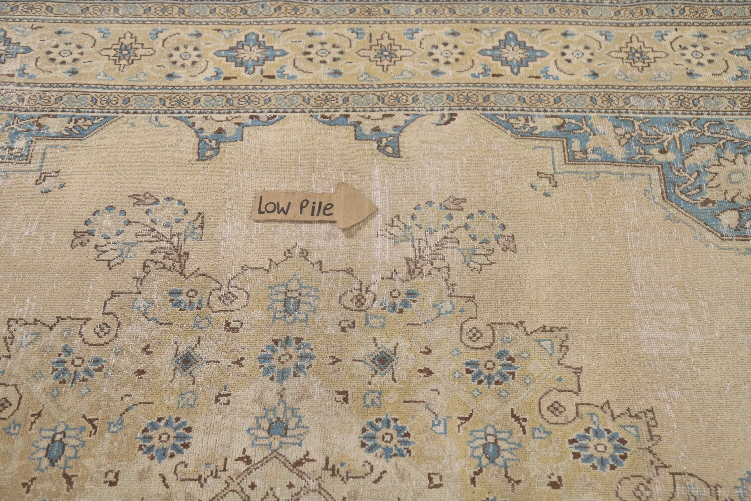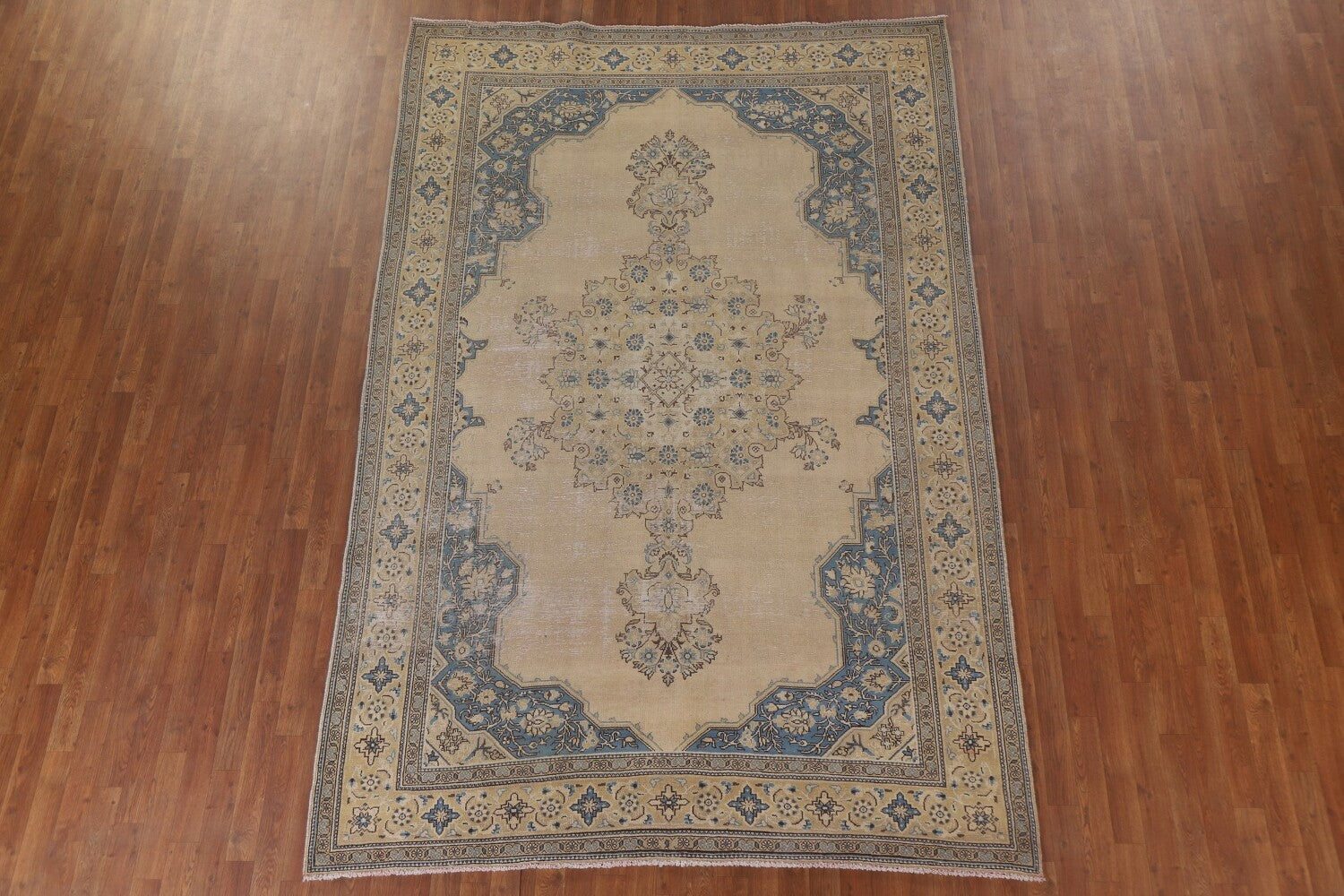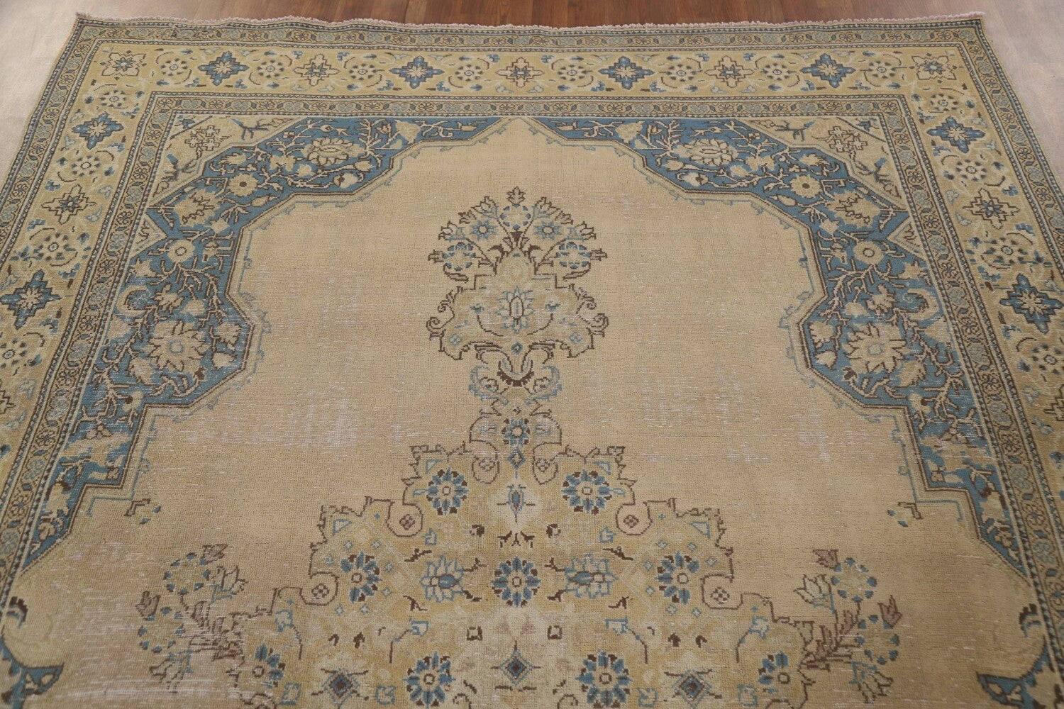 A Beautiful Genuine Persia ( Persia ) Tabriz rug is Hand Knotted by skillful weavers in Persia ( Persia ) with 100% Wool Material. This rug is in Very Good ( Low Pile- Repair) condition. dimensions are 10' 3'' X 6' 9'' in foot and 312 X 206 in centimeter. the primary color is Beige & Ivories.