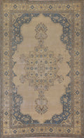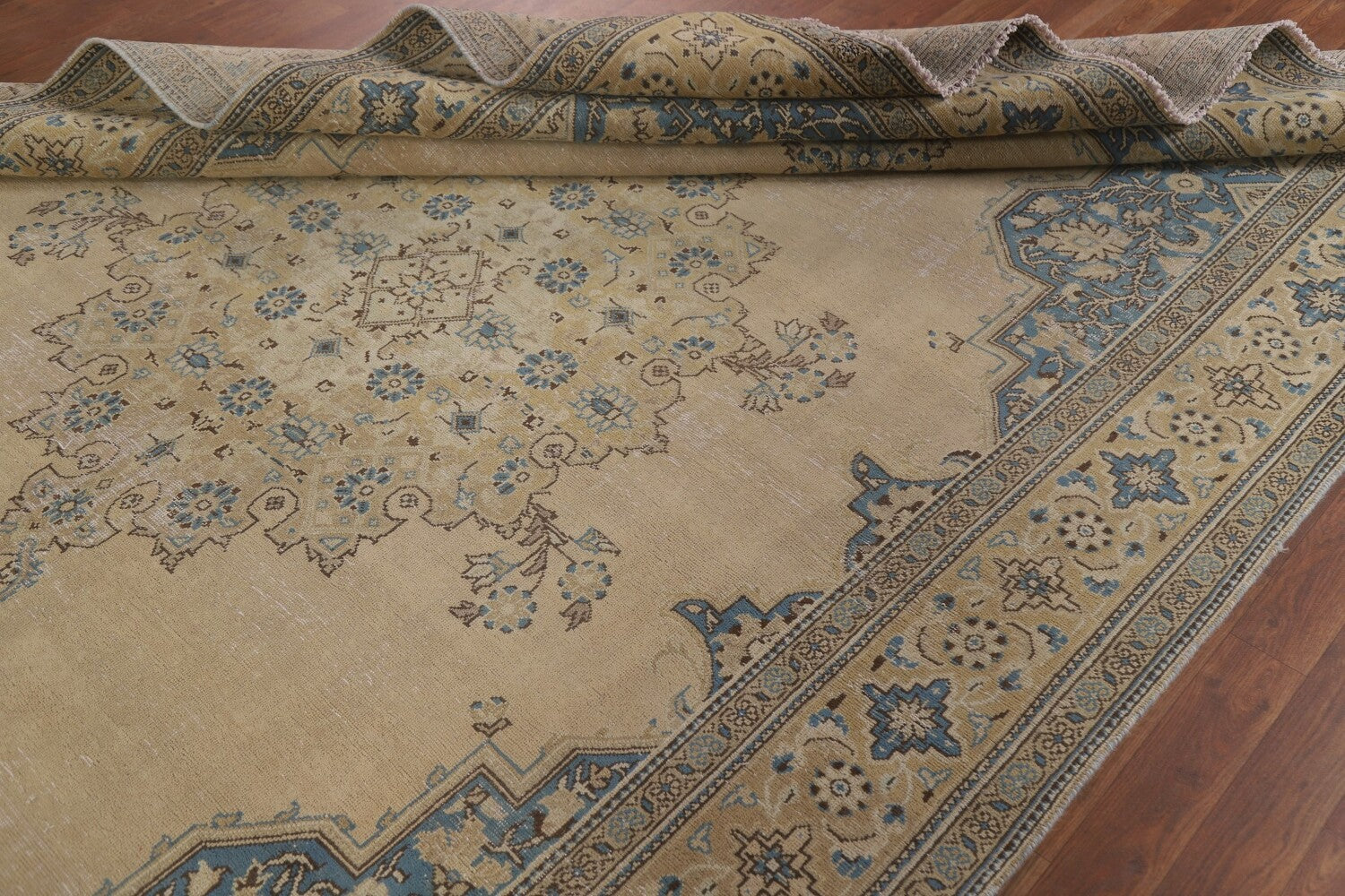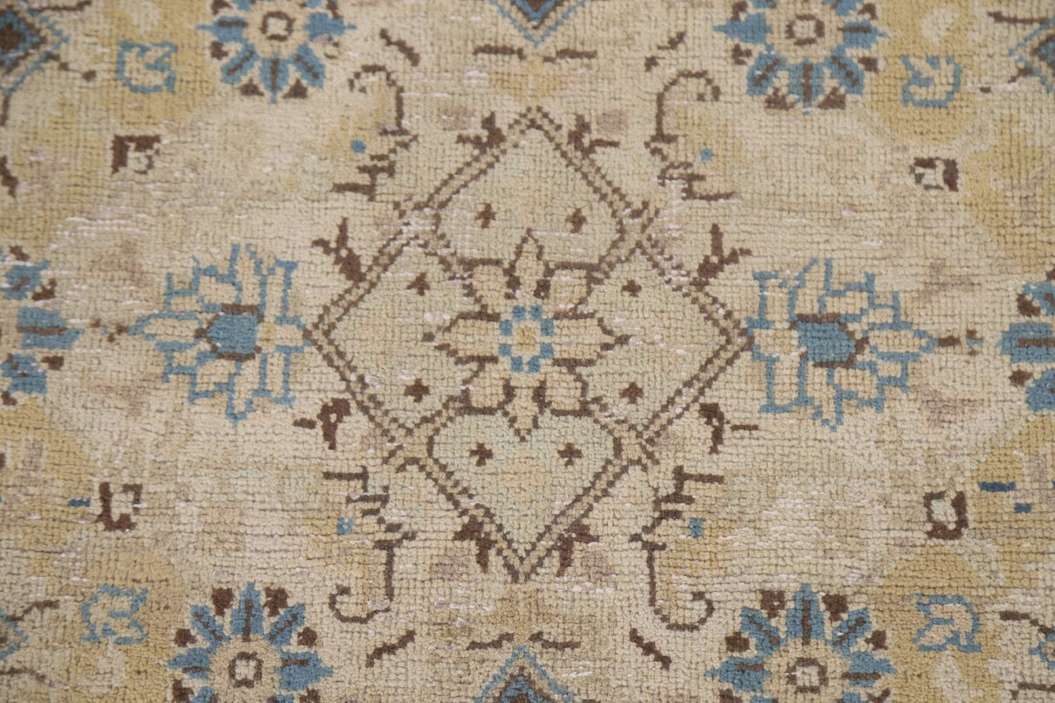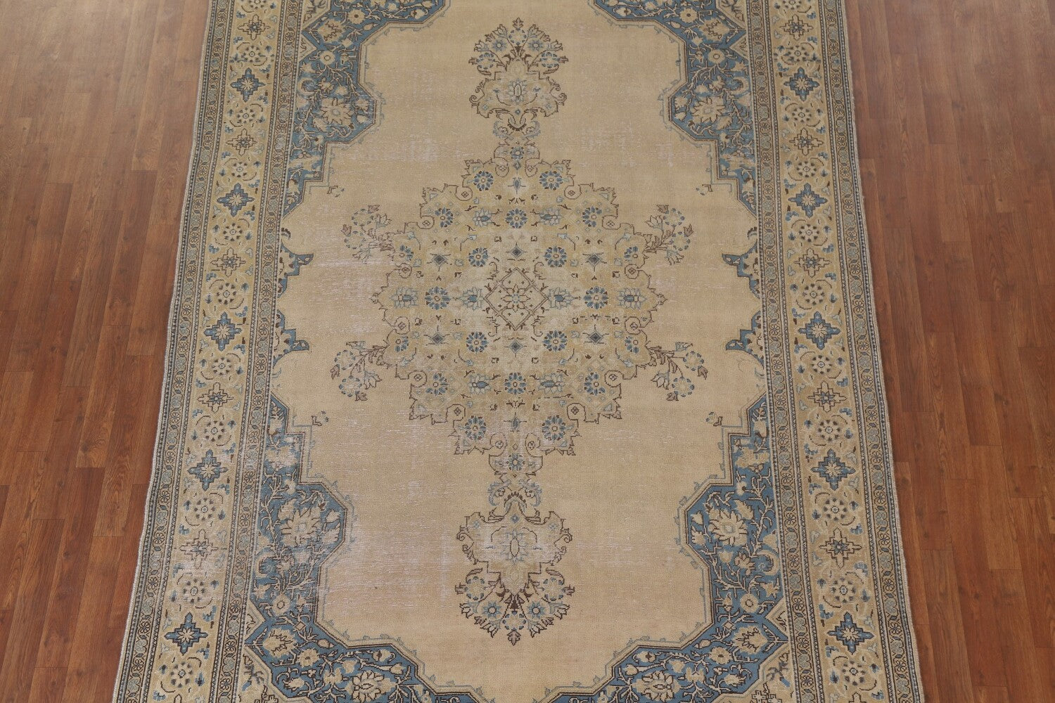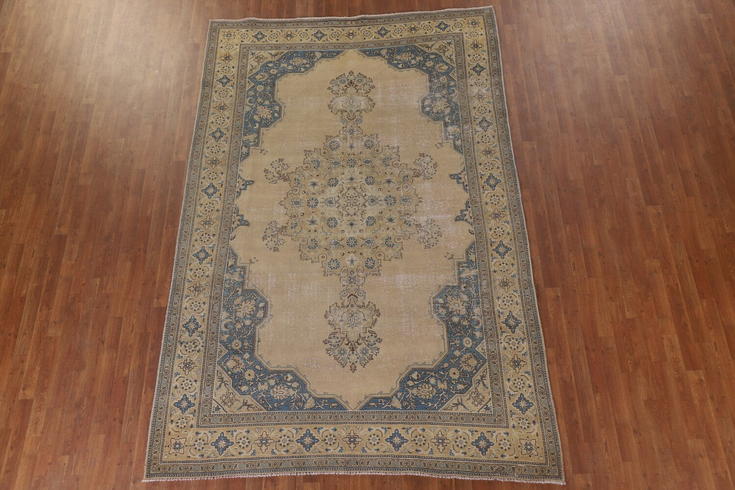 A Beautiful Genuine Persia ( Persia ) Tabriz rug is Hand Knotted by skillful weavers in Persia ( Persia ) with 100% Wool Material. This rug is in Very Good ( Low Pile- Repair) condition. dimensions are 10' 3'' X 6' 9'' in foot and 312 X 206 in centimeter. the primary color is Beige & Ivories.