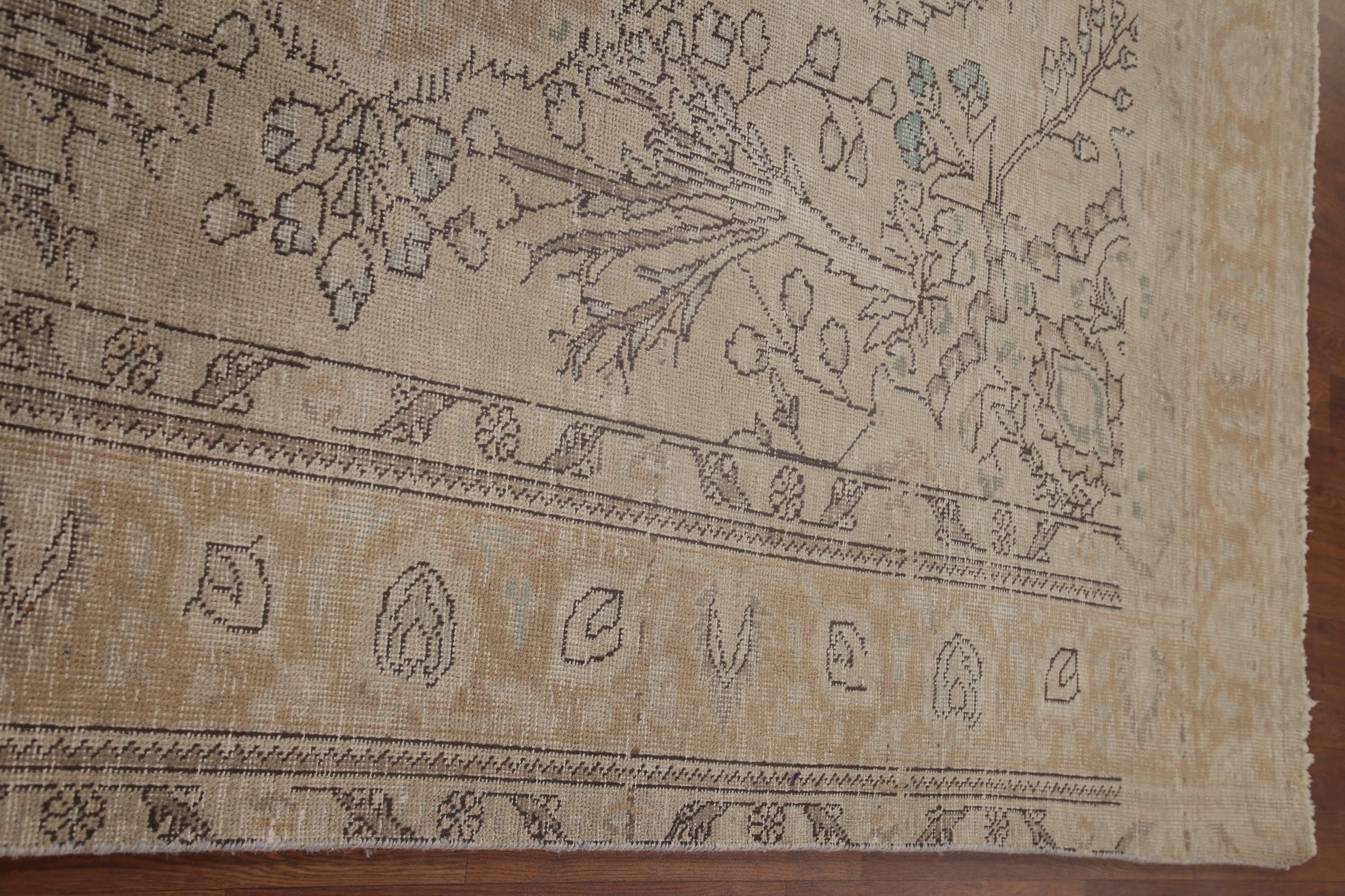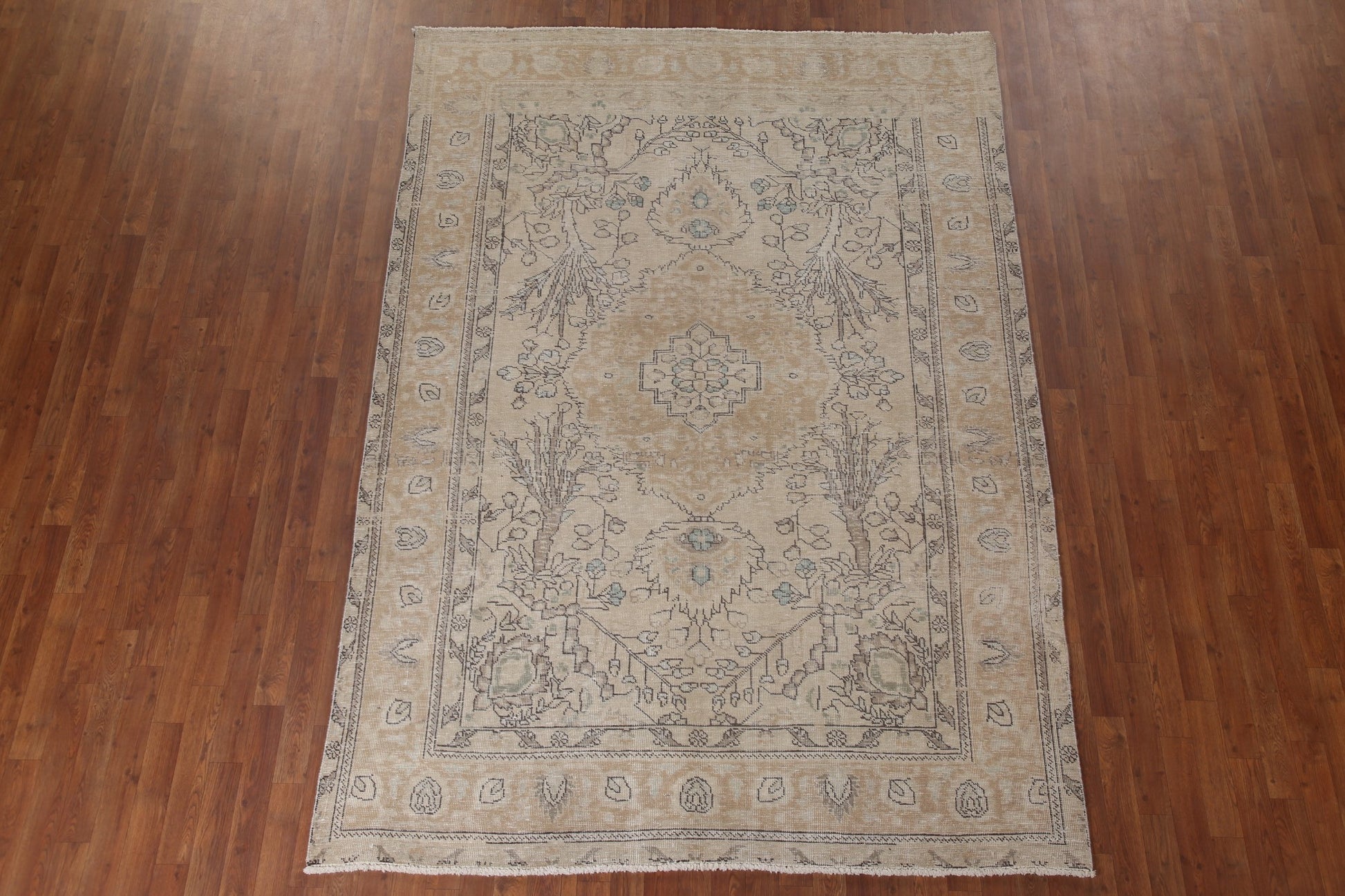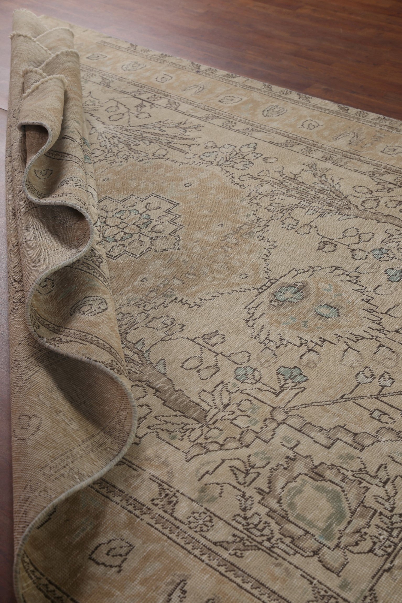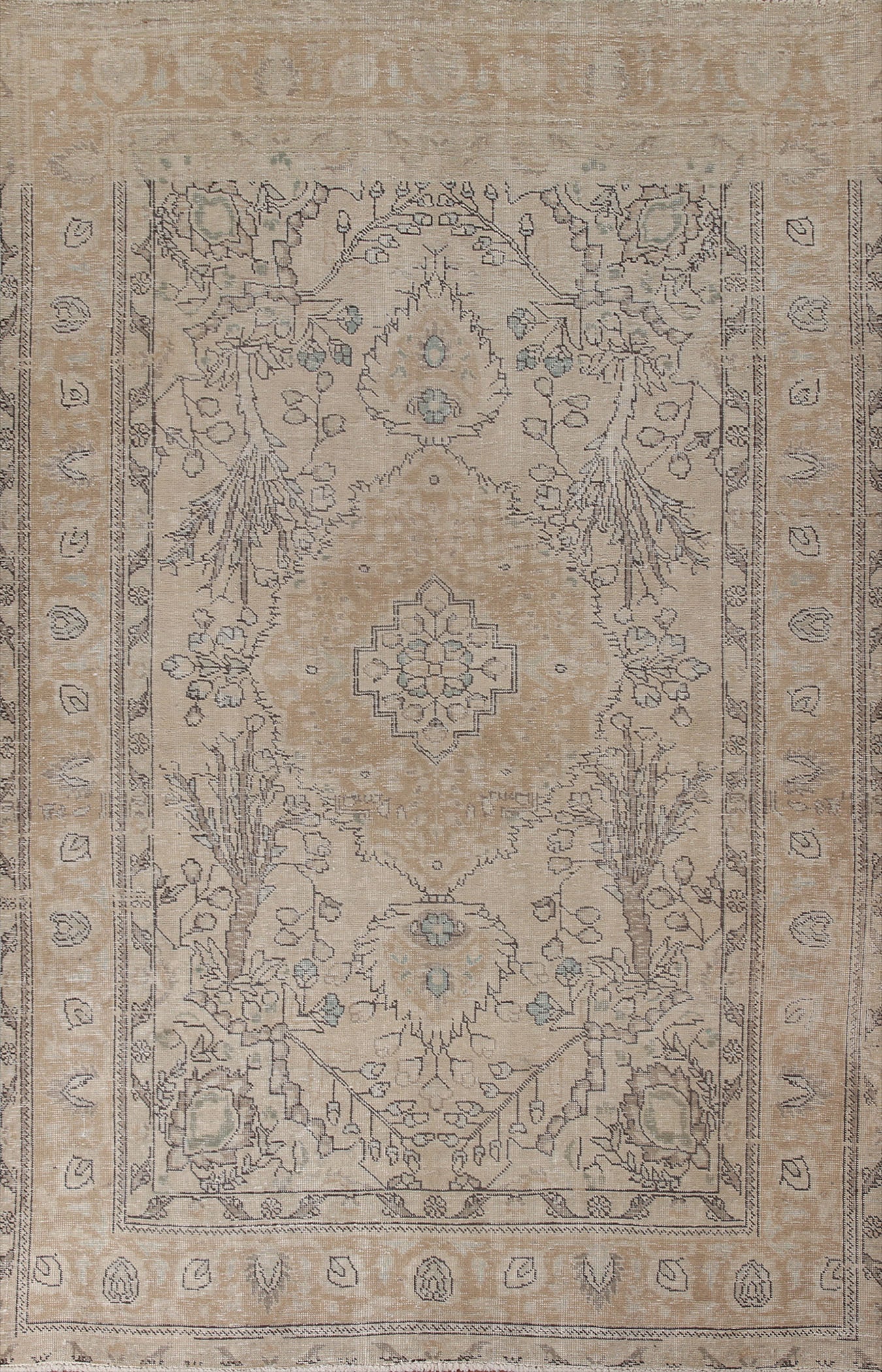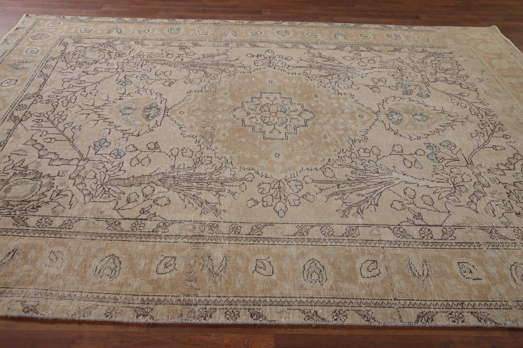 A Beautiful Genuine Persia ( Persia ) Tabriz rug is Hand Knotted by skillful weavers in Persia ( Persia ) with 100% Wool Material. This rug is in Very Good (Low Pile-Abrash) condition. dimensions are 9' 3'' X 6' 6'' in foot and 282 X 198 in centimeter. the primary color is Beige & Ivories.