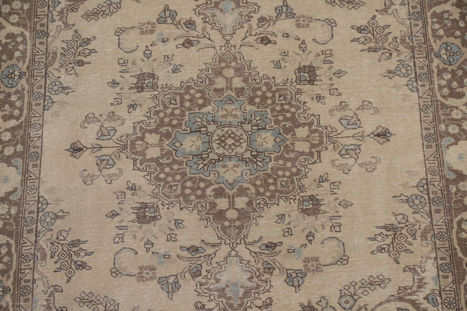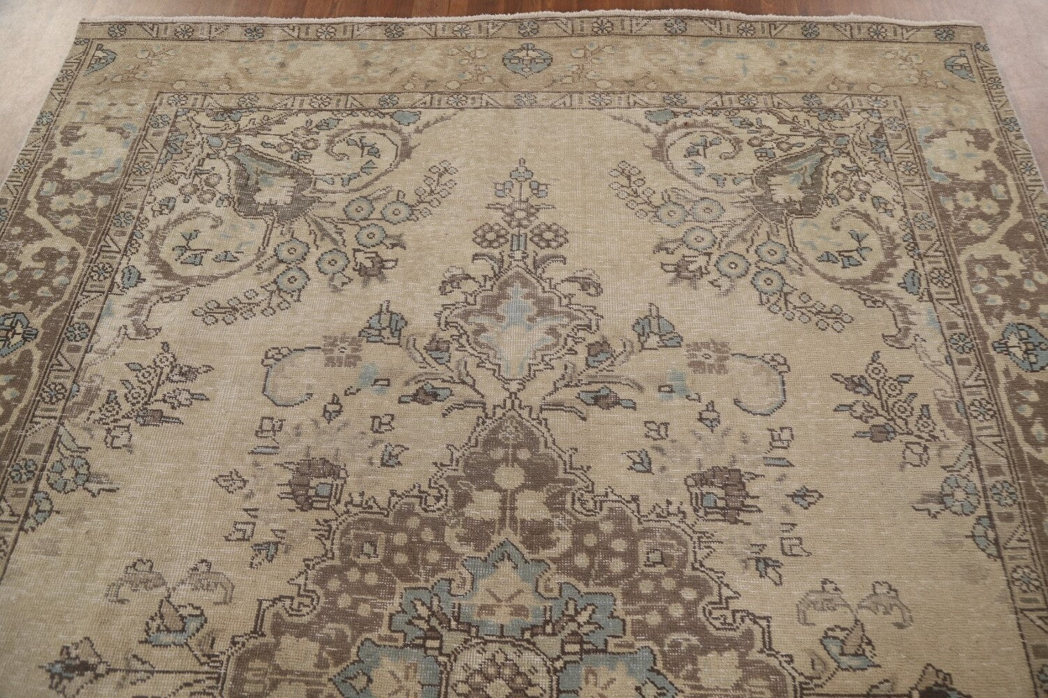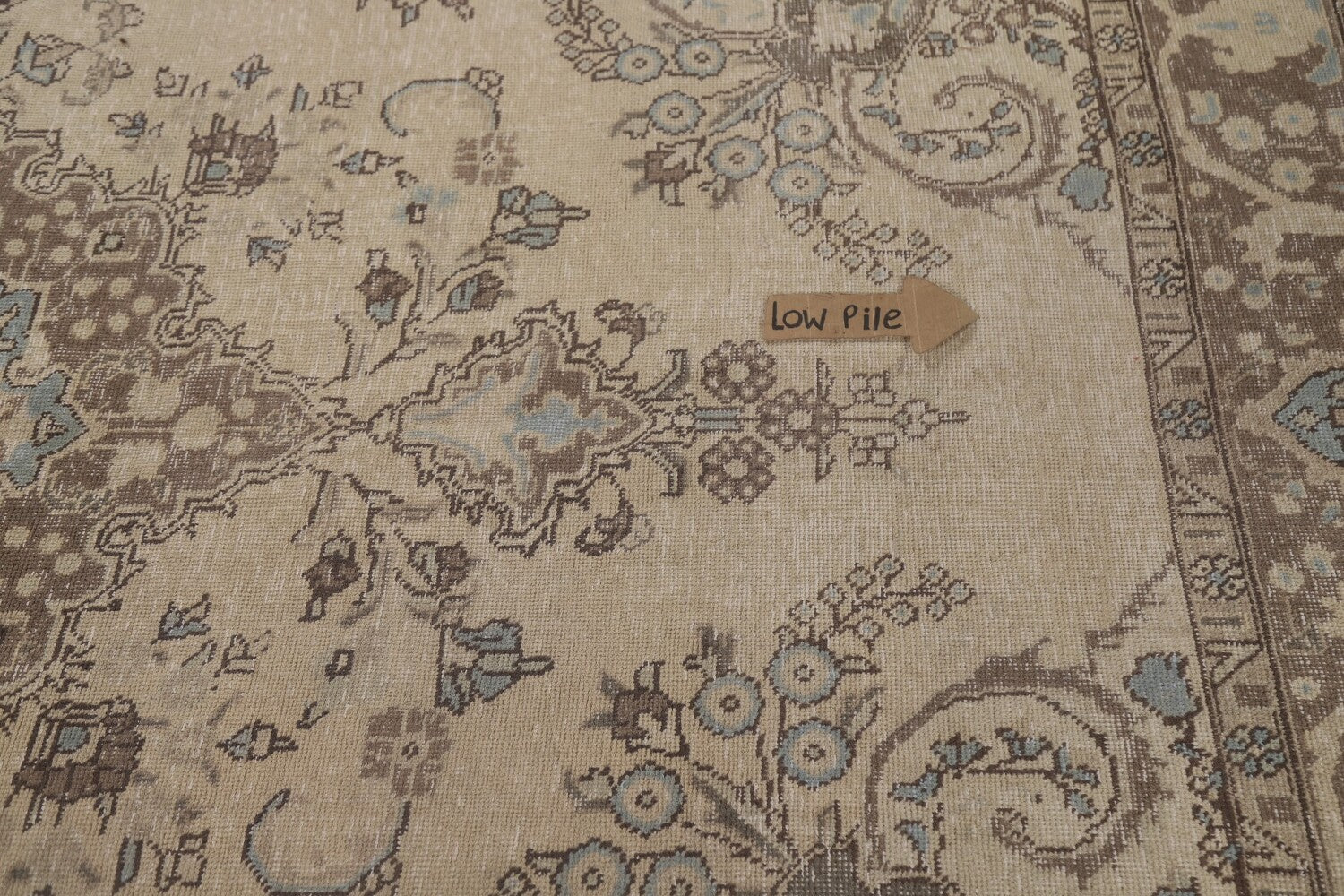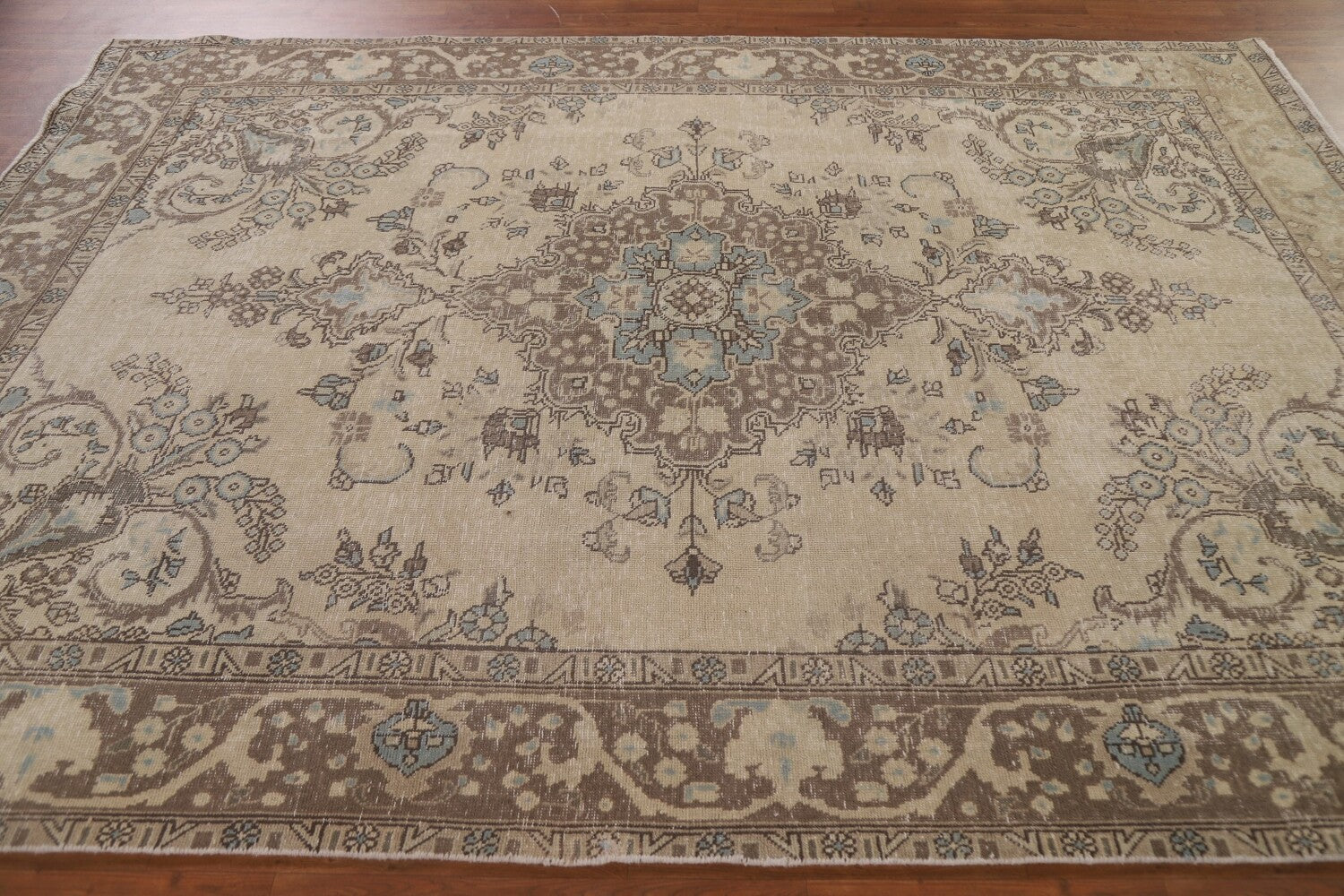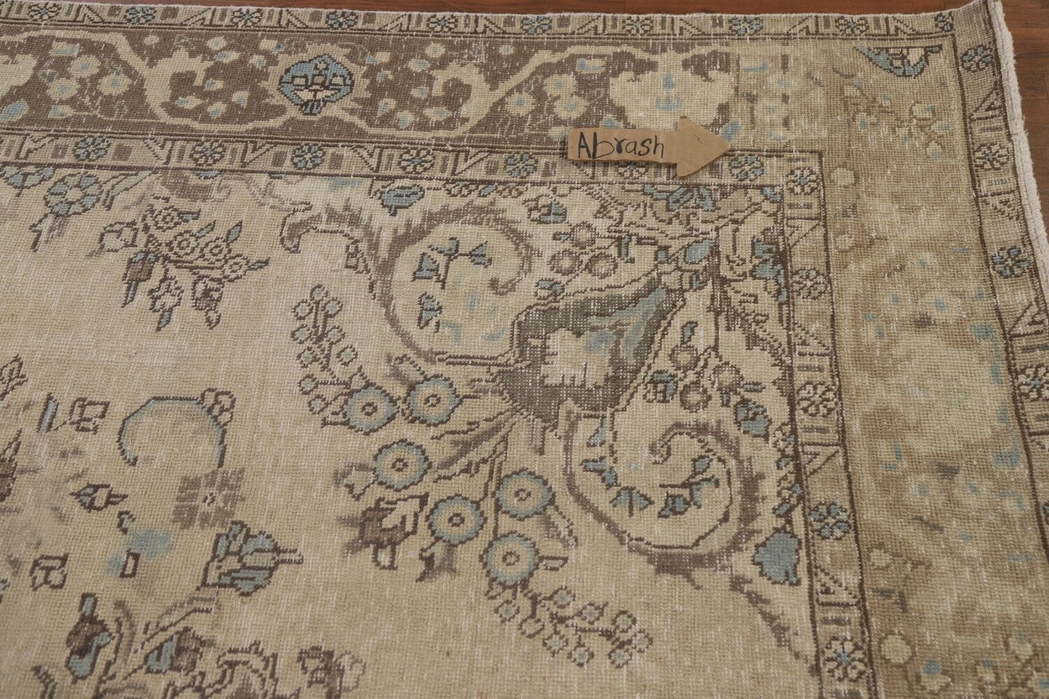 A Beautiful Genuine Persia ( Persia ) Tabriz rug is Hand Knotted by skillful weavers in Persia ( Persia ) with 100% Wool Material. This rug is in Very Good (Low Pile-Abrash-Repair) condition. dimensions are 9' 2'' X 6' 8'' in foot and 279 X 203 in centimeter. the primary color is Beige & Ivories.