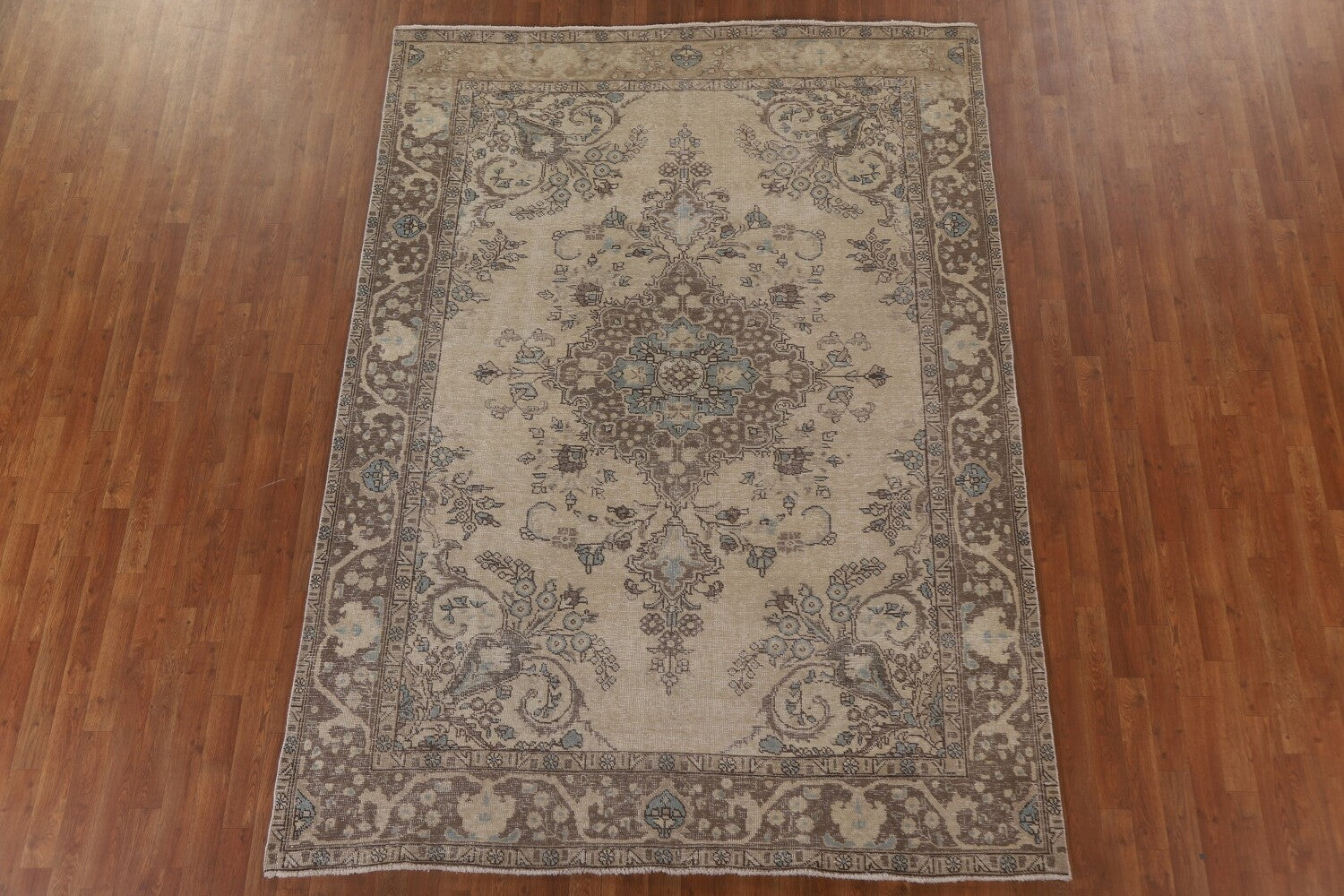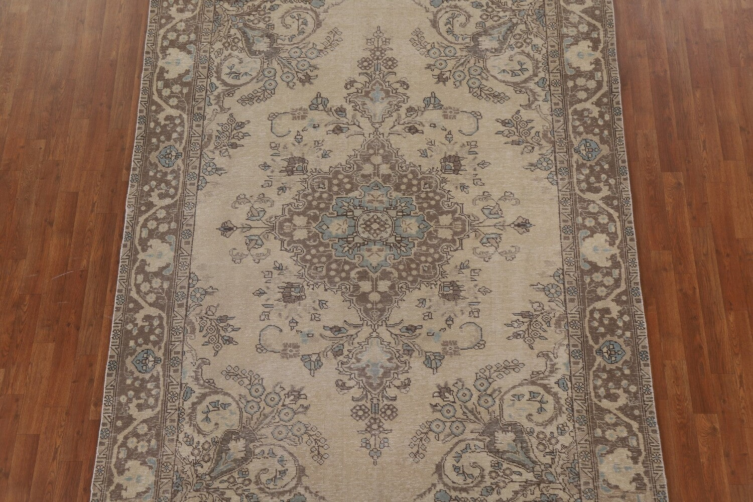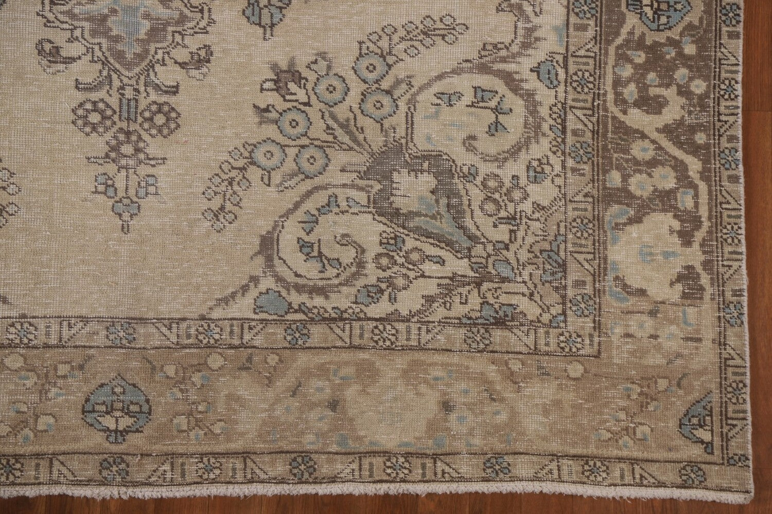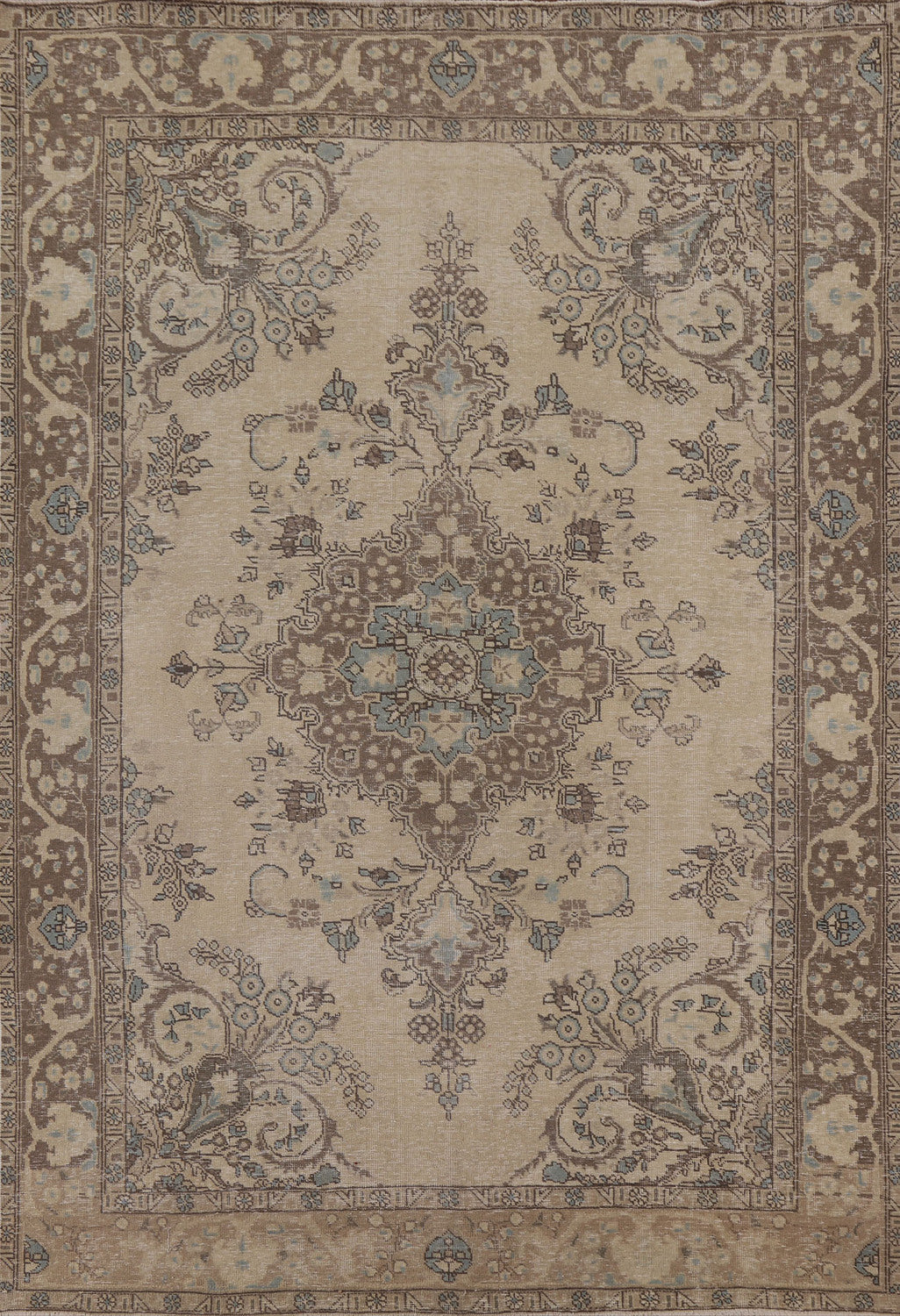 A Beautiful Genuine Persia ( Persia ) Tabriz rug is Hand Knotted by skillful weavers in Persia ( Persia ) with 100% Wool Material. This rug is in Very Good (Low Pile-Abrash-Repair) condition. dimensions are 9' 2'' X 6' 8'' in foot and 279 X 203 in centimeter. the primary color is Beige & Ivories.