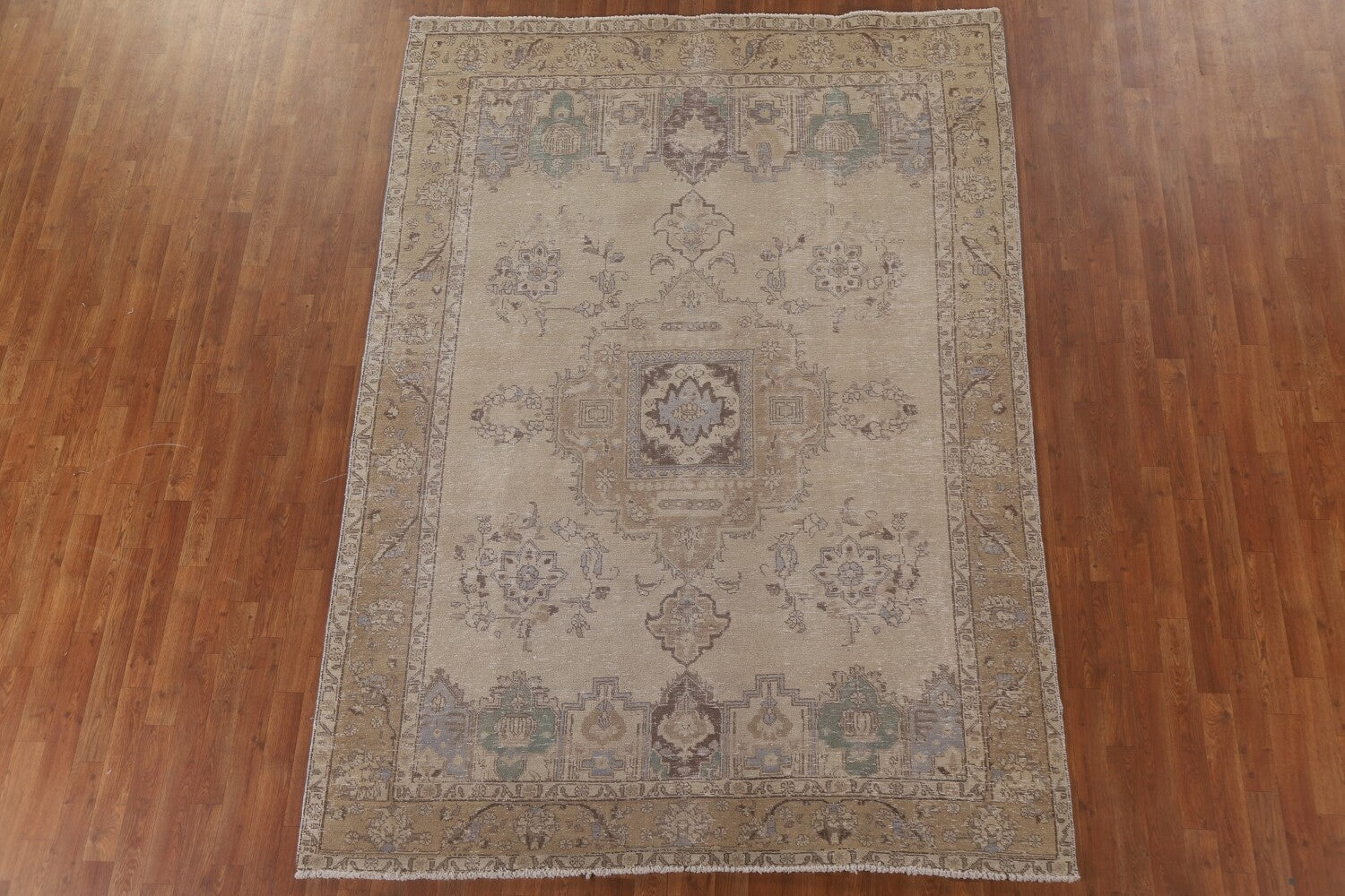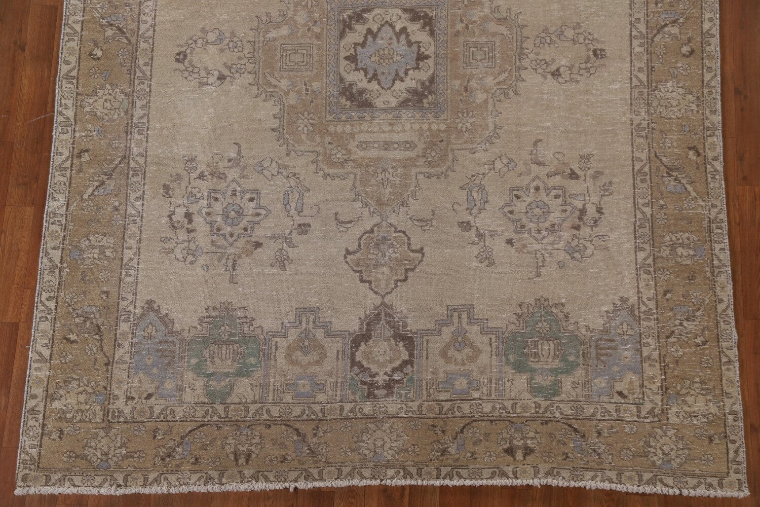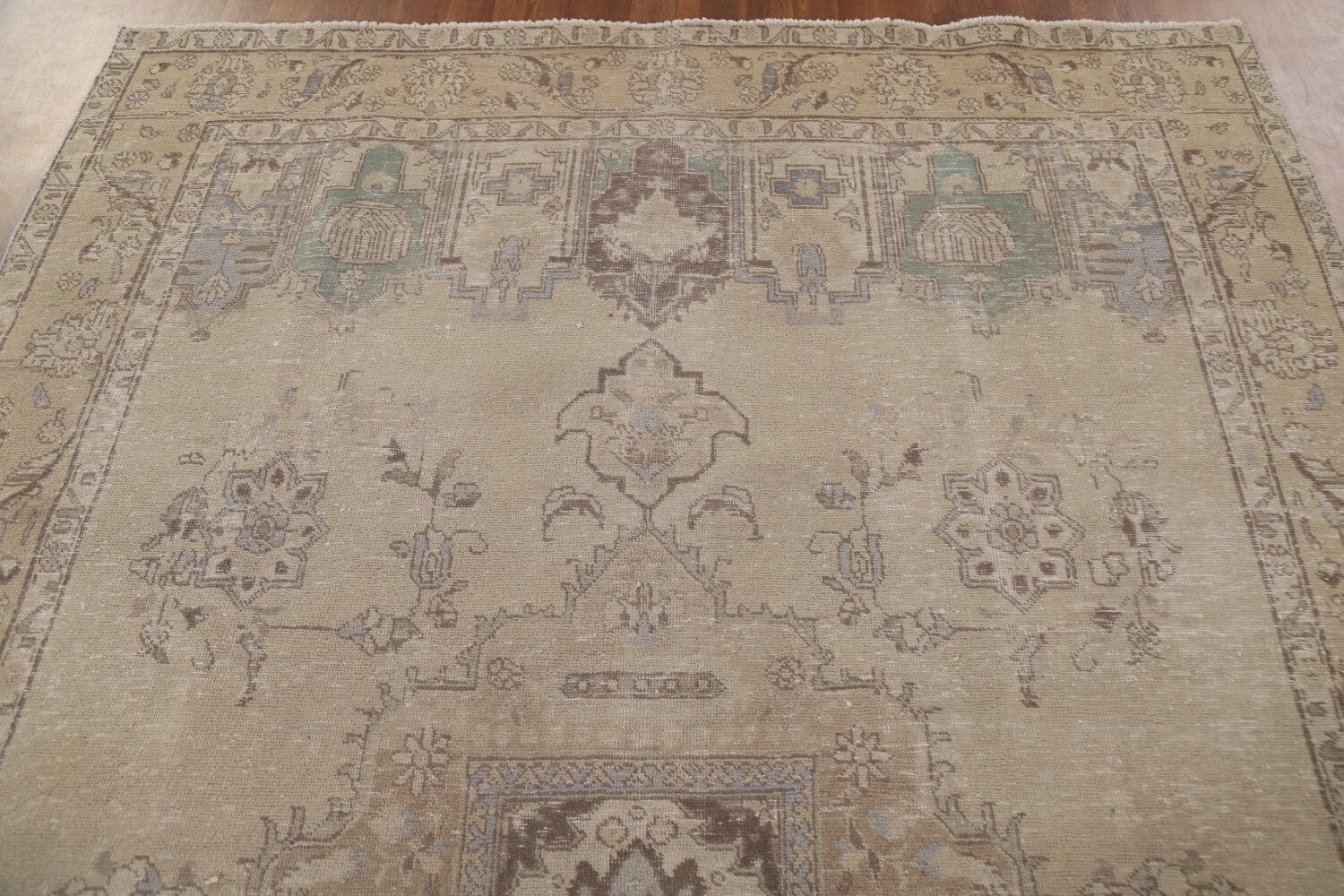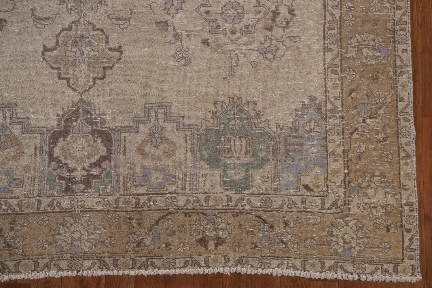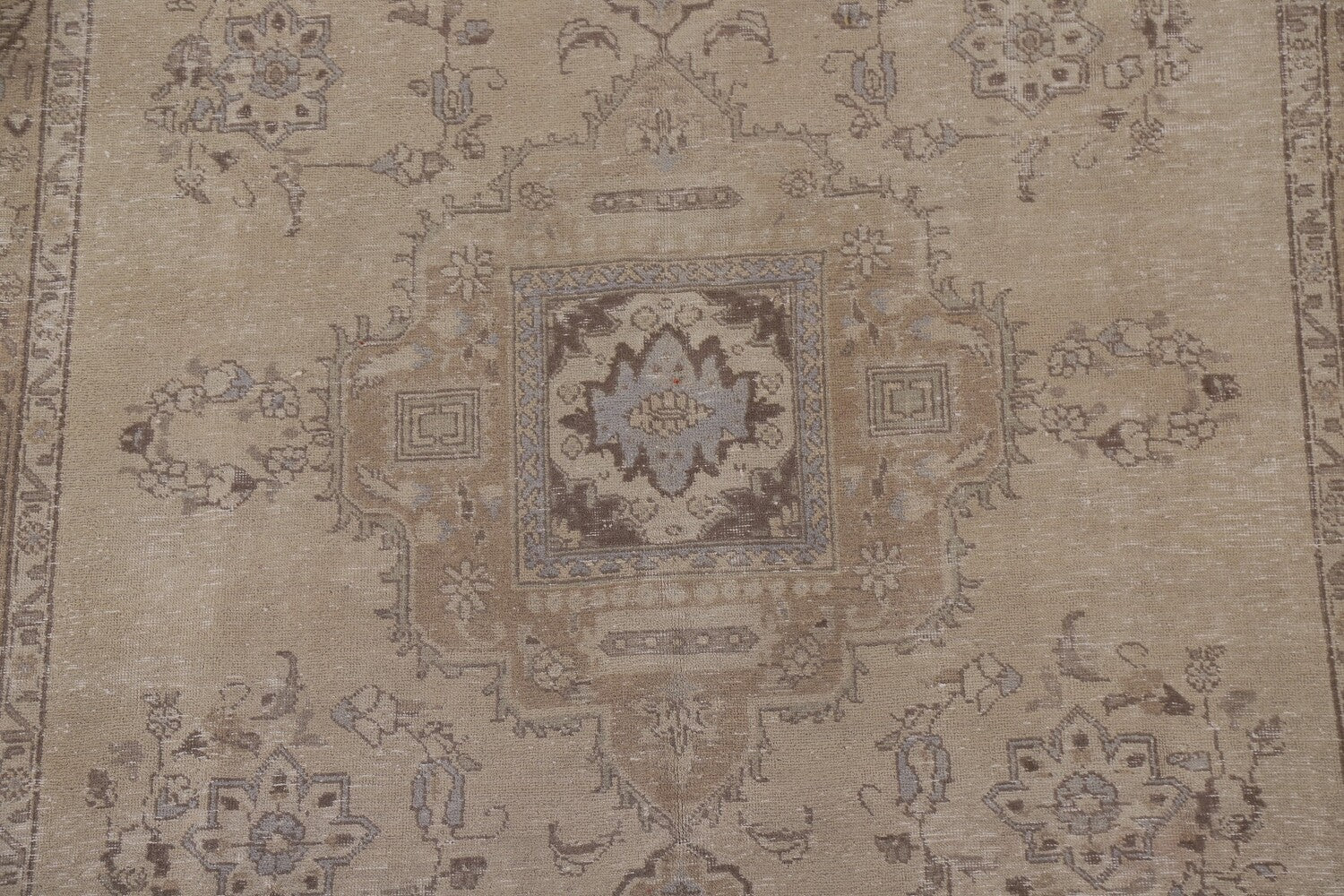 A Beautiful Genuine Persia ( Persia ) Tabriz rug is Hand Knotted by skillful weavers in Persia ( Persia ) with 100% Wool Material. This rug is in Very Good (Low Pile) condition. dimensions are 9' 1'' X 6' 6'' in foot and 277 X 198 in centimeter. the primary color is Beige & Ivories.