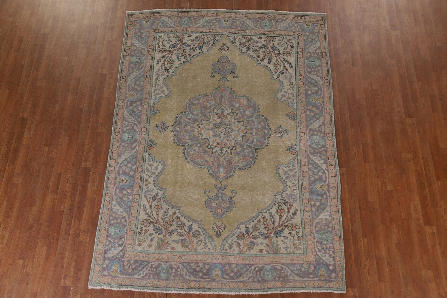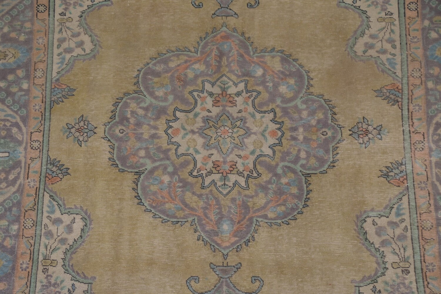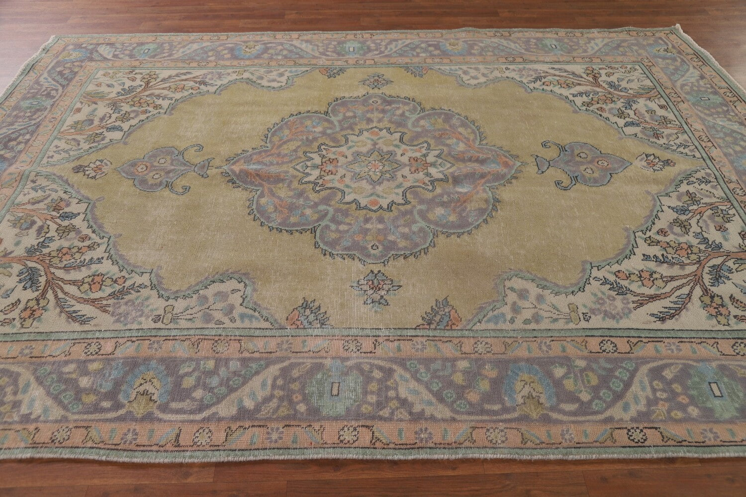 A Beautiful Genuine Persia ( Persia ) Tabriz rug is Hand Knotted by skillful weavers in Persia ( Persia ) with 100% Wool Material. This rug is in Very Good (Evenly Low Pile-Repair) condition. dimensions are 9' 3'' X 6' 7'' in foot and 282 X 201 in centimeter. the primary color is Yellow & Gold.