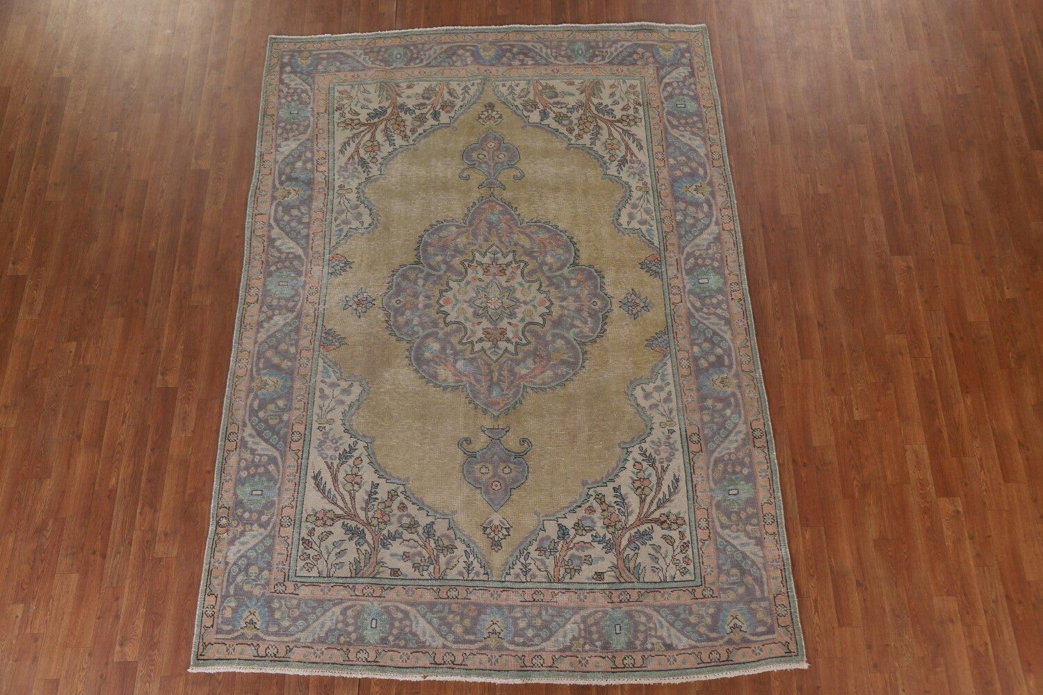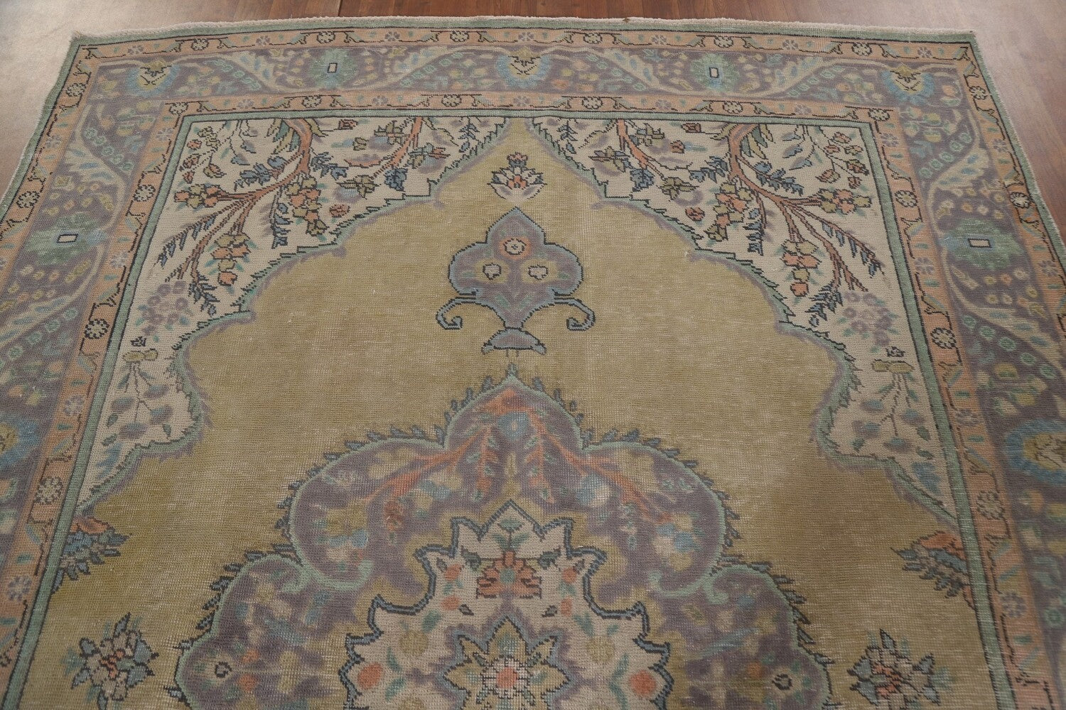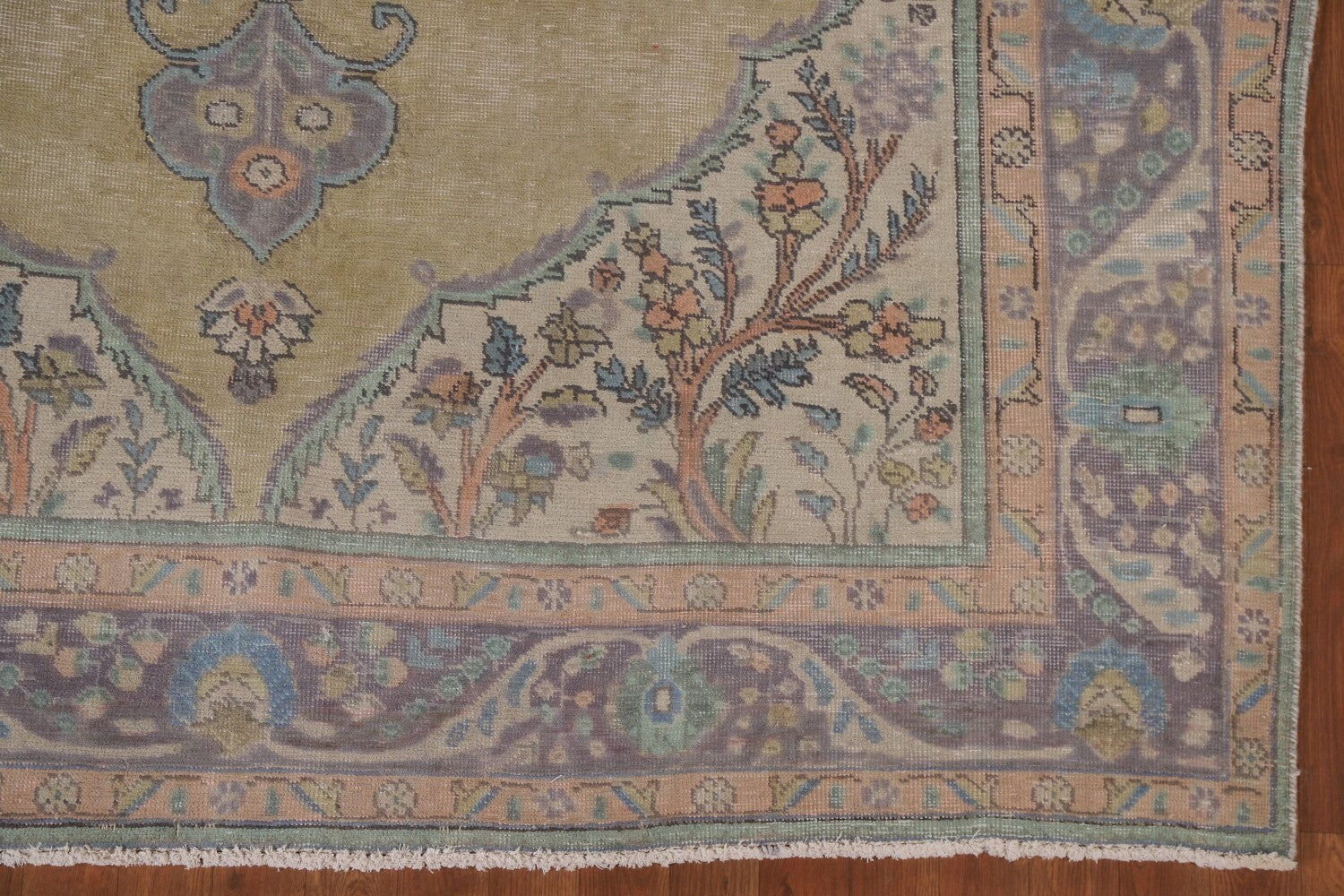 A Beautiful Genuine Persia ( Persia ) Tabriz rug is Hand Knotted by skillful weavers in Persia ( Persia ) with 100% Wool Material. This rug is in Very Good (Evenly Low Pile-Repair) condition. dimensions are 9' 3'' X 6' 7'' in foot and 282 X 201 in centimeter. the primary color is Yellow & Gold.