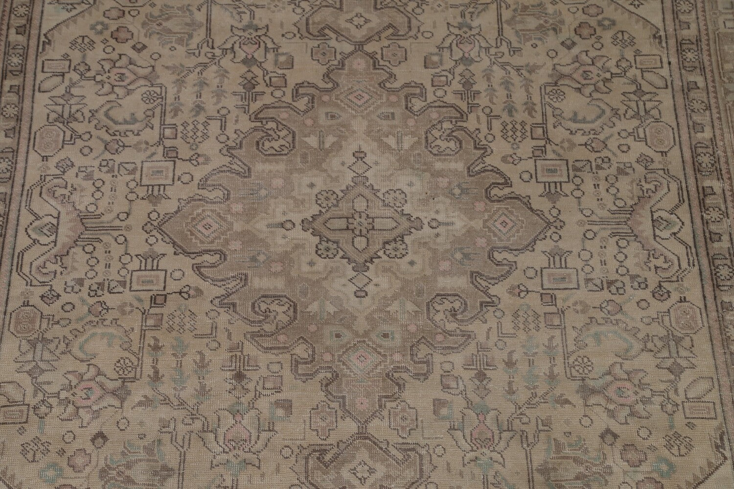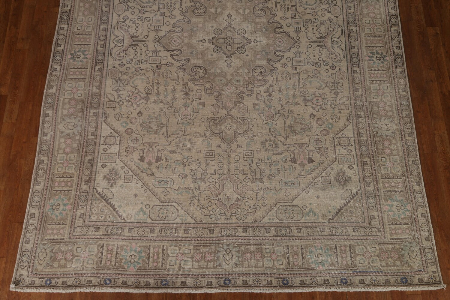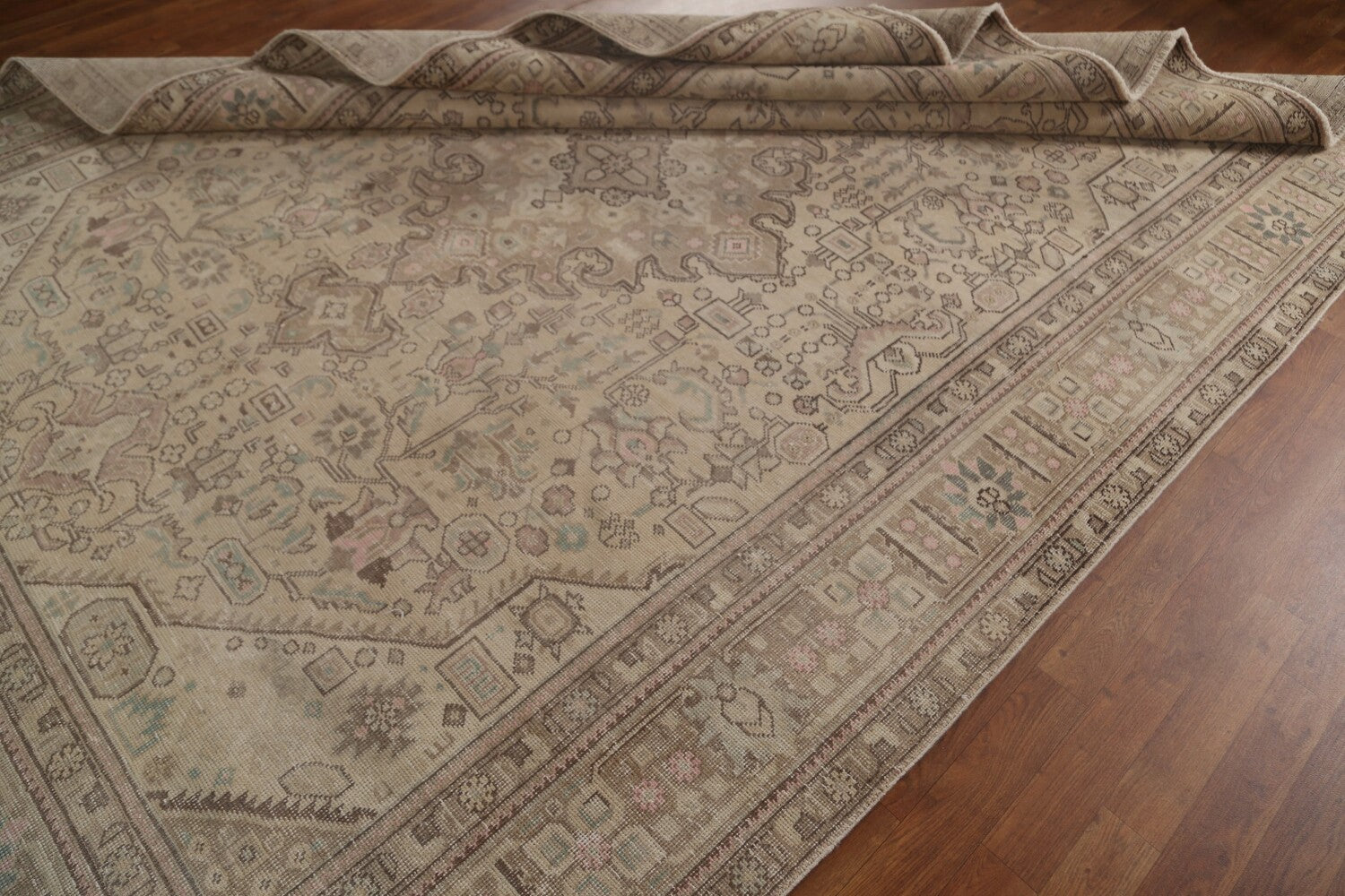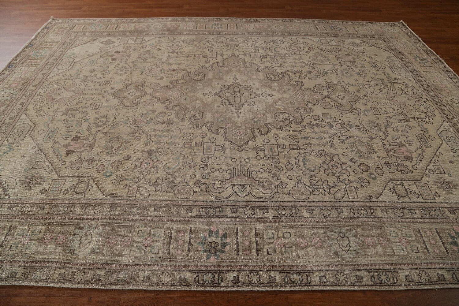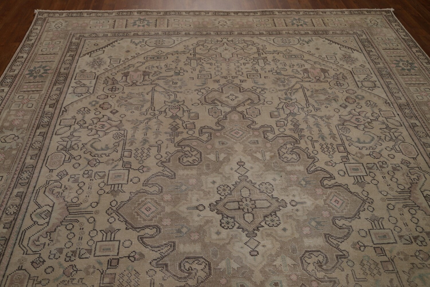 A Beautiful Genuine Persia ( Persia ) Tabriz rug is Hand Knotted by skillful weavers in Persia ( Persia ) with 100% Wool Material. This rug is in Very Good (Evenly Low Pile) condition. dimensions are 10' 10'' X 7' 11'' in foot and 330 X 241 in centimeter. the primary color is Beige & Ivories.
