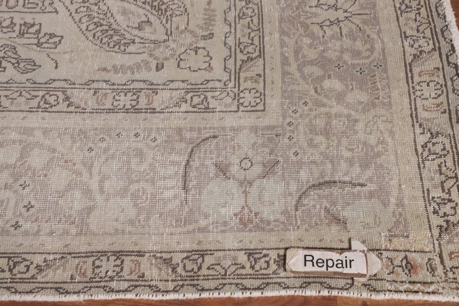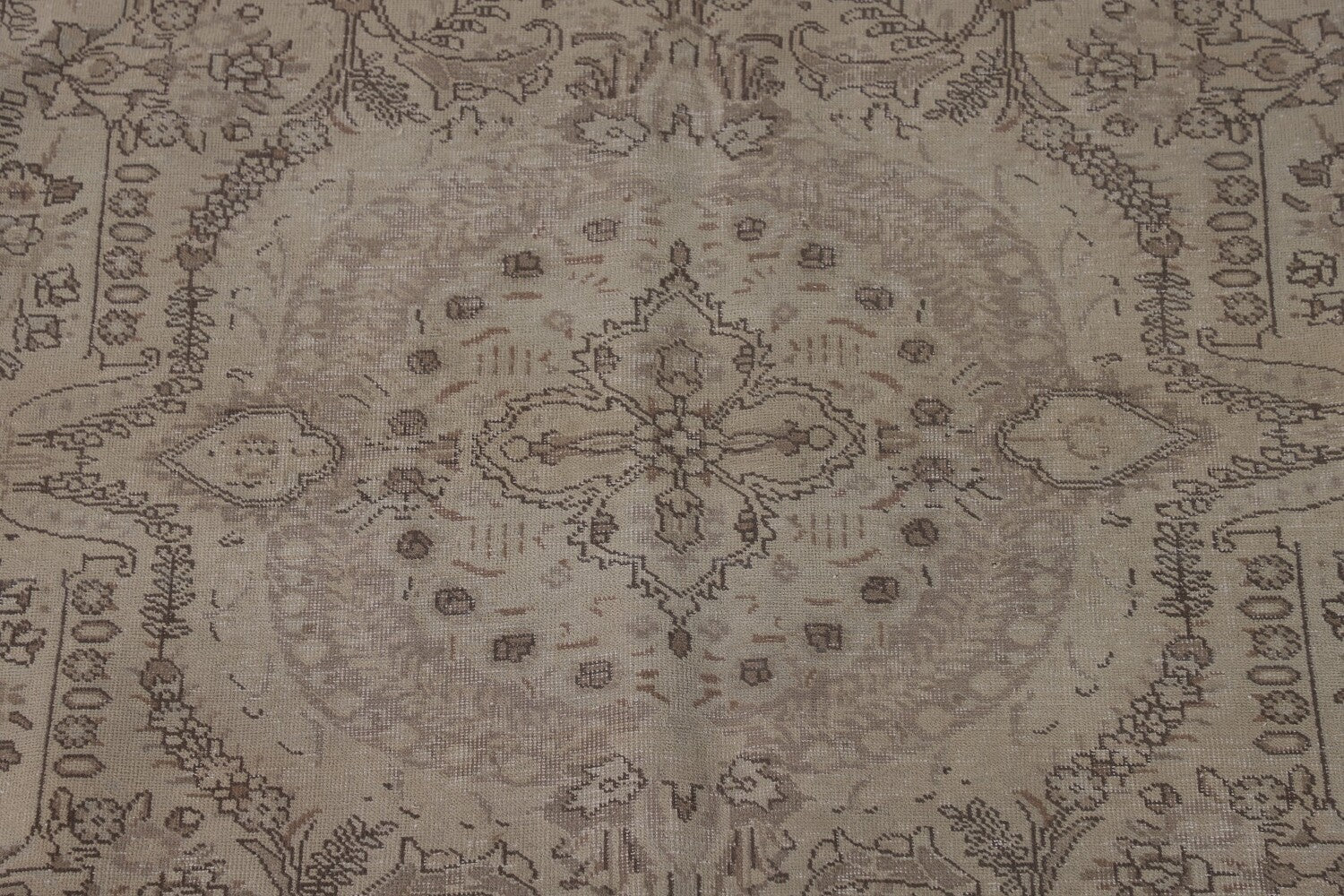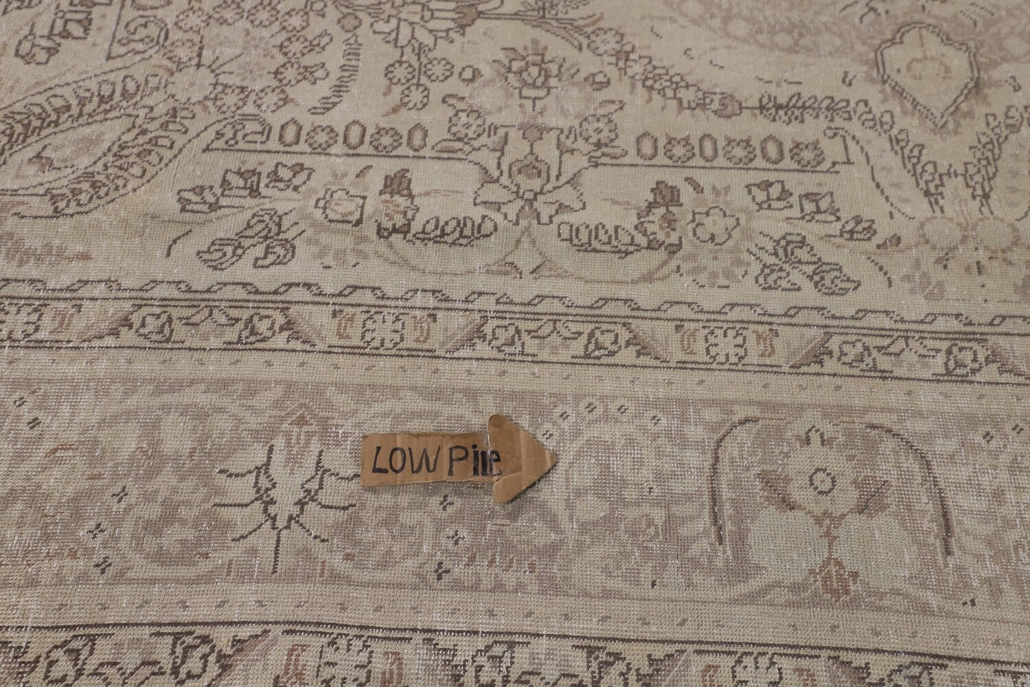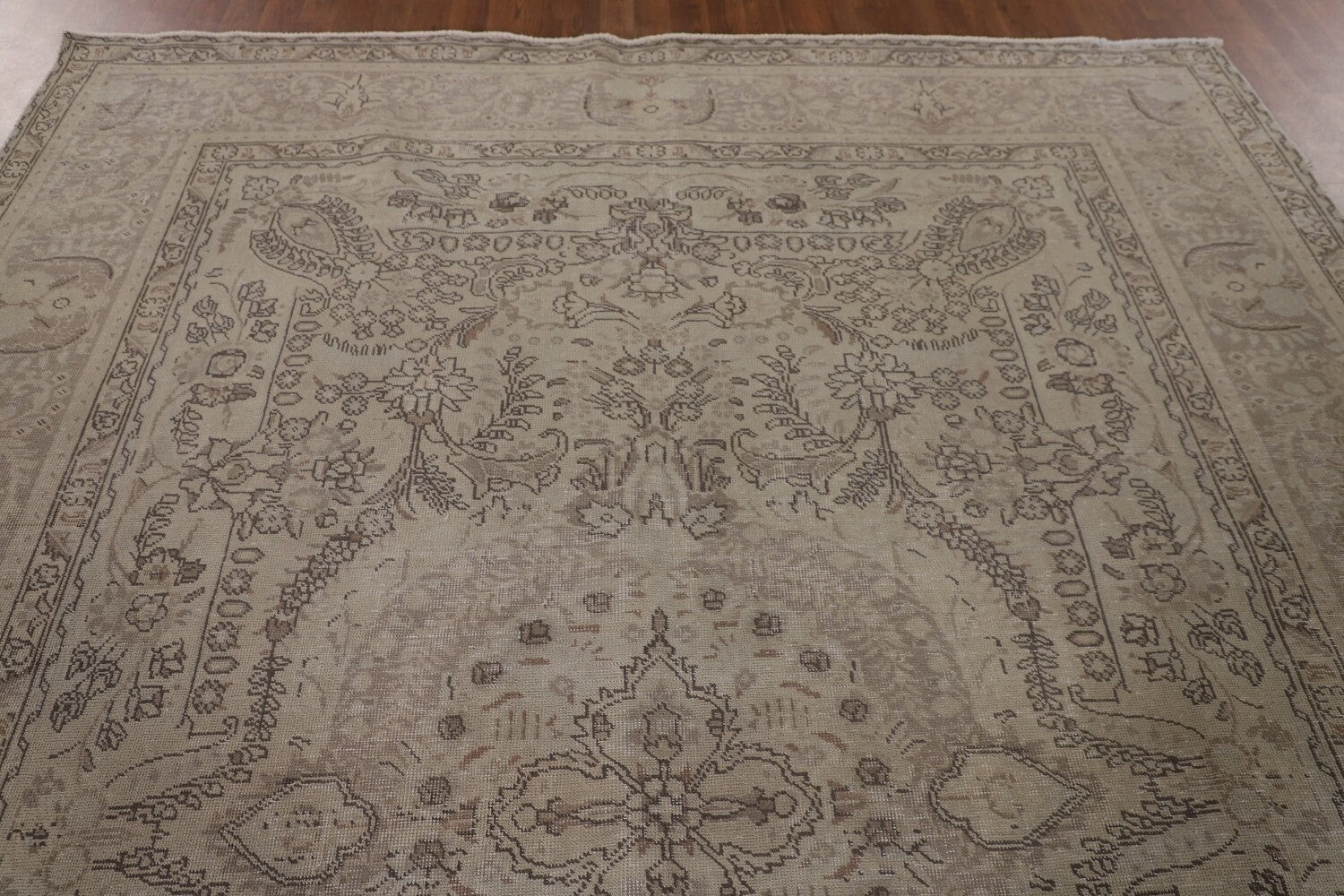 A Beautiful Genuine Persia ( Persia ) Tabriz rug is Hand Knotted by skillful weavers in Persia ( Persia ) with 100% Wool Material. This rug is in Very Good (Low Pile-Repair) condition. dimensions are 10' 7'' X 8' 0'' in foot and 323 X 244 in centimeter. the primary color is Beige & Ivories.