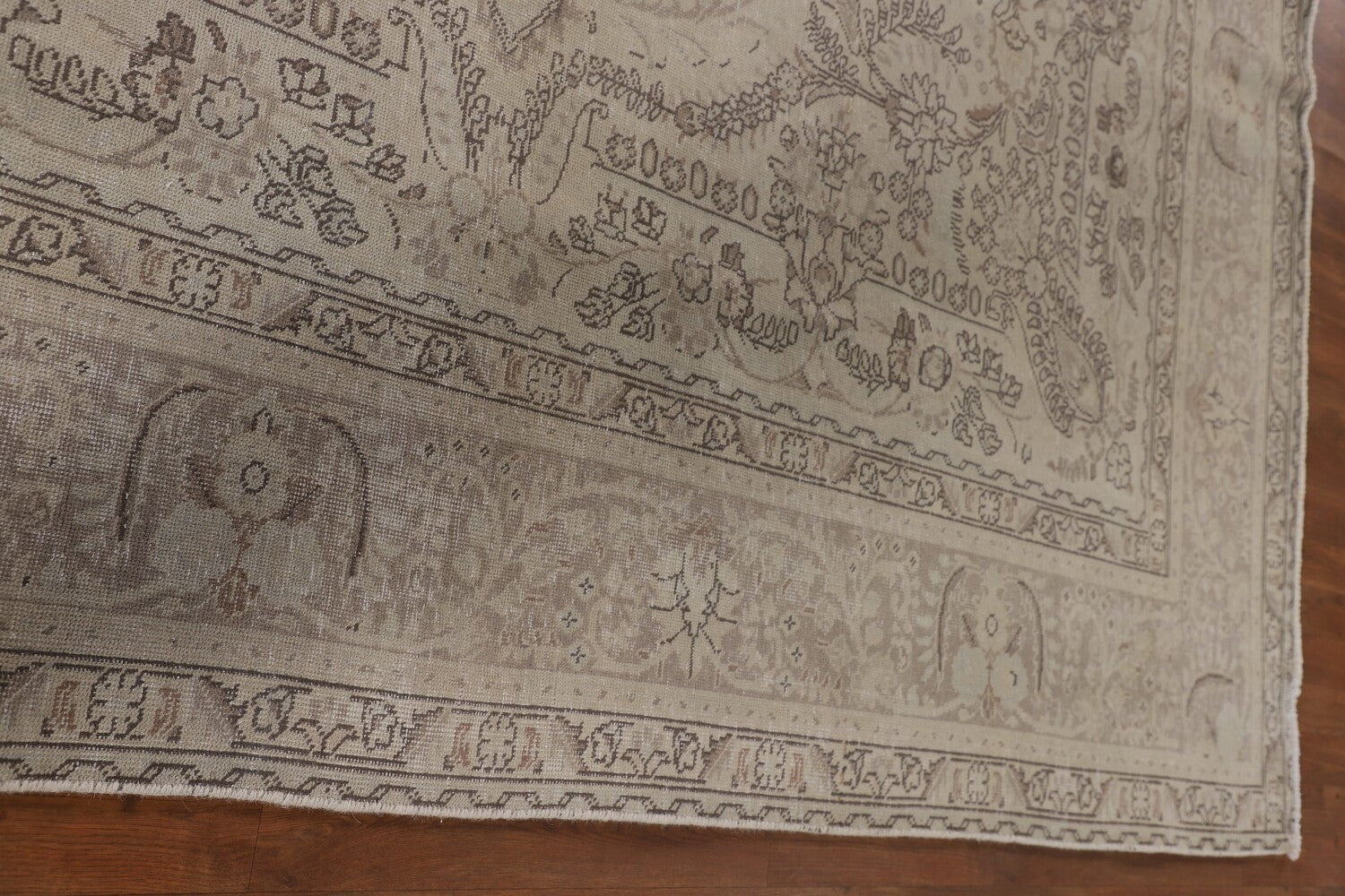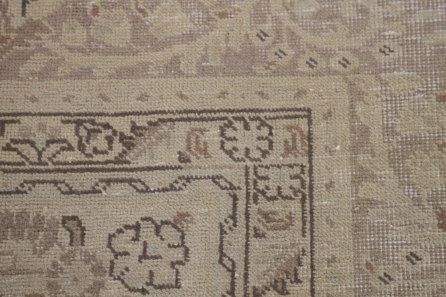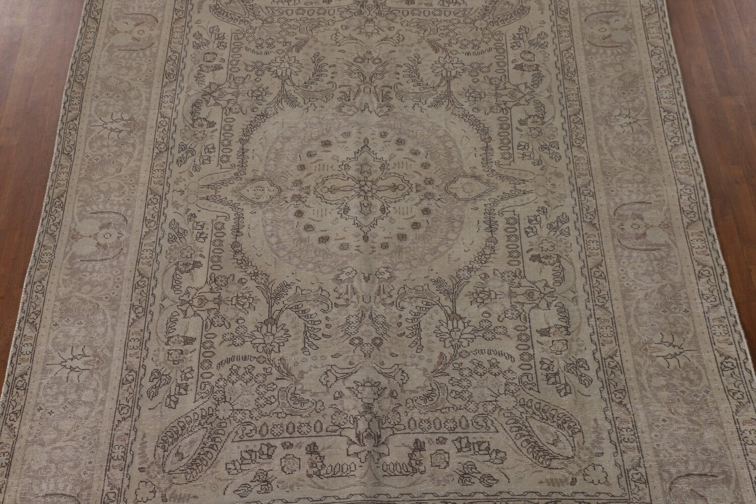 A Beautiful Genuine Persia ( Persia ) Tabriz rug is Hand Knotted by skillful weavers in Persia ( Persia ) with 100% Wool Material. This rug is in Very Good (Low Pile-Repair) condition. dimensions are 10' 7'' X 8' 0'' in foot and 323 X 244 in centimeter. the primary color is Beige & Ivories.
