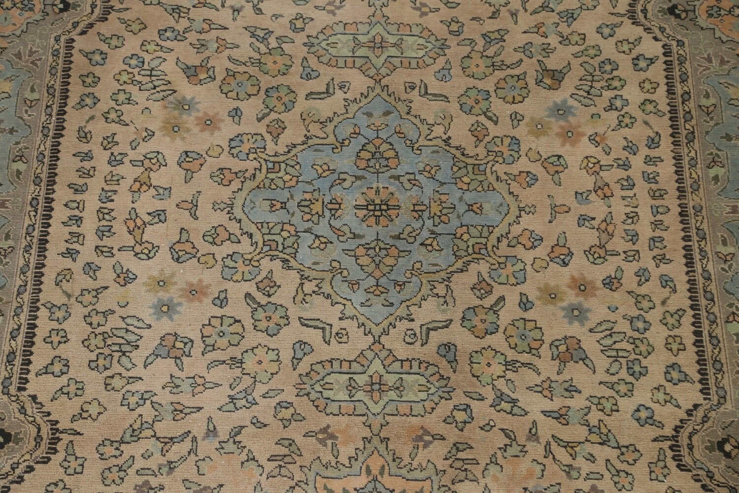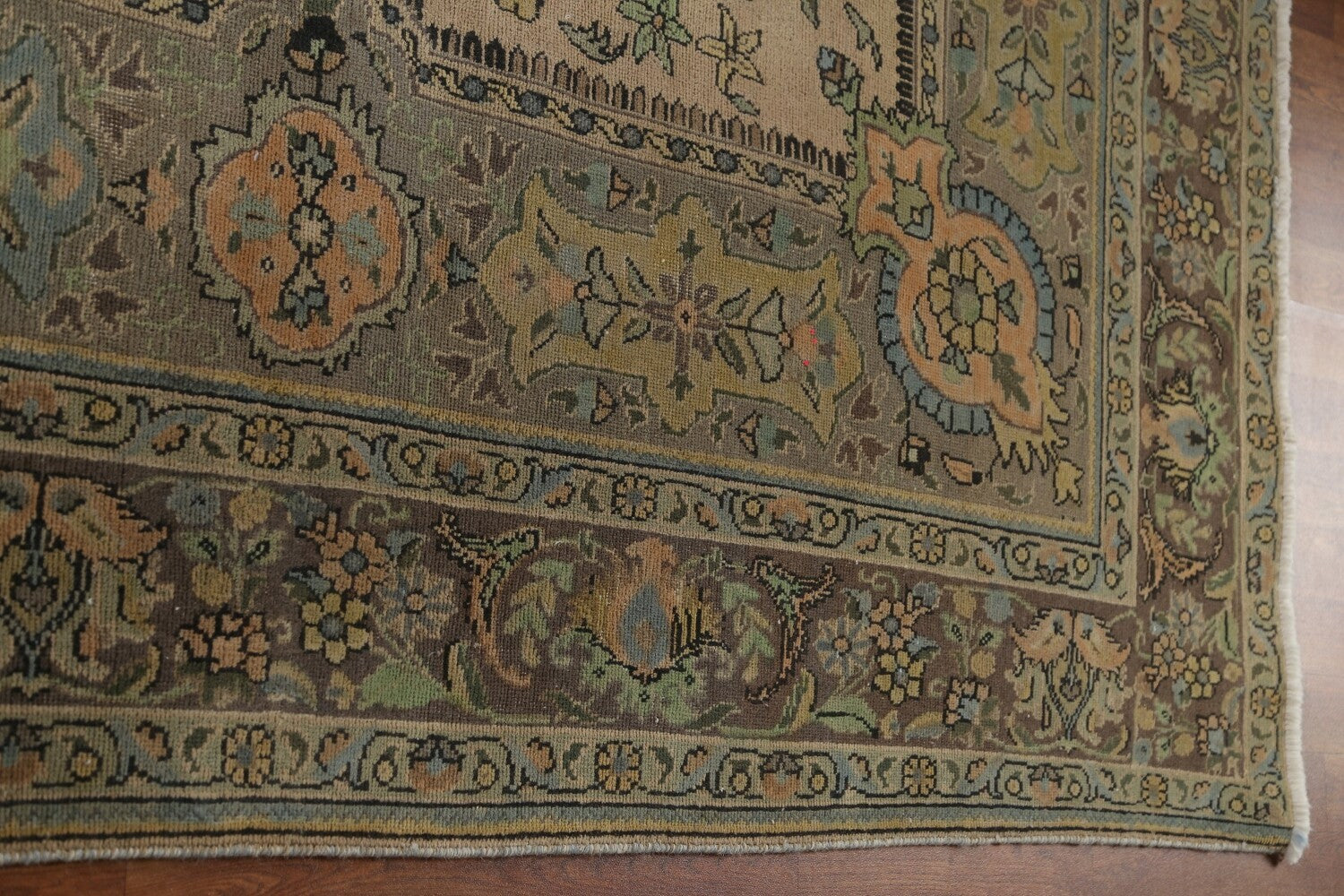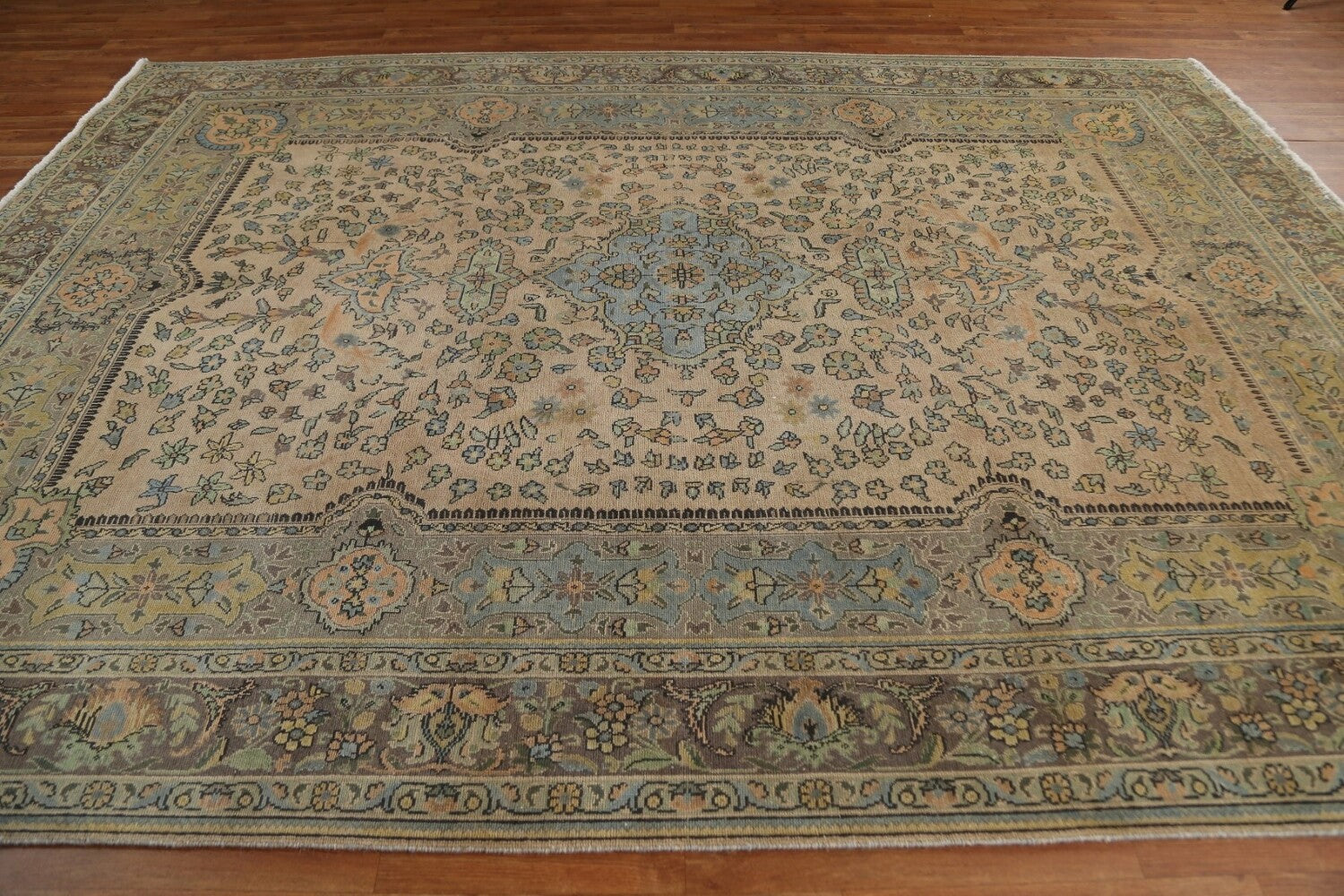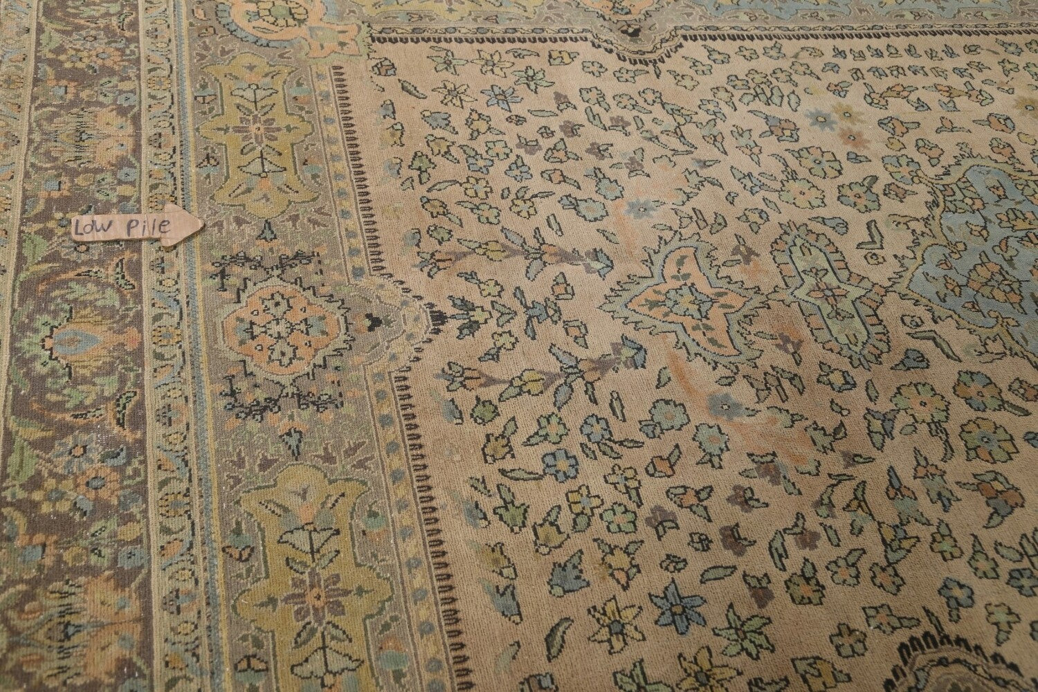 A Beautiful Genuine Persia ( Persia ) Tabriz rug is Hand Knotted by skillful weavers in Persia ( Persia ) with 100% Wool Material. This rug is in Very Good ( Low Pile ) condition. dimensions are 11' 7'' X 8' 3'' in foot and 353 X 251 in centimeter. the primary color is Brown.