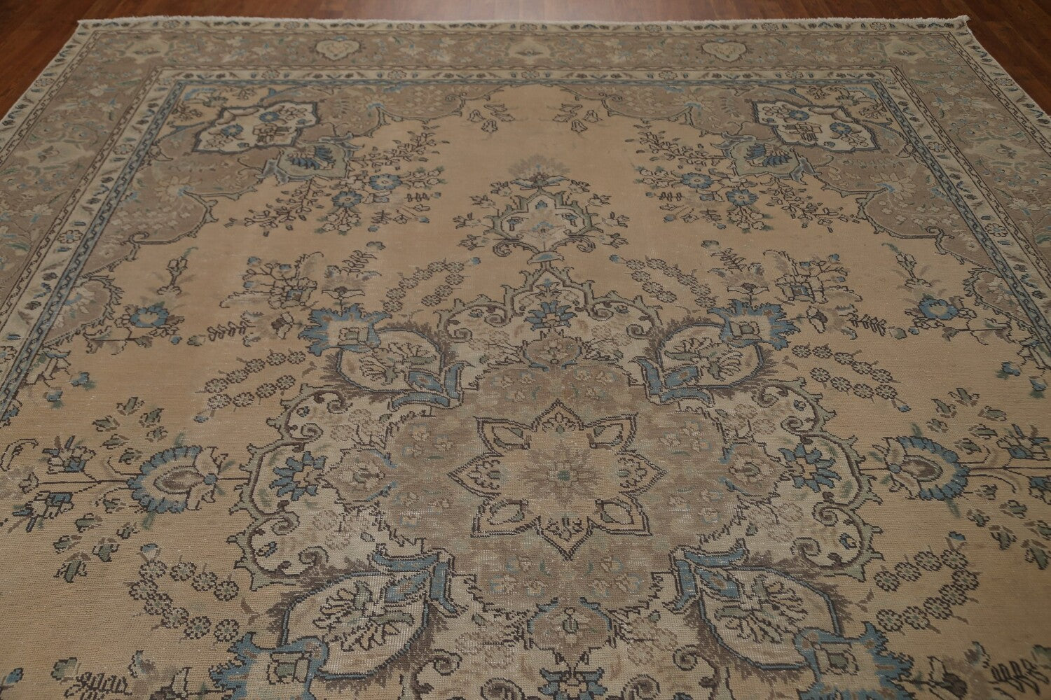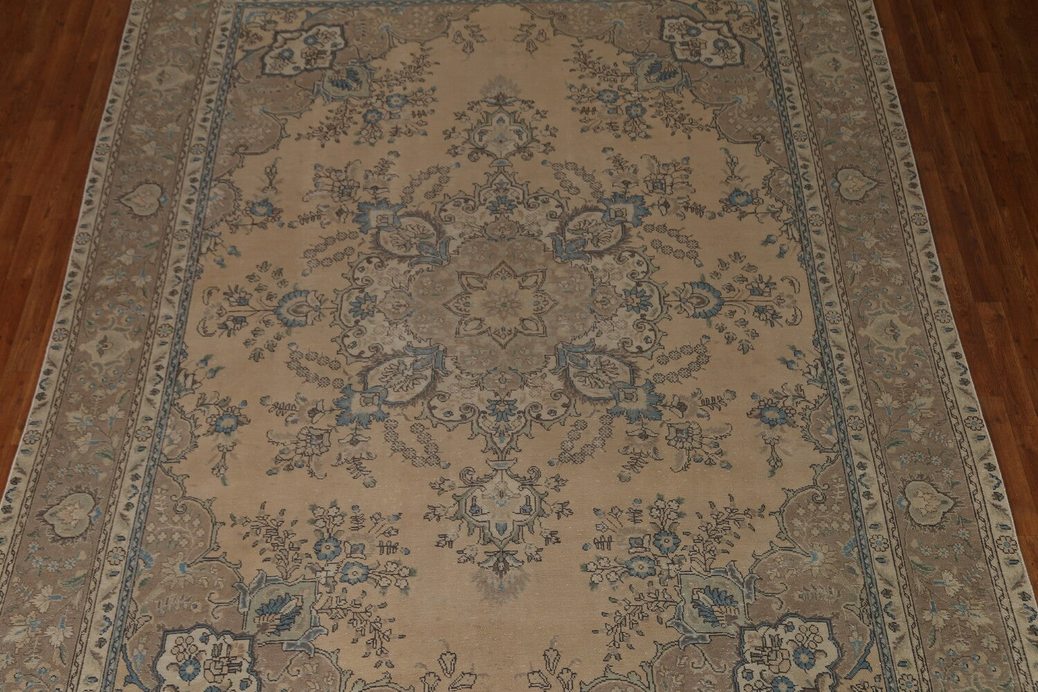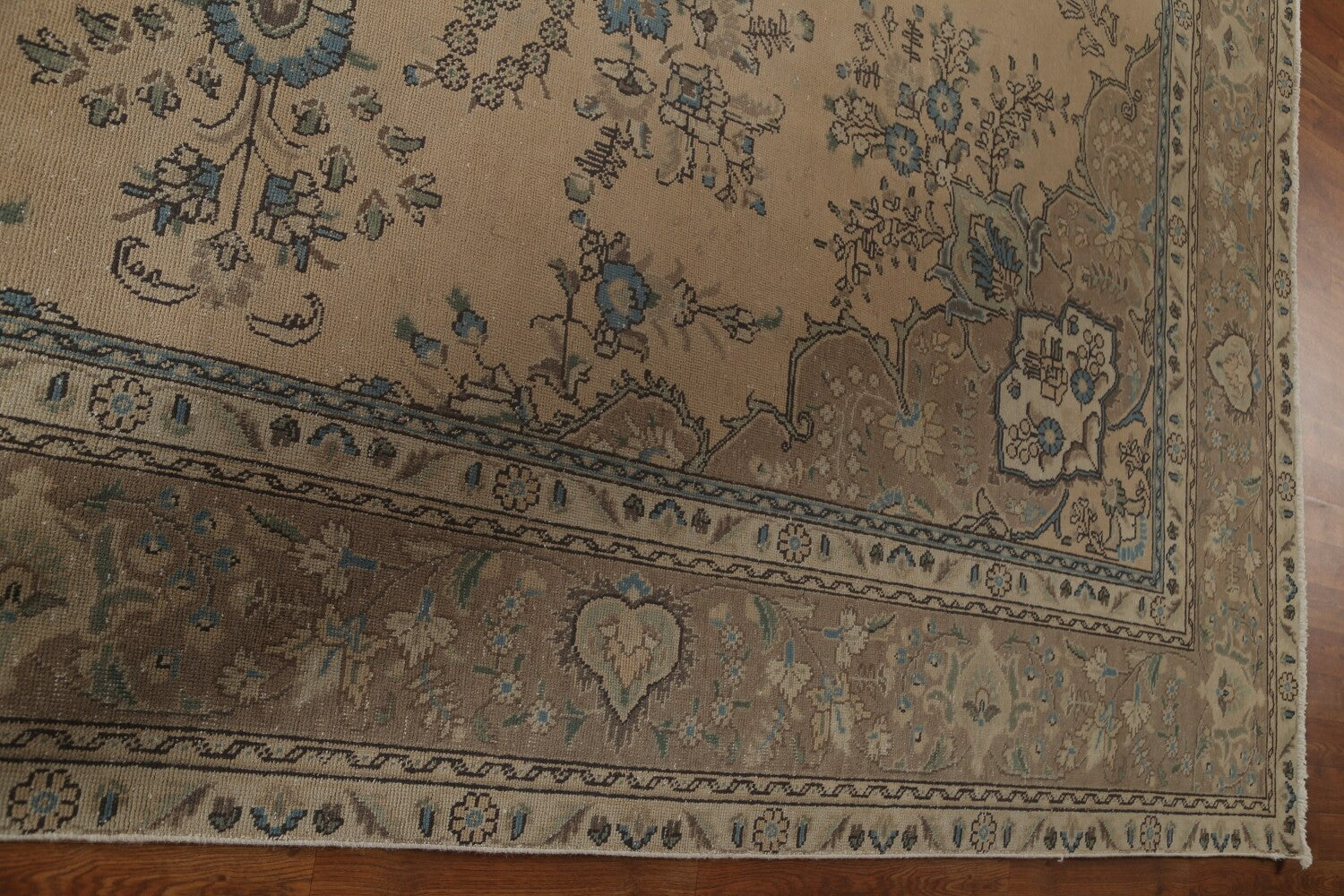 A Beautiful Genuine Persia ( Persia ) Tabriz rug is Hand Knotted by skillful weavers in Persia ( Persia ) with 100% Wool Material. This rug is in Very Good (Low Pile) condition. dimensions are 12' 1'' X 9' 3'' in foot and 368 X 282 in centimeter. the primary color is Peach.