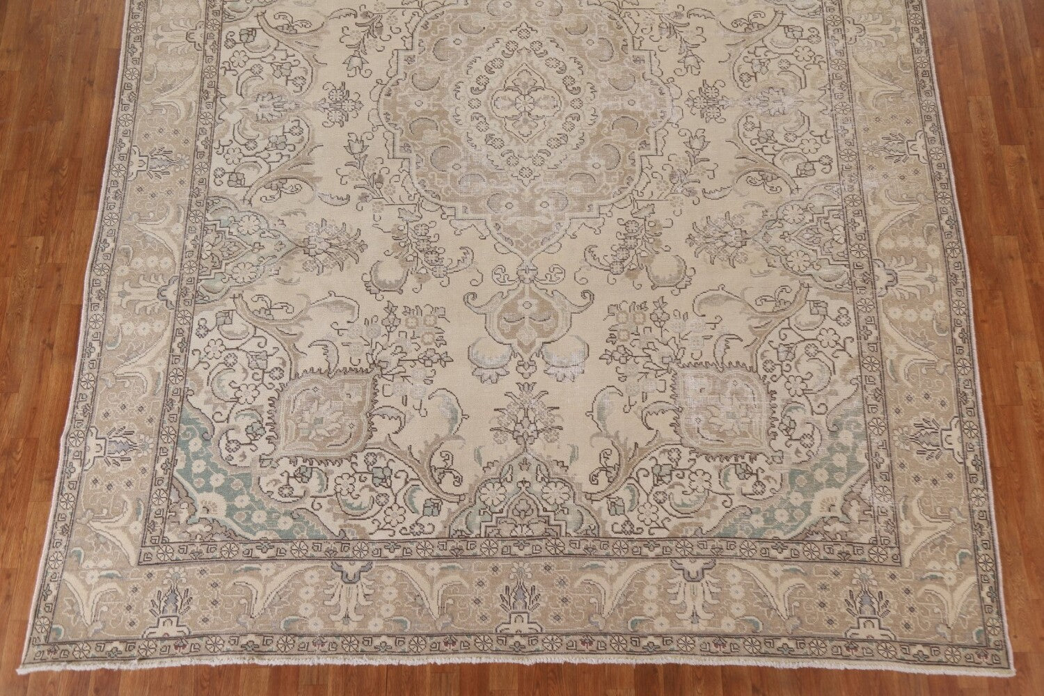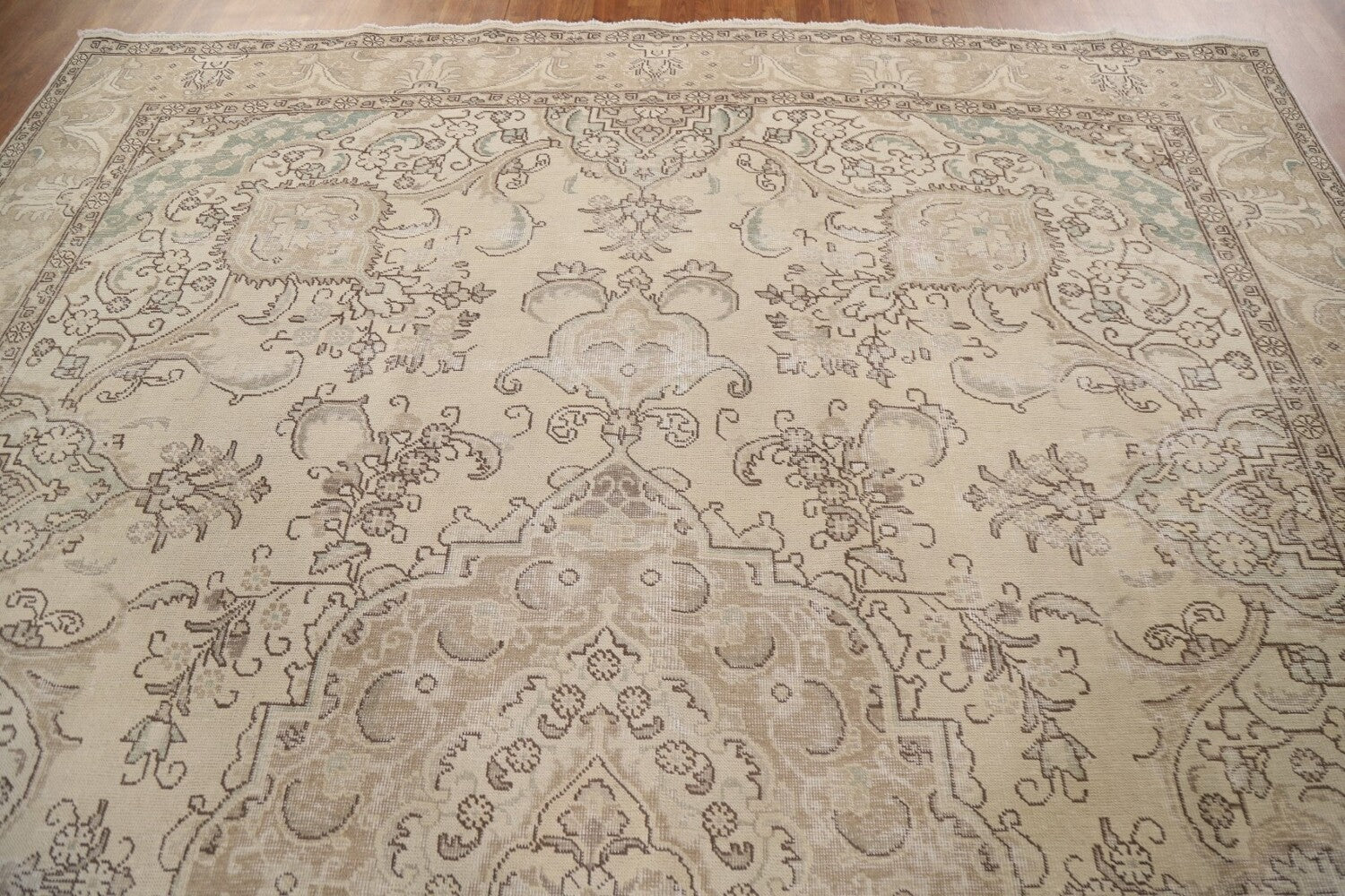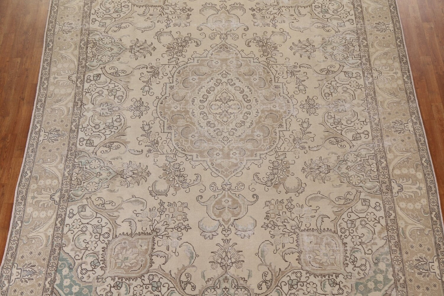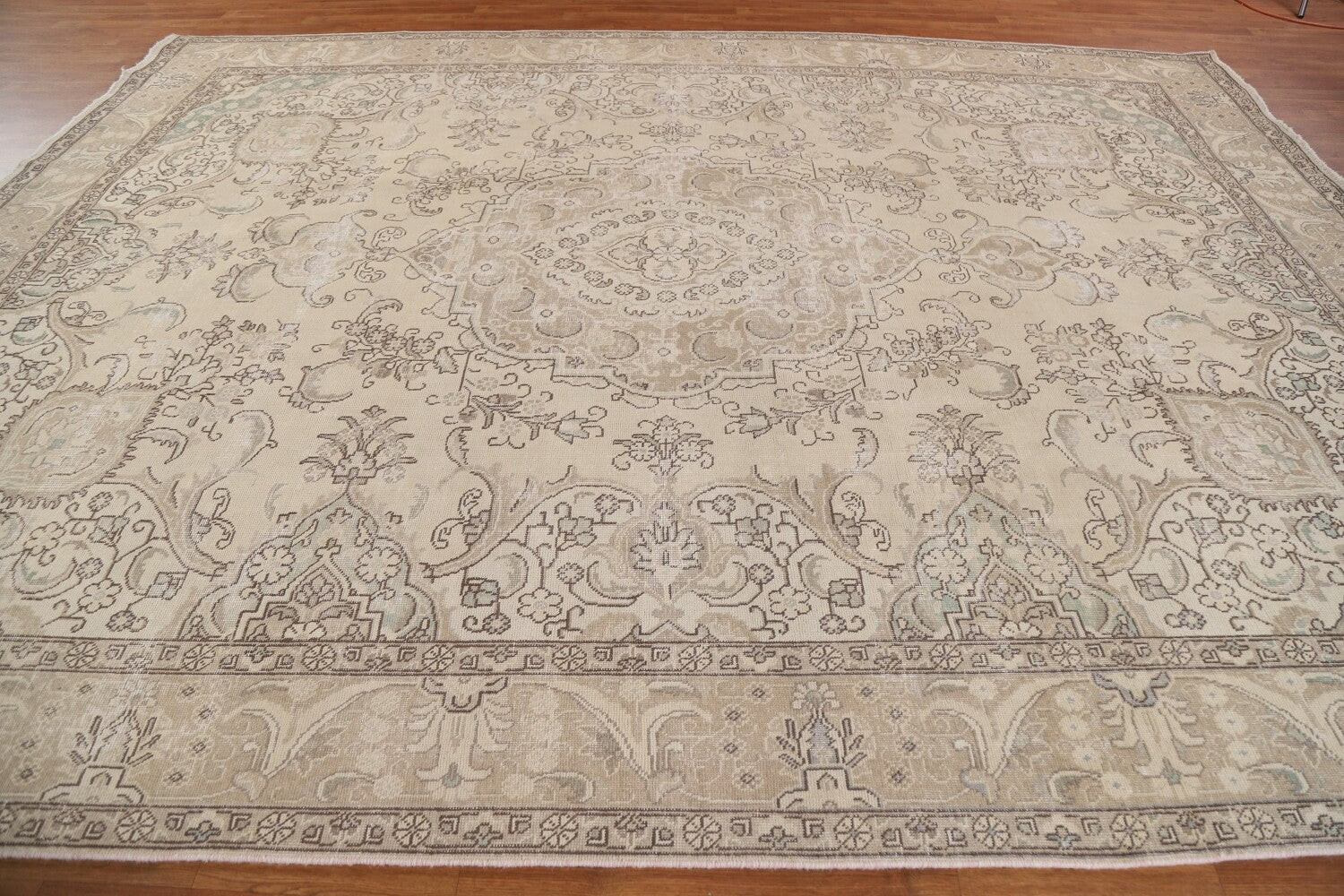A Beautiful Genuine Persia ( Persia ) Tabriz rug is Hand Knotted by skillful weavers in Persia ( Persia ) with 100% Wool Material. This rug is in Very Good (Evenly Low Pile) condition. dimensions are 12' 6'' X 9' 5'' in foot and 381 X 287 in centimeter. the primary color is Beige & Ivories.