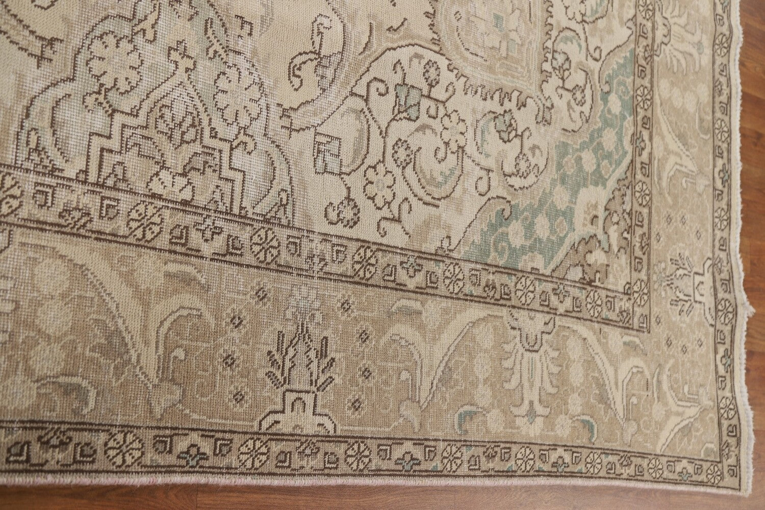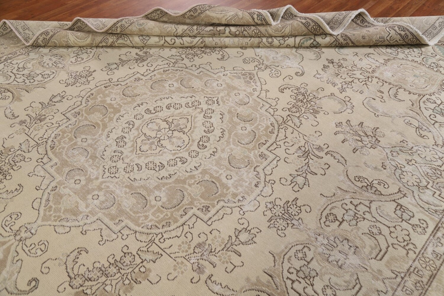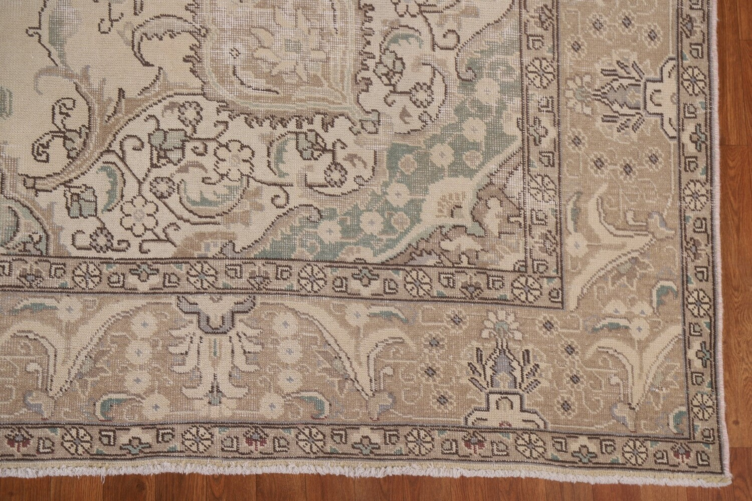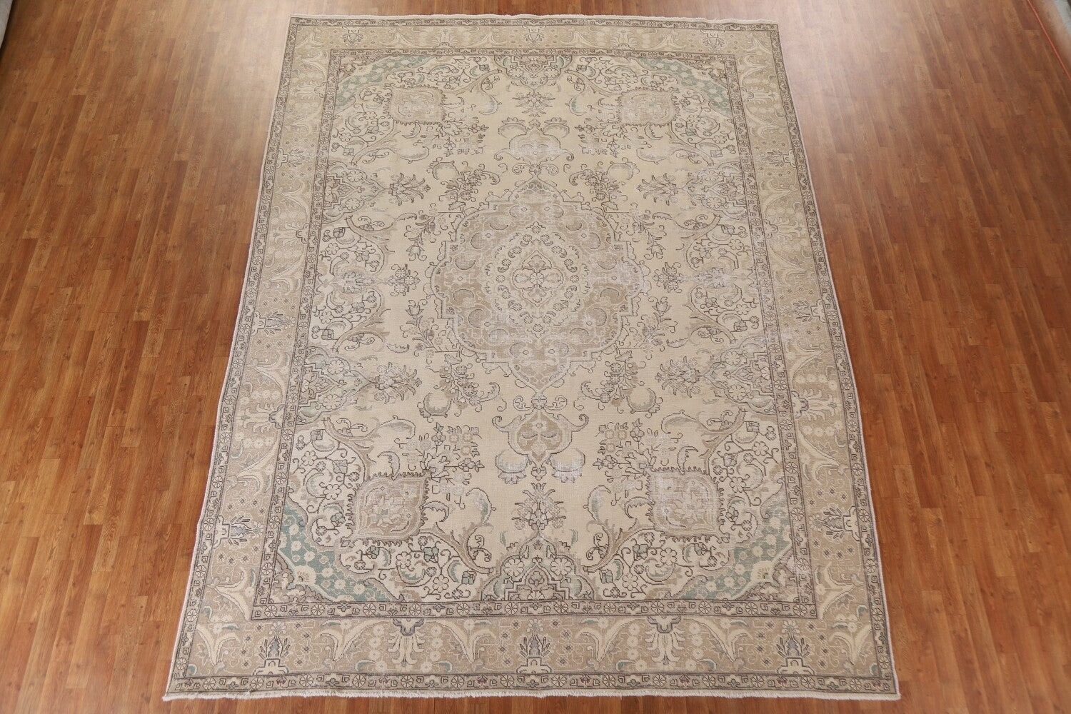 A Beautiful Genuine Persia ( Persia ) Tabriz rug is Hand Knotted by skillful weavers in Persia ( Persia ) with 100% Wool Material. This rug is in Very Good (Evenly Low Pile) condition. dimensions are 12' 6'' X 9' 5'' in foot and 381 X 287 in centimeter. the primary color is Beige & Ivories.