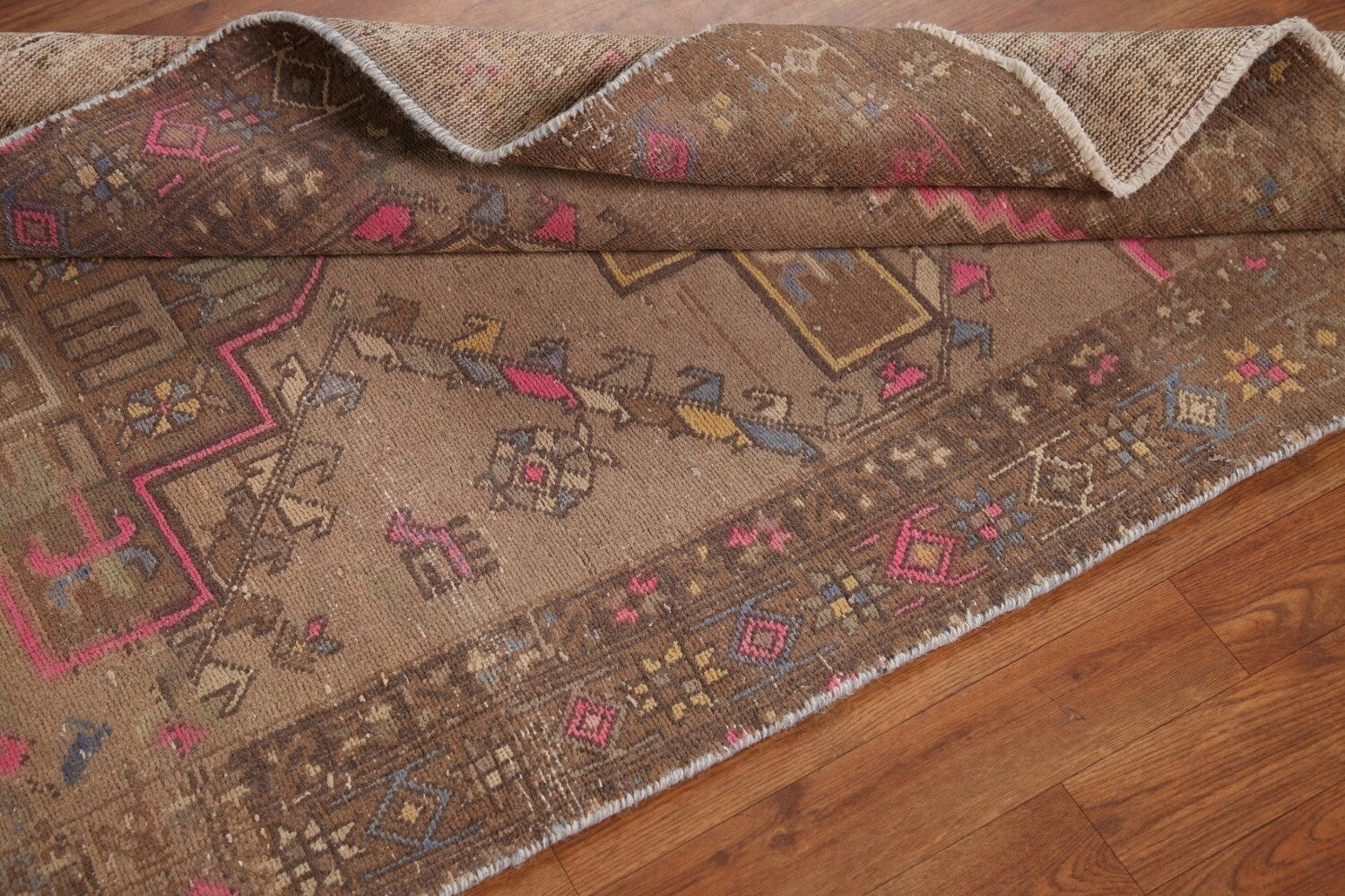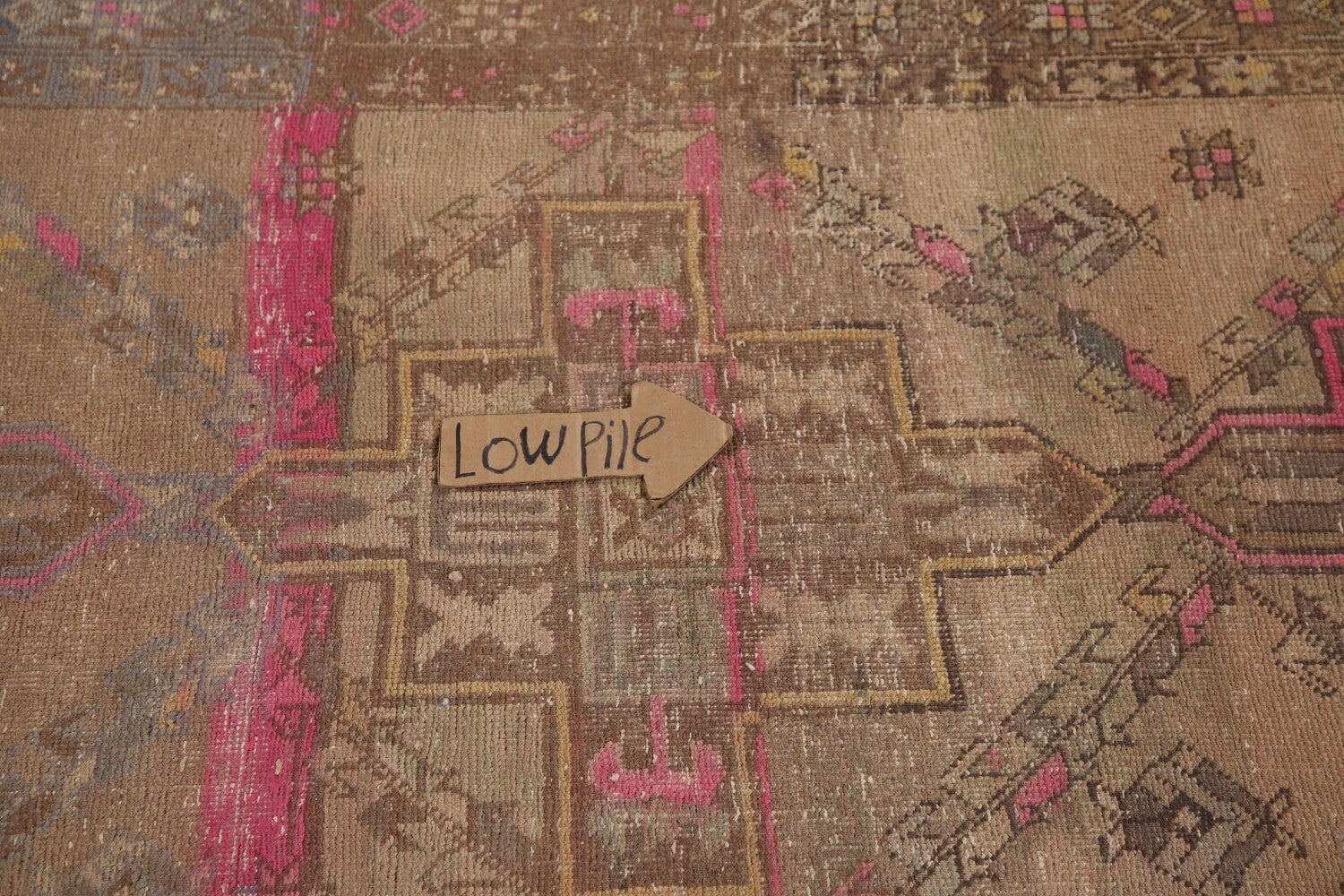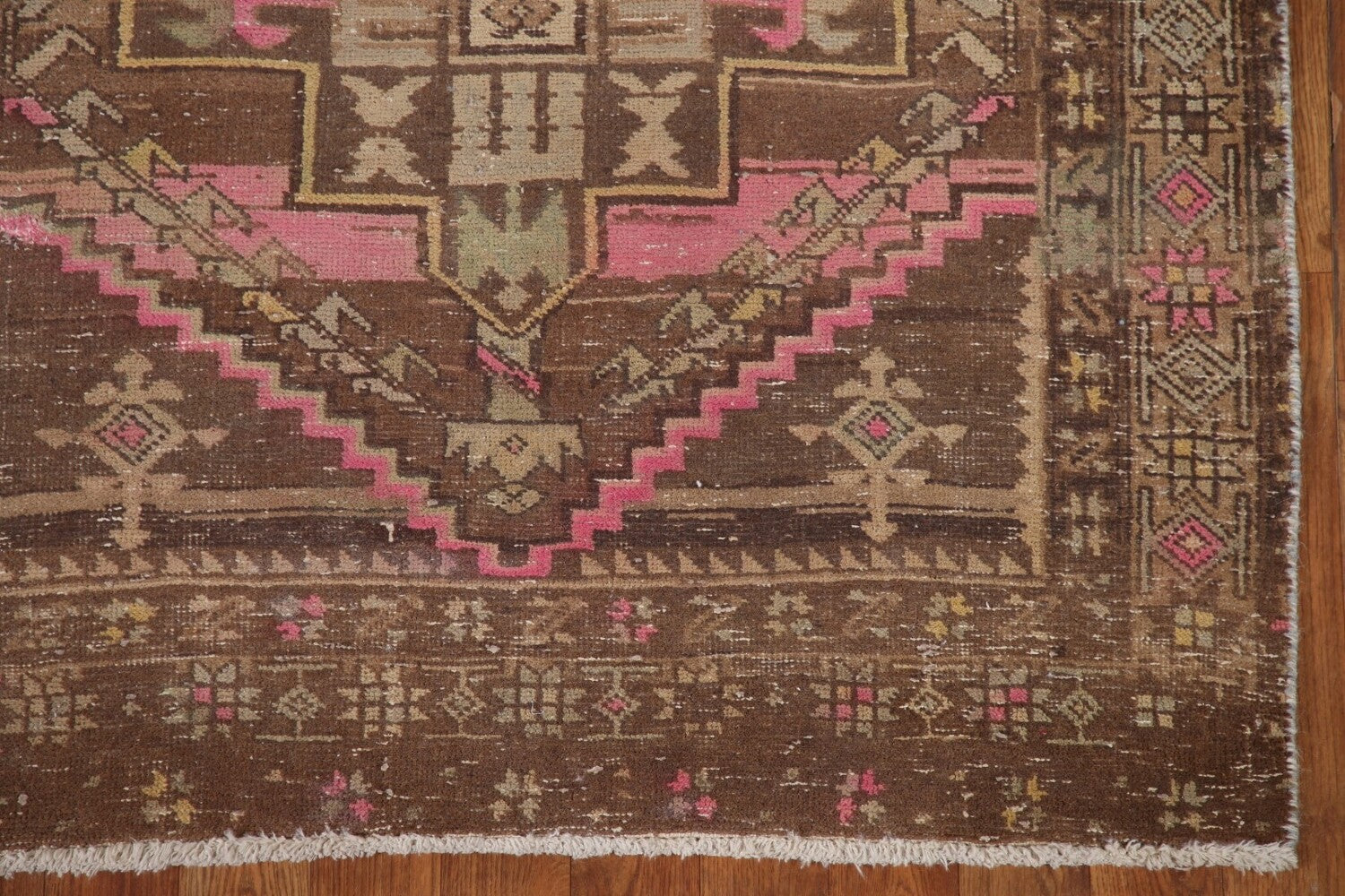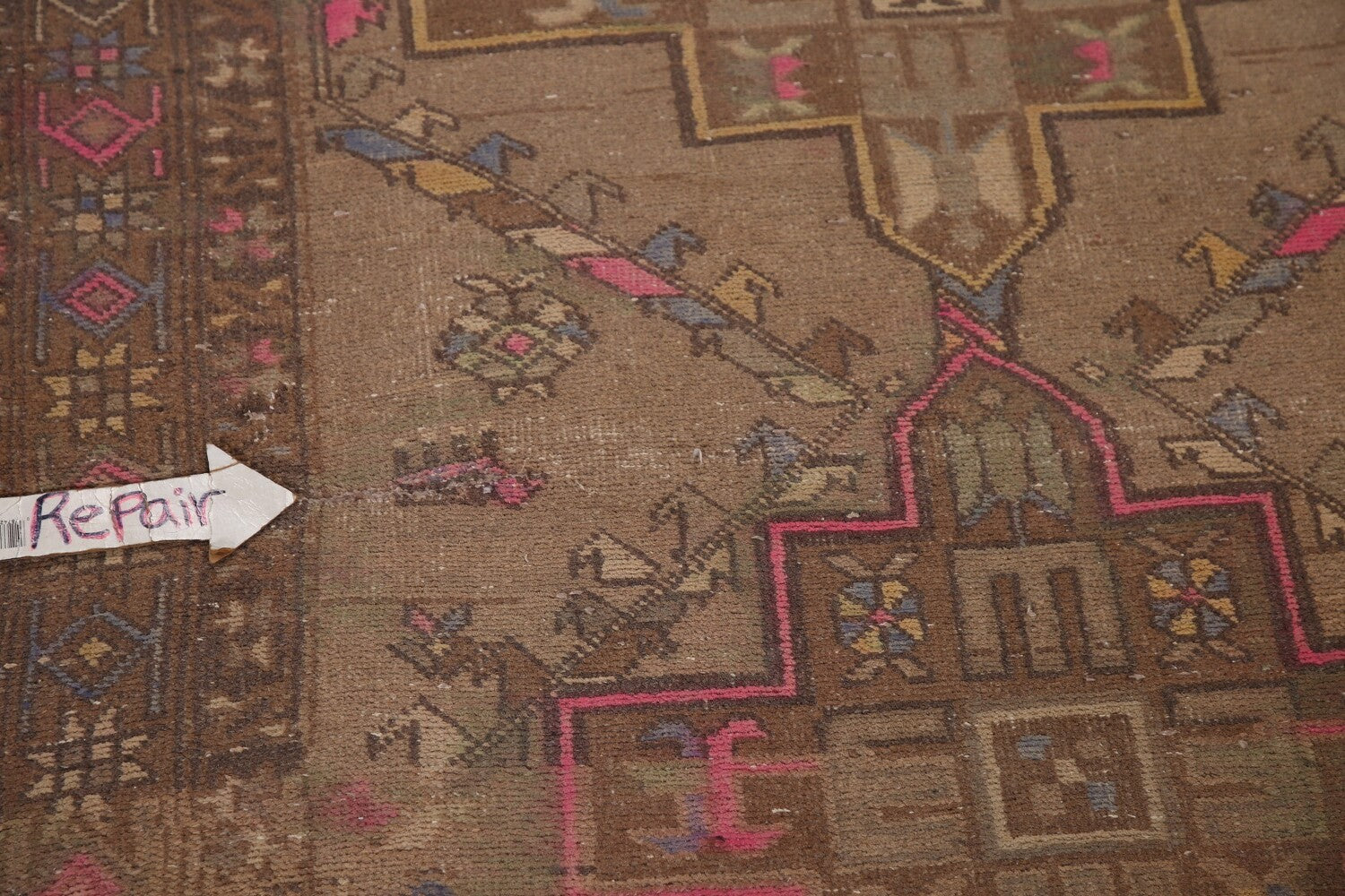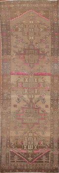 A Beautiful Genuine Persia ( Persia ) Heriz rug is Hand Knotted by skillful weavers in Persia ( Persia ) with 100% Wool Material. This rug is in Very Good (Low Pile-Abrash-Repair) condition. dimensions are 11' 3'' X 3' 5'' in foot and 343 X 104 in centimeter. the primary color is Brown.