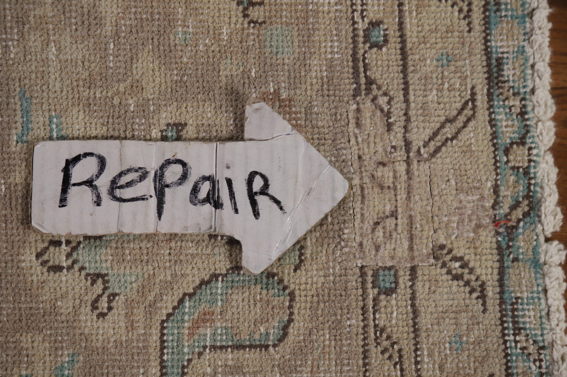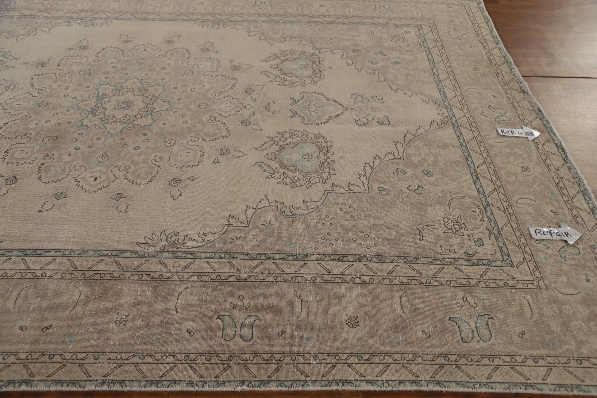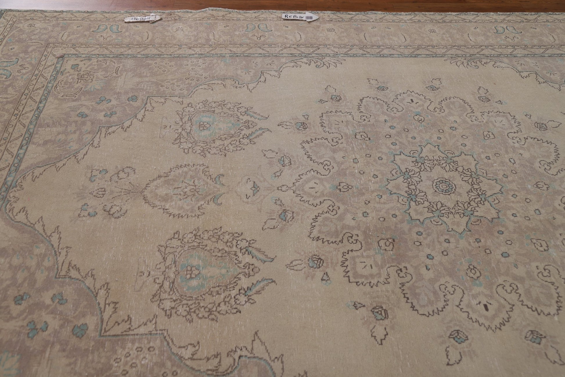 A Beautiful Genuine Persia ( Persia ) Tabriz rug is Hand Knotted by skillful weavers in Persia ( Persia ) with 100% Wool Material. This rug is in Very Good (Evenly Low Pile-Repair) condition. dimensions are 10' 11'' X 7' 4'' in foot and 333 X 224 in centimeter. the primary color is Beige & Ivories.